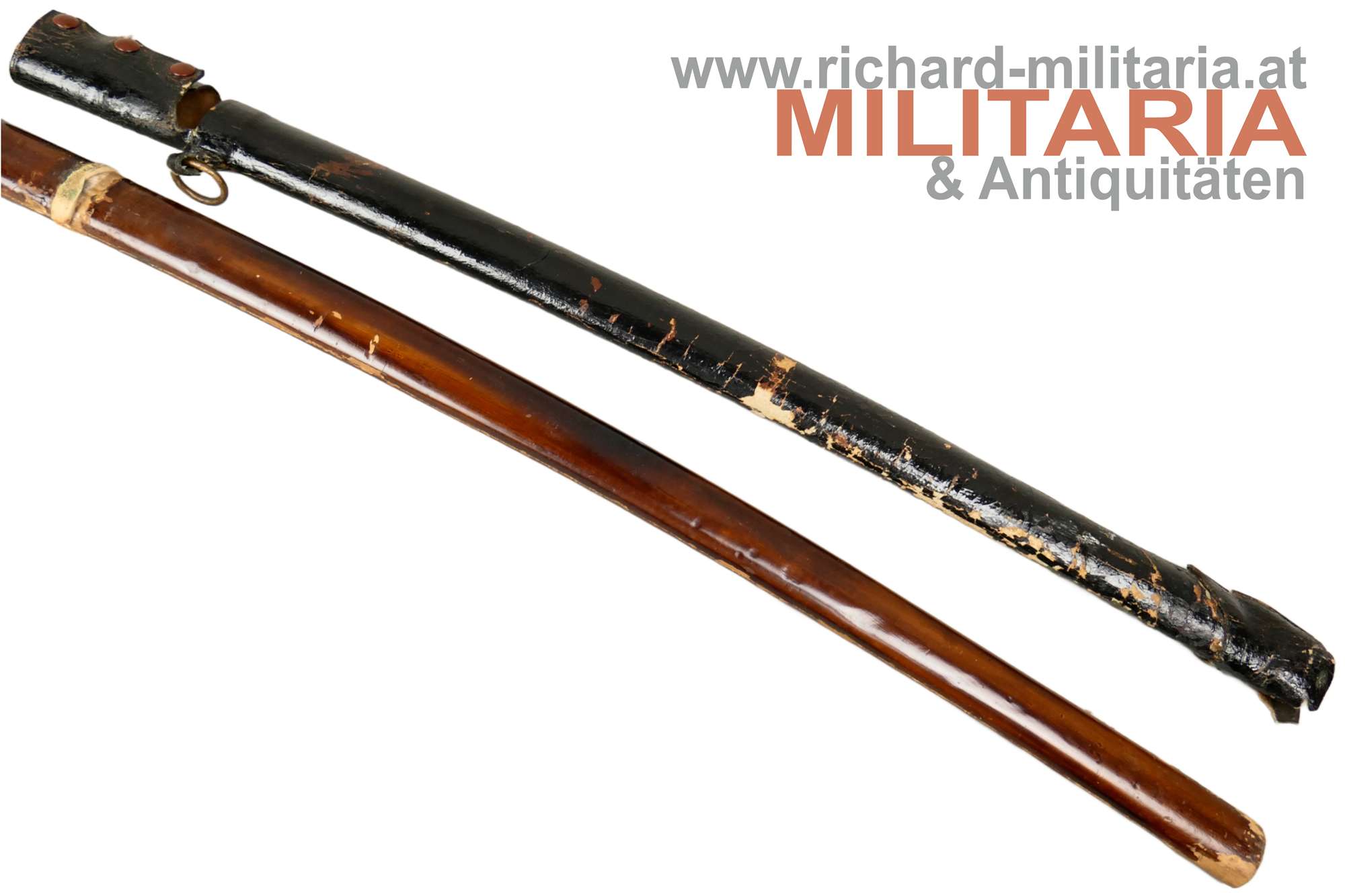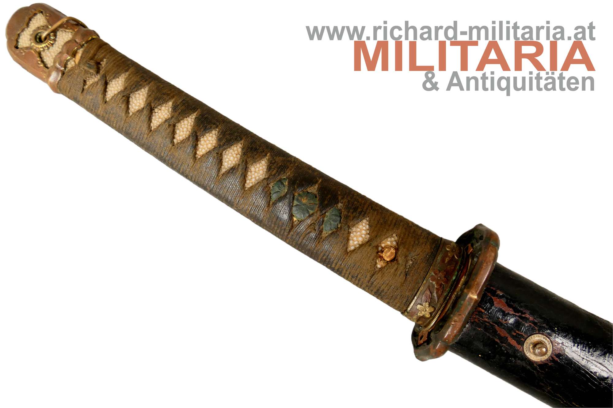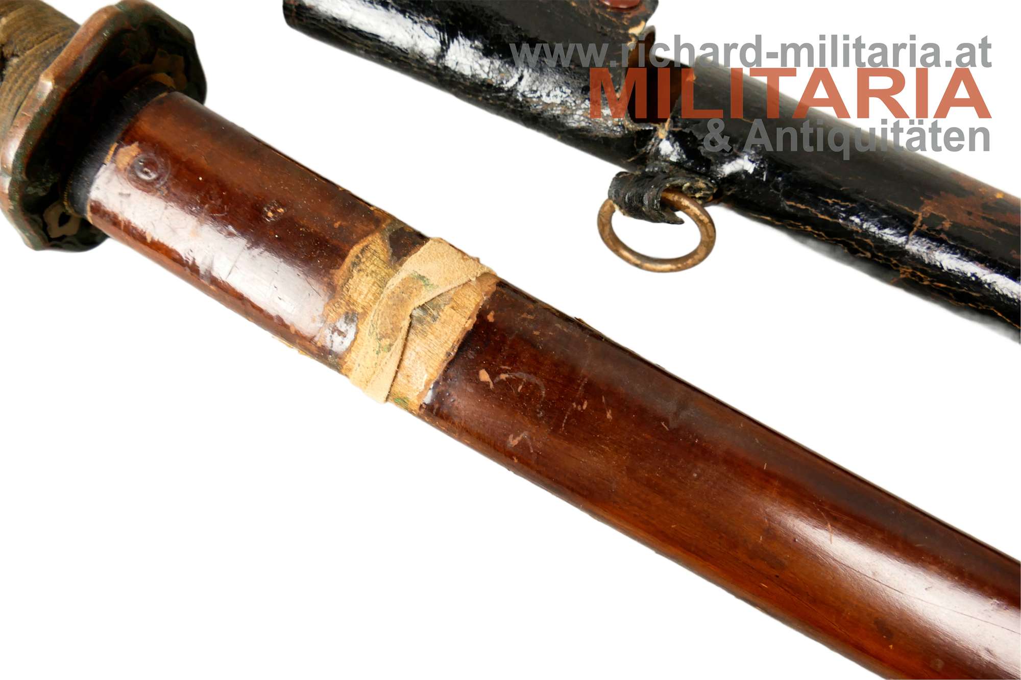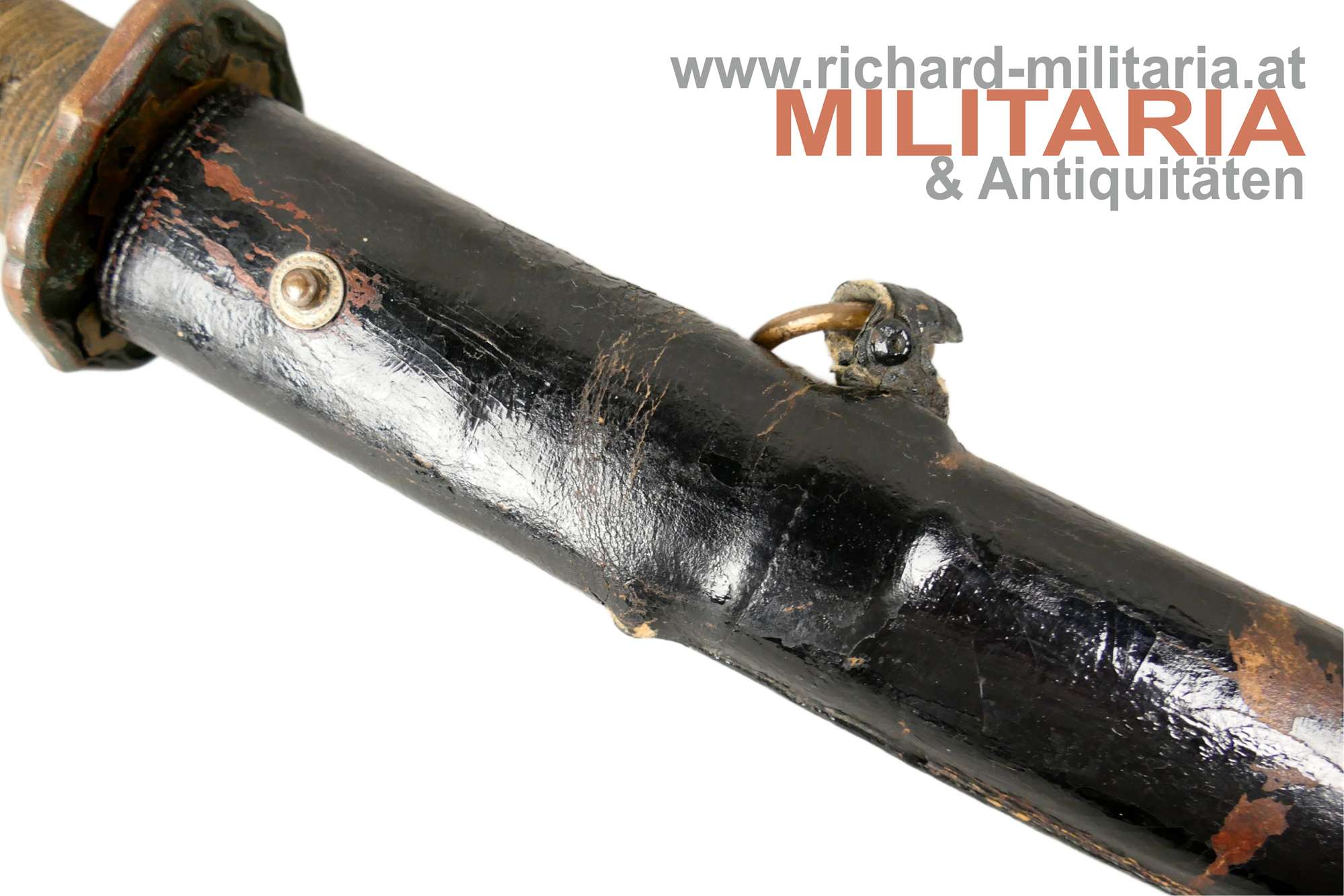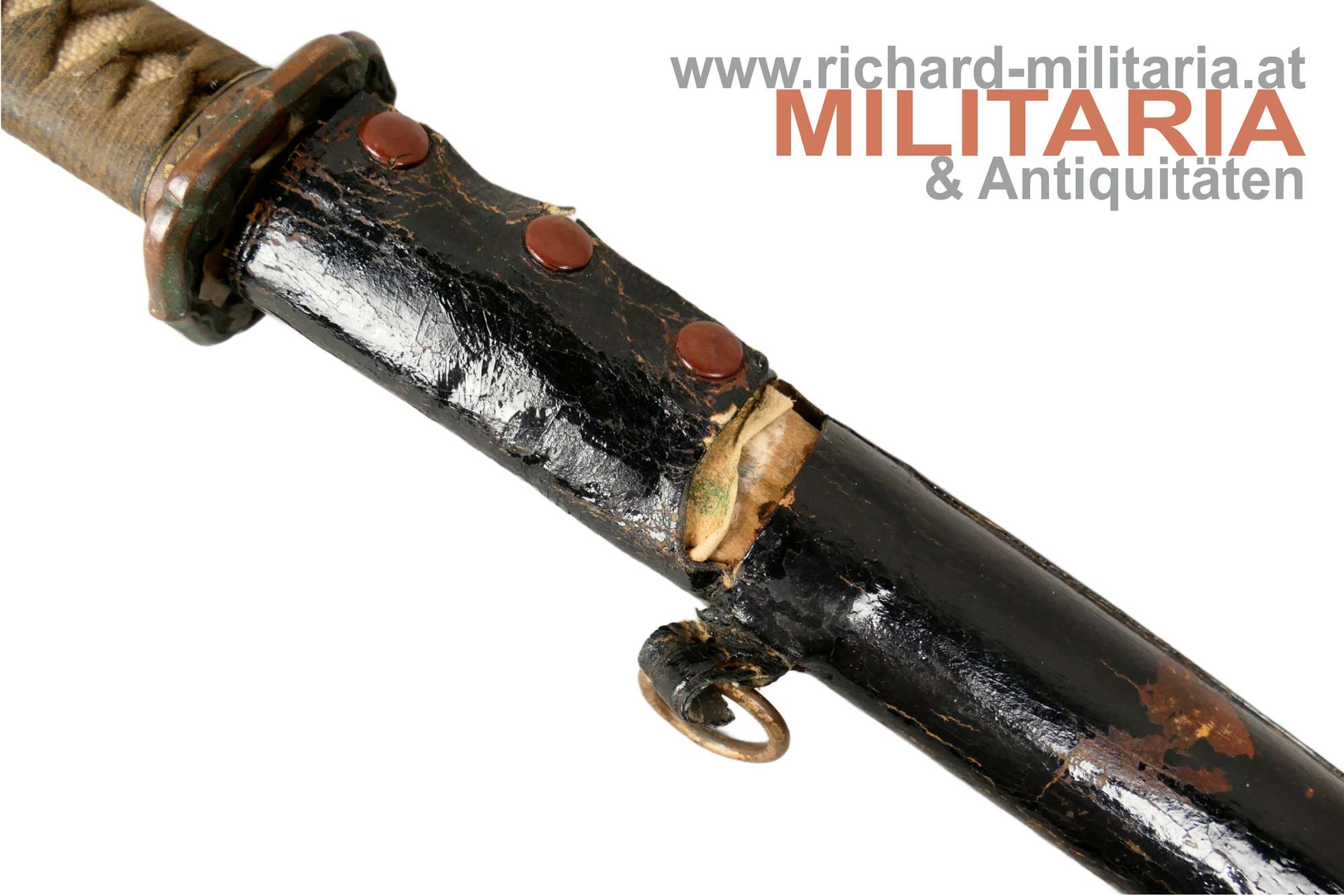 Kaiserlich japanisches Armee-Katana Typ 98 - Shin-Gunto; Showa-Periode; handgeschmiedete Klinge; signierter tang mit kanji " 谷口義包作 “Made by Yoshikane Taniguchi” und das Schriftzeichen 関 "SEKI" ; bronzenes habaki; gute leicht fleckige Klinge und erkennbarem hamon; tsuka in der typischen Armeeausführung für Offiziere mit originaler tsuka-maki; militärische menuki in Form von 3 Lotusblüten - passend zu fuchi, kashira und tsuba: hölzene glanzlackierte saya mit schwarzem Lack-Lederüberzug; Kurigata fehlt (Öffnung im Überzug auch vorhanden); am Überzug Trageöse mit Messingring; Lederüberzug mit 3 Druckknöpfen verschließbar. Fehlstellen im Überzug und der saya - siehe Fotos.