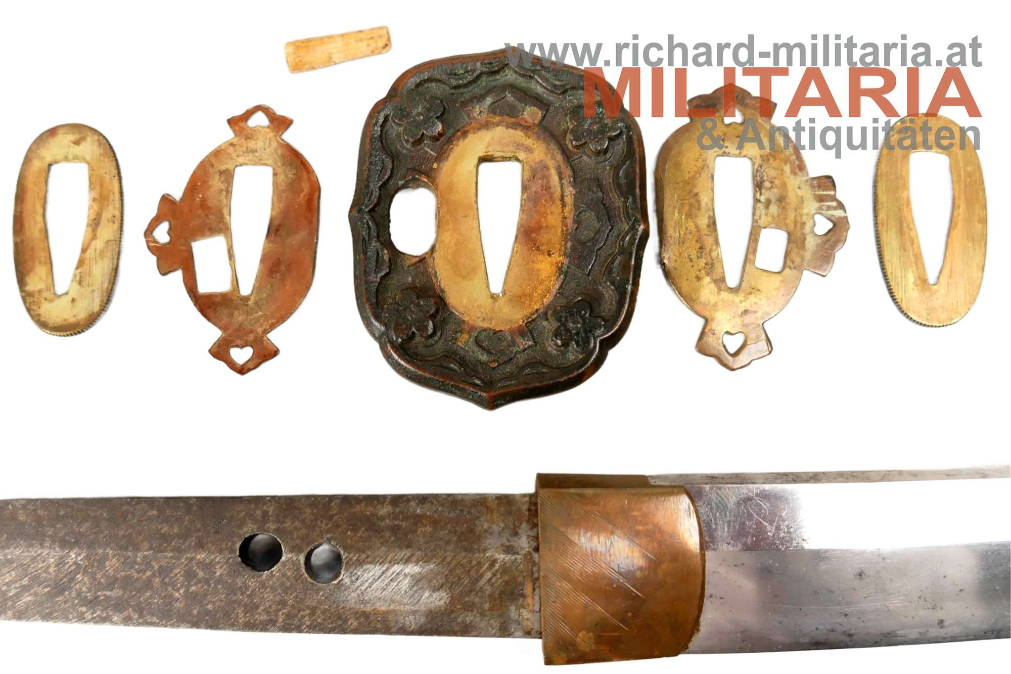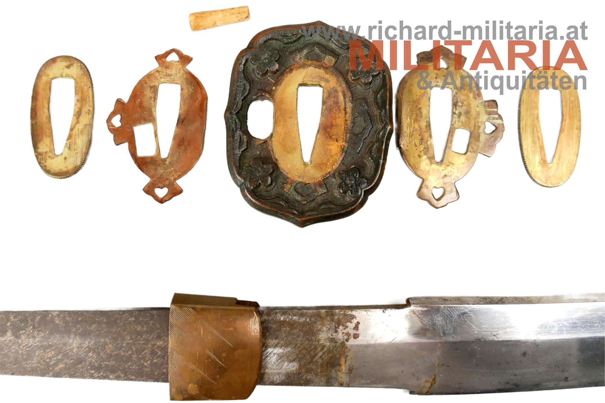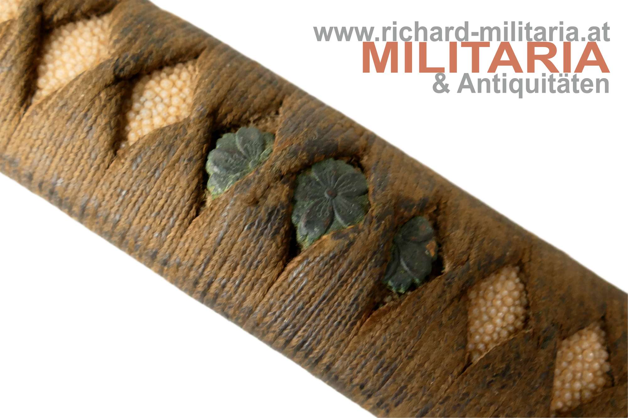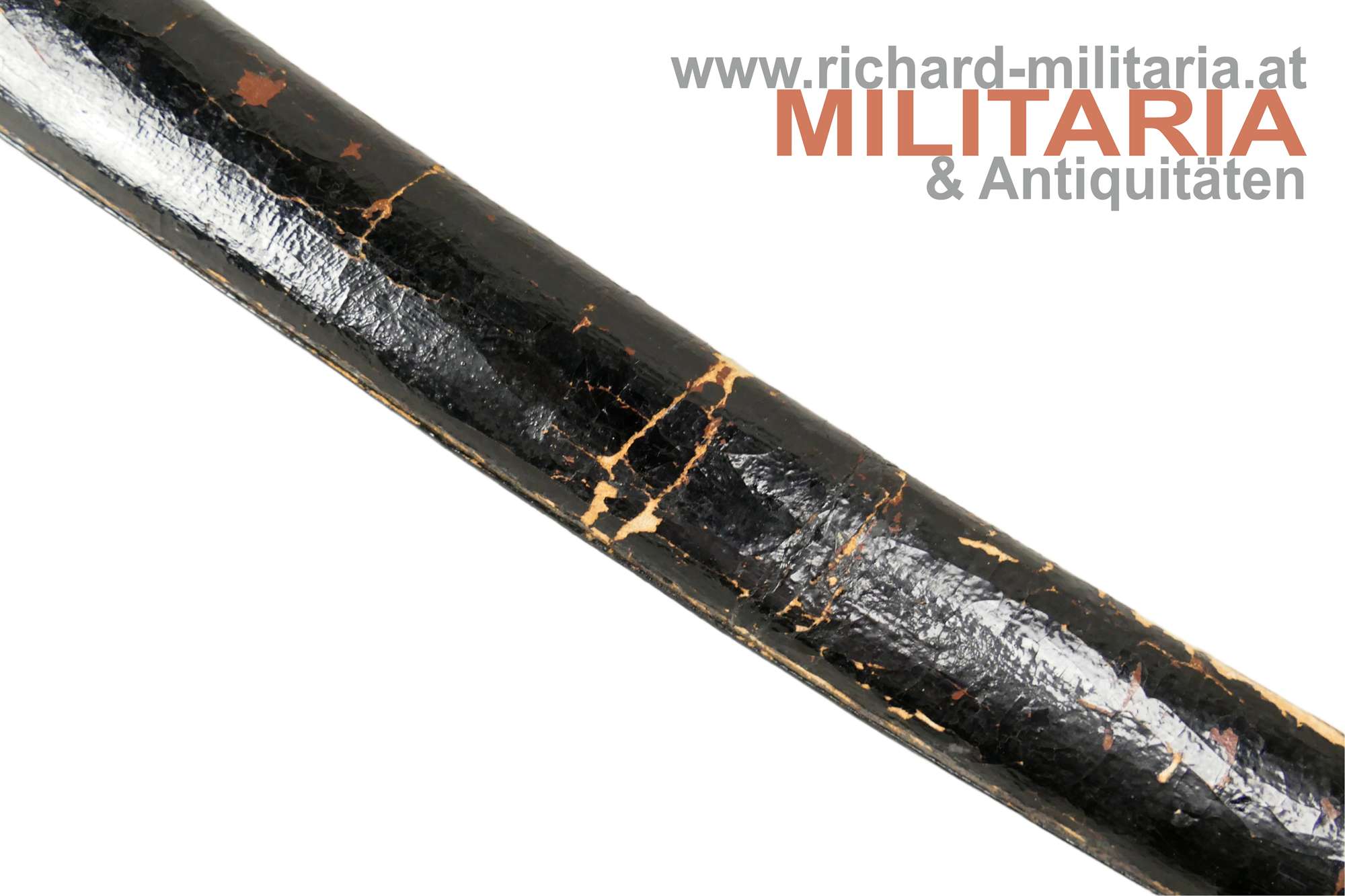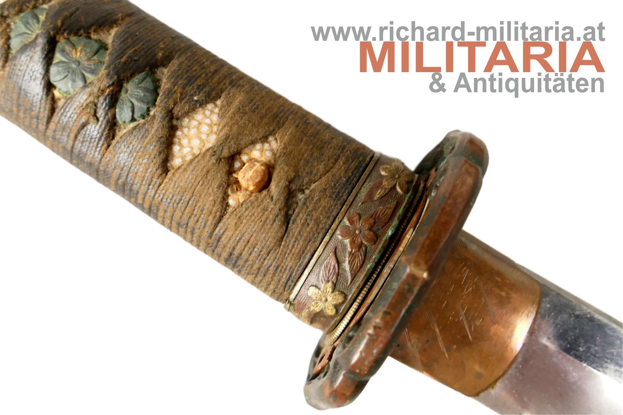 Kaiserlich japanisches Armee-Katana Typ 98 - Shin-Gunto; Showa-Periode; handgeschmiedete Klinge; signierter tang mit kanji " 谷口義包作 “Made by Yoshikane Taniguchi” und das Schriftzeichen 関 "SEKI" ; bronzenes habaki; gute leicht fleckige Klinge und erkennbarem hamon; tsuka in der typischen Armeeausführung für Offiziere mit originaler tsuka-maki; militärische menuki in Form von 3 Lotusblüten - passend zu fuchi, kashira und tsuba: hölzene glanzlackierte saya mit schwarzem Lack-Lederüberzug; Kurigata fehlt (Öffnung im Überzug auch vorhanden); am Überzug Trageöse mit Messingring; Lederüberzug mit 3 Druckknöpfen verschließbar. Fehlstellen im Überzug und der saya - siehe Fotos.