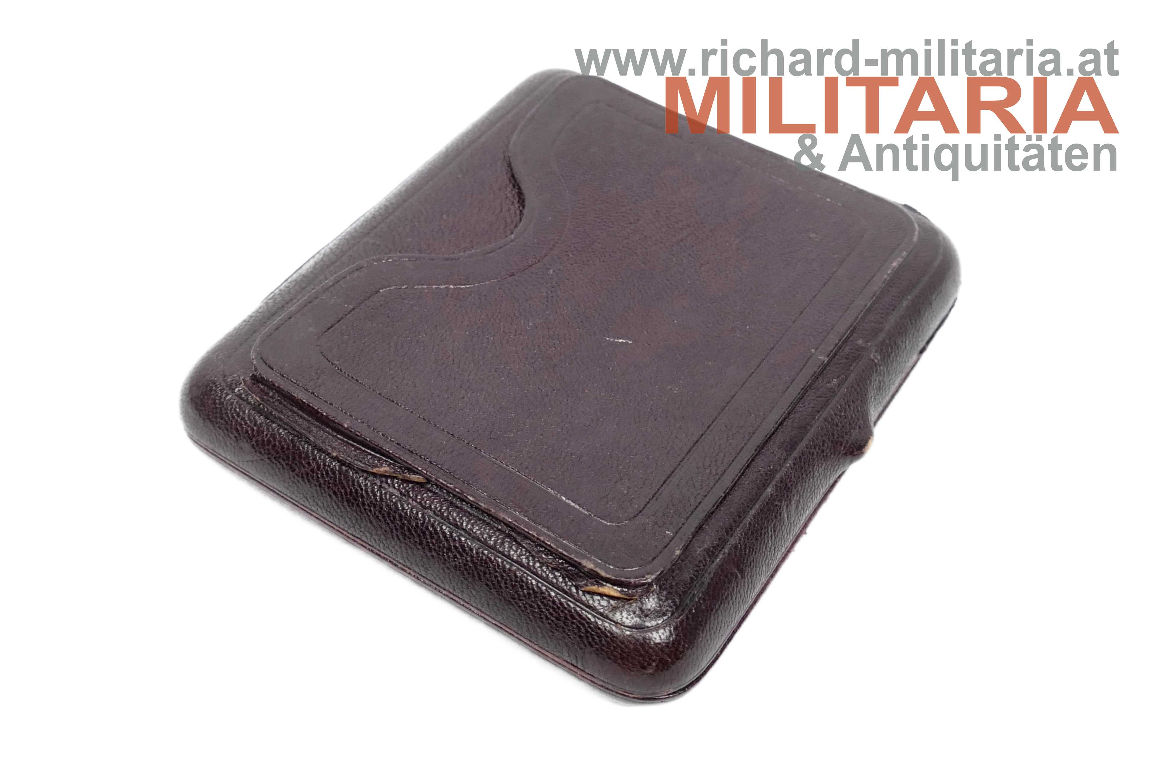 Originales Etui zu einer kaiserlichen Geschenkuhr; braunes Lederetui mit aufgedrucktem goldenen k.u.k. Doppeladler; innen mit violettem Samt ausgelegt und mittig eine Halterung für eine Taschenuhr; Durchmesser der Haltung 50 mm; auf der Rückseite des Etuis eine Einschubtasche; Format des Etuis ca. 13,5 x 12 x 3 cm