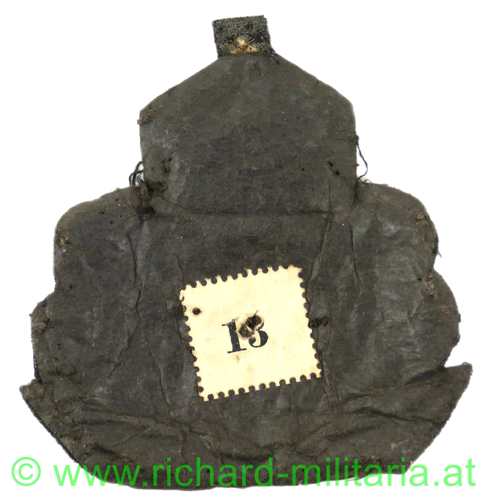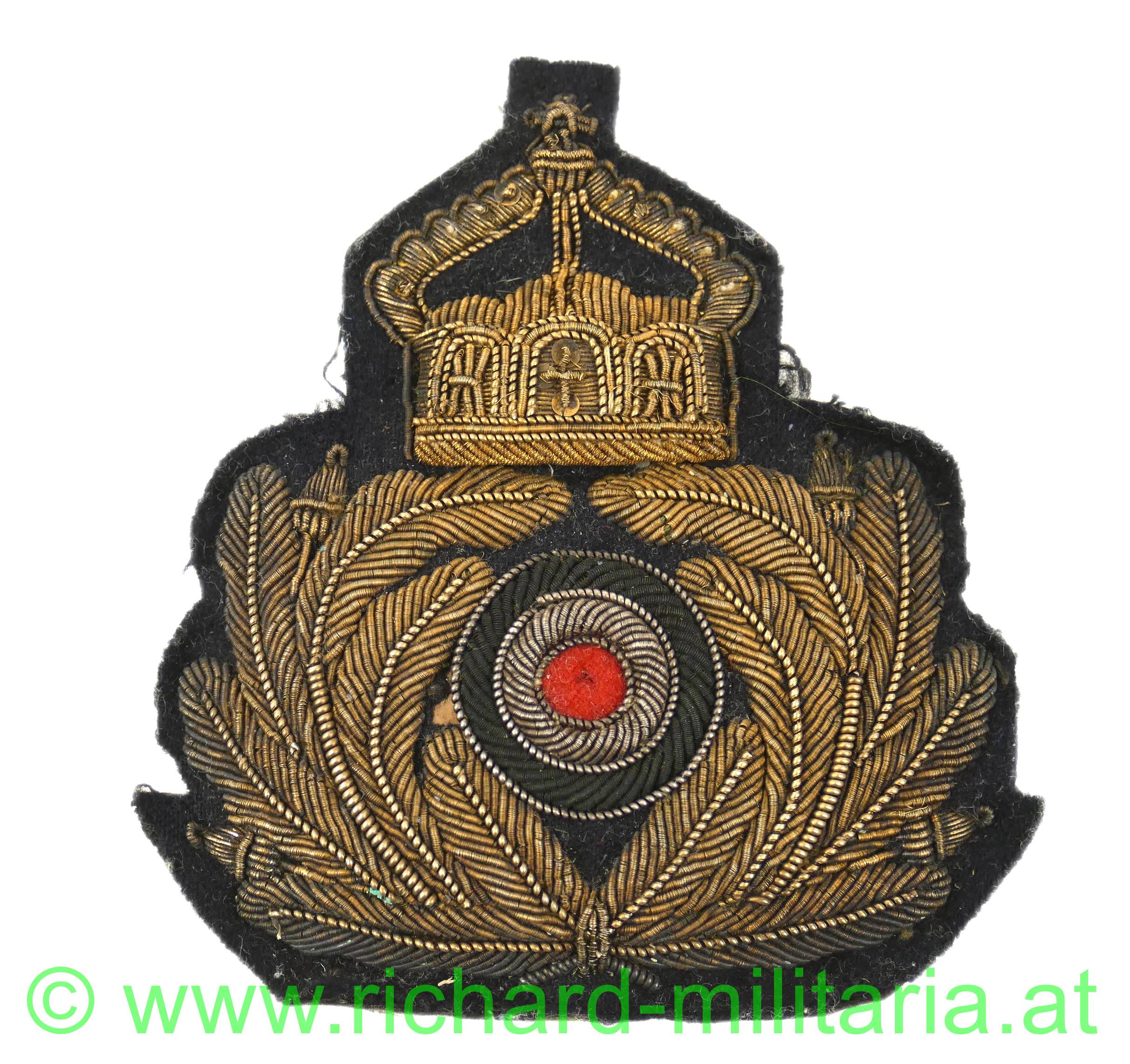 Kaiserliche Marine - Schirmmützenabzeichen f. Offiziere, Metallfaden handgestickte Ausführung, Kaiserkrone über Eichenlaubkranz mit Reichskokarde, Rückseite mit originaler Papierabdeckung und aufgeklebter Nummer "13";