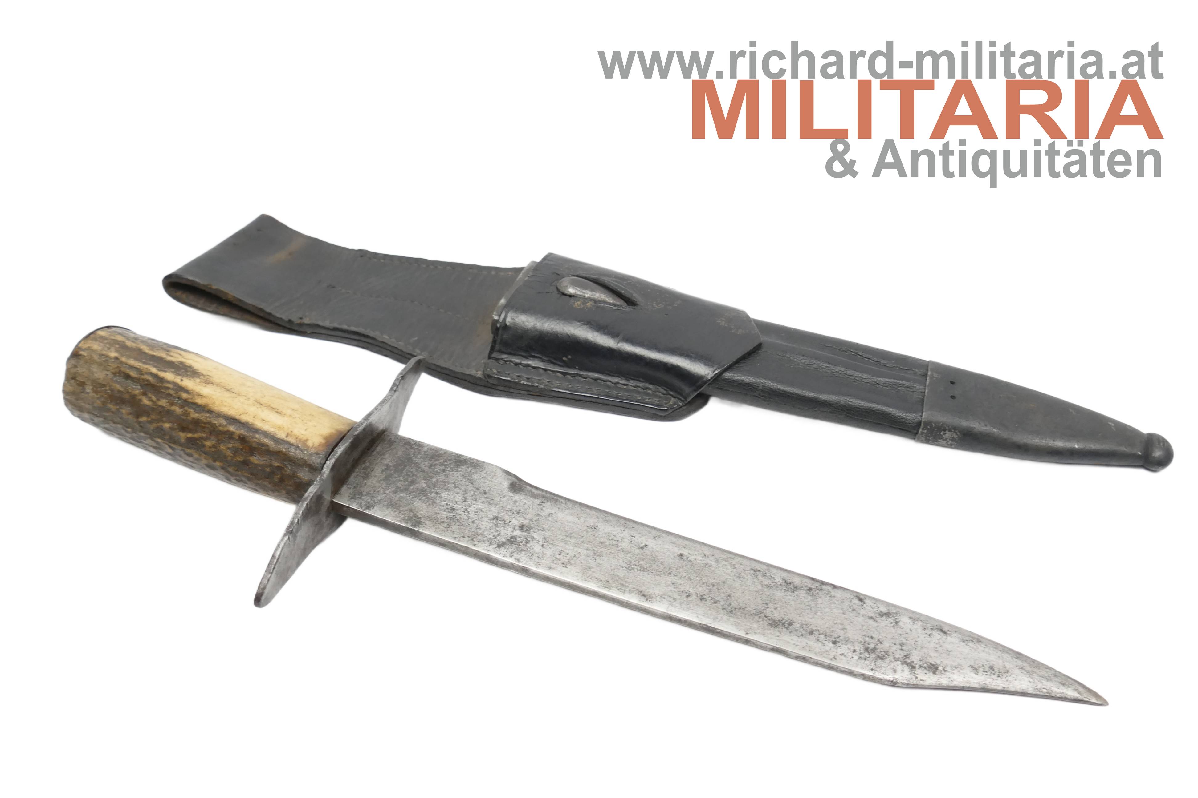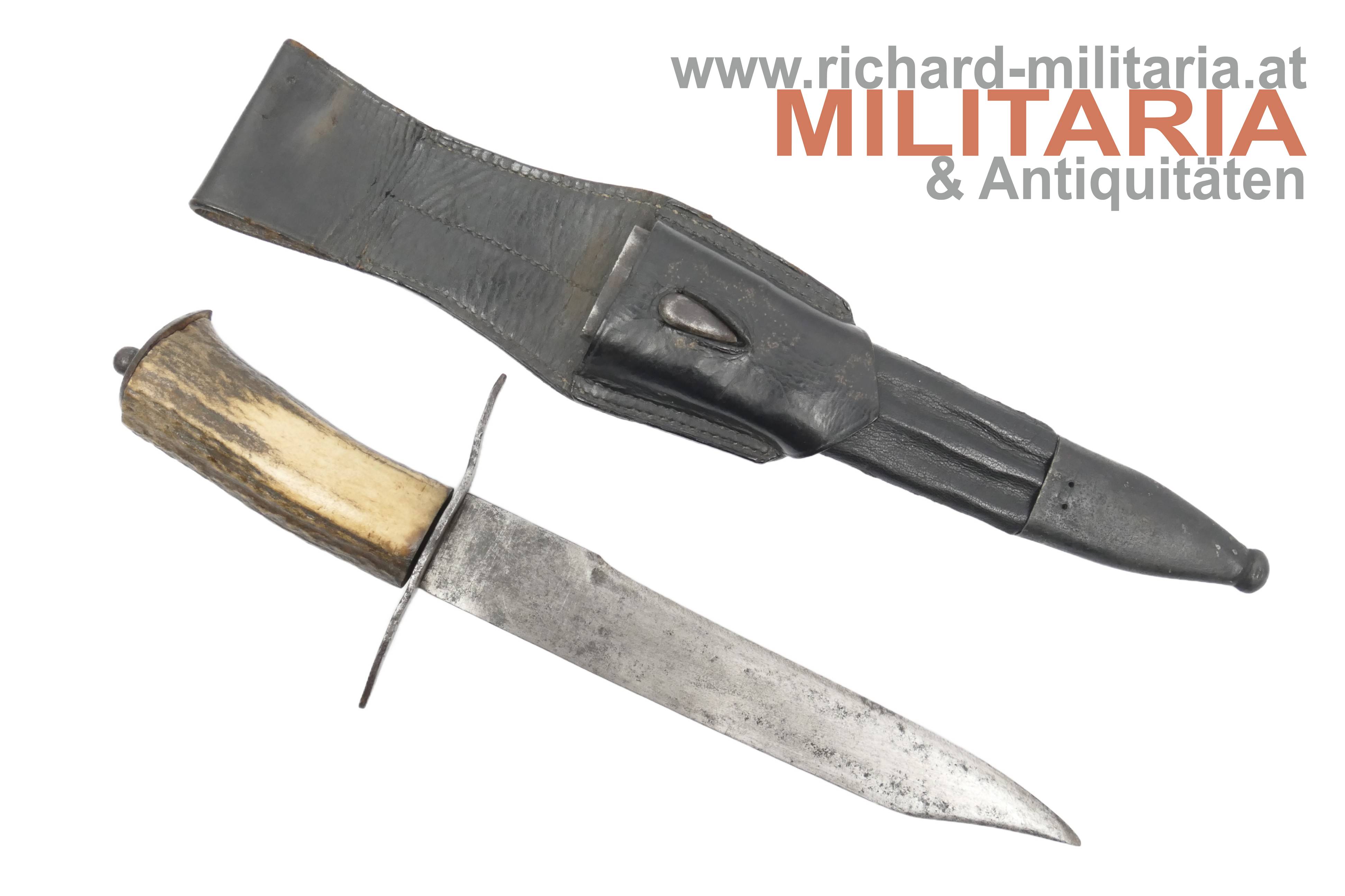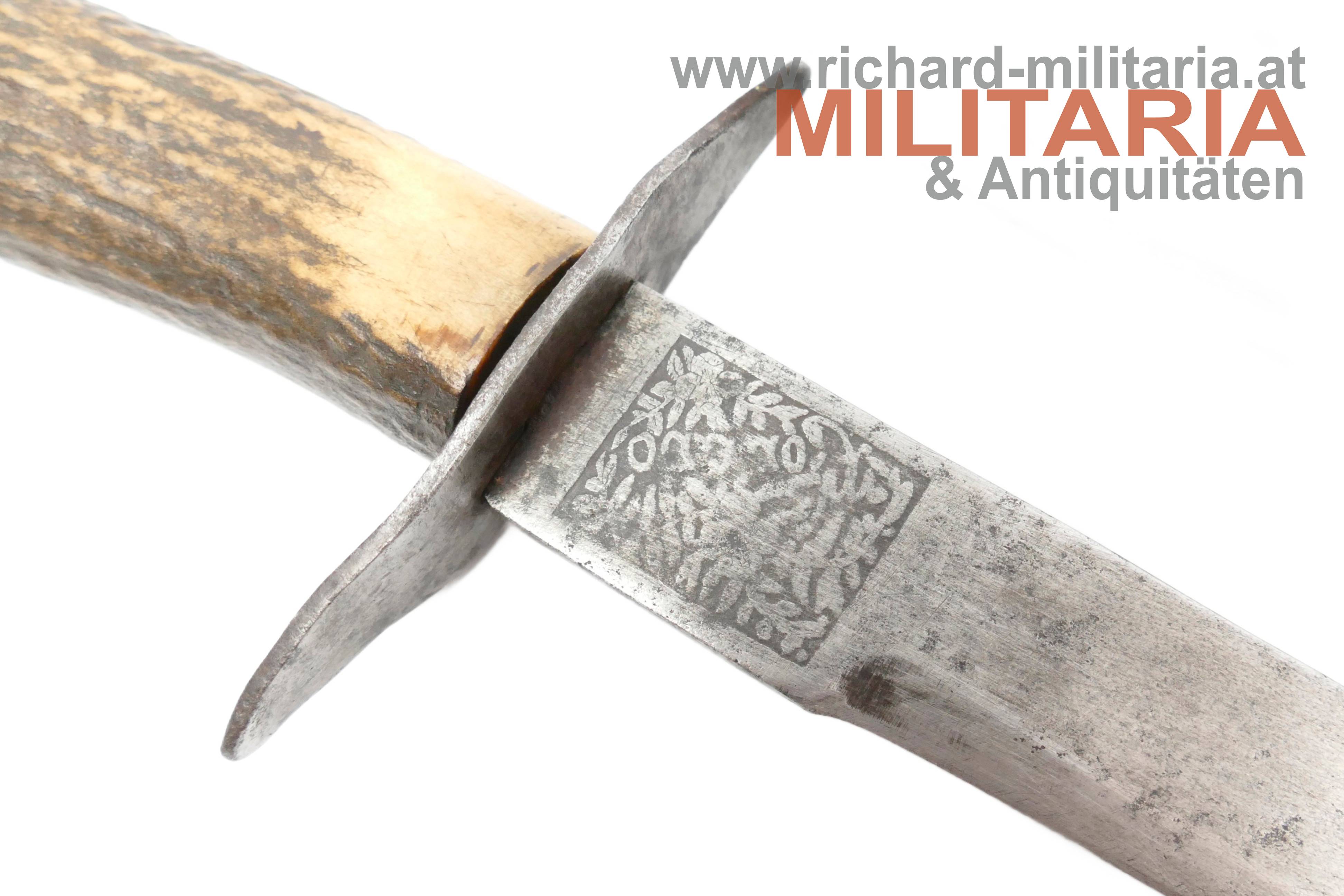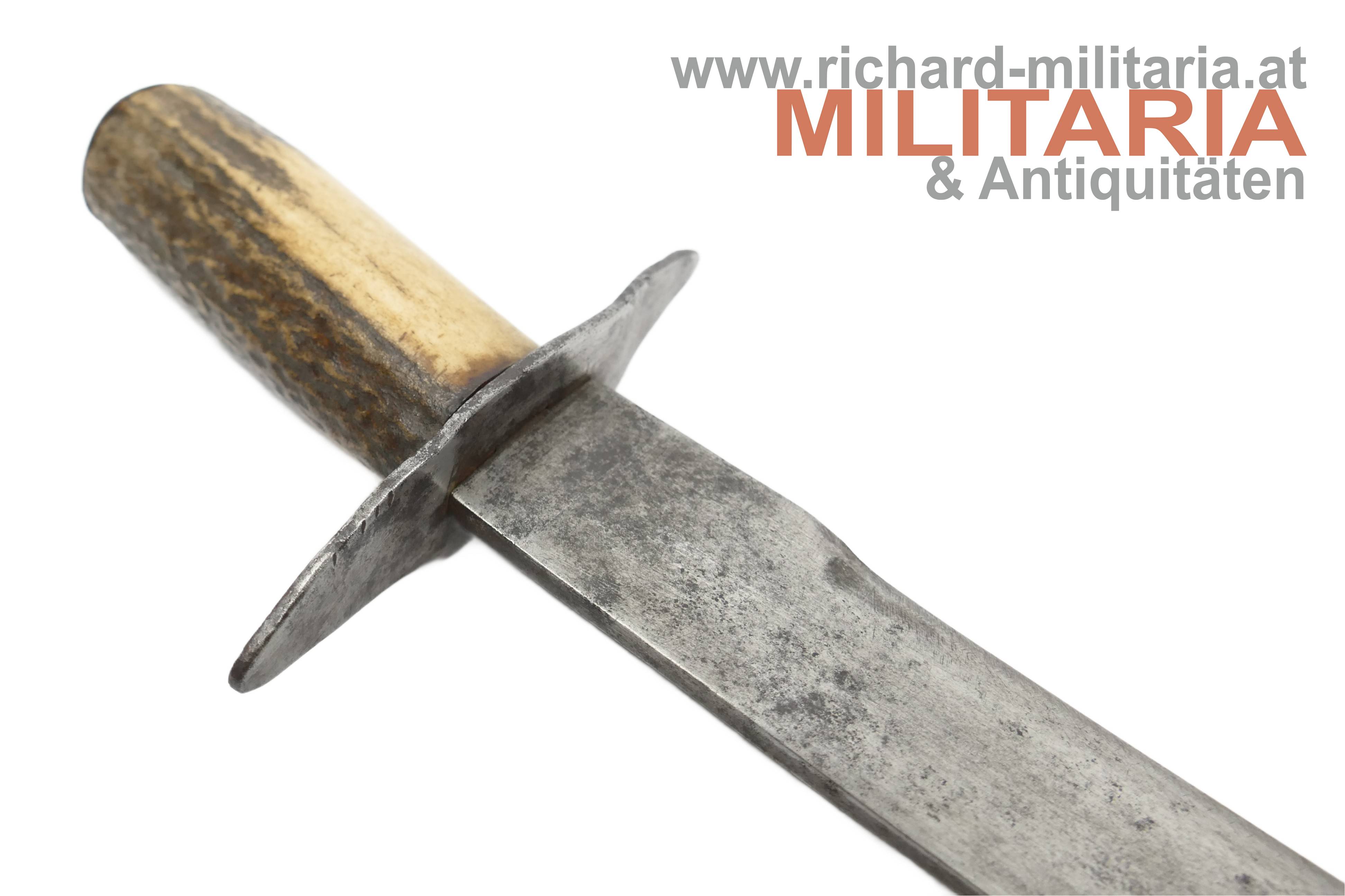 Kampfmesser mit Scheide und Koppelschuh; einschneidige fleckige Klinge; auf der Fehlschärfe einseitig mit Klingenverzierung aus Toledo; Parierstange etwas locker; Hirschhorngriff mit Eisenabschluss; Eisenscheide mit schwarzem Lederbezug und geschwärztem Eisenbeschlag; zugehöriger schwarzer Koppelschuh alle Nähte fest;