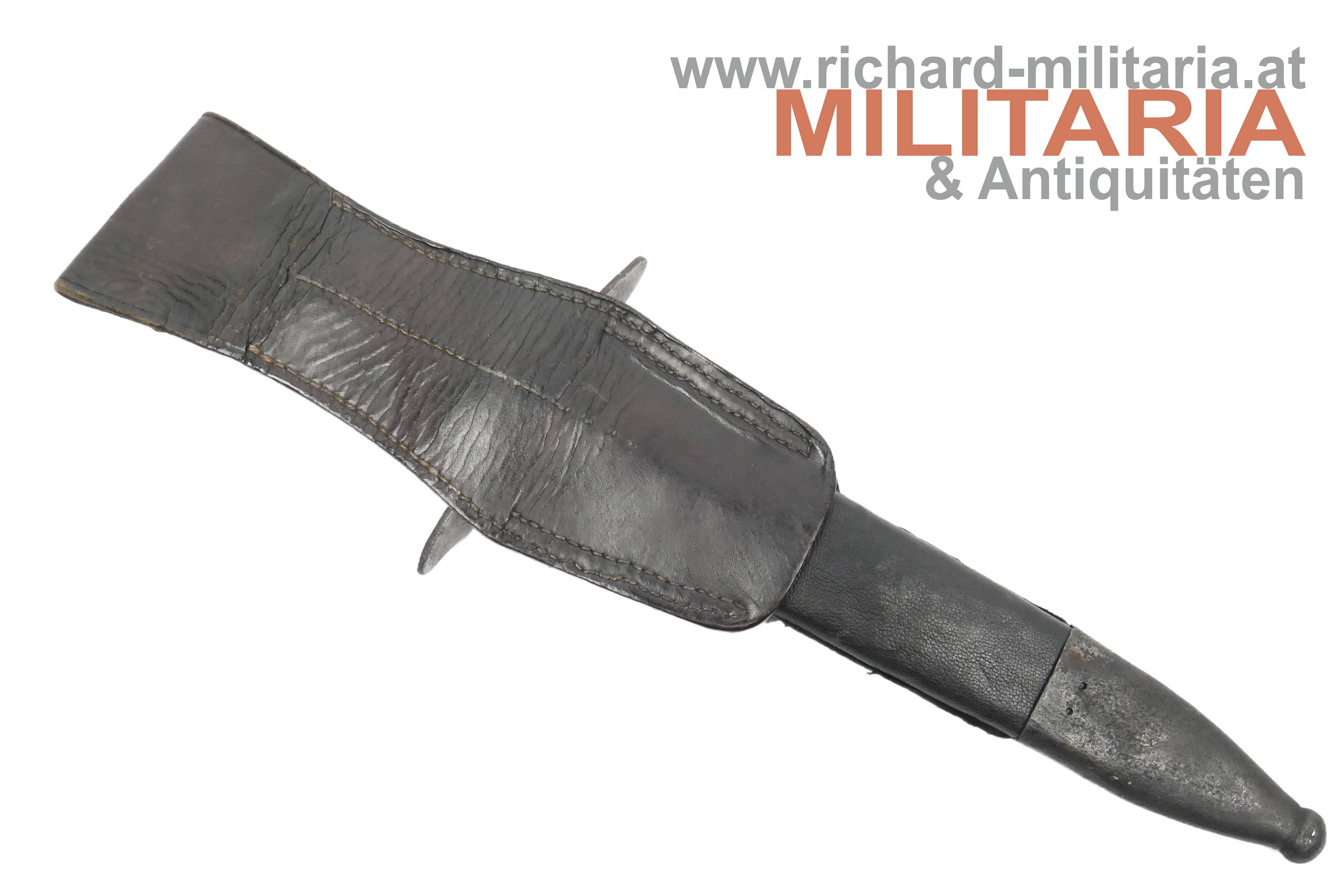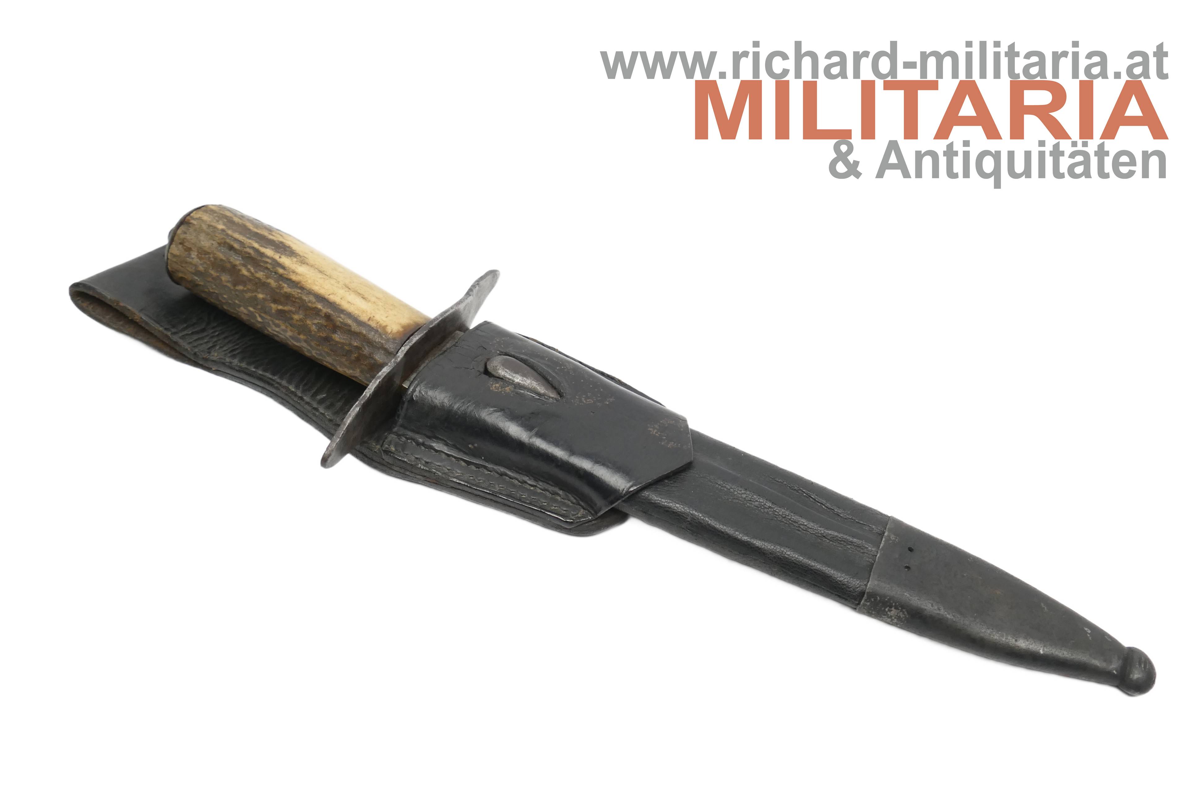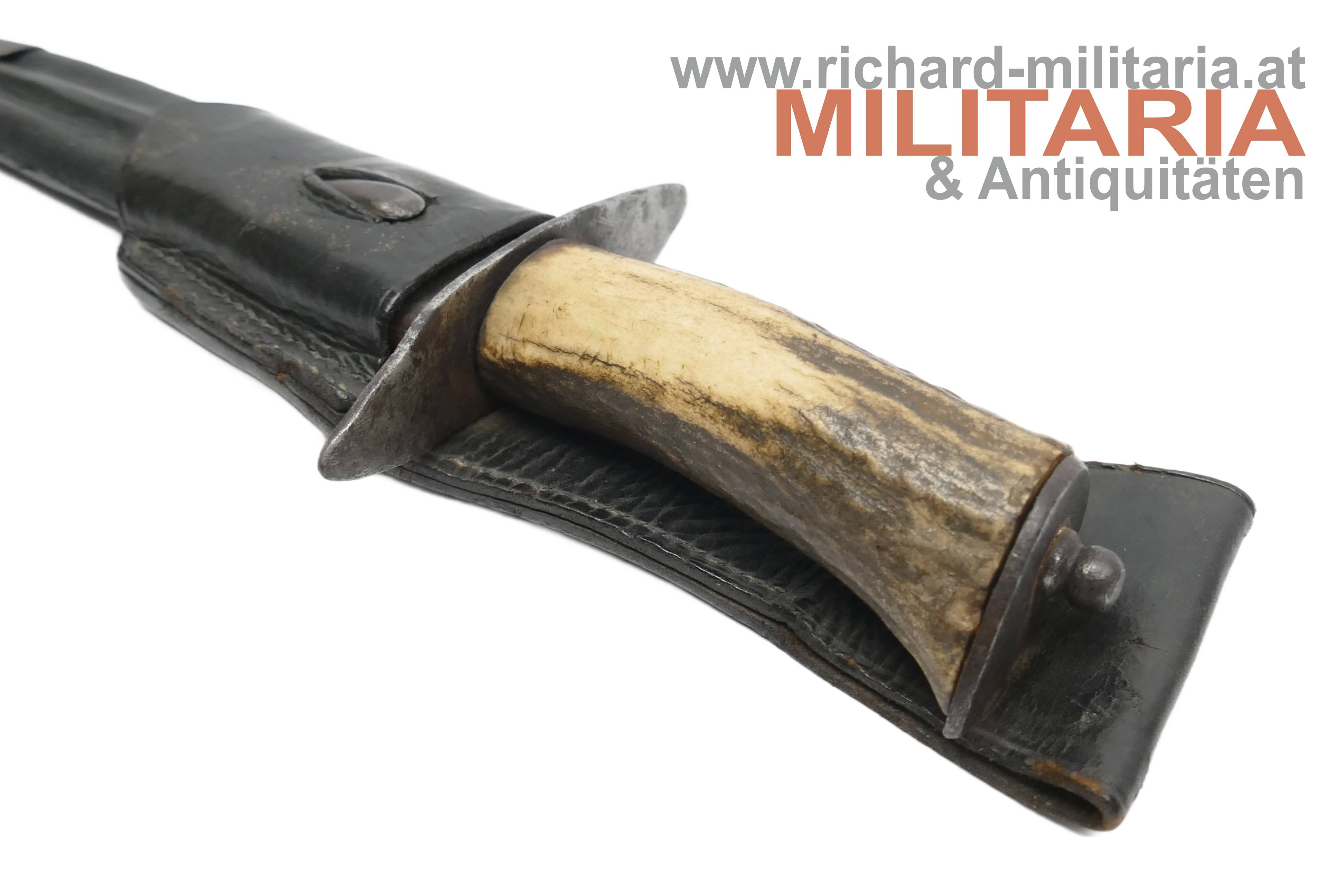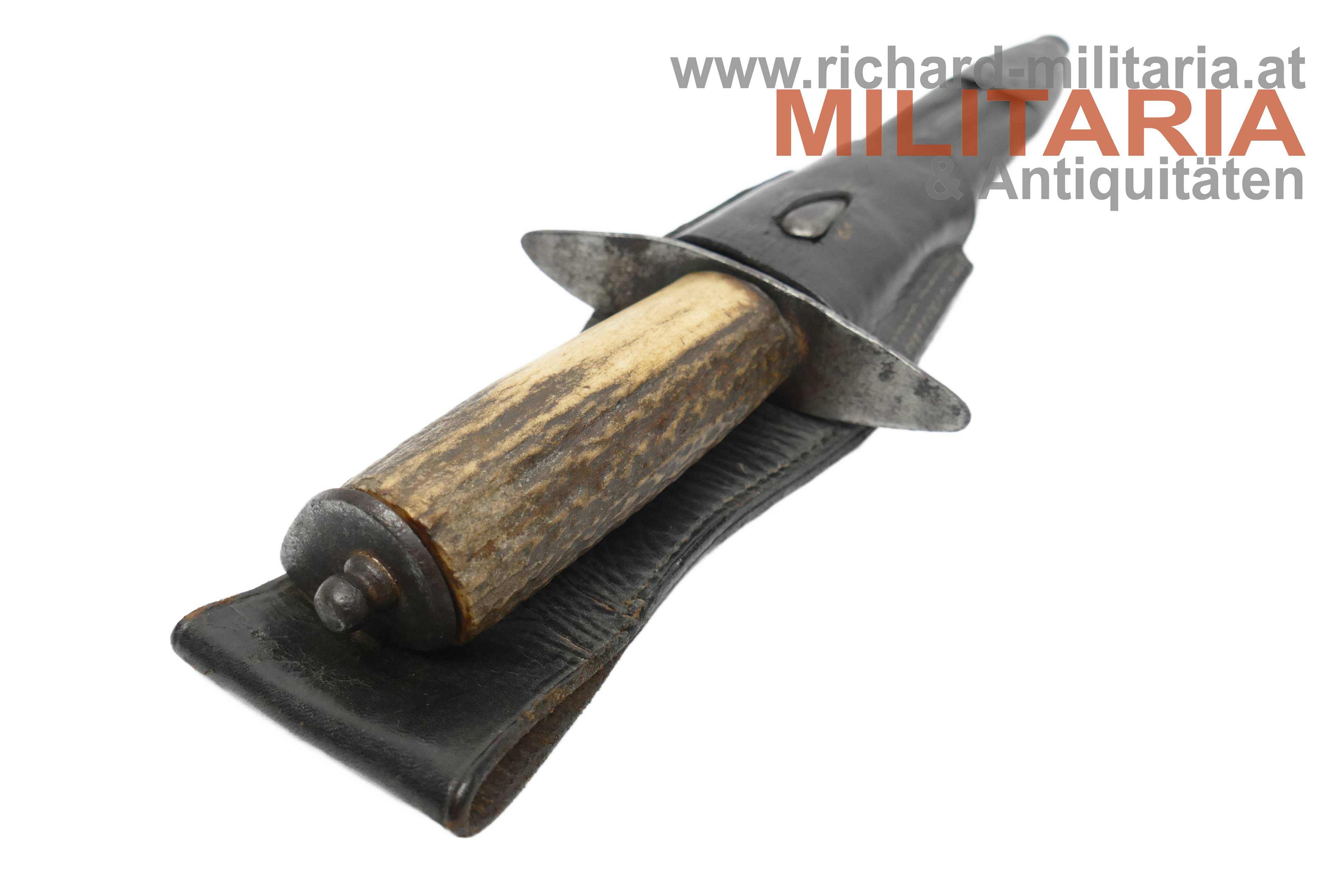 Kampfmesser mit Scheide und Koppelschuh; einschneidige fleckige Klinge; auf der Fehlschärfe einseitig mit Klingenverzierung aus Toledo; Parierstange etwas locker; Hirschhorngriff mit Eisenabschluss; Eisenscheide mit schwarzem Lederbezug und geschwärztem Eisenbeschlag; zugehöriger schwarzer Koppelschuh alle Nähte fest;