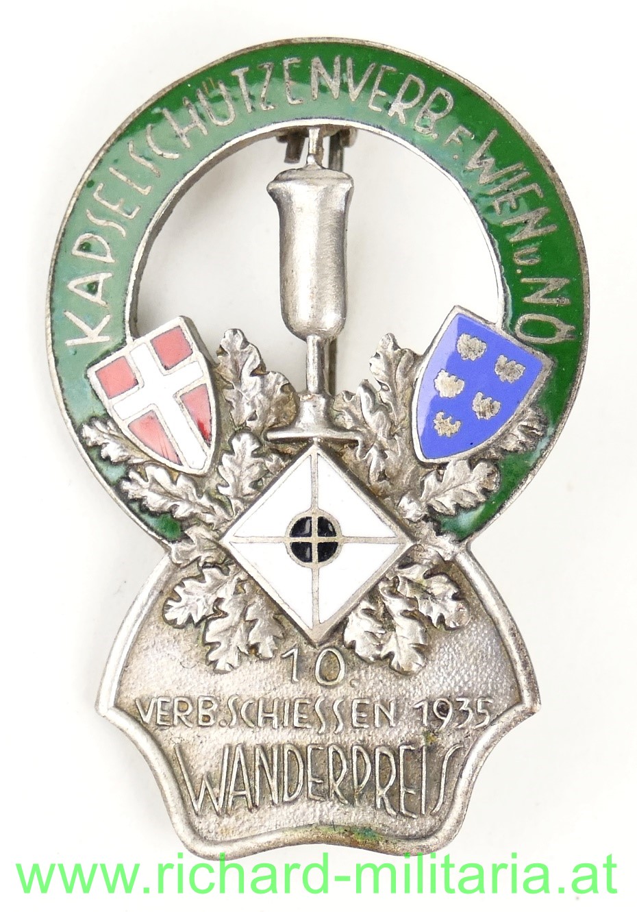 Kapselschützenverband für Wien und Niederösterreich - 1935 - "10. Verbandsschießen - WANDERPREIS" teilweise emailliert, kein Hersteller ersichtlich, an originaler Nadel - Selten