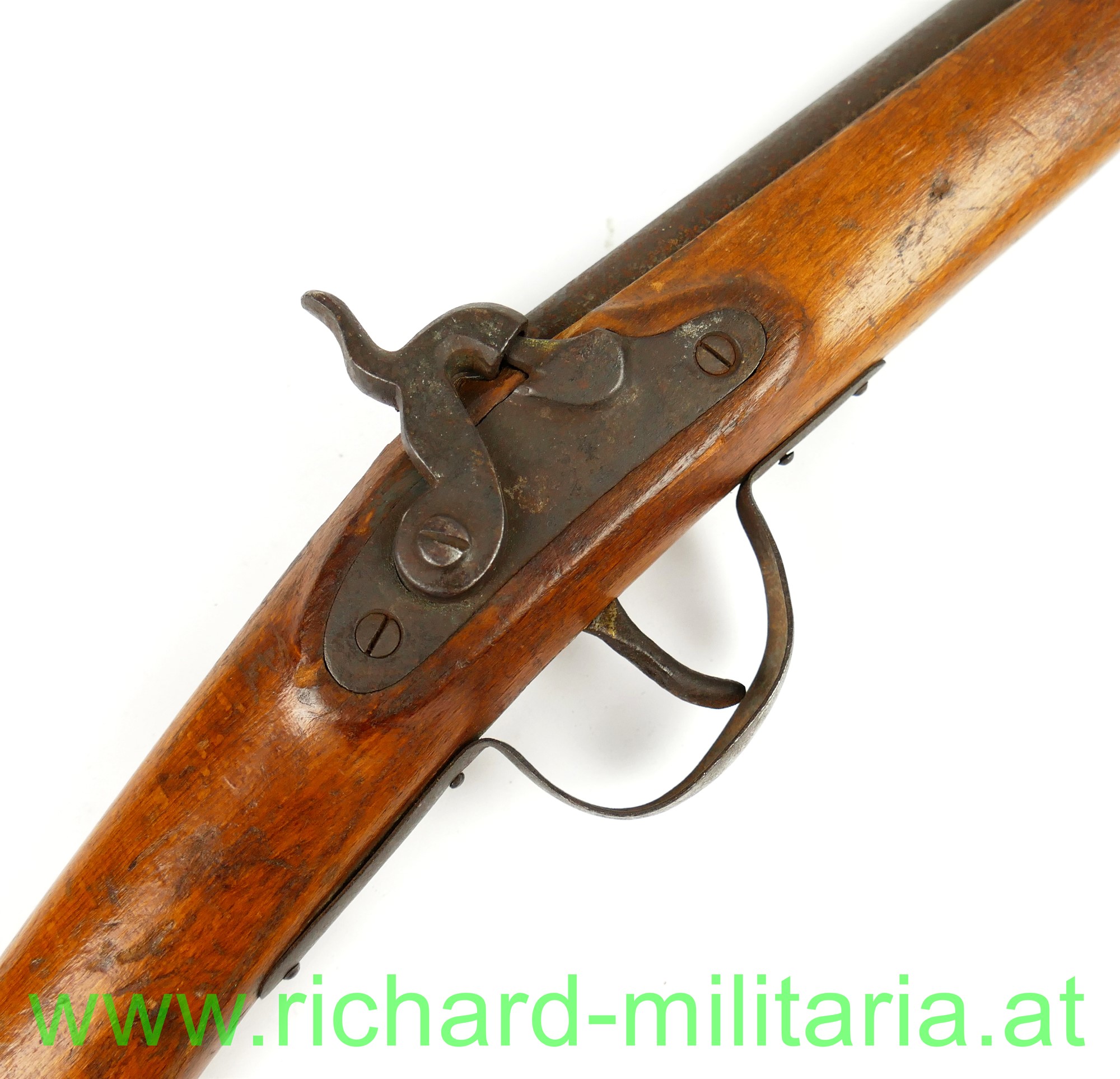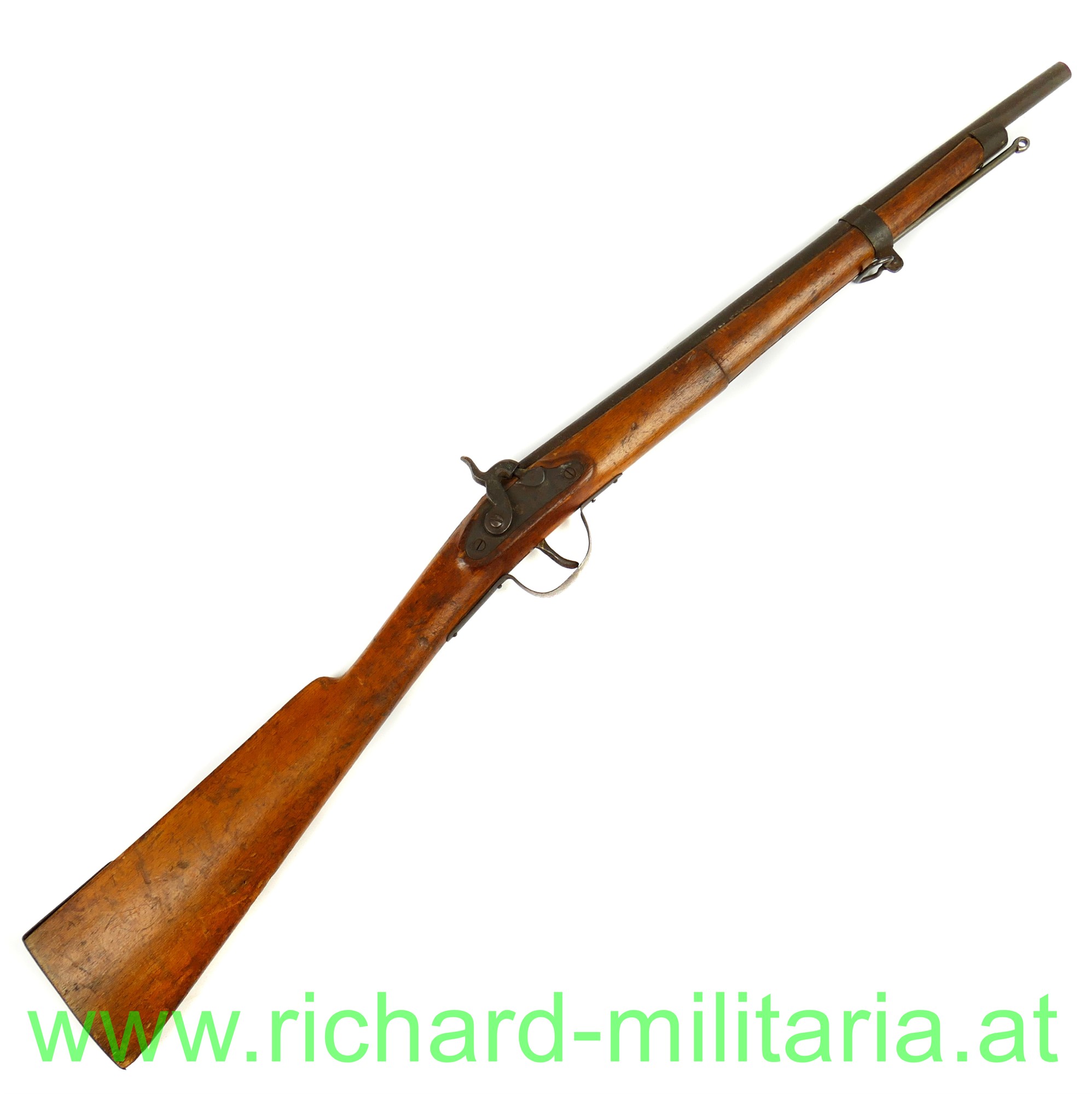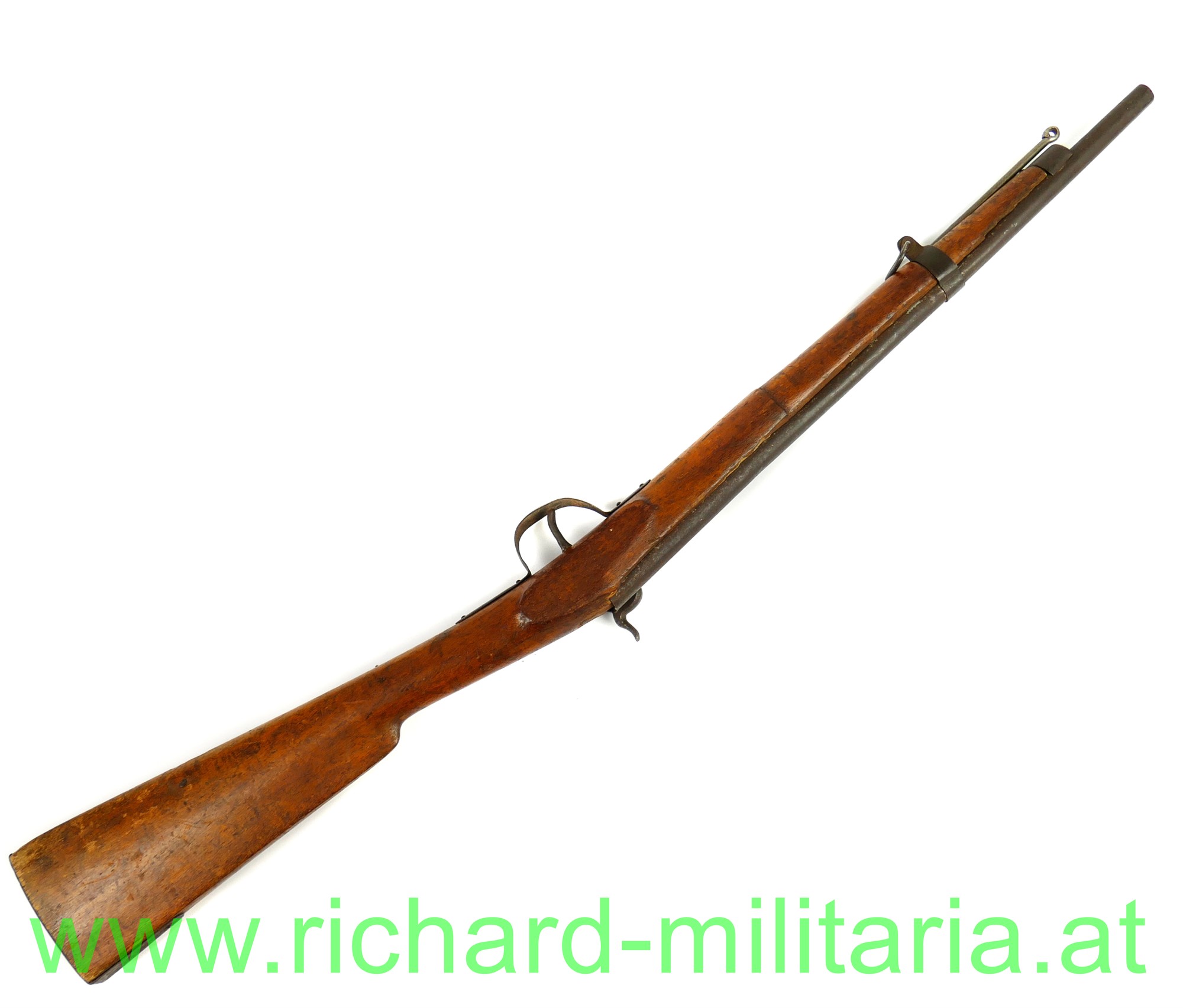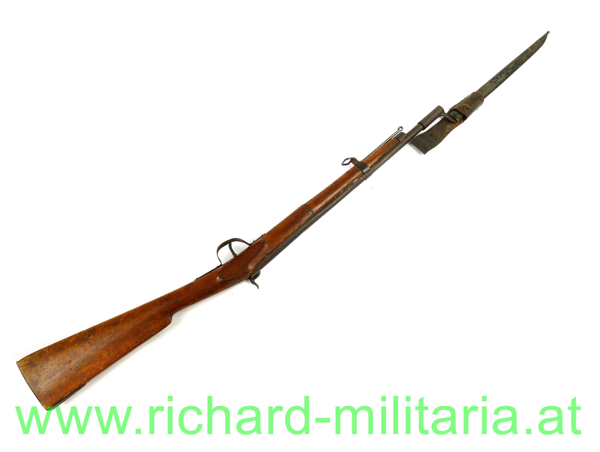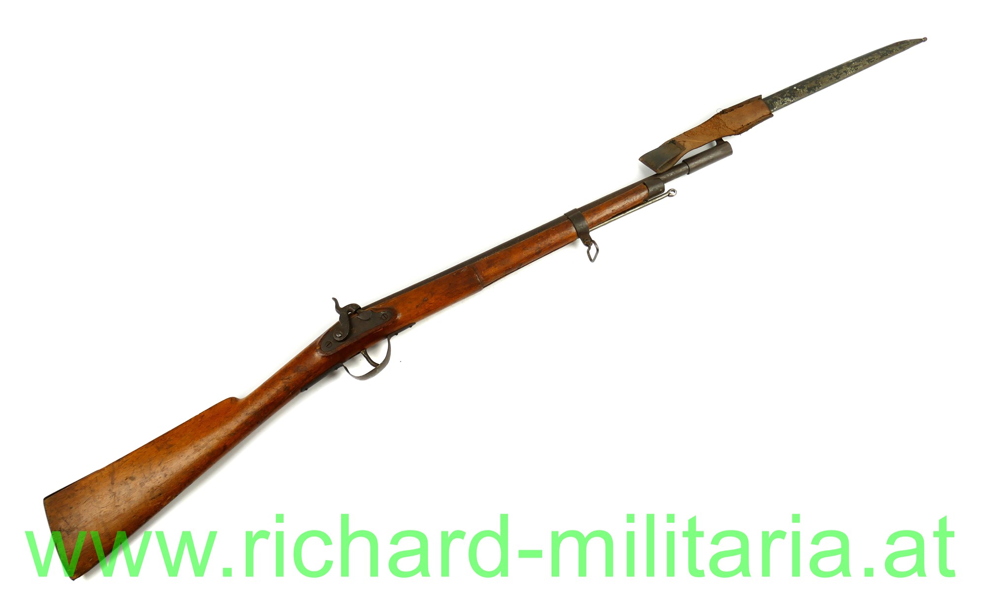 Kindergewehr - k.u.k. Infanteriegewehr Lorenz M1854 mit Bajonett; Schaft aus Holz mit Eisenbeschlägen und Perkussionsschloss zum 2-mal Aufziehen, funktioniert wie ein Kapselbracker, wird mit dem Ladestock im Lauf aufgezogen, Ladestock ergänzt, am Schaft fehlt ein Tragering für den Gurt; dazugehöriges Bajonett mit Scheide und originalem Koppelschuh aus Leder; Klinge vom Bajonett stumpf - kindertauglich (für die damalige Zeit !); Reste von der Originallackierung auf der Scheide noch vorhanden (!),