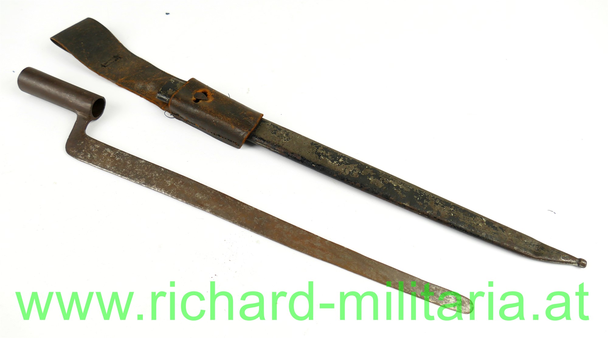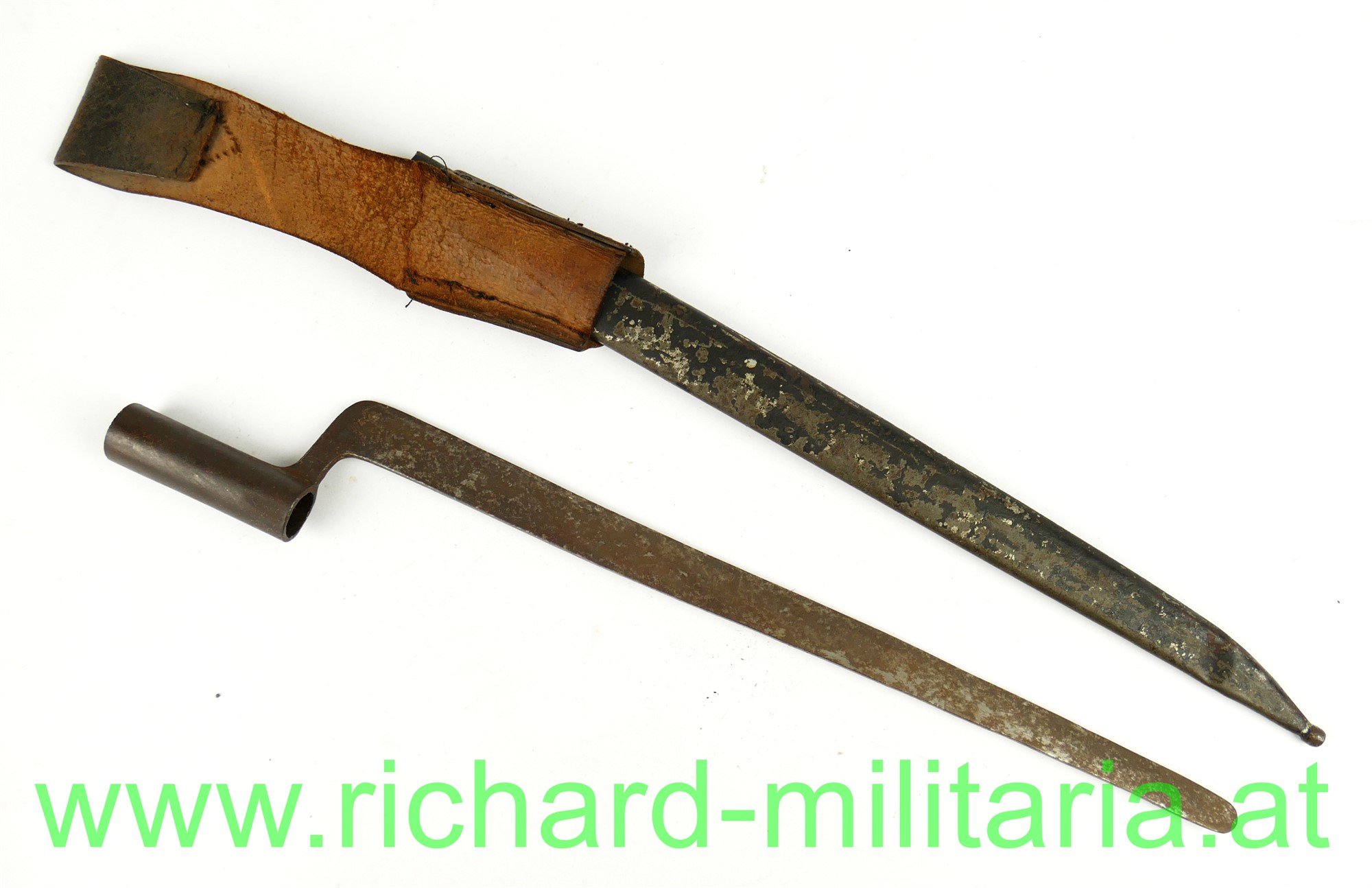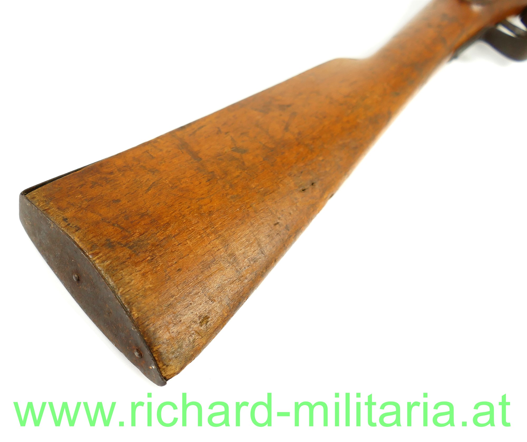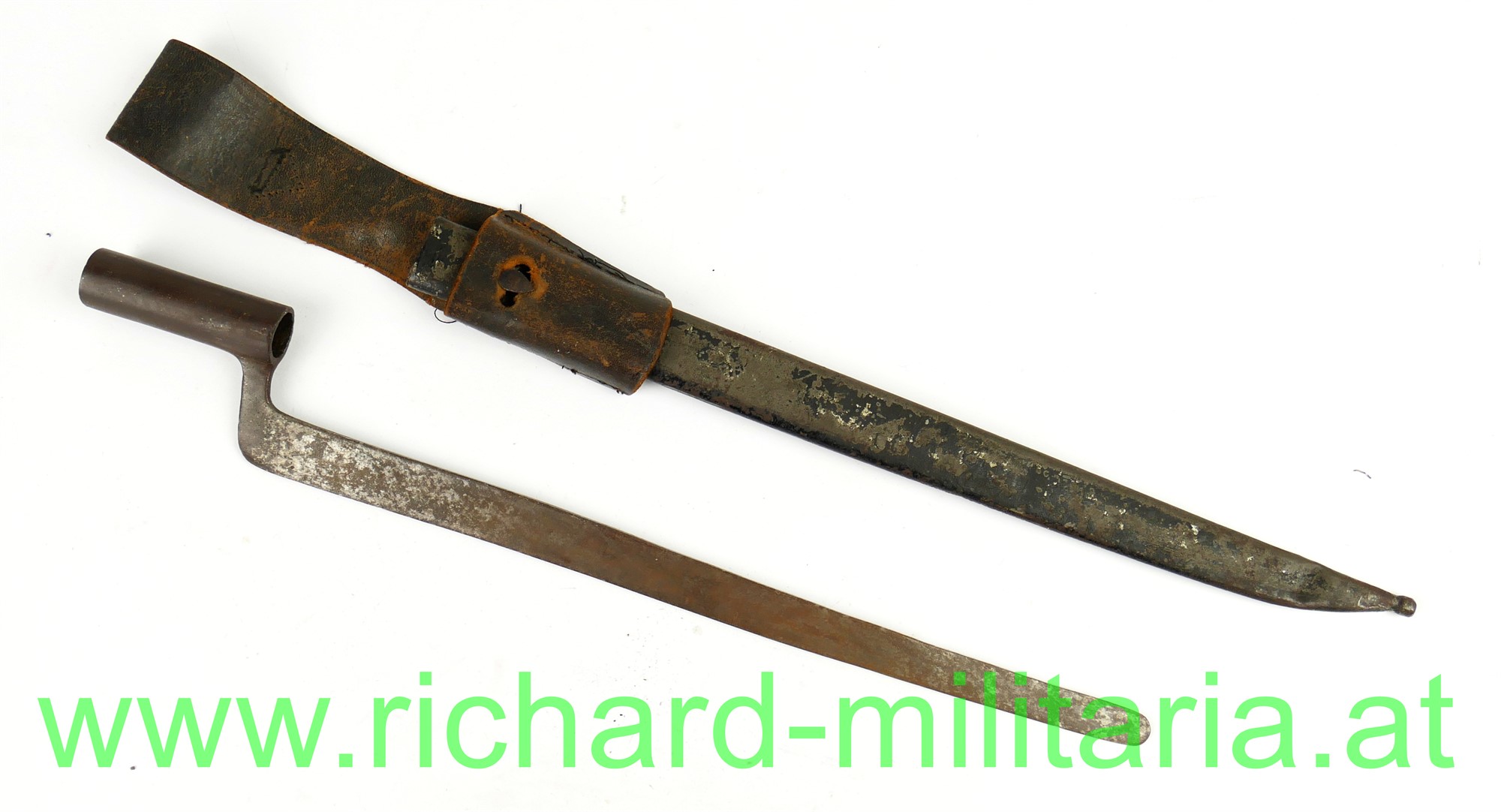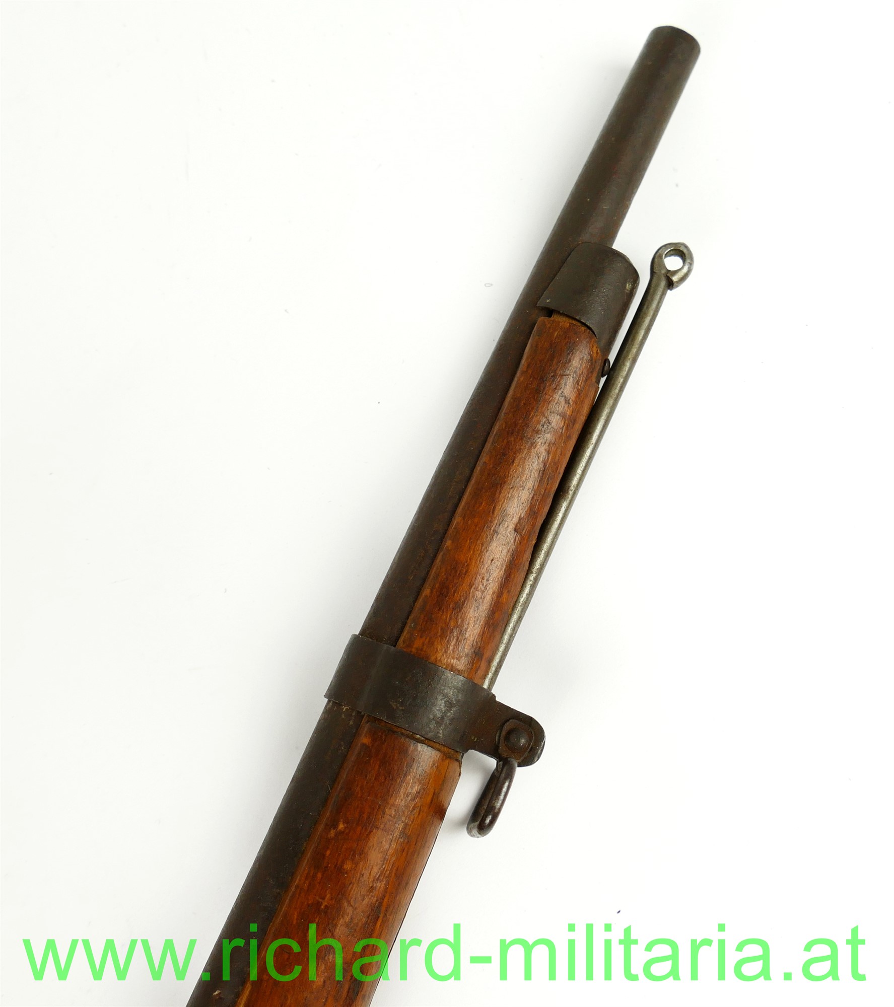 Kindergewehr - k.u.k. Infanteriegewehr Lorenz M1854 mit Bajonett; Schaft aus Holz mit Eisenbeschlägen und Perkussionsschloss zum 2-mal Aufziehen, funktioniert wie ein Kapselbracker, wird mit dem Ladestock im Lauf aufgezogen, Ladestock ergänzt, am Schaft fehlt ein Tragering für den Gurt; dazugehöriges Bajonett mit Scheide und originalem Koppelschuh aus Leder; Klinge vom Bajonett stumpf - kindertauglich (für die damalige Zeit !); Reste von der Originallackierung auf der Scheide noch vorhanden (!),