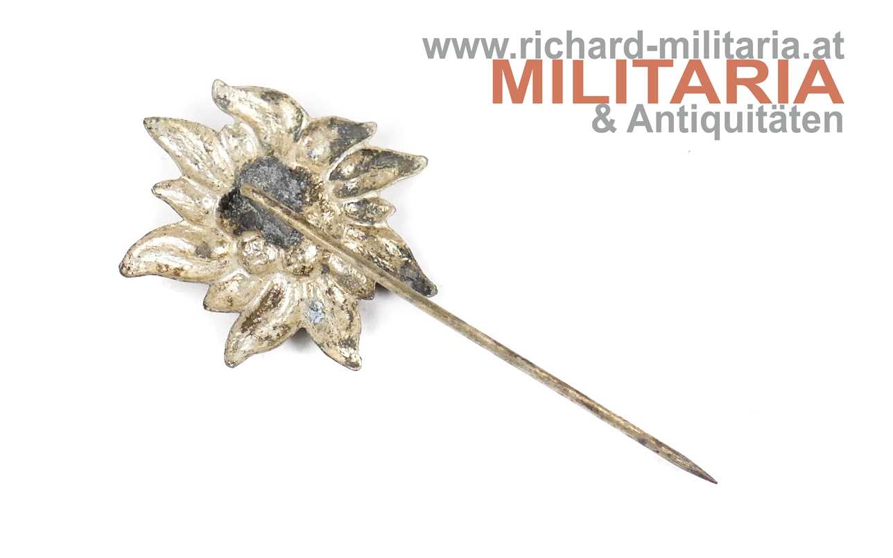 kleine Anstecknadel in der Form eines Edelweiss; Weißmetall, mit Nadel; in dieser Art von den k.k. Gebirgstruppen getragen;