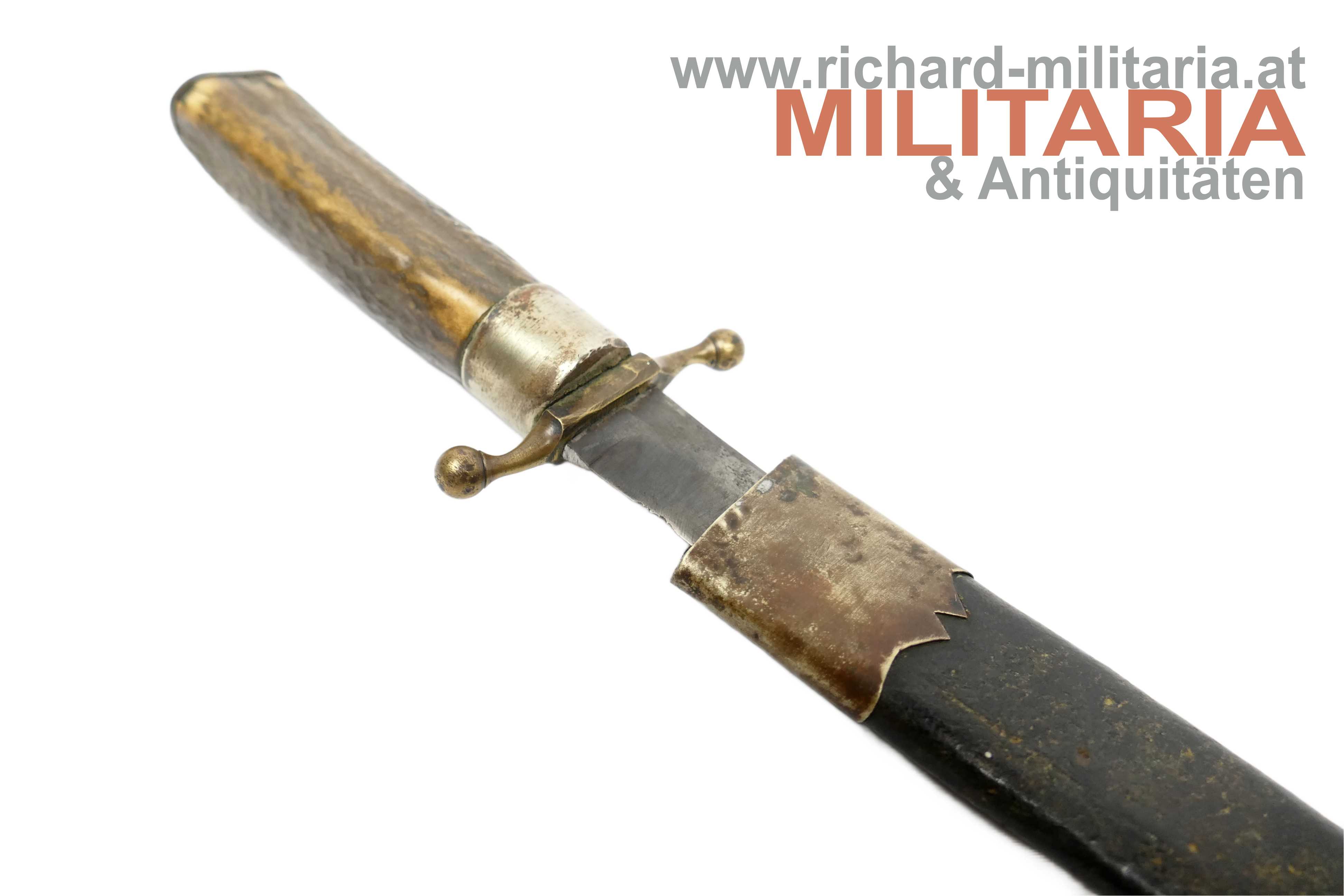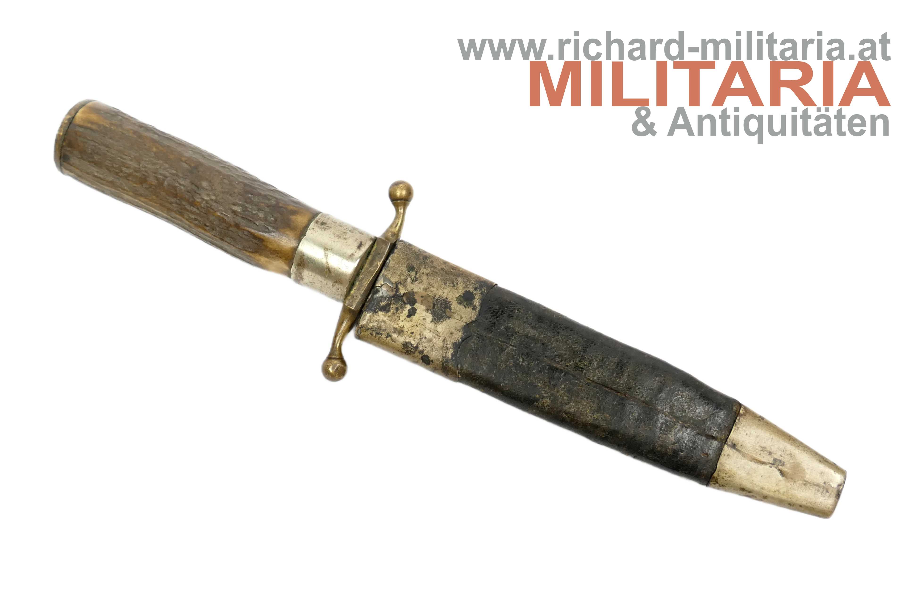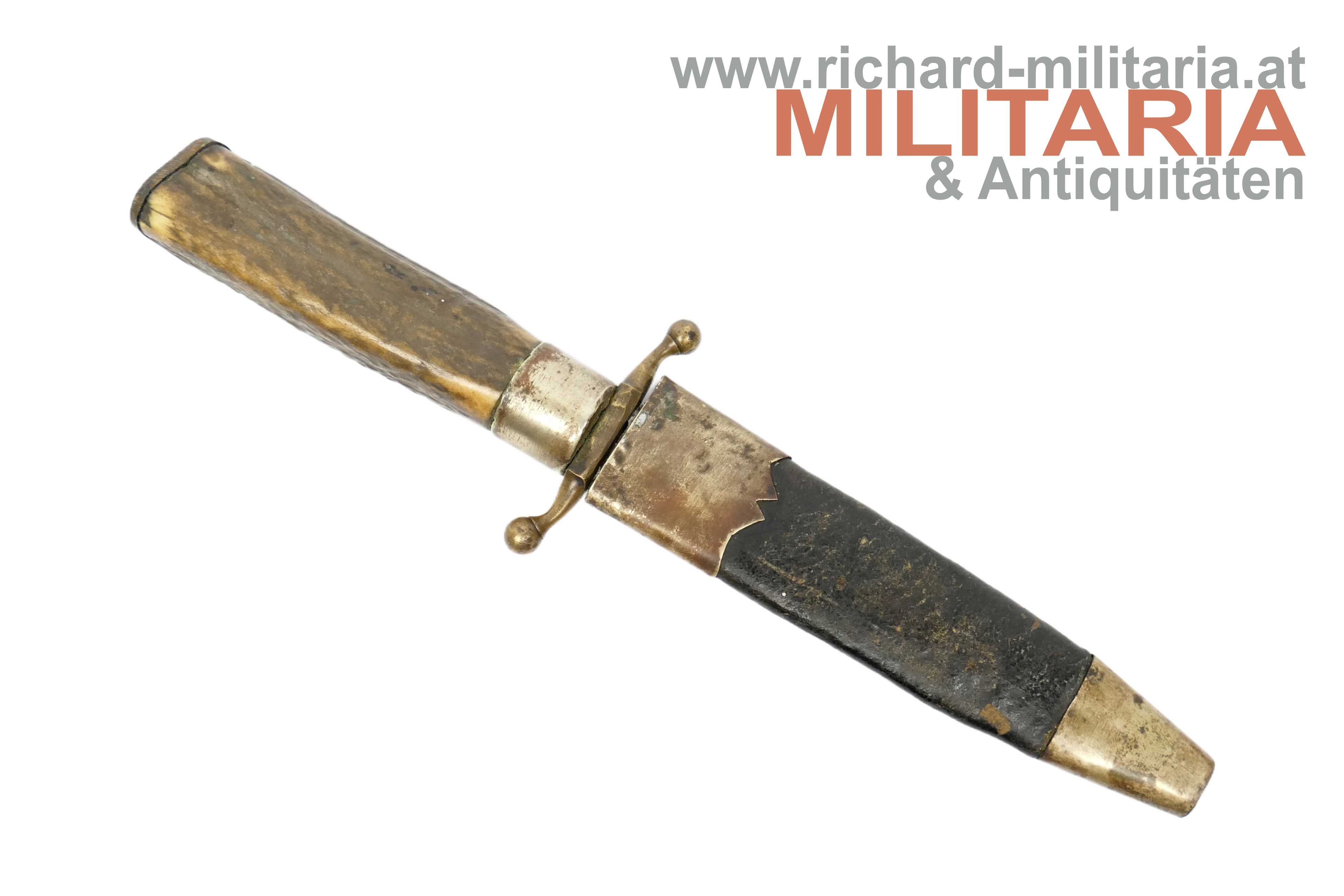 kleiner Dolch oder Kampfmesser, Einzelstück - handgefertigt; Hirschhorngriff mit durchgehendem Heft; metallene Abdeckkappe; s-förmig geschwungene Parierstange mit Kugelabschlüssen; einschneidige - im vorderen Drittel 2-schneidige Klinge ohne Hersteller; belederte Holzscheide mit Metallabschlüssen;