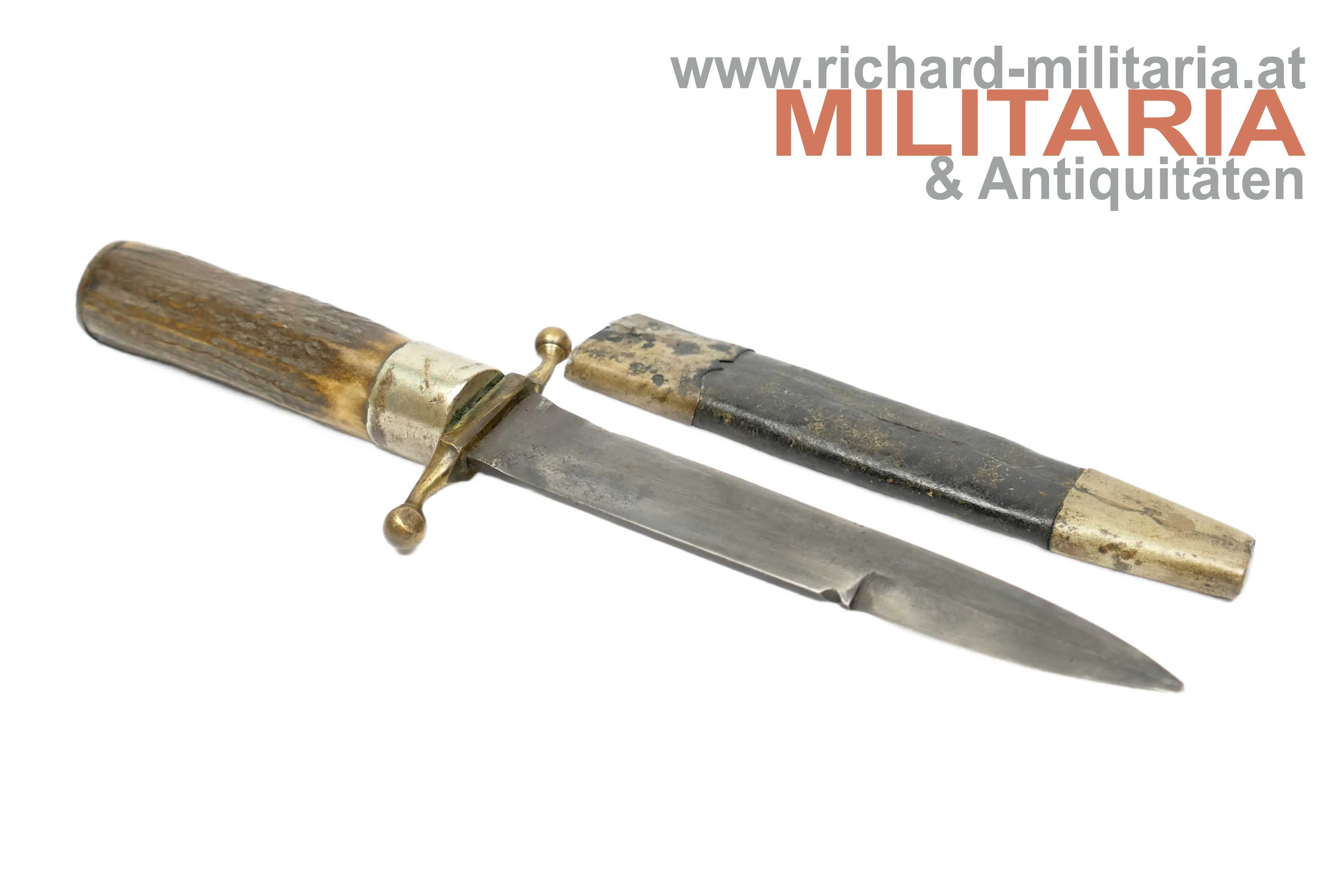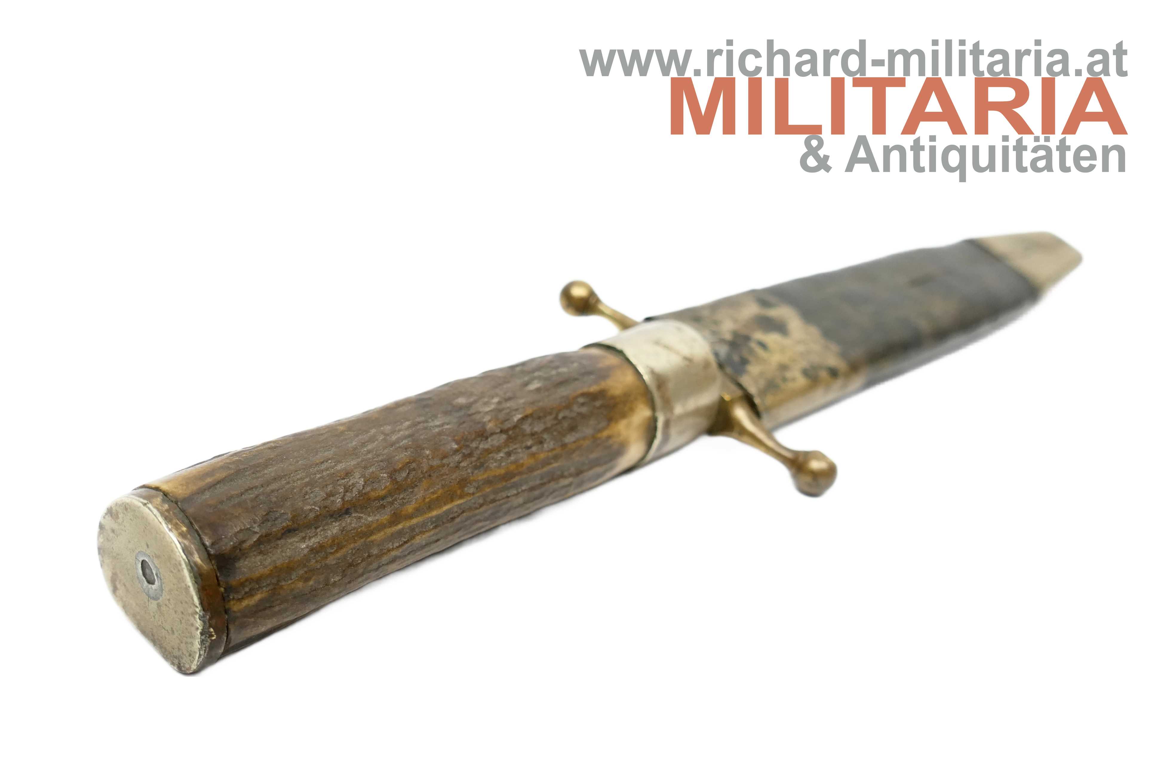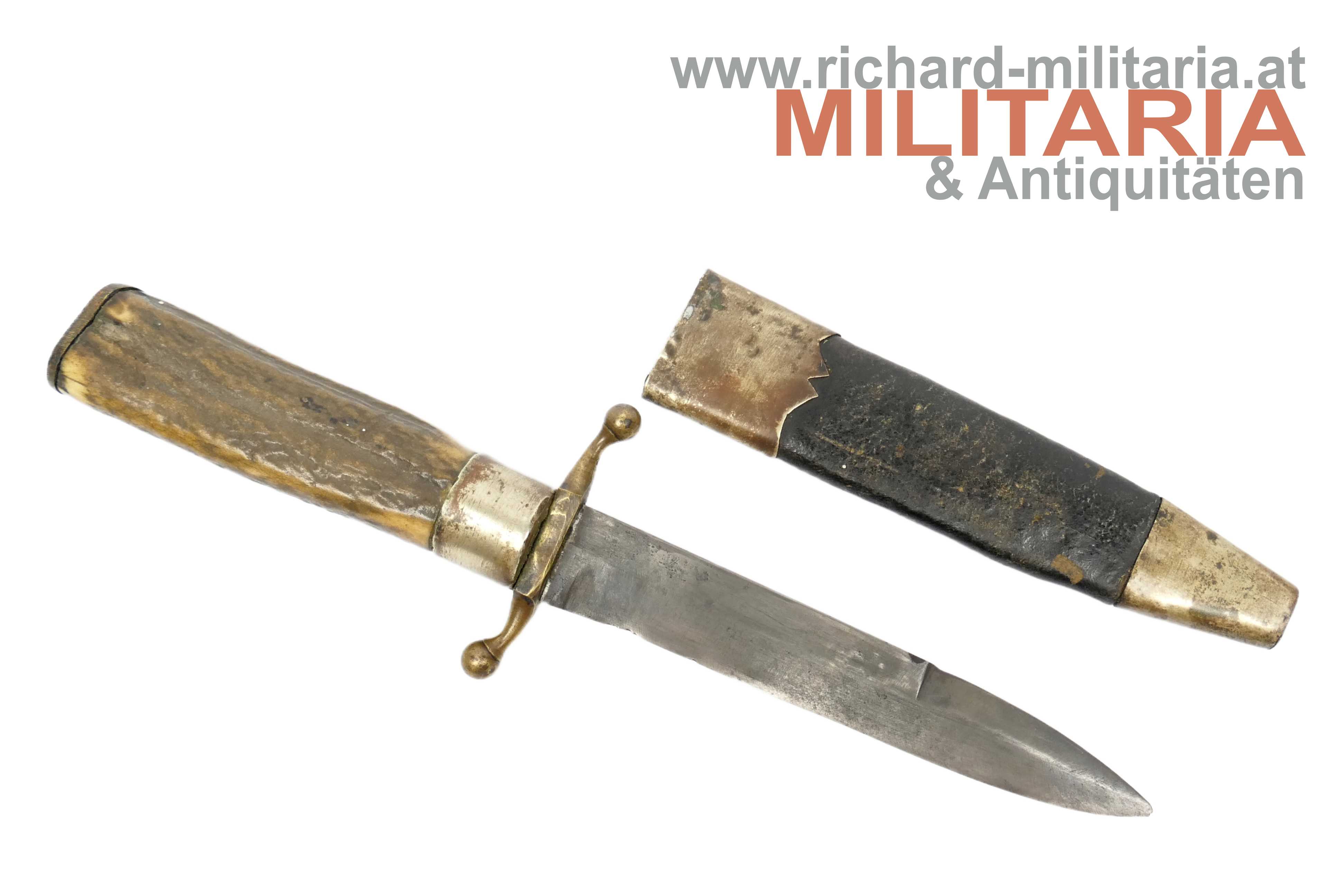 kleiner Dolch oder Kampfmesser, Einzelstück - handgefertigt; Hirschhorngriff mit durchgehendem Heft; metallene Abdeckkappe; s-förmig geschwungene Parierstange mit Kugelabschlüssen; einschneidige - im vorderen Drittel 2-schneidige Klinge ohne Hersteller; belederte Holzscheide mit Metallabschlüssen;