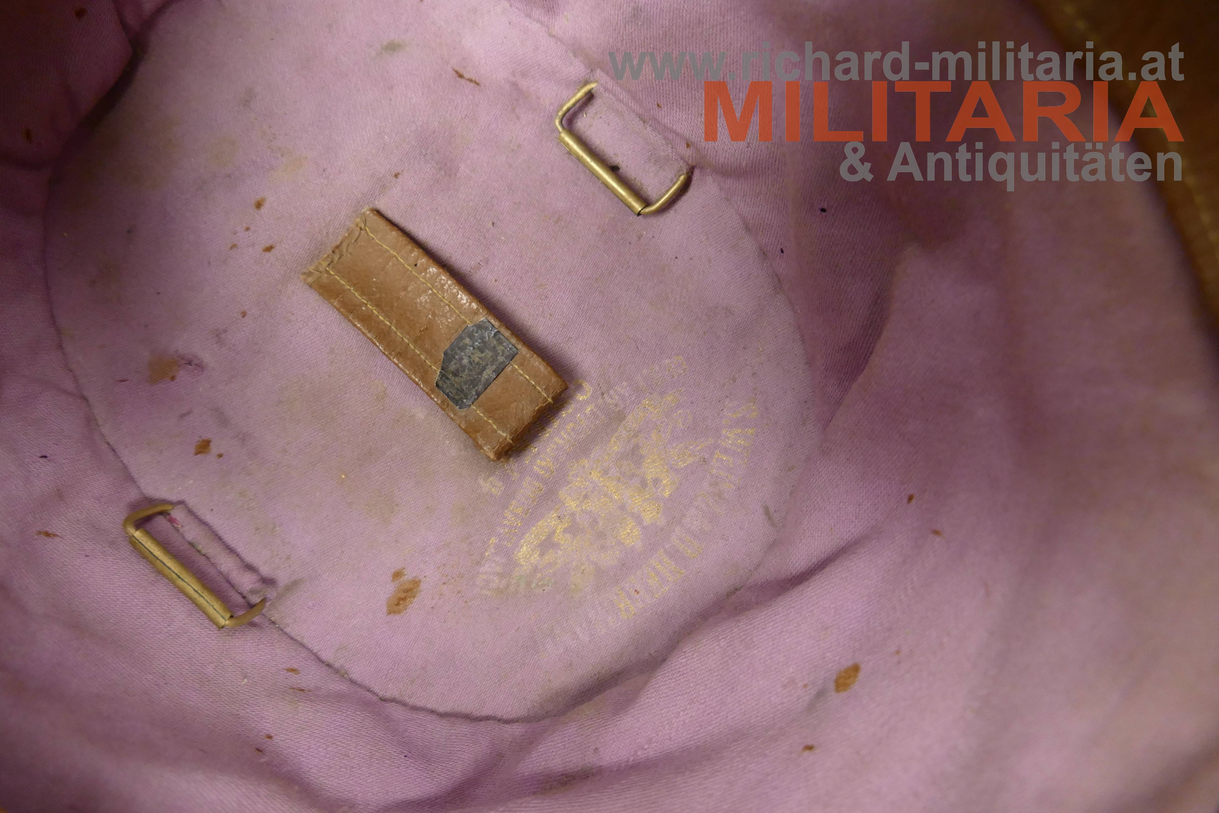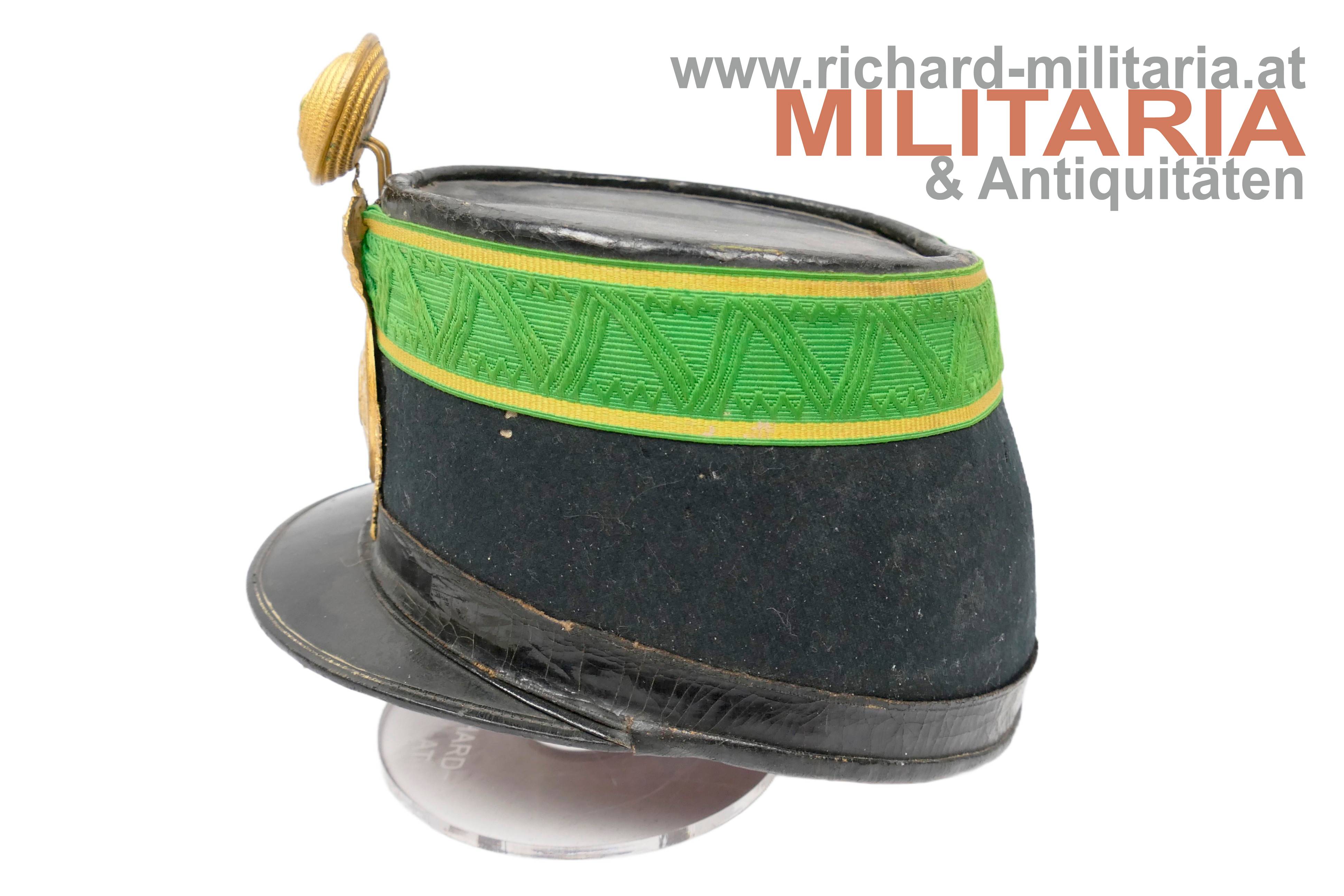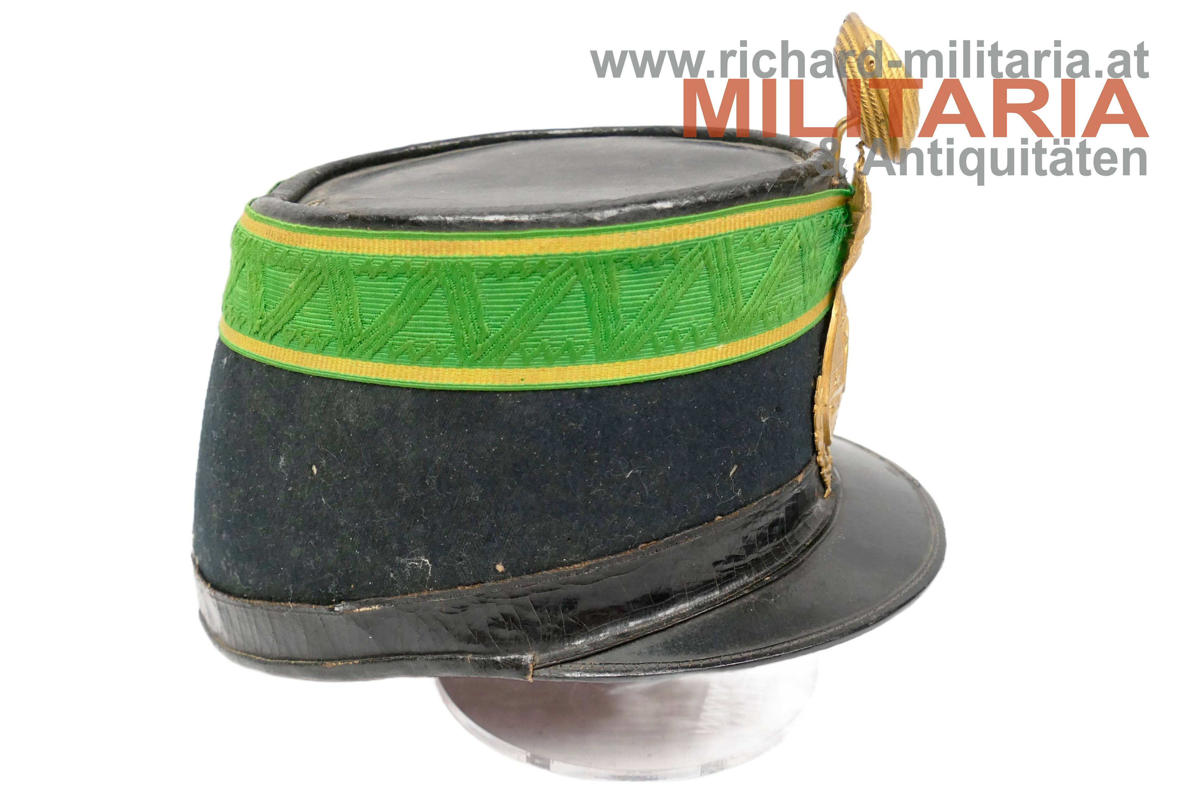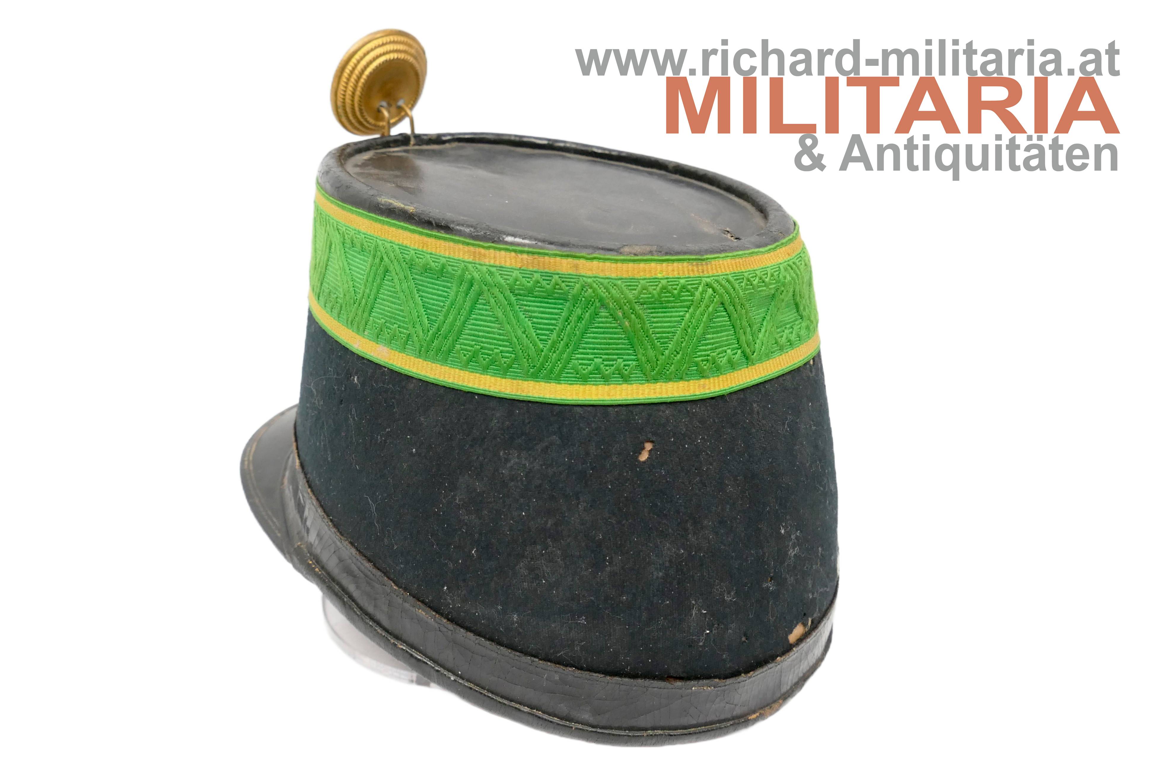 königlich ungarischer Finanzwache-Tschako zur Paradeaudjustierung für einen Oberaufseher; steifer Korpus mit schwarzem Filzstoff überzogen; darauf eine einteilige grassgrüne Seidenborte mit zwei gelben Steifen für einen Oberaufseher der k.u. Finanzwache; vorne mittig das Tschakowappen M1869 und darüber die Tschakorose für Beamte in ihrer frühen Ausführung; Rose etwas eingedellt; im hinteren Bereich des Deckels ein kleines Loch; Tschakoschirm in guter Erhaltung; braunes Stirnleder; die Laschen am Stirnleder einseitig gerissen; rosa Innenfutter; darauf in goldener Schrift ein ungarischer Hersteller;