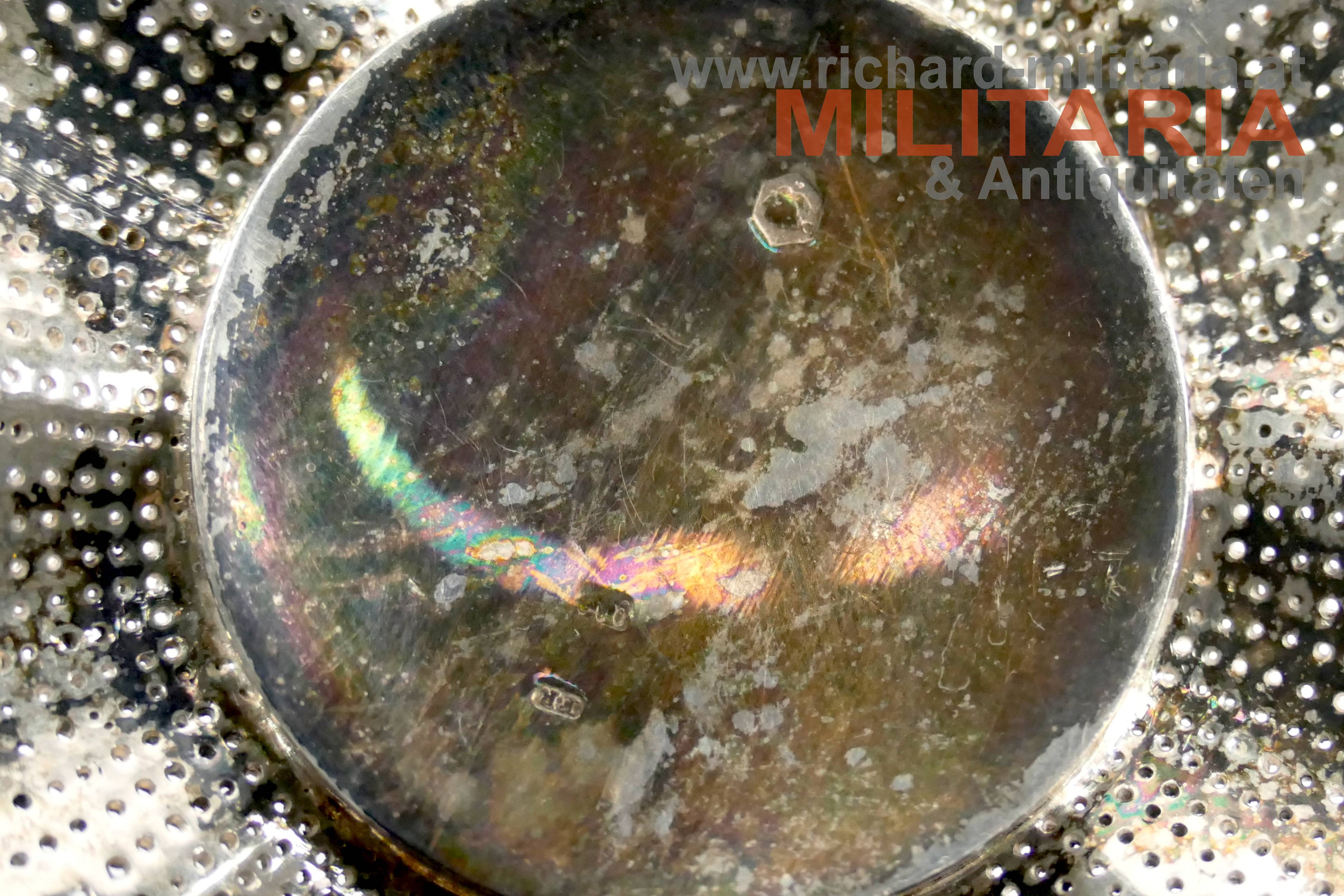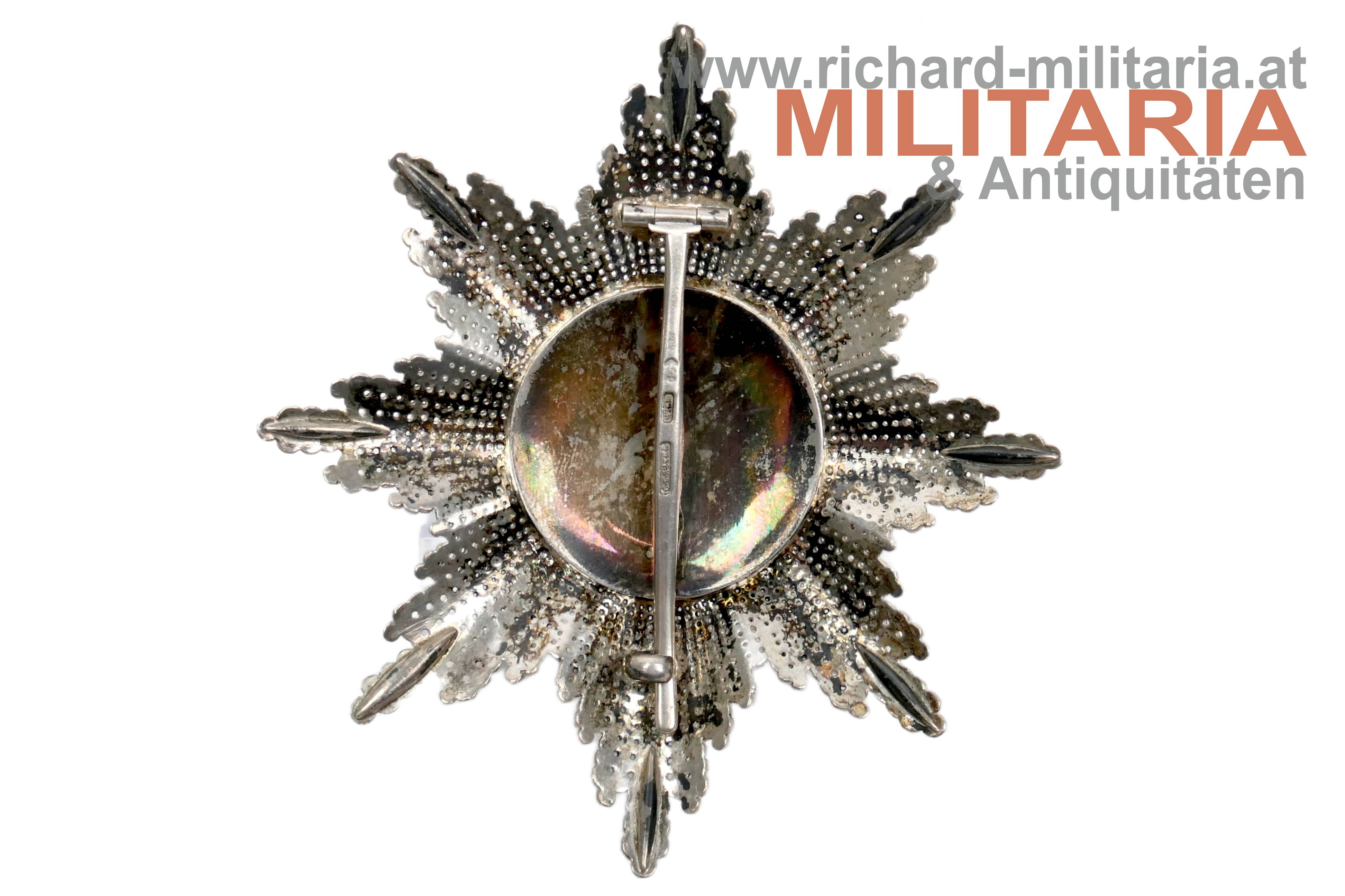 königlich-ungarischer St. Stephan-Orden Stern zum Großkreuz; fein brilliantierter Korpus aus Silber; revers punziert mit "FR" im Rechteck wie ab 1867/8 bis in die 1880er Jahre verwendet; außerdem "900"er-Punze und Dianakopfpunze von 1867 bis 1872 ebenfalls am Korpus; Auflagen aus GOLD und emailliert; Emaillierung minimalst in den grünen Blättern beschädigt; Nadel punziert mit "C.F. Rothe", "Wien" und Dianakopfpunze;