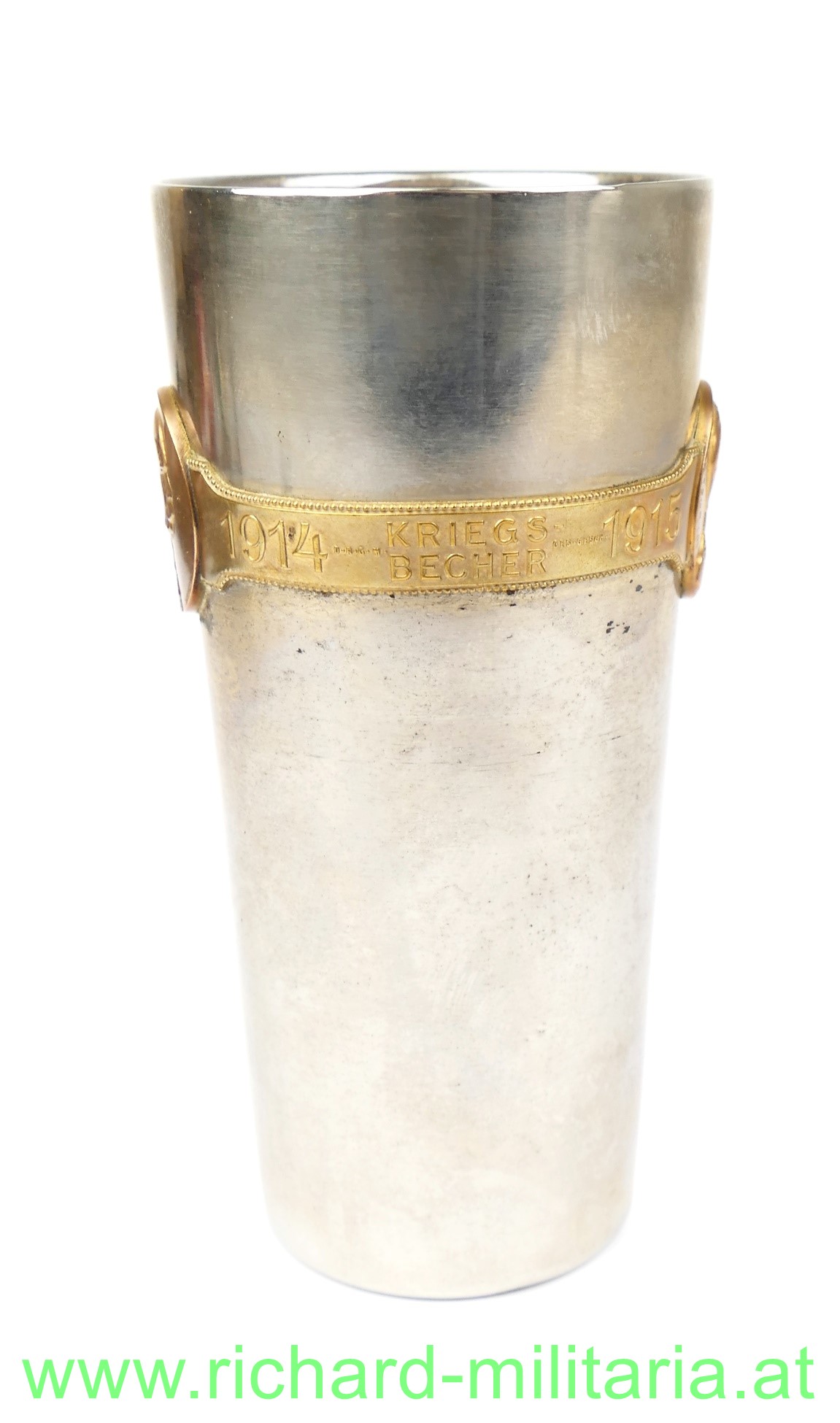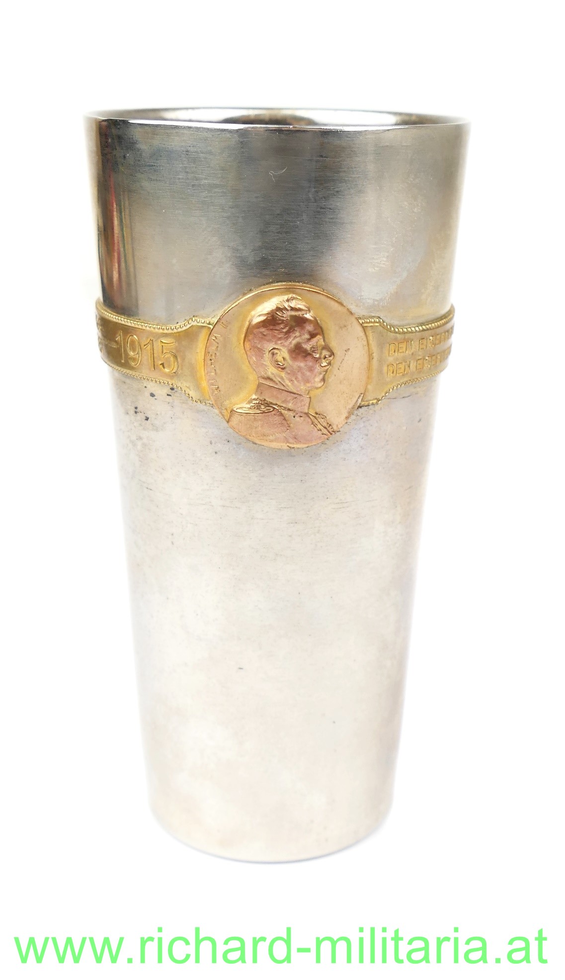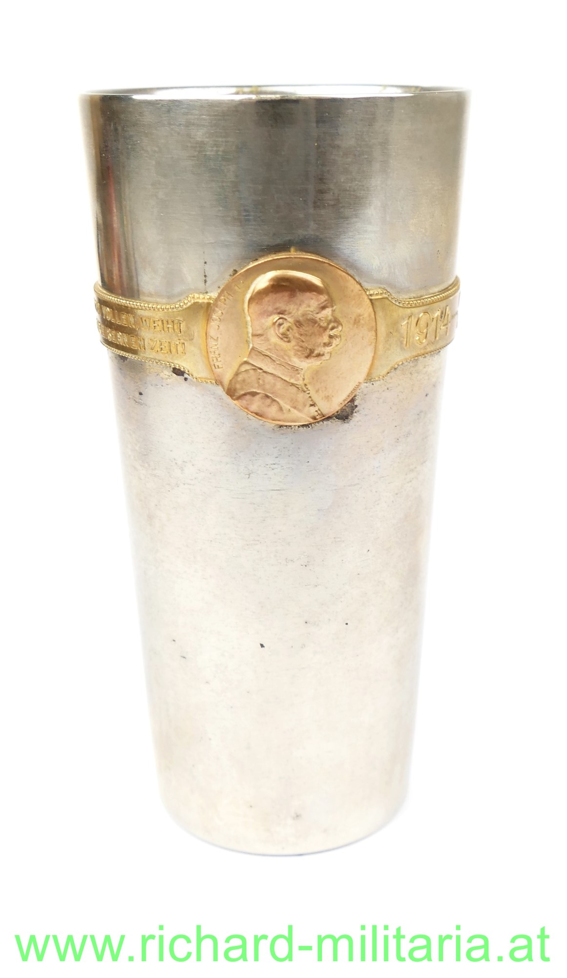 Kriegsbecher 1914-1916 mit umlaufendem Spruchband; Eisen vernickelt; vergoldeter Spruchreifen aus Bronze mit den Bildnissen von Kaiser Franz Joseph I. & Kaiser Wilhelm II.; Große Form - Abmessungen: Höhe 14,5 cm & Durchmesser 7,5 cm