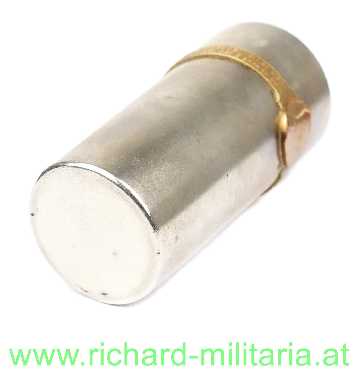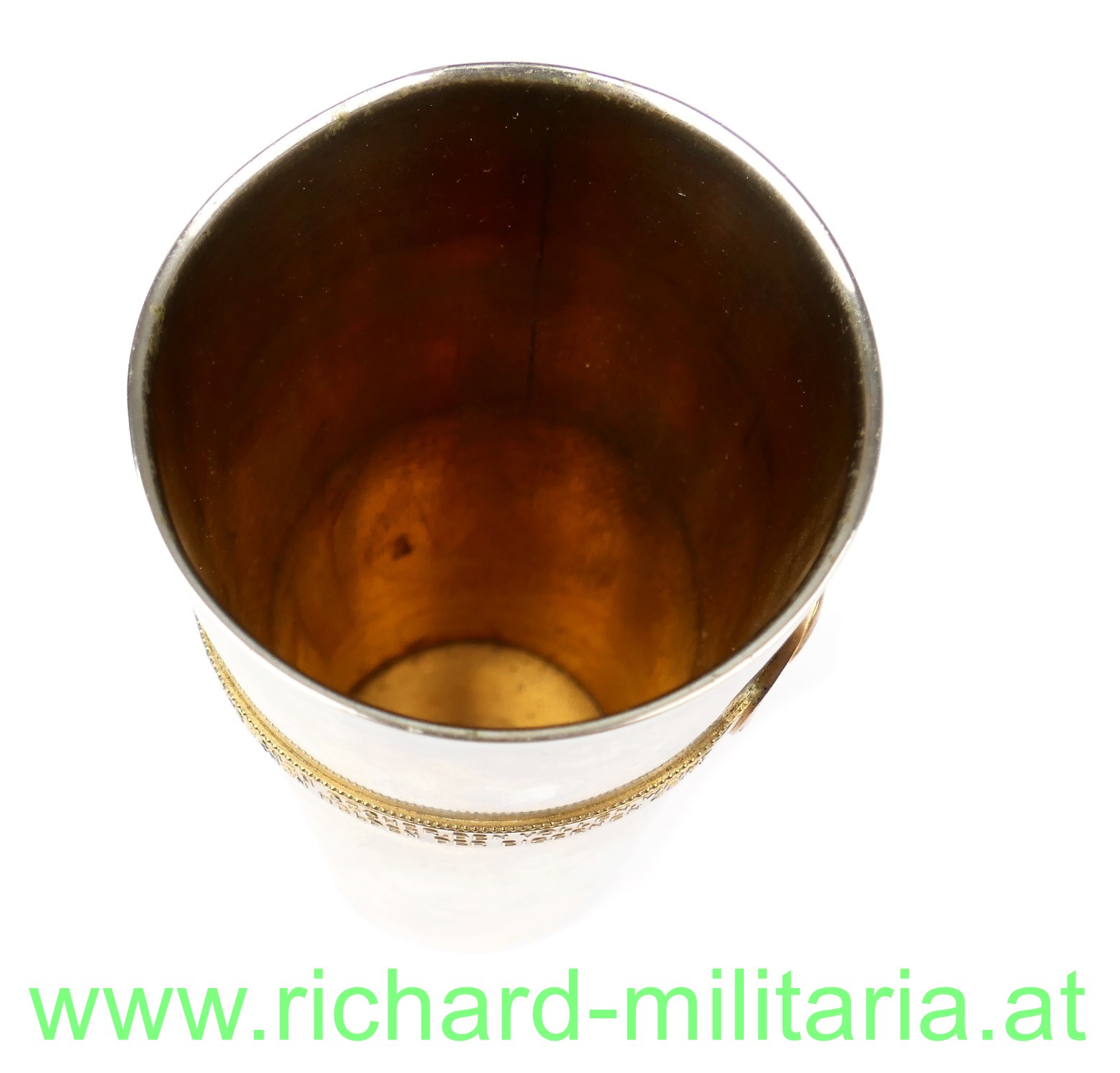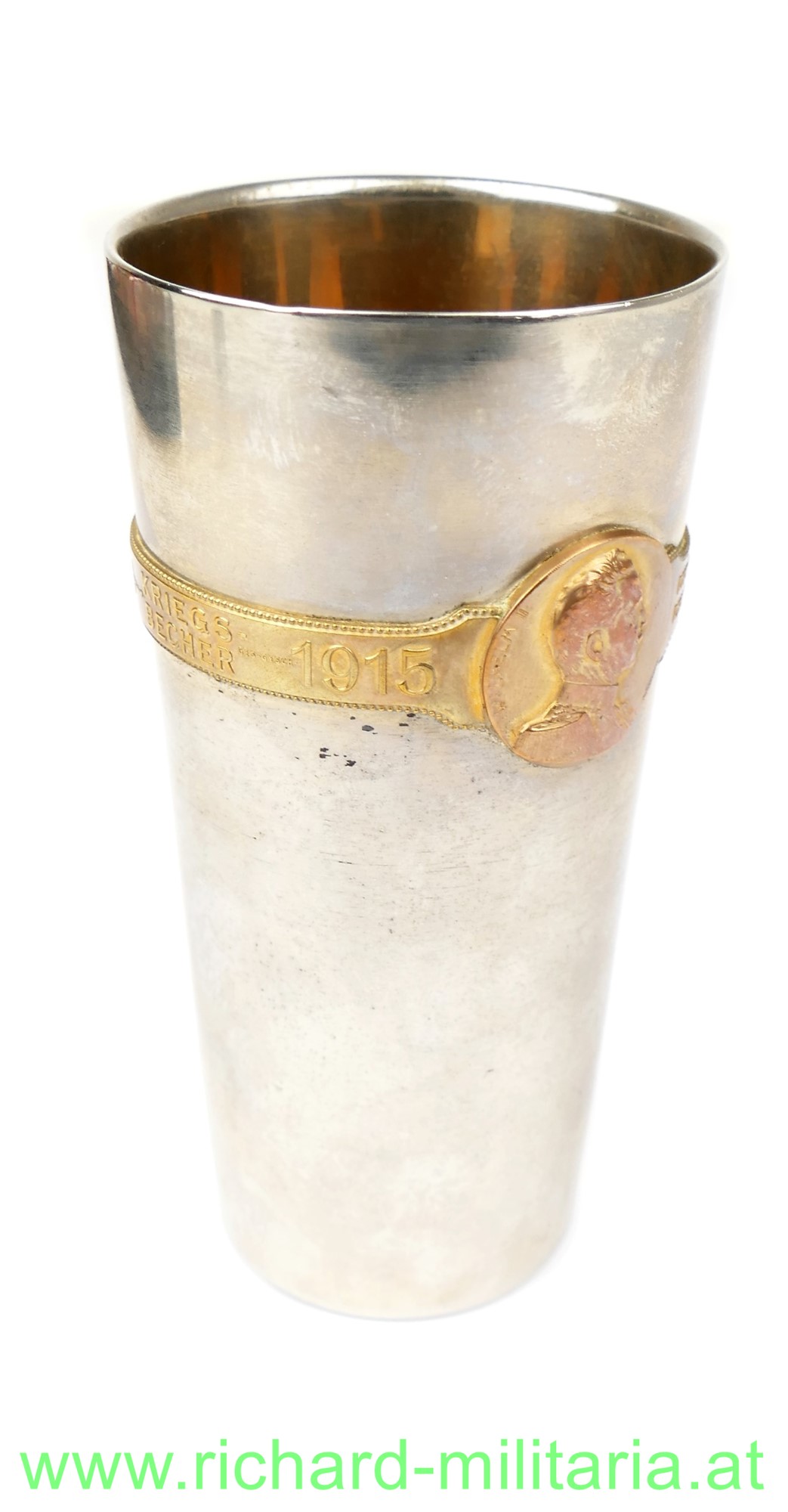 Kriegsbecher 1914-1916 mit umlaufendem Spruchband; Eisen vernickelt; vergoldeter Spruchreifen aus Bronze mit den Bildnissen von Kaiser Franz Joseph I. & Kaiser Wilhelm II.; Große Form - Abmessungen: Höhe 14,5 cm & Durchmesser 7,5 cm