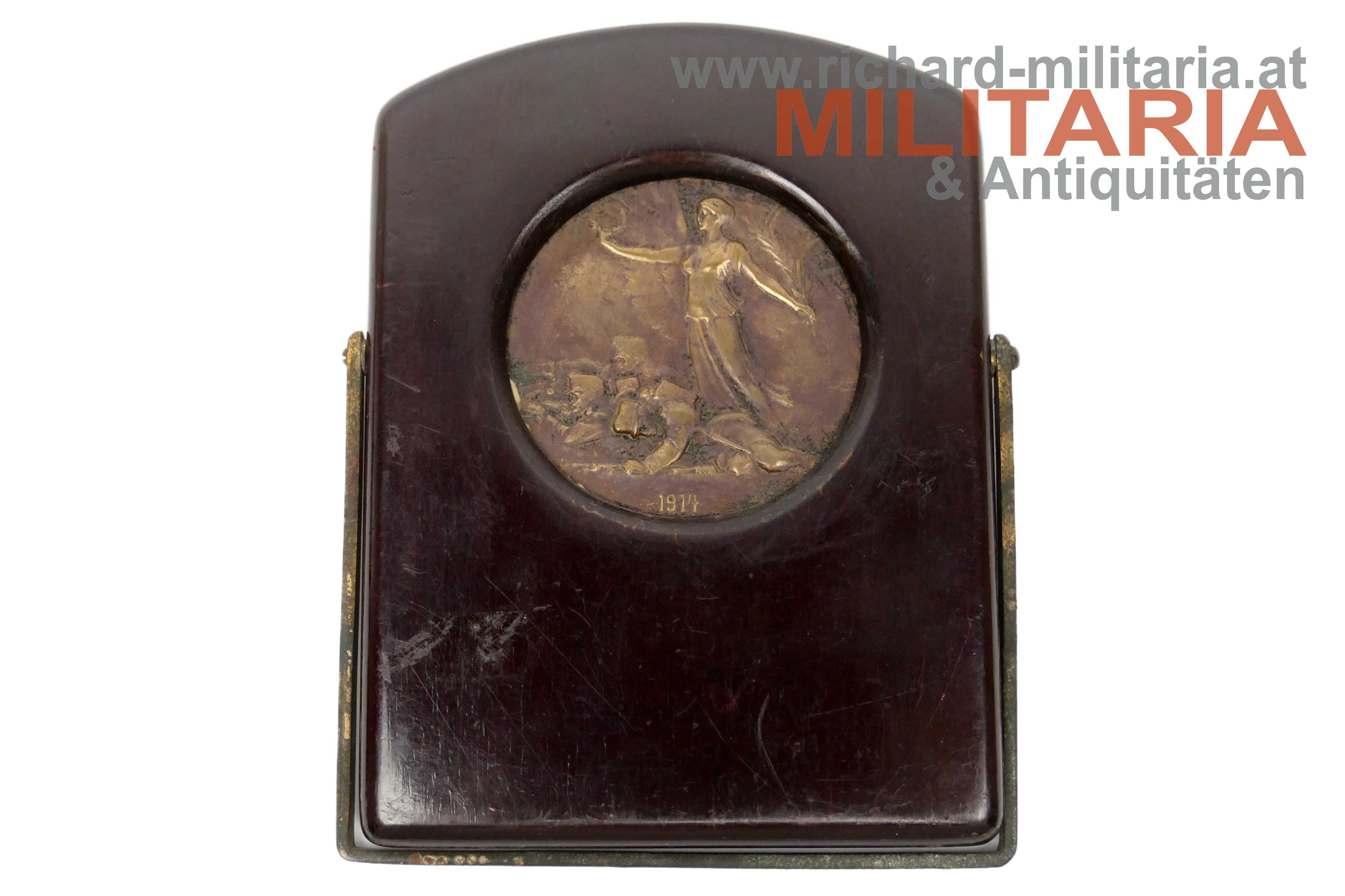 patriotischer Aufsteller: Kriegserinnerungsmedaille 1914 - 1915 - aus erobertem Waffenmaterial; in einem lackierten Holzrahmen mit Goldaufdruck und Stehbügel; äußerst dekorativ und selten!