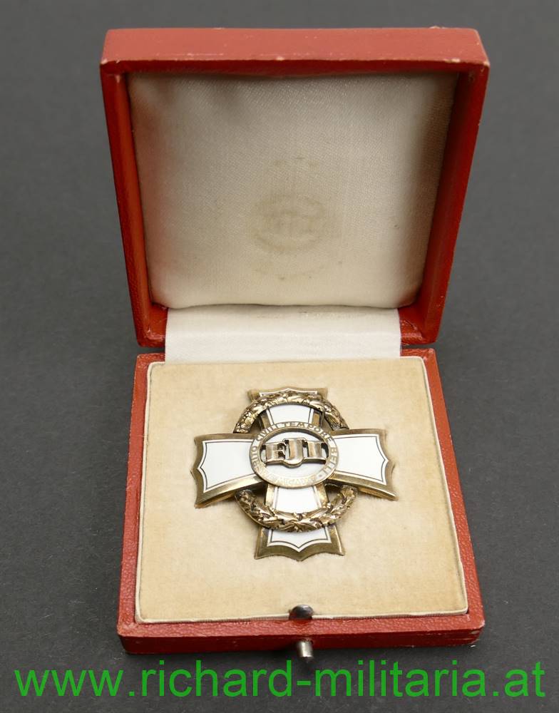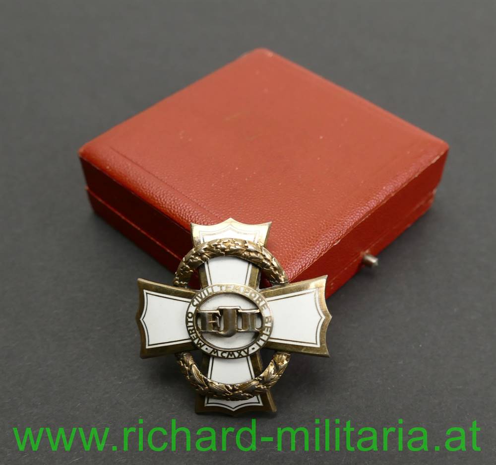 Kriegskreuz für Zivilverdienste II. Klasse mit Etui; Silber vergoldet - Vergoldung teilweise vergangen; Herstellerpunzierung "R&F" (Rozet & Fischmeister) sowie Dianakopfpunzierung auf der Rückseite; im zugehörigen roten Lederetui in guter Erhaltung;