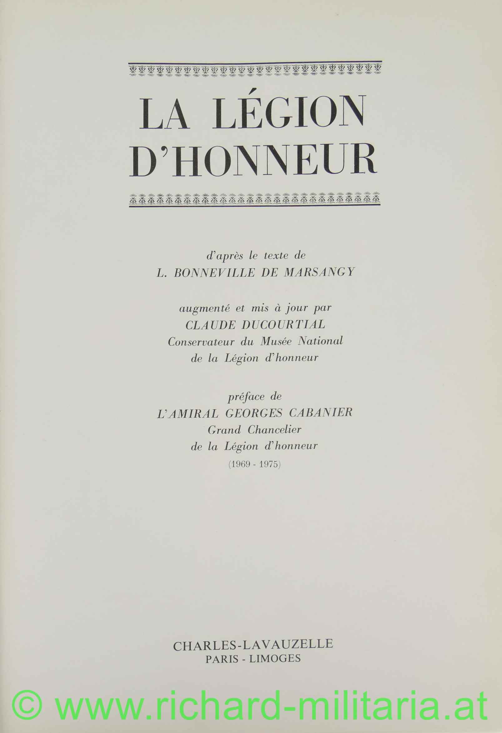 La Legion D´Honneur Die Ehrenlegion - Buch, die Ehrenlegion nach dem Text von L. Bonneville de Marsangy, erweitert und aktualisiert von Claude Ducourtial, Vorwort von Admiral Georges Cabanier. Ledereinband mit dem Abzeichen der Ehrenlegion illustriert,
