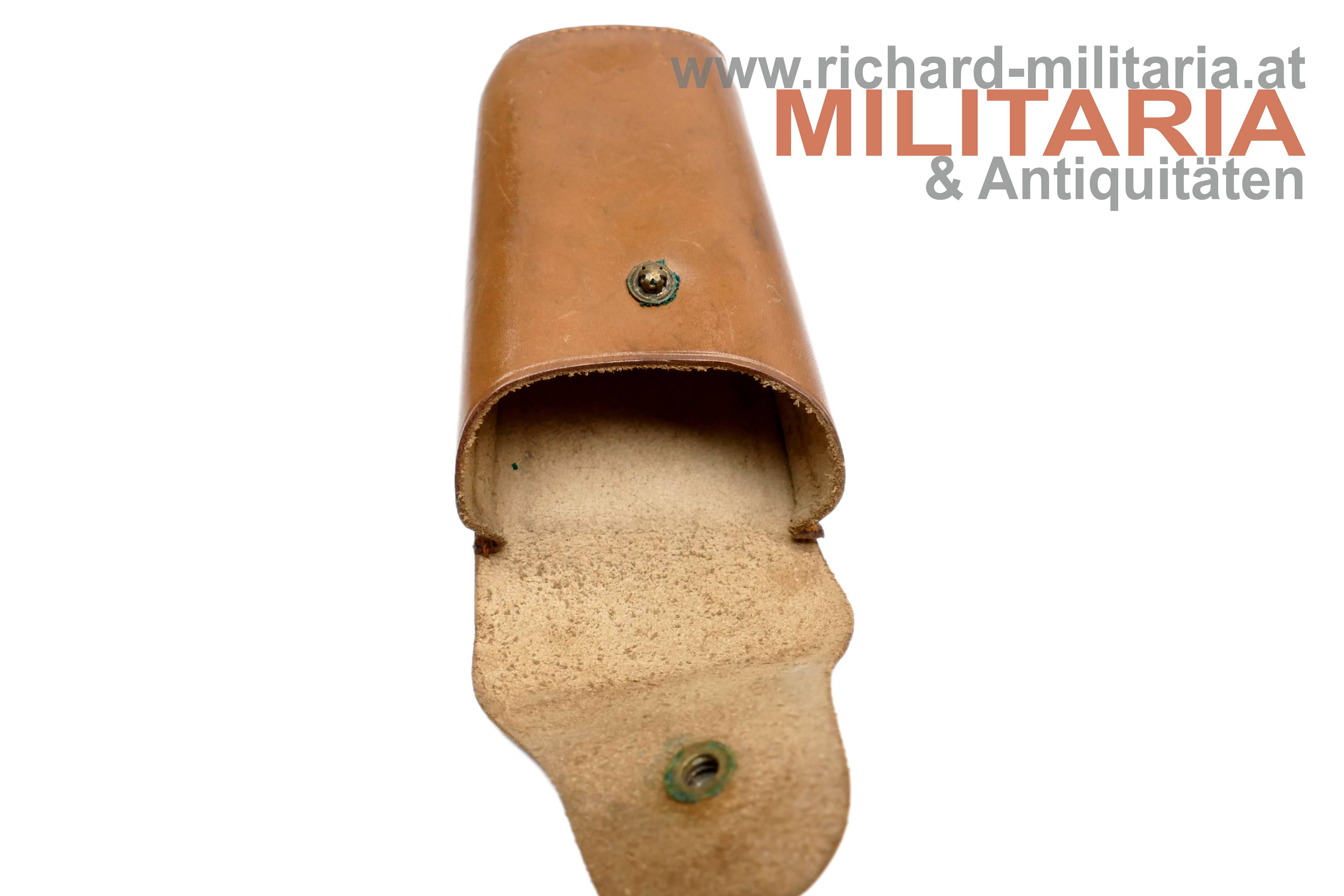 Lederetui mit Druckknopfverschluss; weiches hellbraunes Leder mit Verschlusslasche; sich nach oben verbreiternde Form - Innenmaße ca. 4,5 x 6 und eine Höhe von ca. 10 cm. Uns unbekannte Verwendung