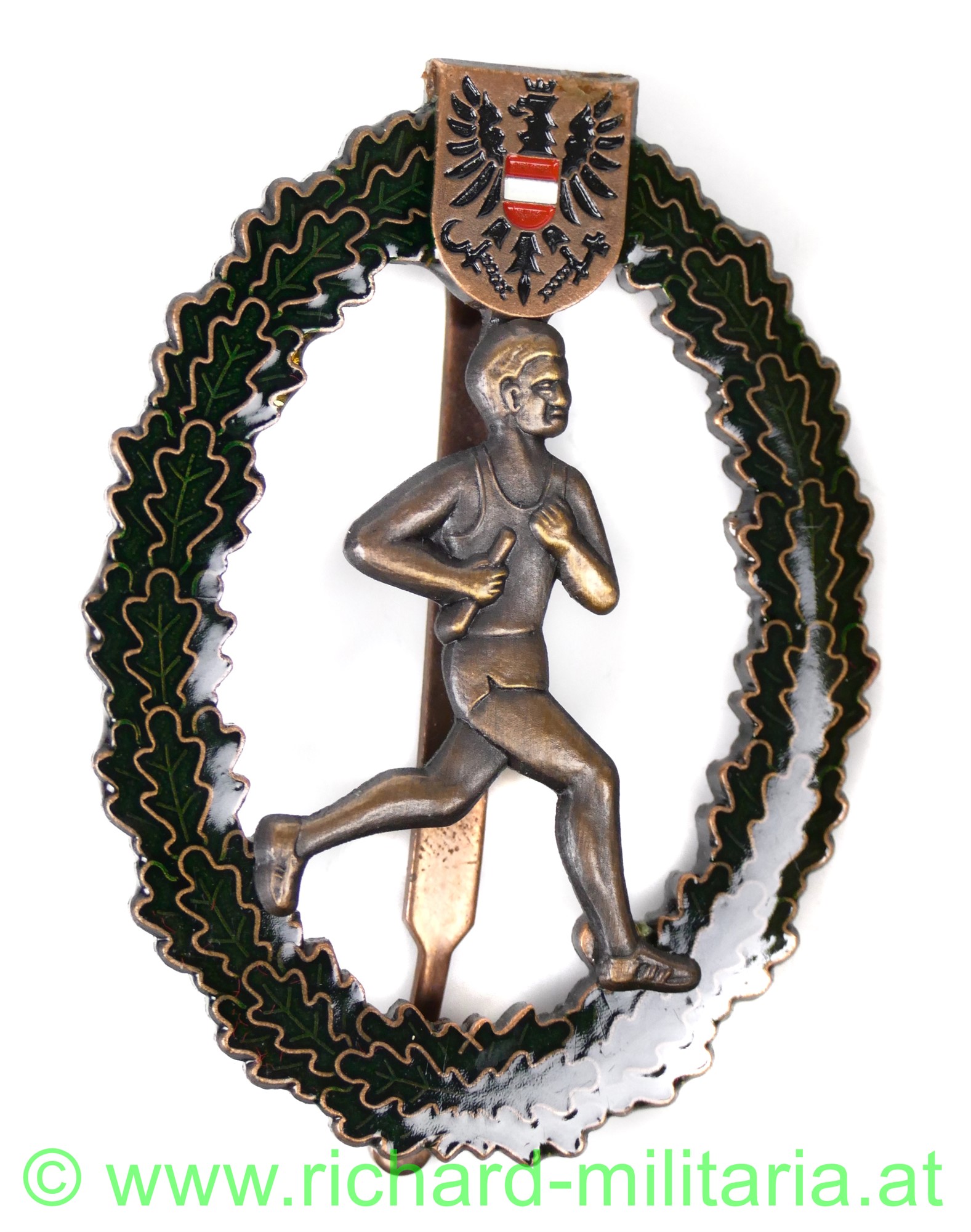 Der ovale, vollständig emaillierte Eichenlaubkranz umschließt einen Orientierungsläufer in Bronze und hat im oberen Teil das Bundeswappen aufgesetzt.