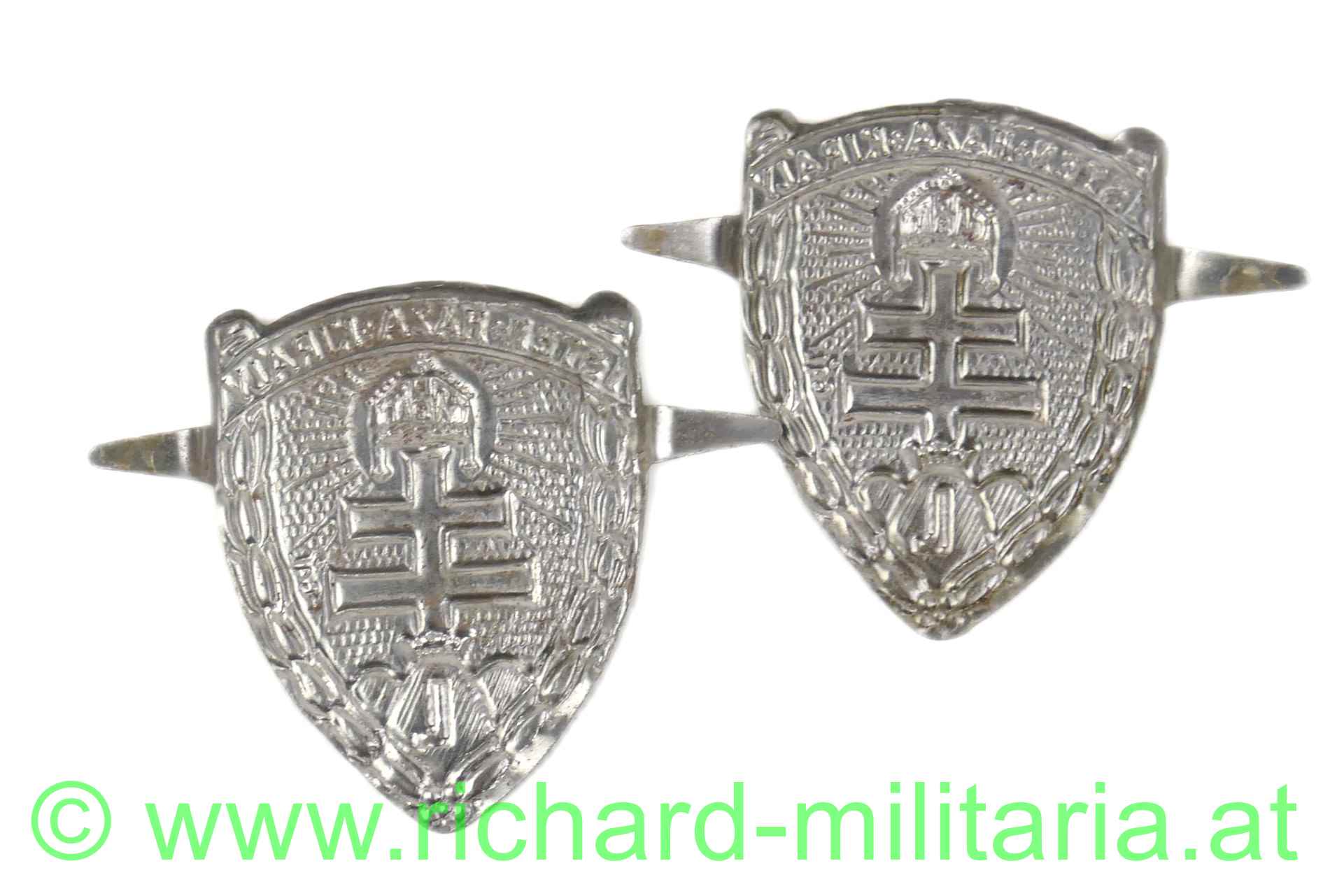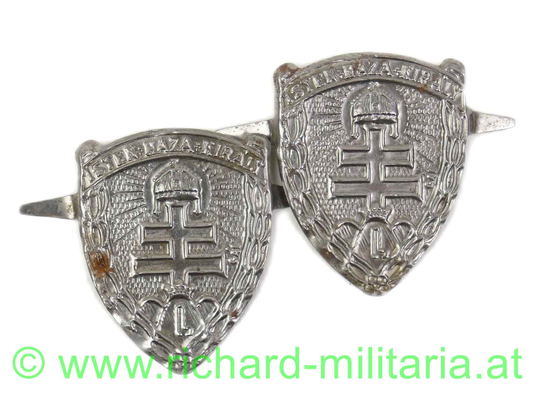 Levente-Plattenabzeichen „Gott – Heimat – König“; 1940; zwei Splinten zum Befestigen, zwei Stück vorrätig, Preis pro Stück
