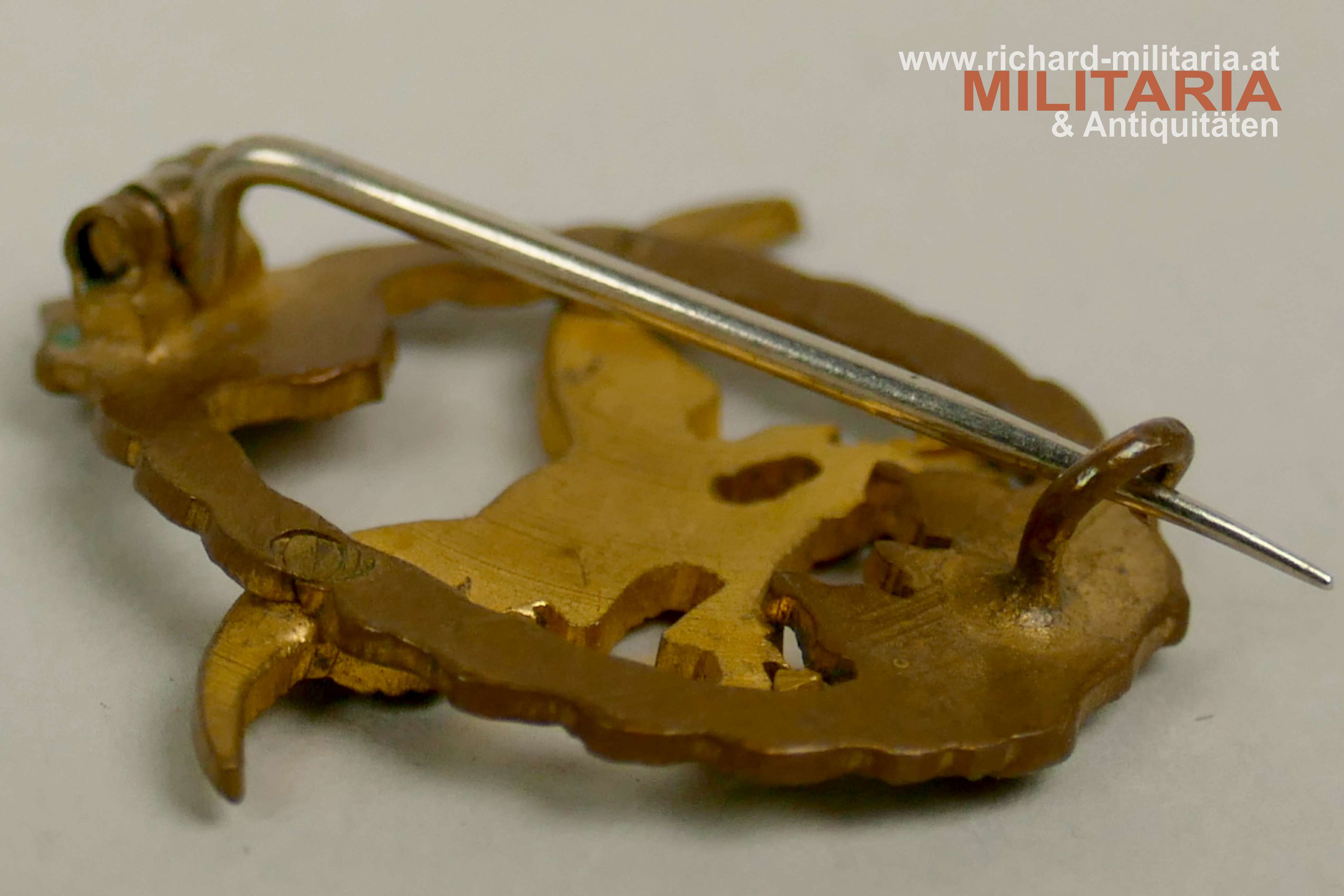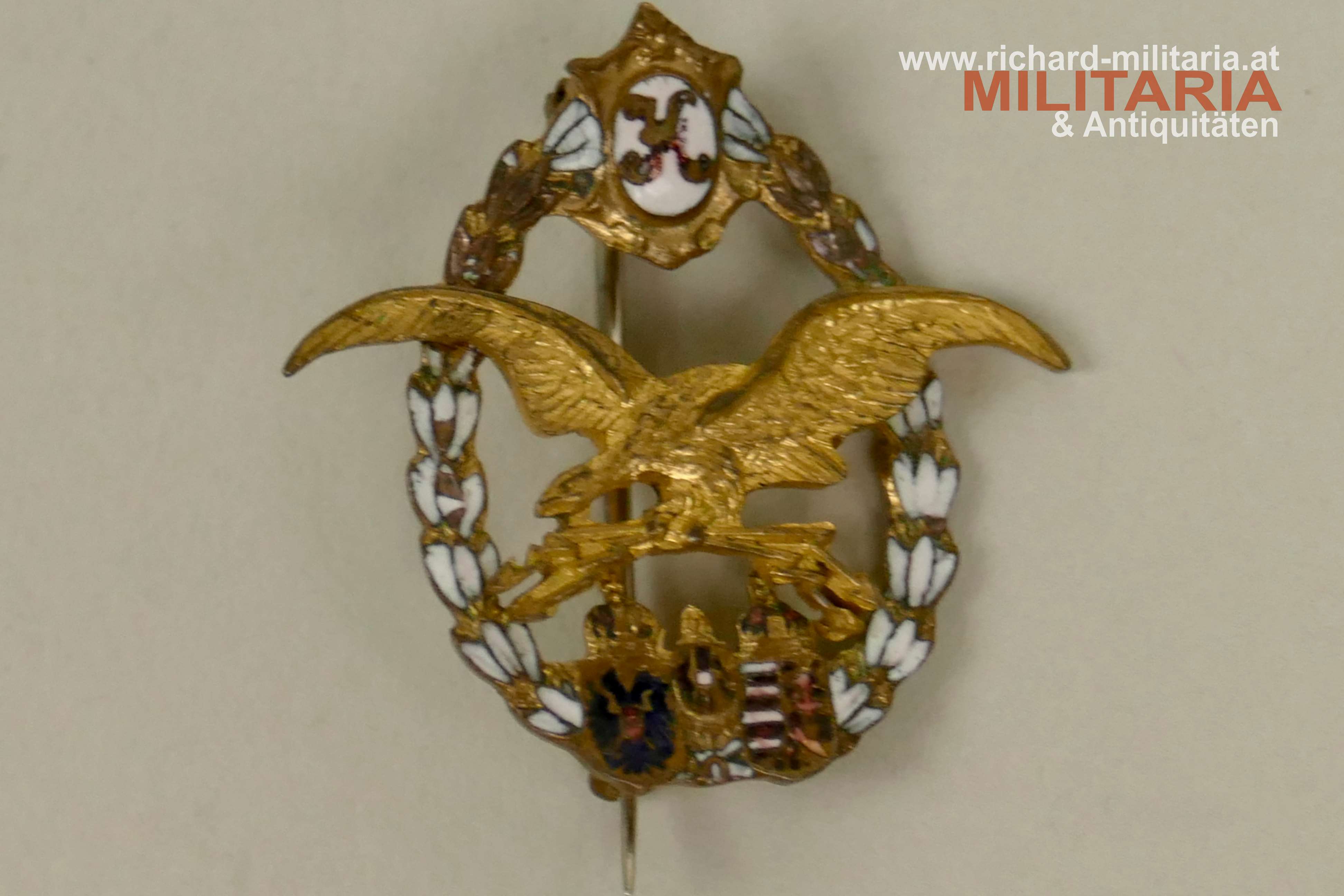 Luftfahrerabzeichen 1917 - Miniatur; 2teilige Fertigung aus Bronze/Messing vergoldet und emailliert, originale Nadel. Kranz leicht verbogen - daher dort Emailschäden. Abmessungen ca.: 26 x 25 mm;