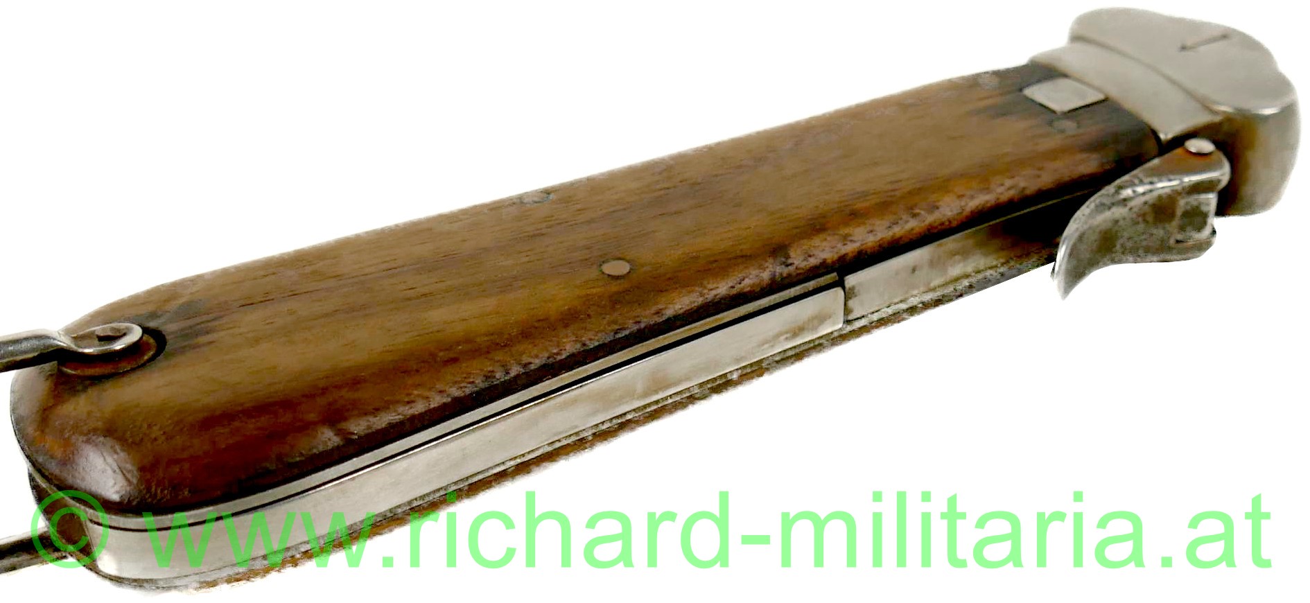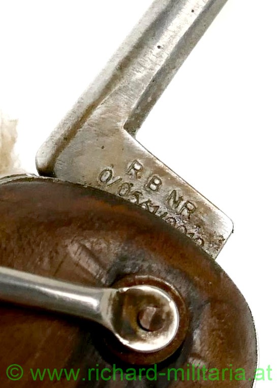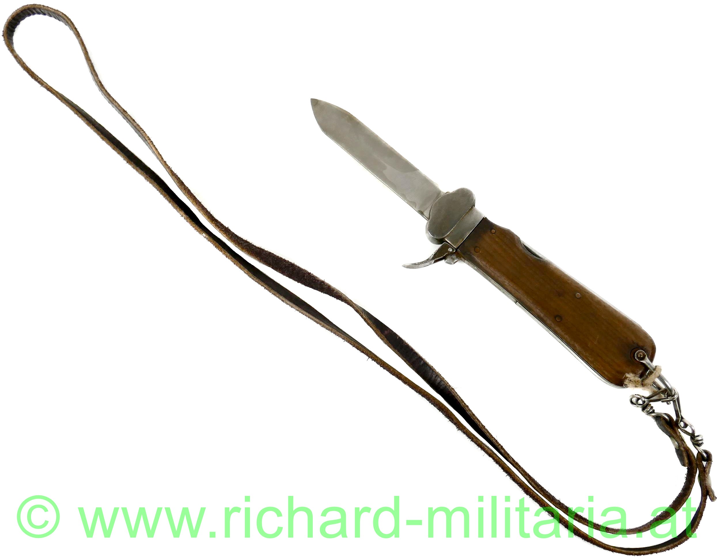 Luftwaffe Flieger-Kappmesser - 2. Modell zerlegbar SAMMLERANFERTIGUNG; voll funktionsfähig; Klinge ohne Hersteller; diese nicht beschliffen; vernietete Holzgriffschalen; gut funktionierender Mechanismus; Dorn mit Stempelung "R B Nr 0/0561/xxxx" (x= nicht lesbare Zahlen); mit braunem Lederriemen und vernickelten Karabinerhaken;