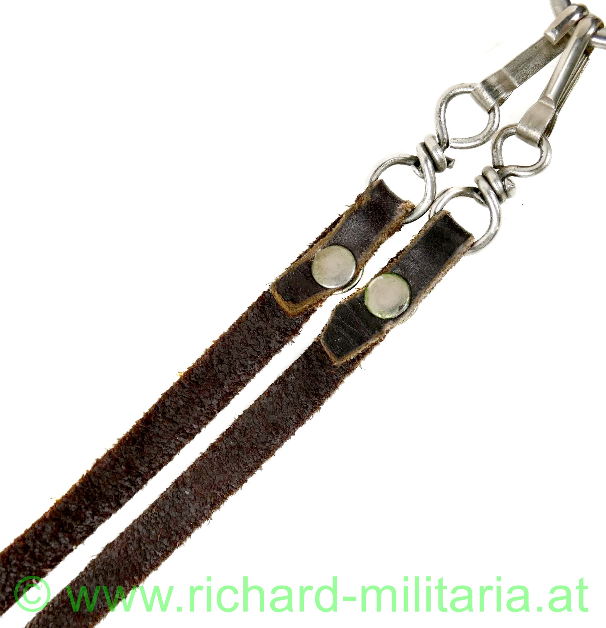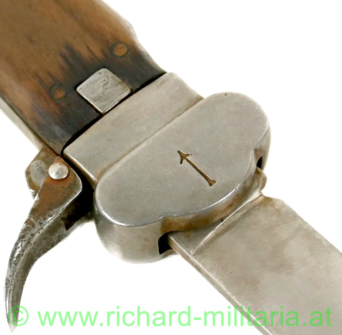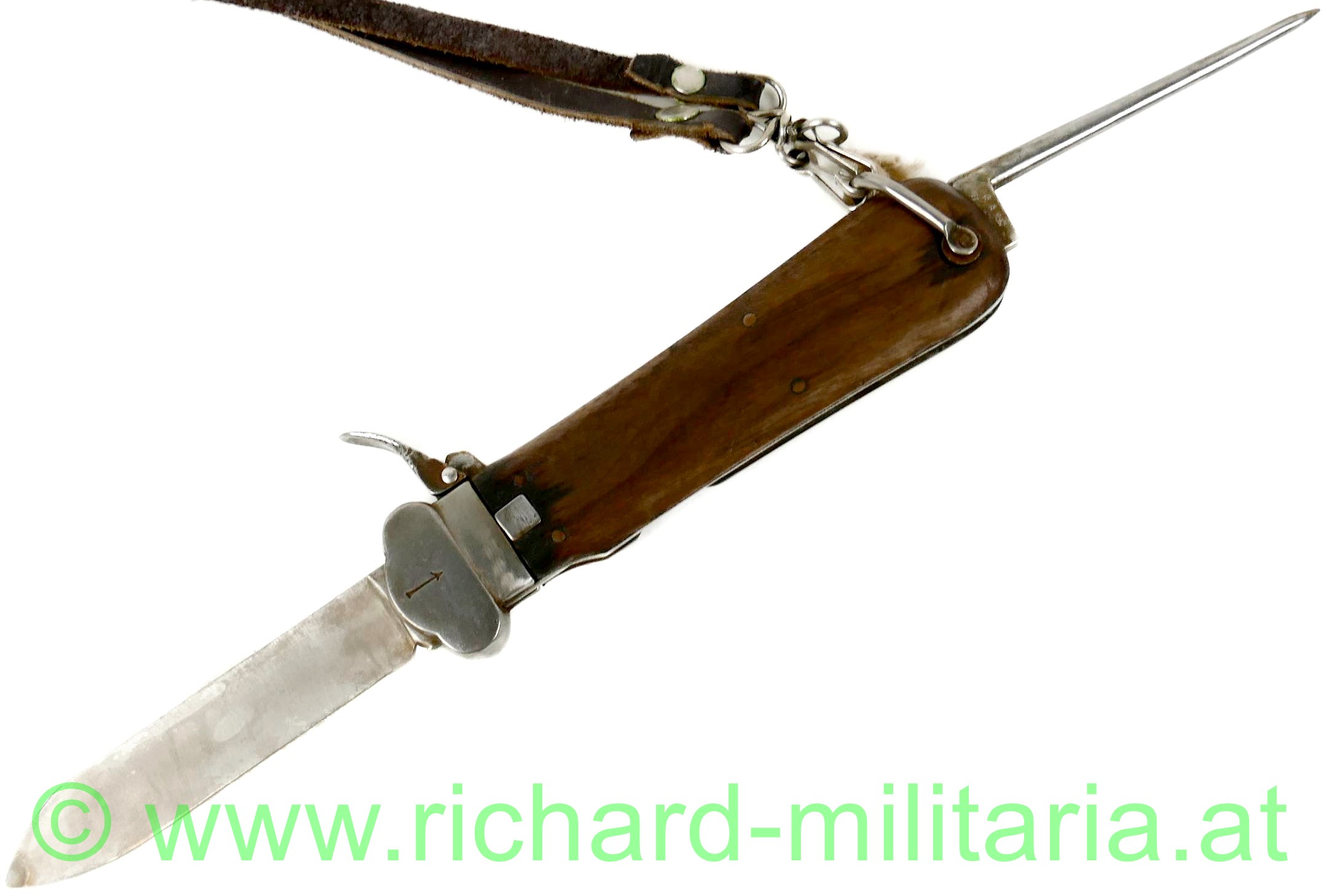 Luftwaffe Flieger-Kappmesser - 2. Modell zerlegbar SAMMLERANFERTIGUNG; voll funktionsfähig; Klinge ohne Hersteller; diese nicht beschliffen; vernietete Holzgriffschalen; gut funktionierender Mechanismus; Dorn mit Stempelung "R B Nr 0/0561/xxxx" (x= nicht lesbare Zahlen); mit braunem Lederriemen und vernickelten Karabinerhaken;