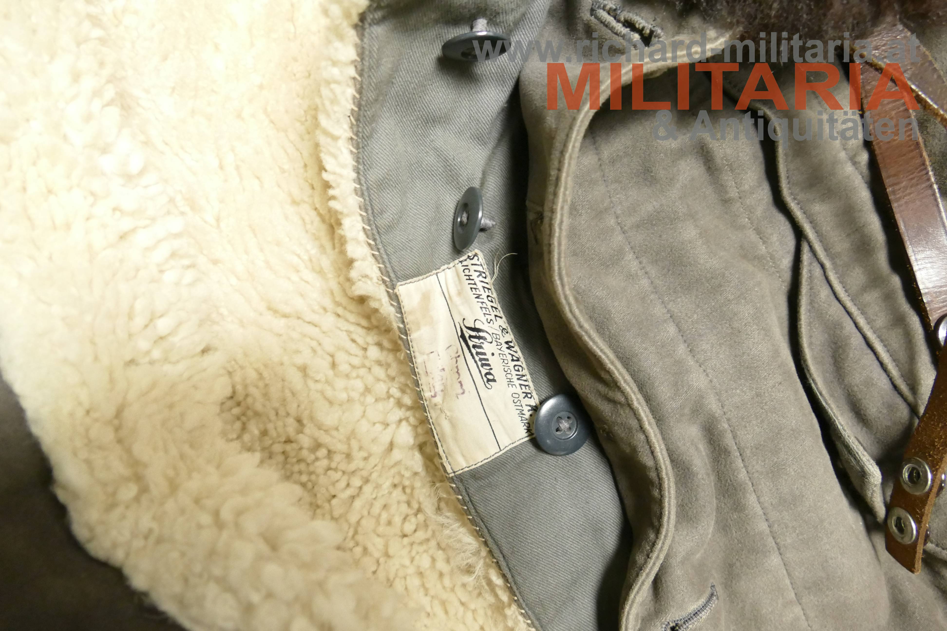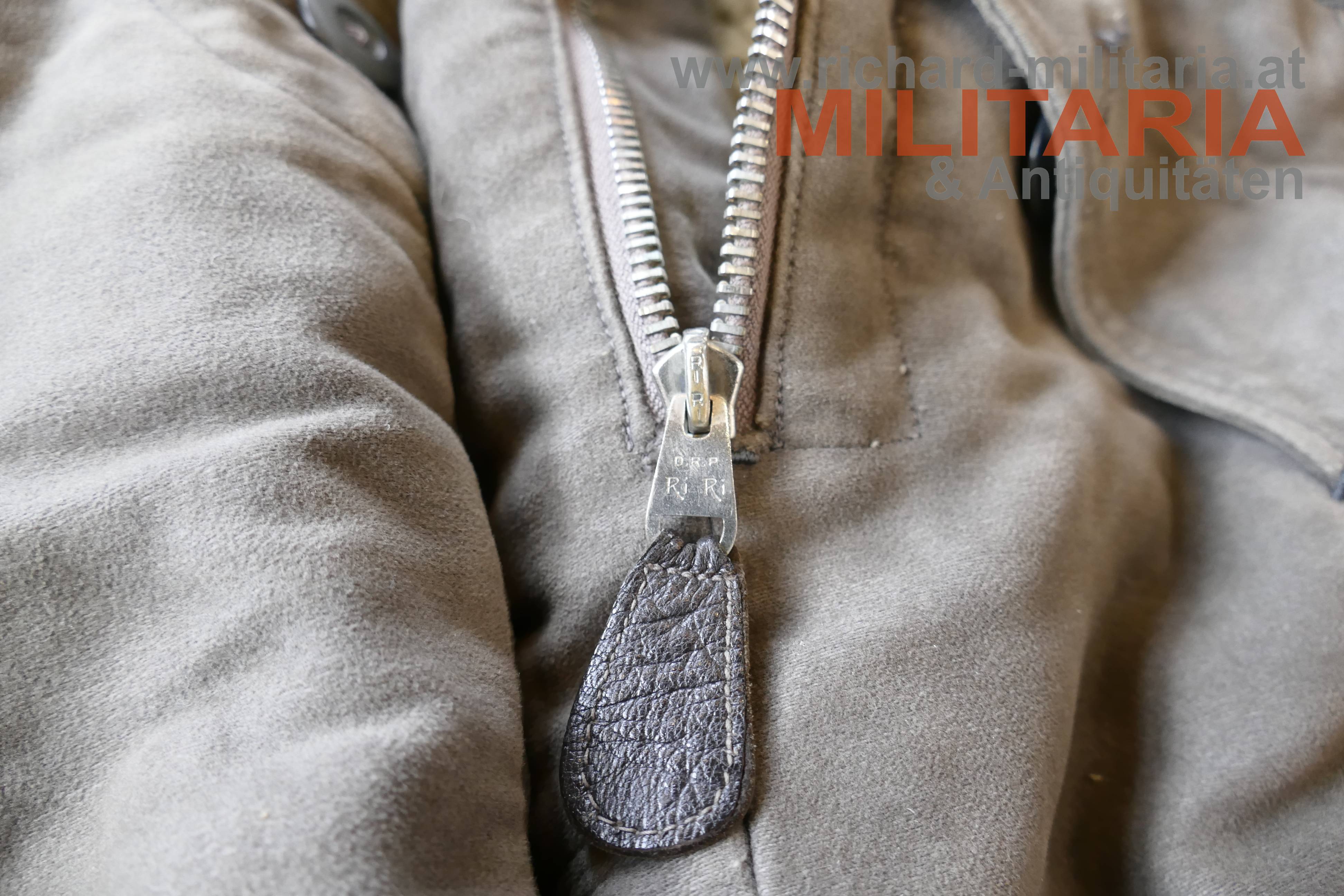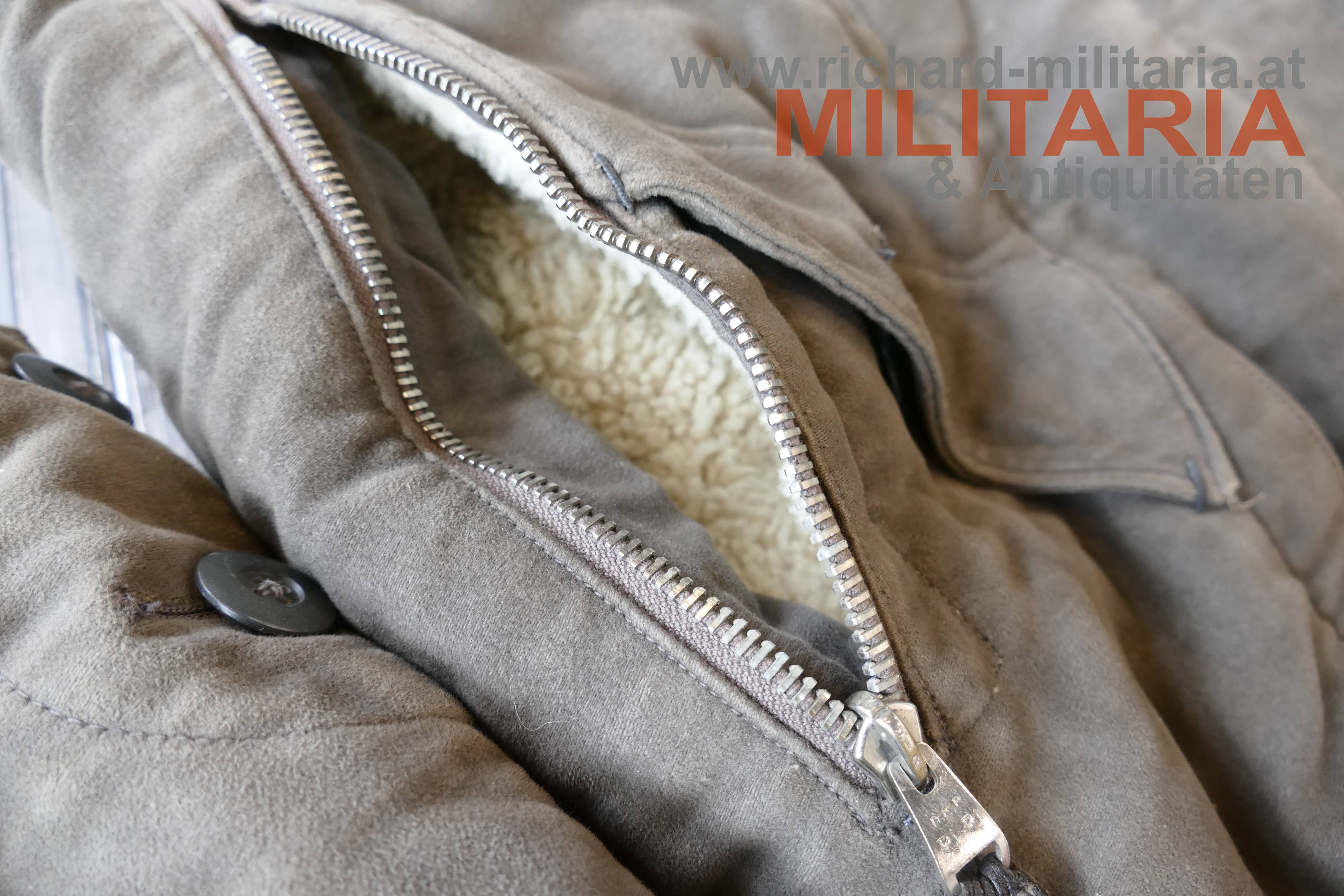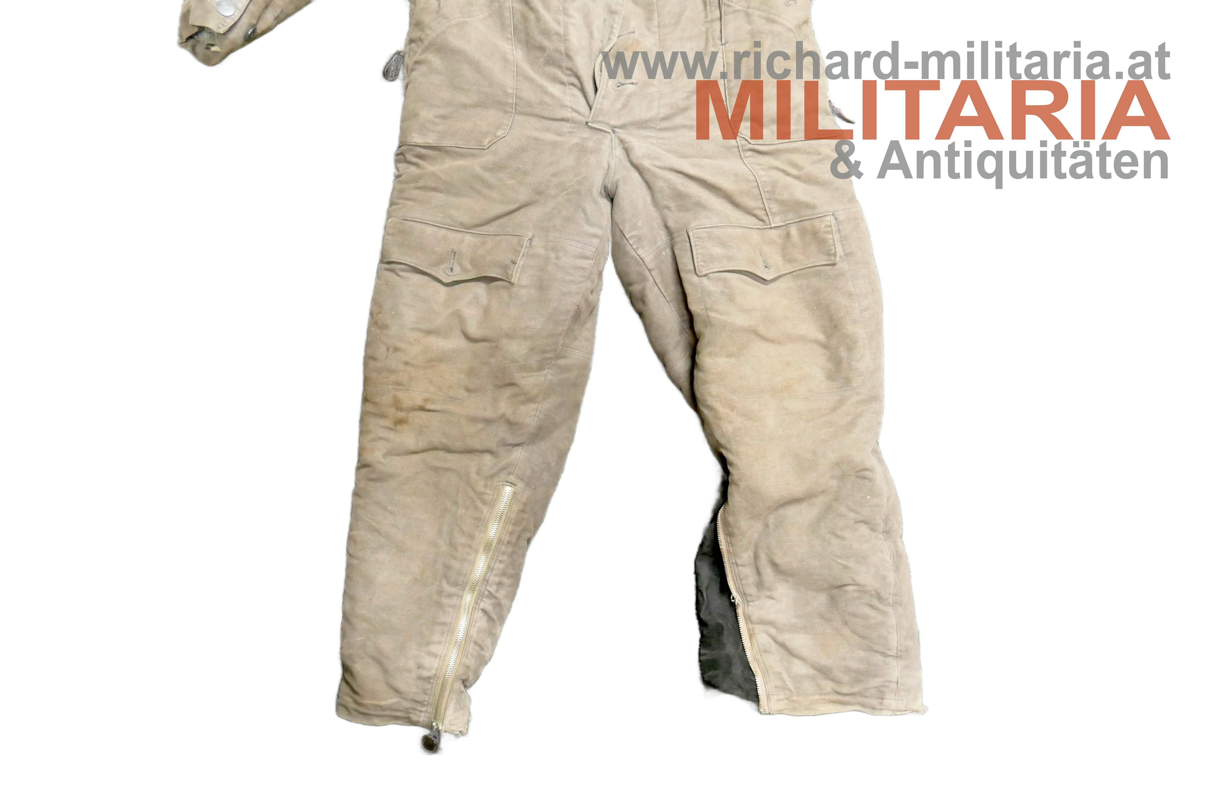 Luftwaffe Flieger-Schutzanzug im Wintereinsatz; Hersteller STRIWA (Striegel & Wagner) Lichtenfels bzw. Karl Heisler/Berlin mit D.R.G.M. Stempel; Fertigung aus schwerem, braungrauem Velvet-Material. Der Kragen dunkelbraun und der Innenteil mit hellem Lammfell gefüttert; am Kragen 2 Lederriemen zum Verschließen; alle Reissverschlüsse und Knöpfe vorhanden und bis auf den am Hosenbein links gängig (dieser ist beschädigt!); 2 Oberschenkeltaschen und 2 seitliche Einschubtaschen; innen mit Herstelleretikett und Stempel. Leicht getragen und bis auf Abwetzungen (durch die Stiefel) an den Hosenbeinenden und dem beschädigten Reissverschluss in schöner, getragener Erhaltung. Sehr schwer.