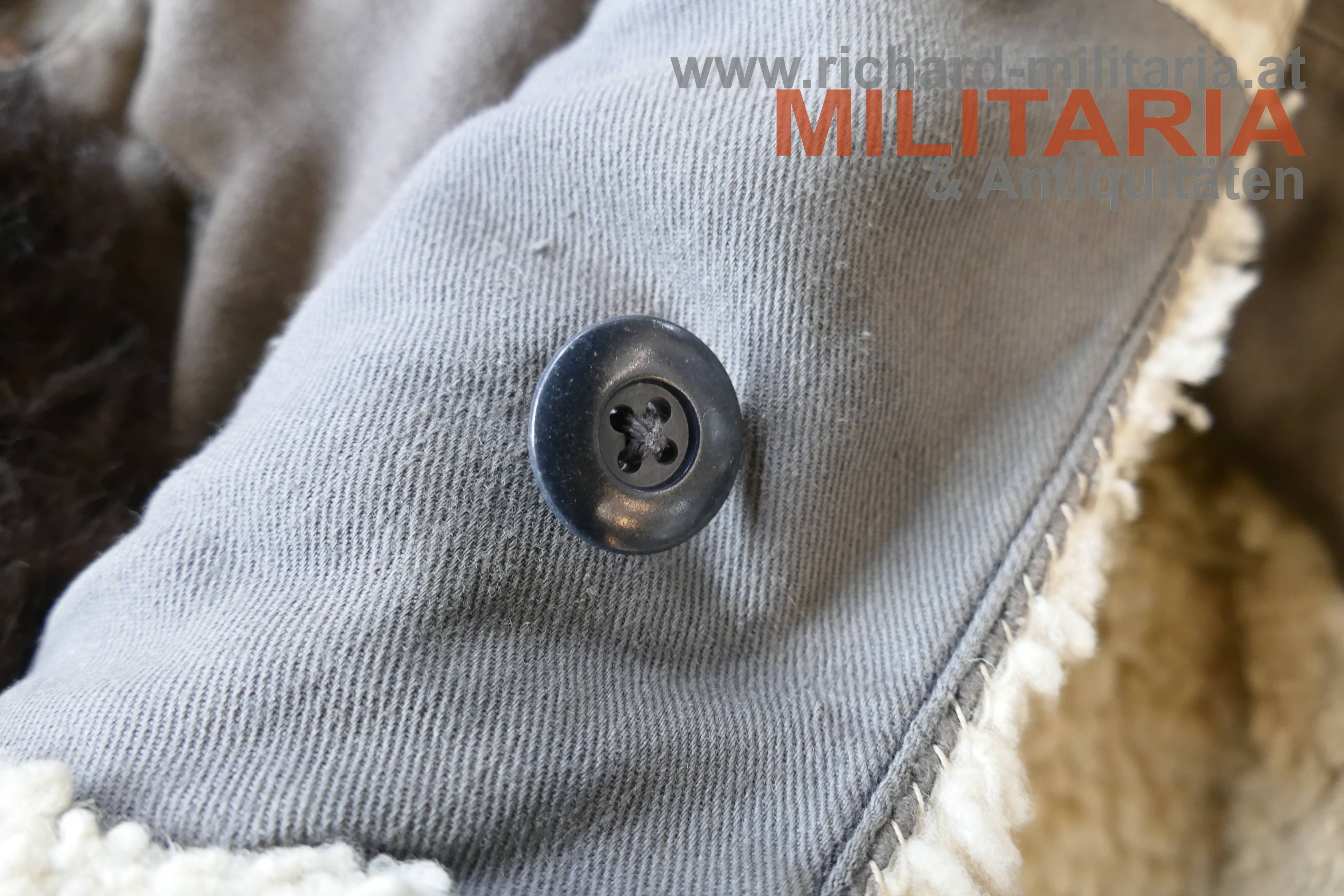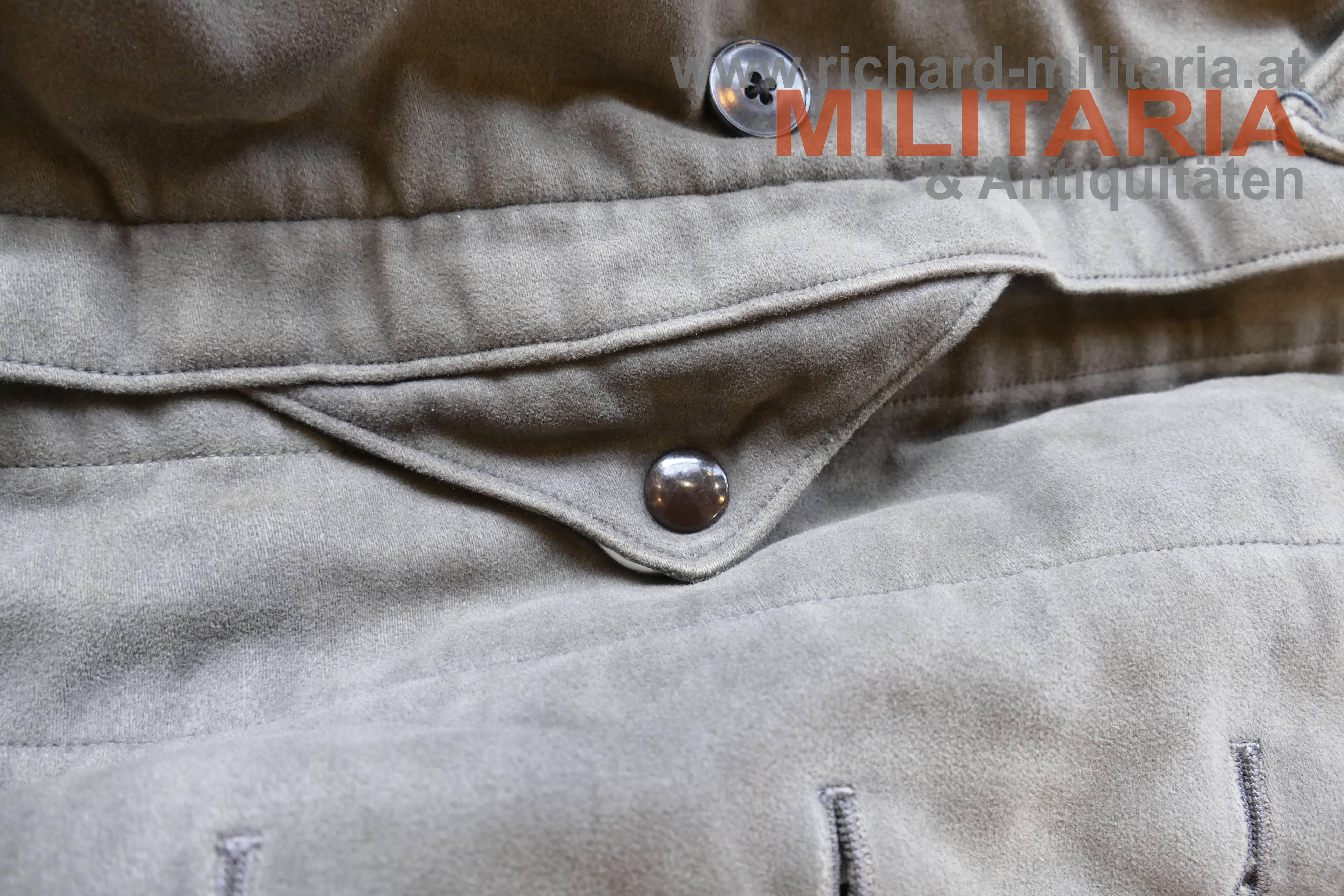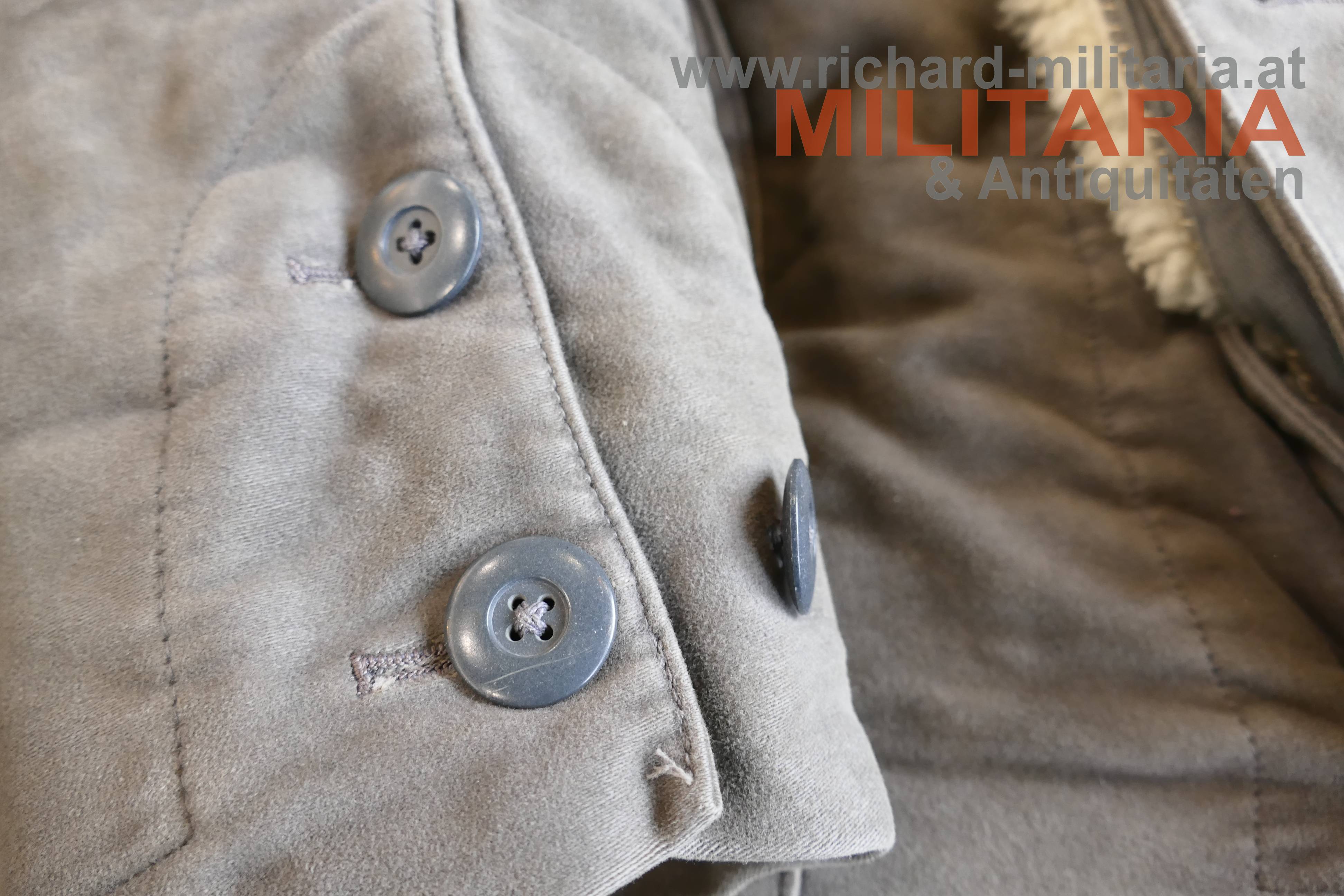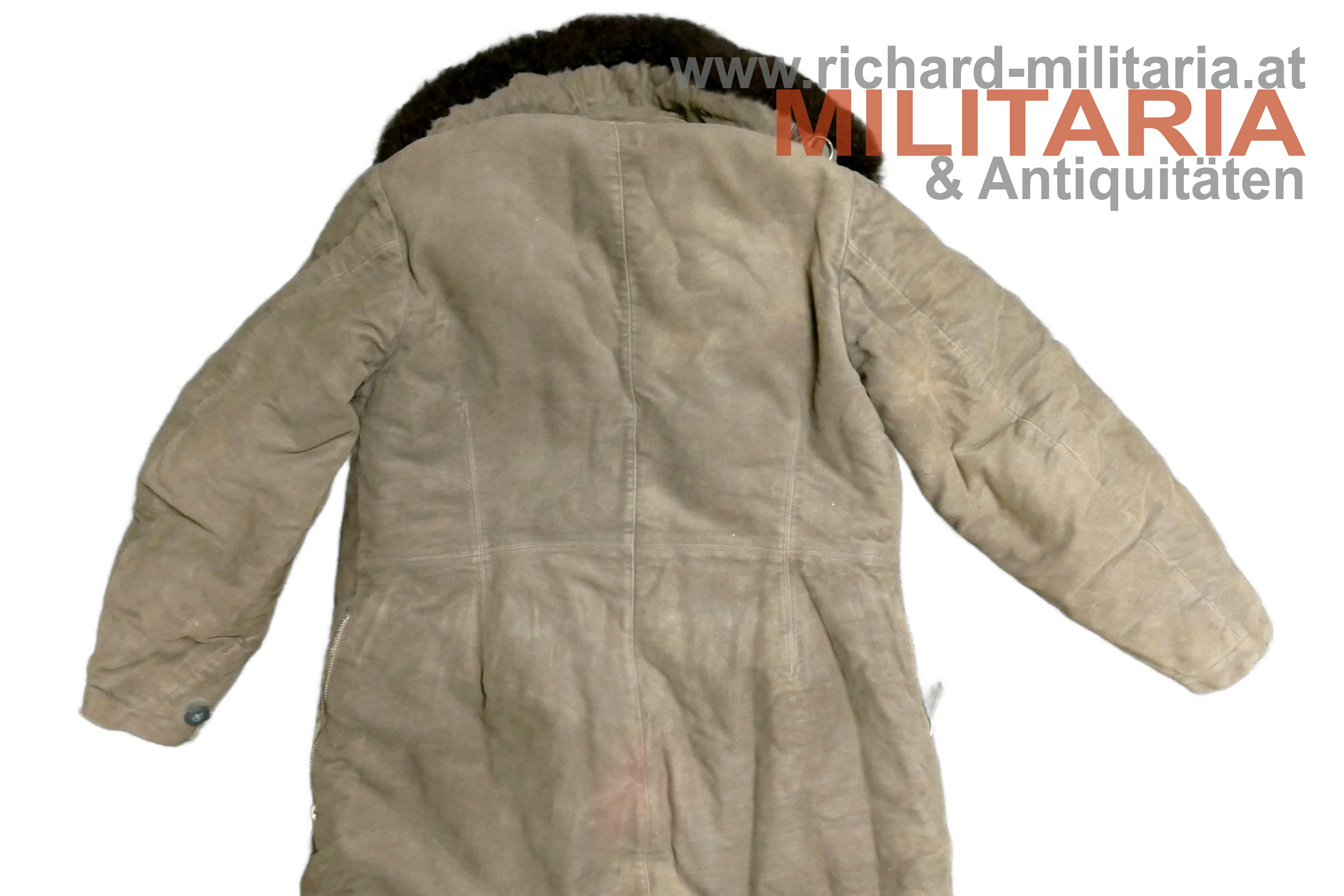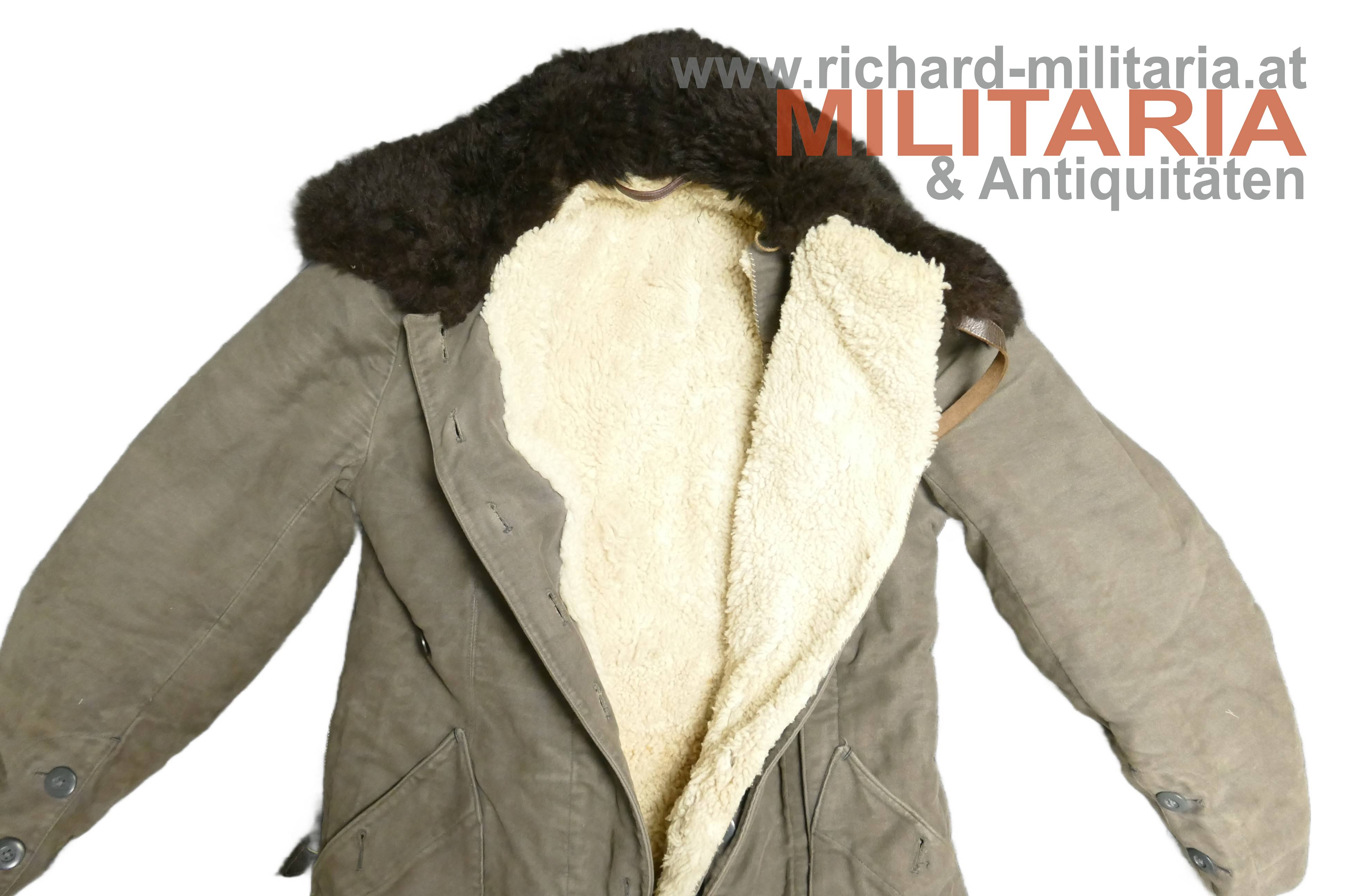 Luftwaffe Flieger-Schutzanzug im Wintereinsatz; Hersteller STRIWA (Striegel & Wagner) Lichtenfels bzw. Karl Heisler/Berlin mit D.R.G.M. Stempel; Fertigung aus schwerem, braungrauem Velvet-Material. Der Kragen dunkelbraun und der Innenteil mit hellem Lammfell gefüttert; am Kragen 2 Lederriemen zum Verschließen; alle Reissverschlüsse und Knöpfe vorhanden und bis auf den am Hosenbein links gängig (dieser ist beschädigt!); 2 Oberschenkeltaschen und 2 seitliche Einschubtaschen; innen mit Herstelleretikett und Stempel. Leicht getragen und bis auf Abwetzungen (durch die Stiefel) an den Hosenbeinenden und dem beschädigten Reissverschluss in schöner, getragener Erhaltung. Sehr schwer.