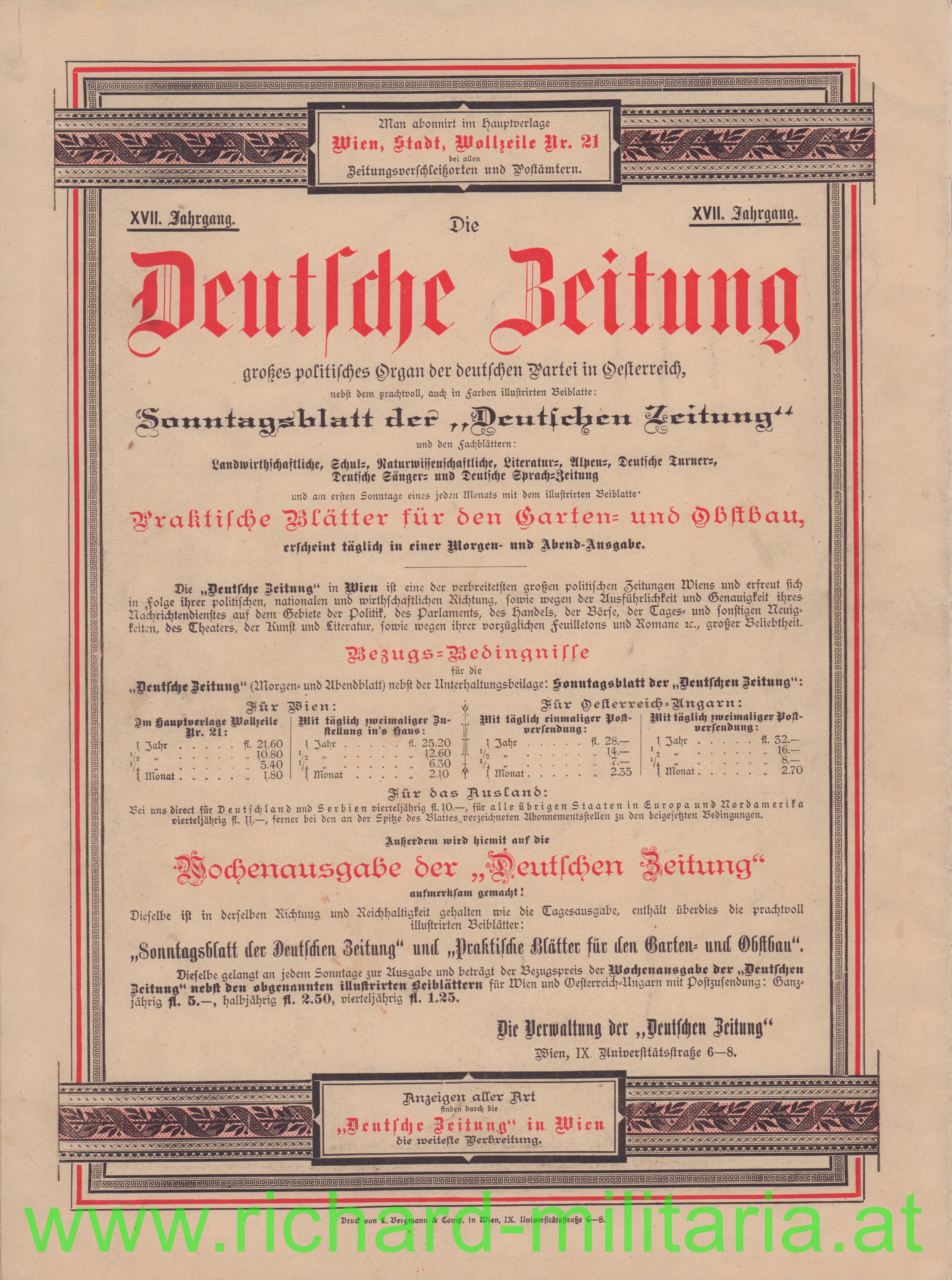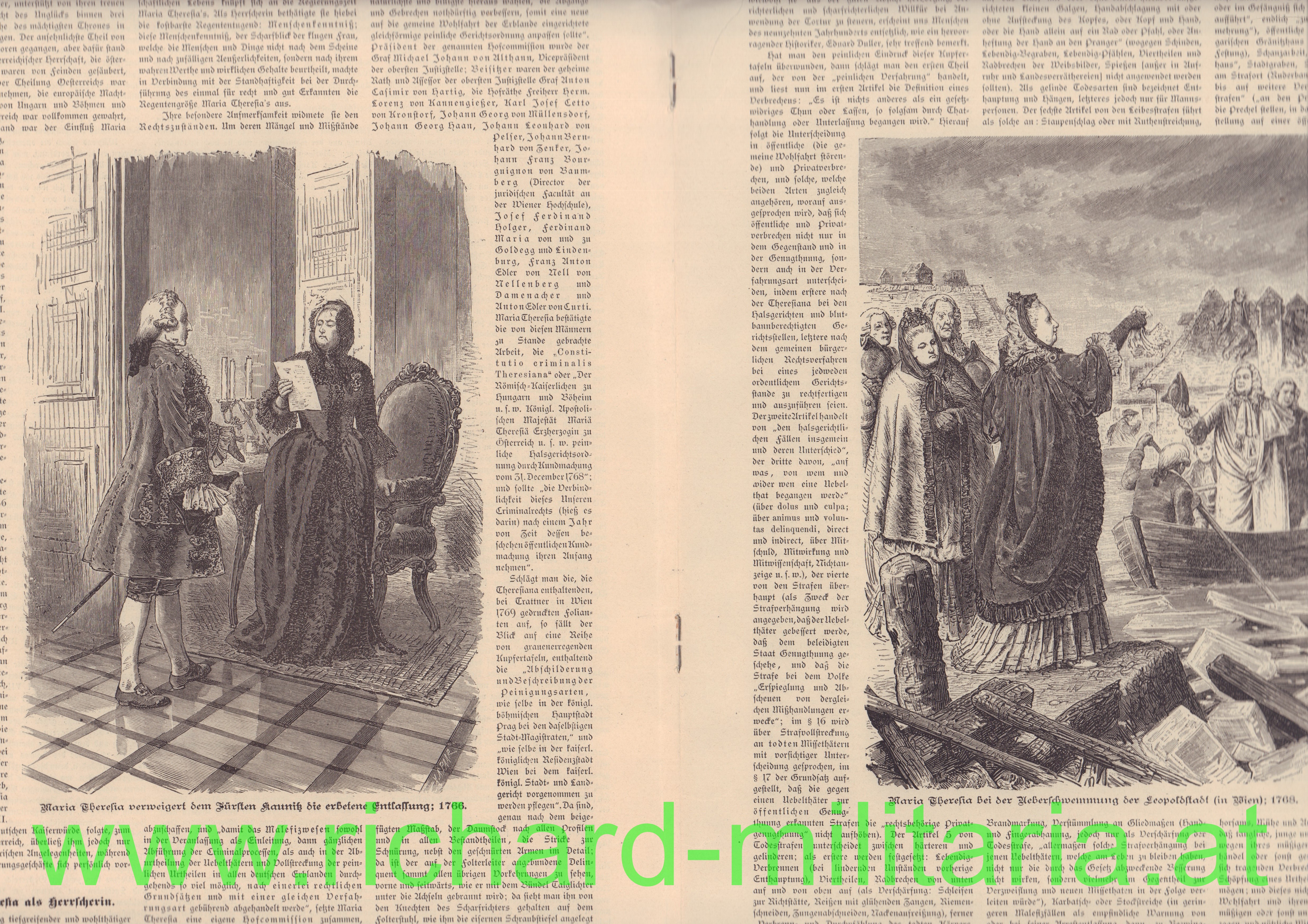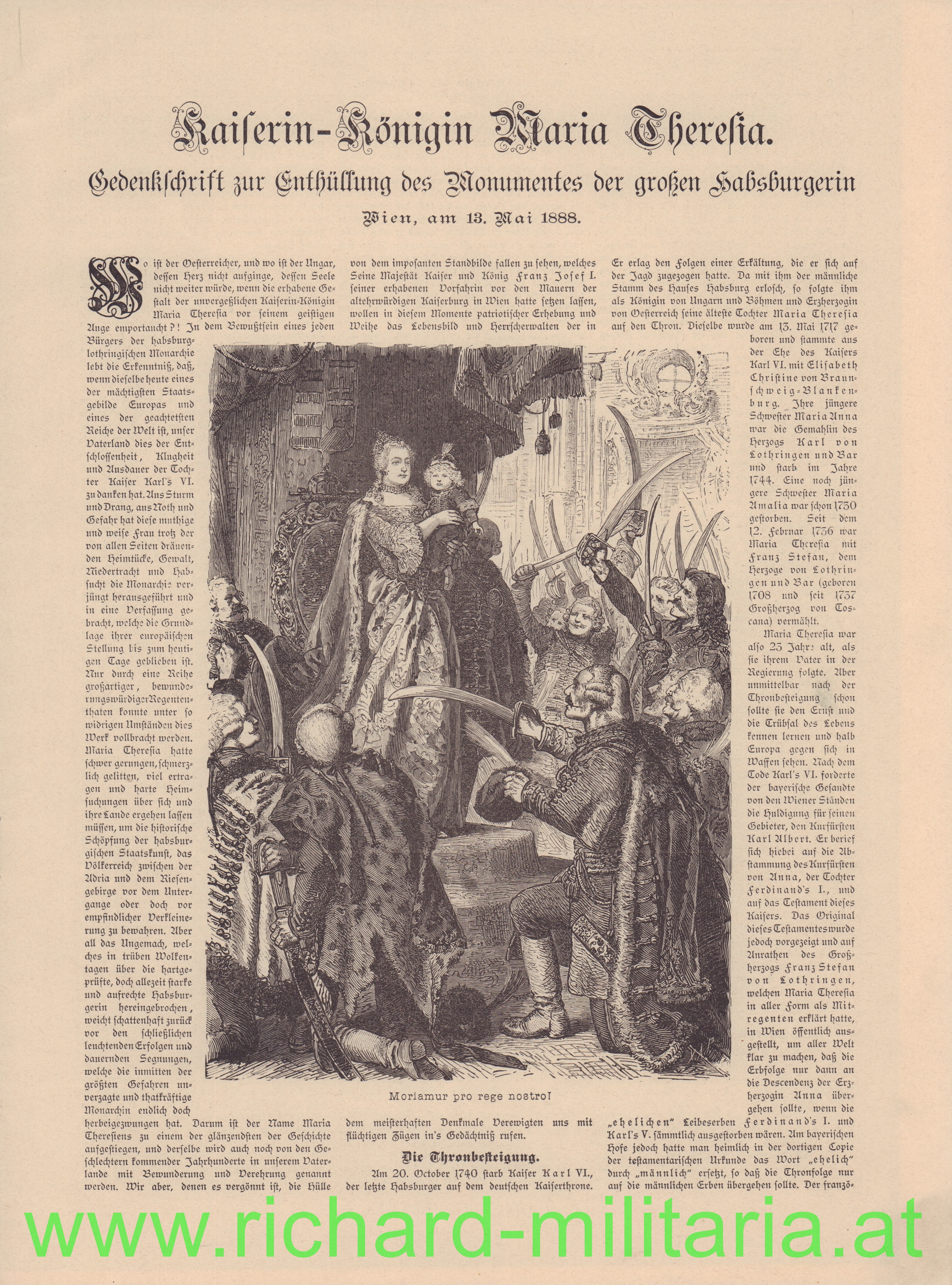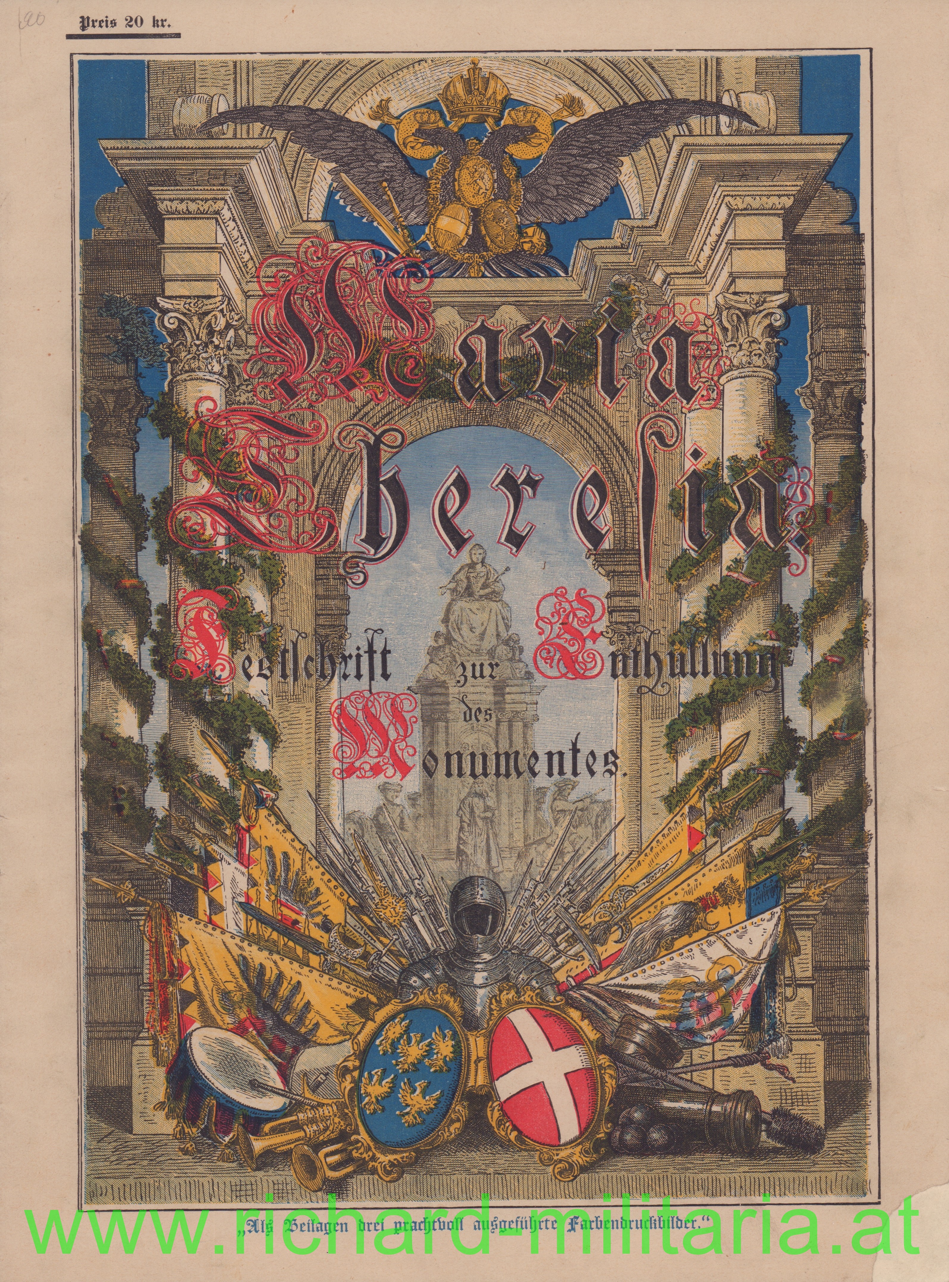 Maria Theresia - Festschrift zur Enthüllung des Monumentes 1888, Sonderausgabe der "Deutschen Zeitung" mit 3 zusätzlichen "Farbabbildungen" im Innenteil, alle Seiten vorhanden, am rechten unteren Eck kleine Beschädigung;