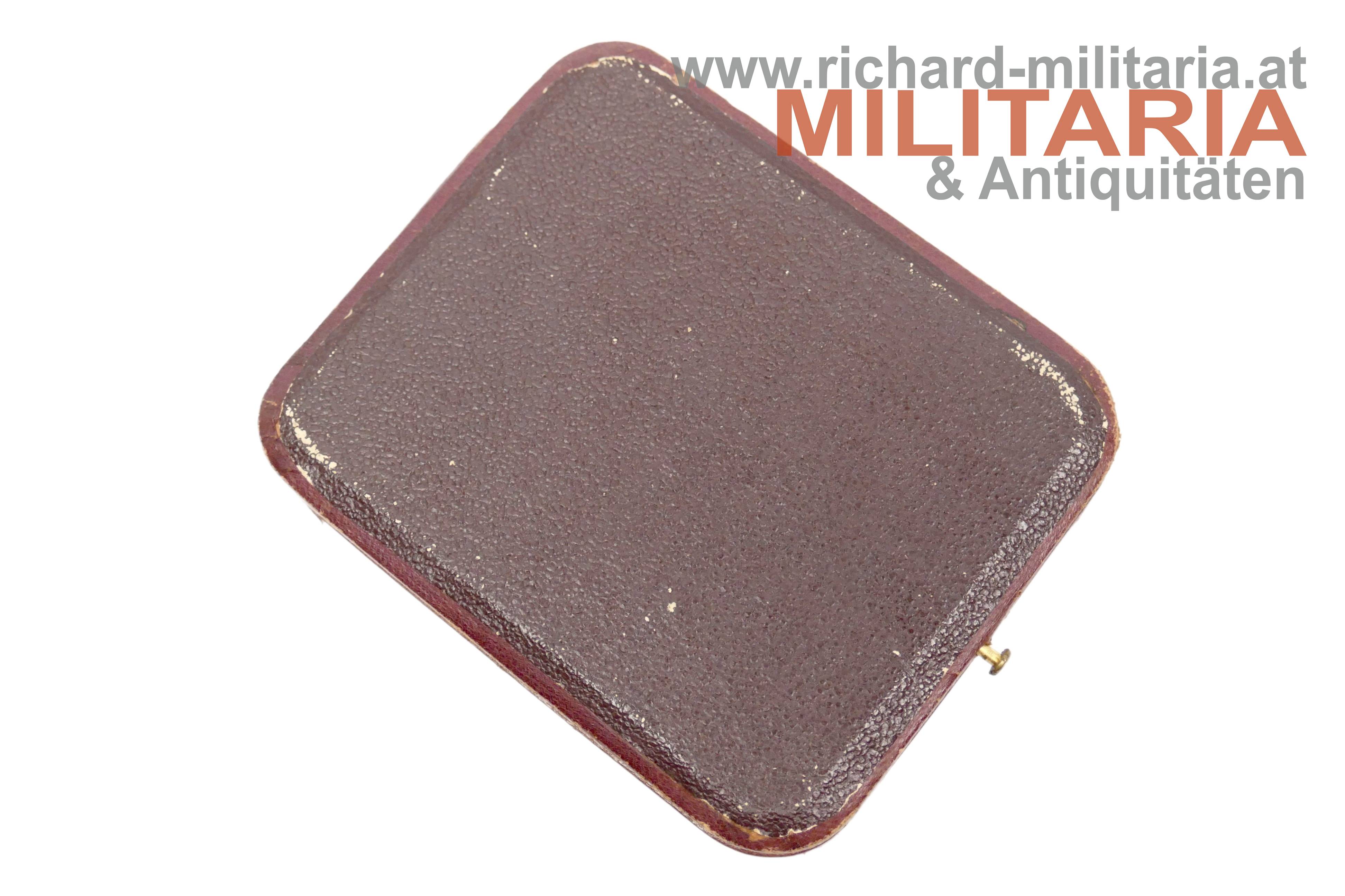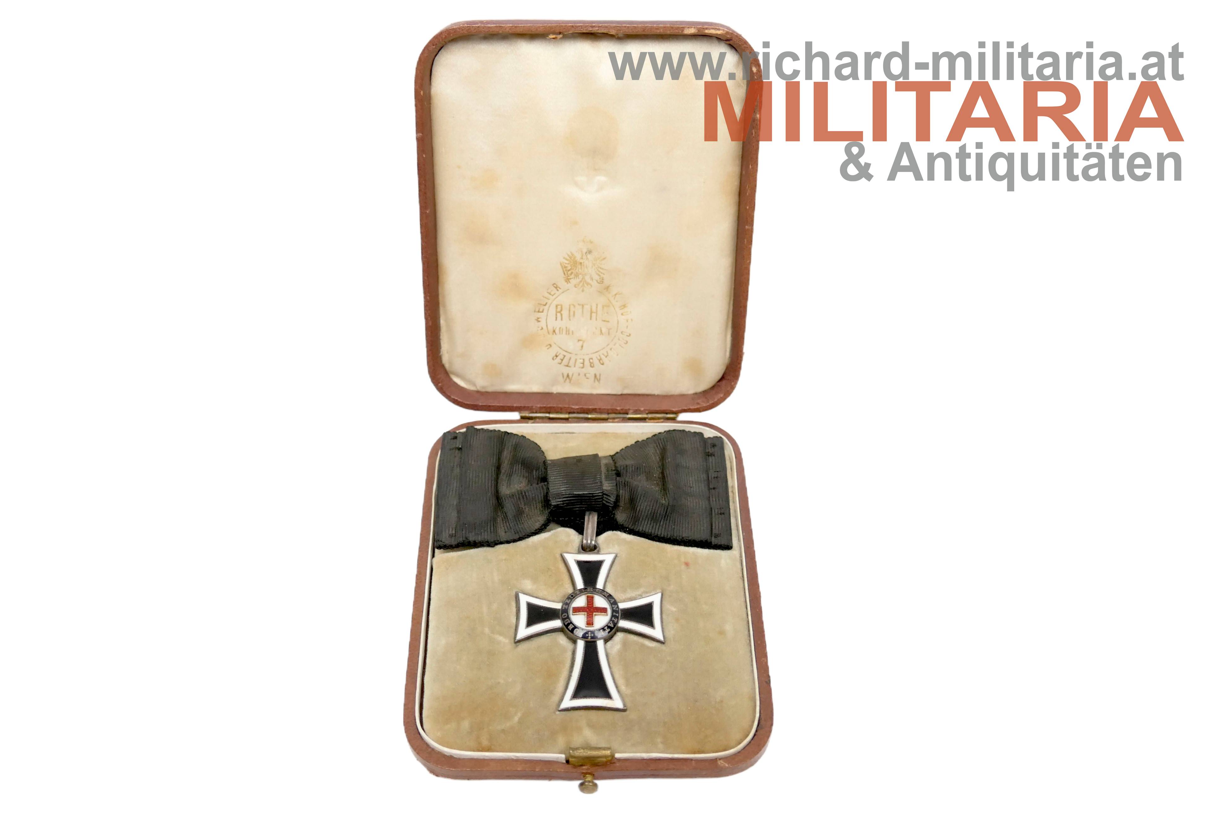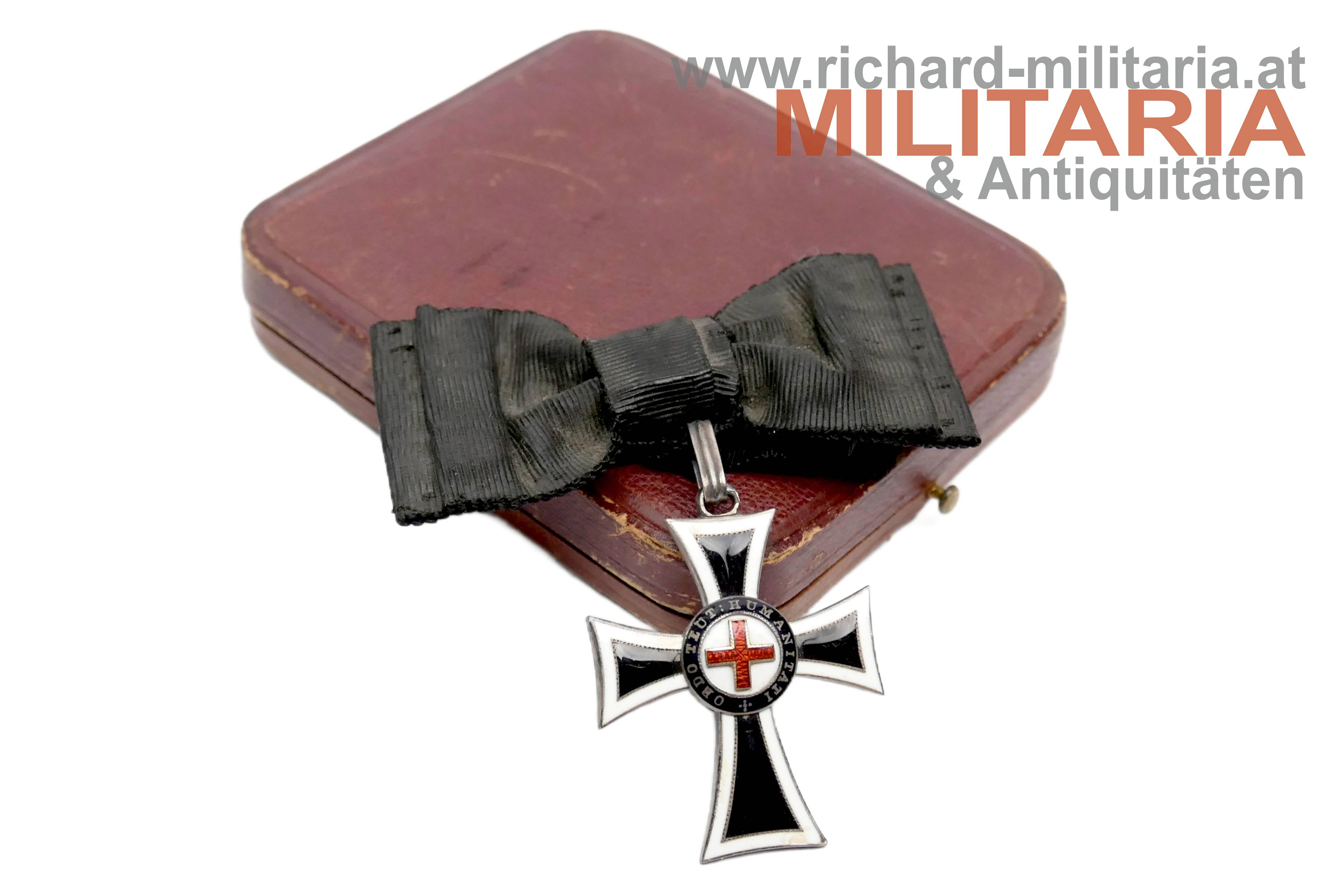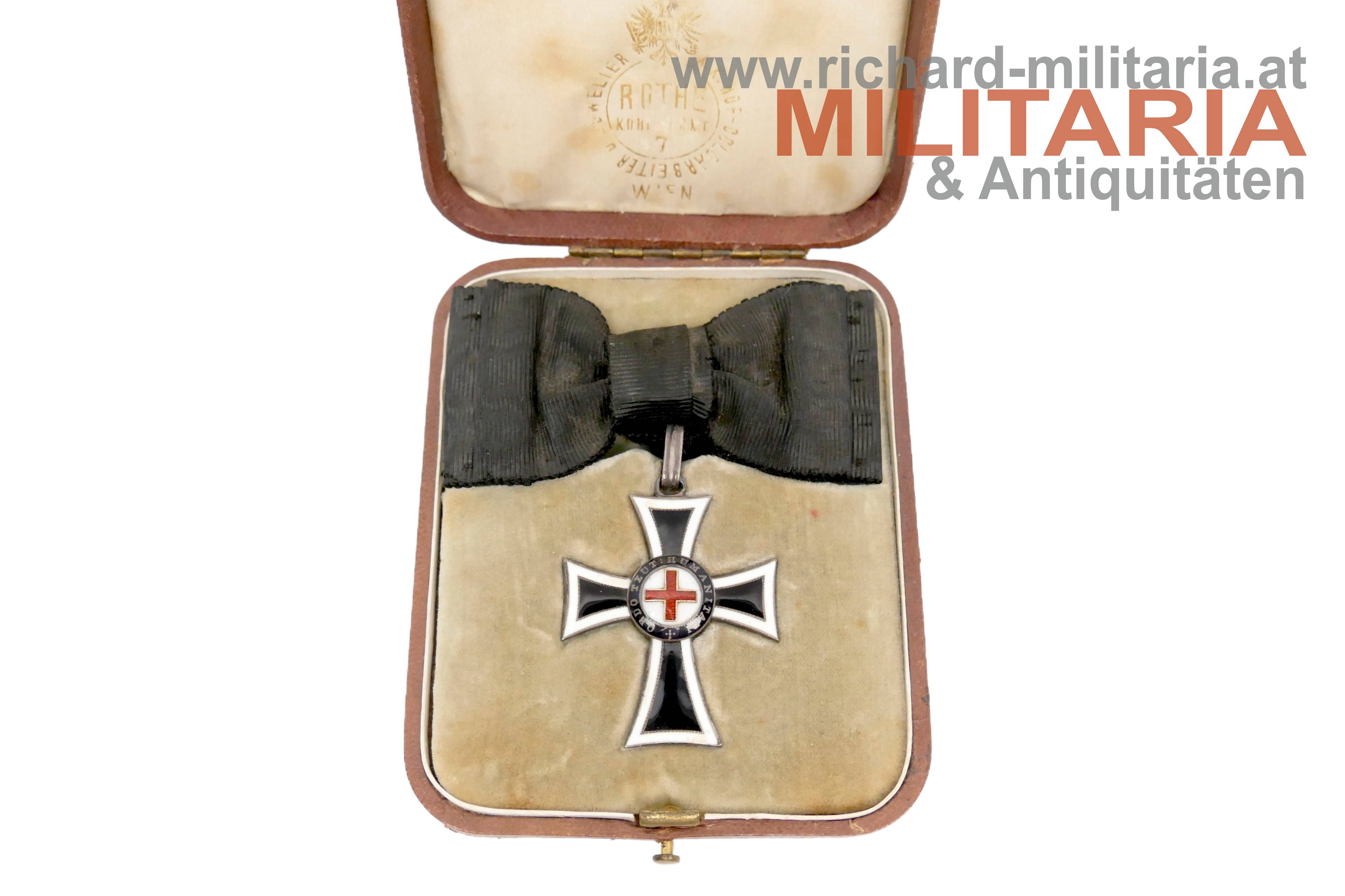 Marianerkreuz mit Damenmasche im Etui; 1. Typ (1871-1886) am schwarzen Damenband; Silber emailliert; Öse unpunziert; Bandring mit Kontrollamtspunze "A"; Emaillierung in guter Erhaltung; oberflächliche kleine Emailschäden; im originalen Etui passend für den 1. Typ mit Damenmasche; innen am Etuideckel in goldener Schrift der Hersteller Rothe aufgedruckt; Etui mit leichteren Abnutzungsspuren; schließt und öffnet einwandfrei;