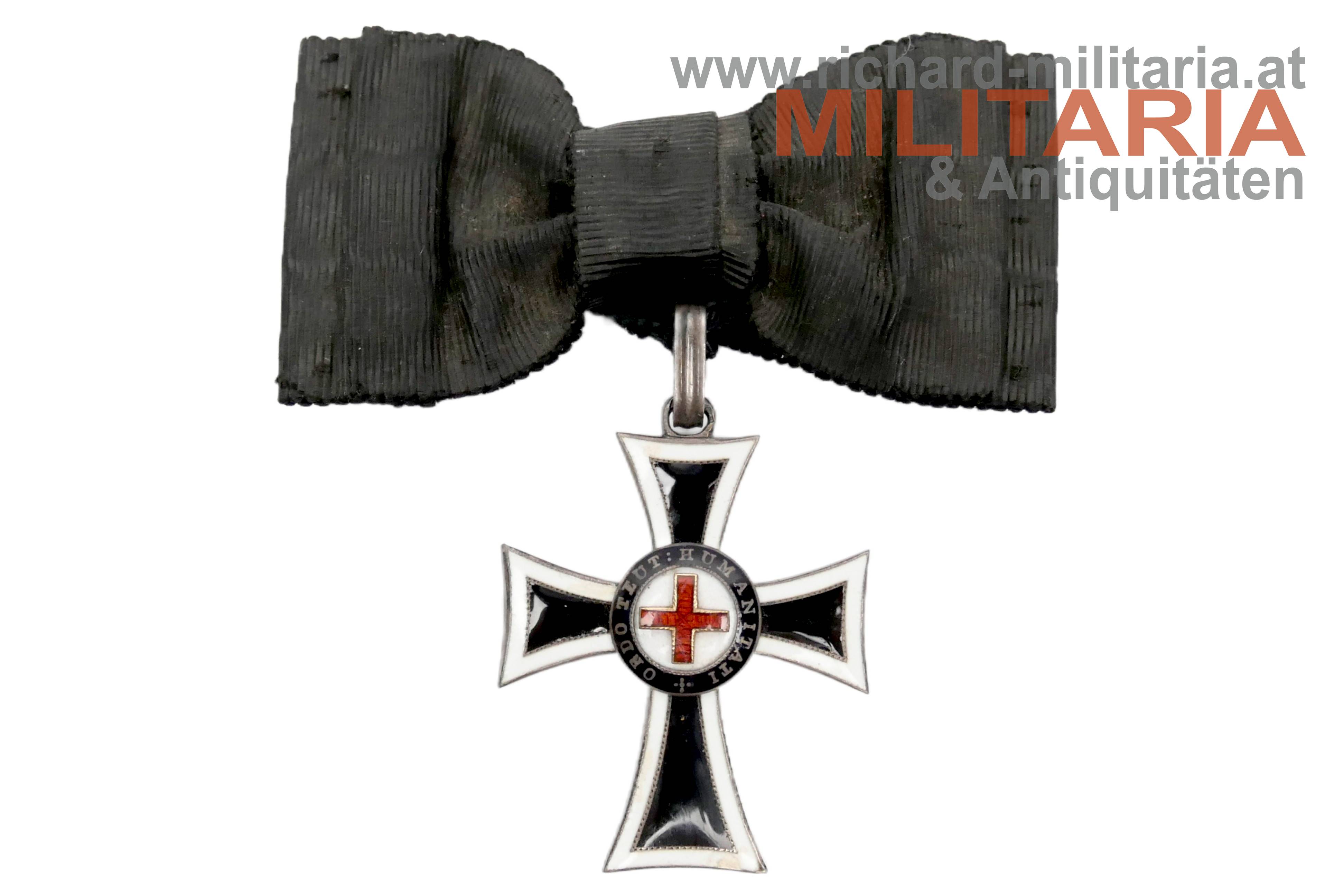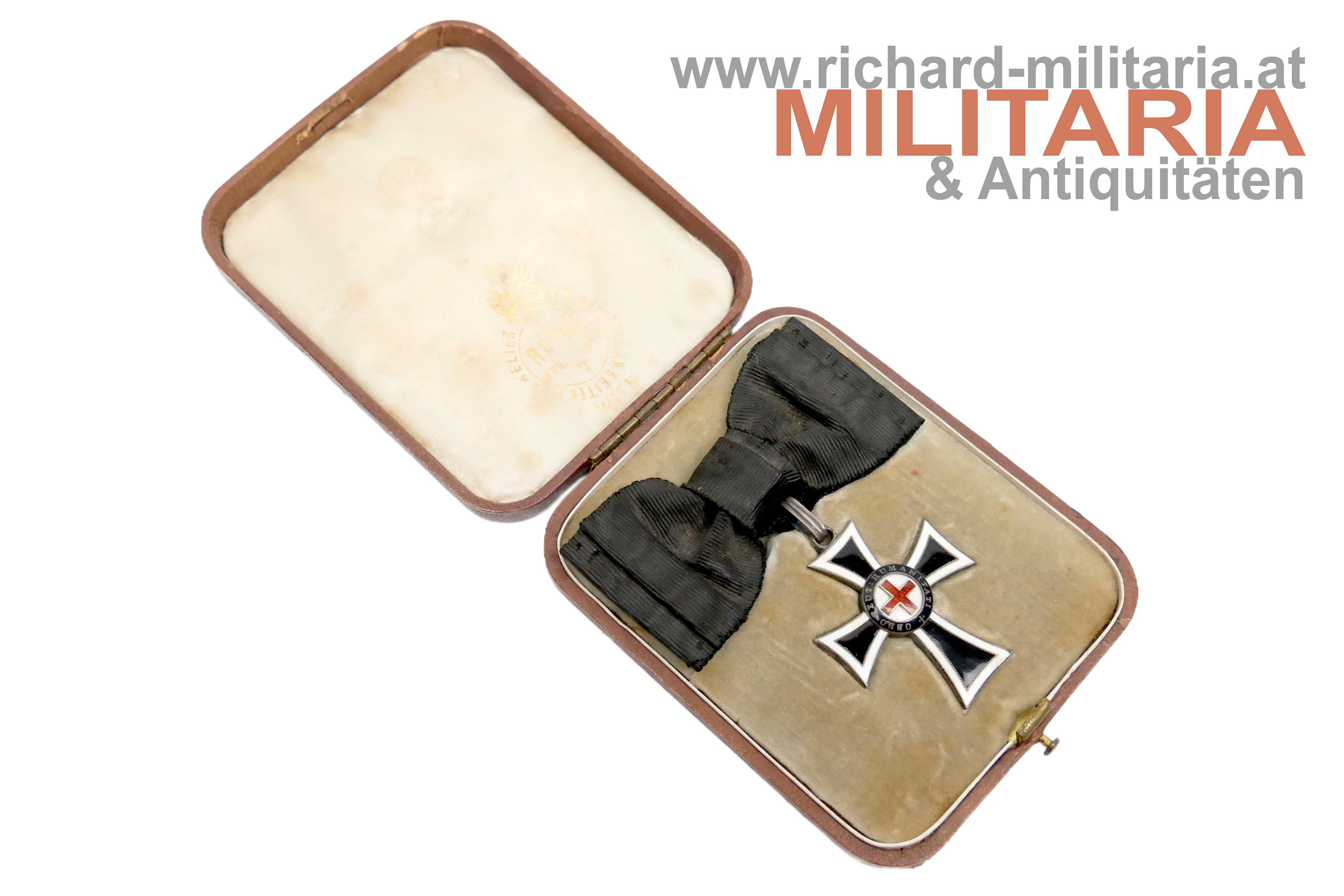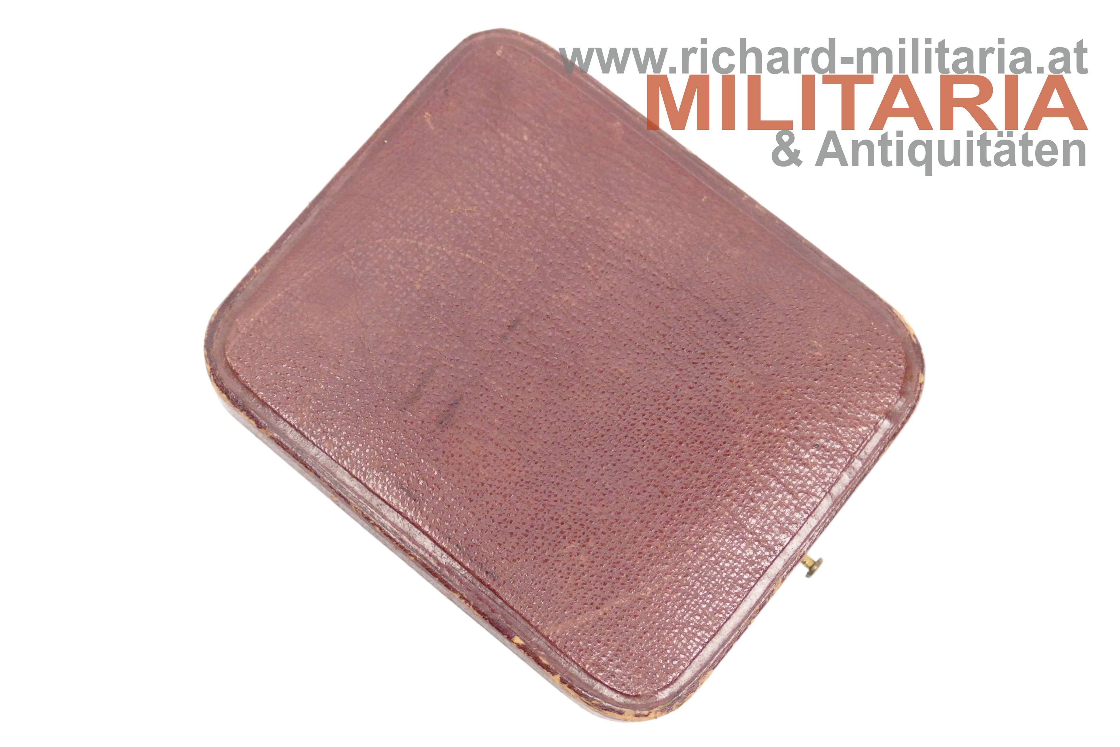 Marianerkreuz mit Damenmasche im Etui; 1. Typ (1871-1886) am schwarzen Damenband; Silber emailliert; Öse unpunziert; Bandring mit Kontrollamtspunze "A"; Emaillierung in guter Erhaltung; oberflächliche kleine Emailschäden; im originalen Etui passend für den 1. Typ mit Damenmasche; innen am Etuideckel in goldener Schrift der Hersteller Rothe aufgedruckt; Etui mit leichteren Abnutzungsspuren; schließt und öffnet einwandfrei;