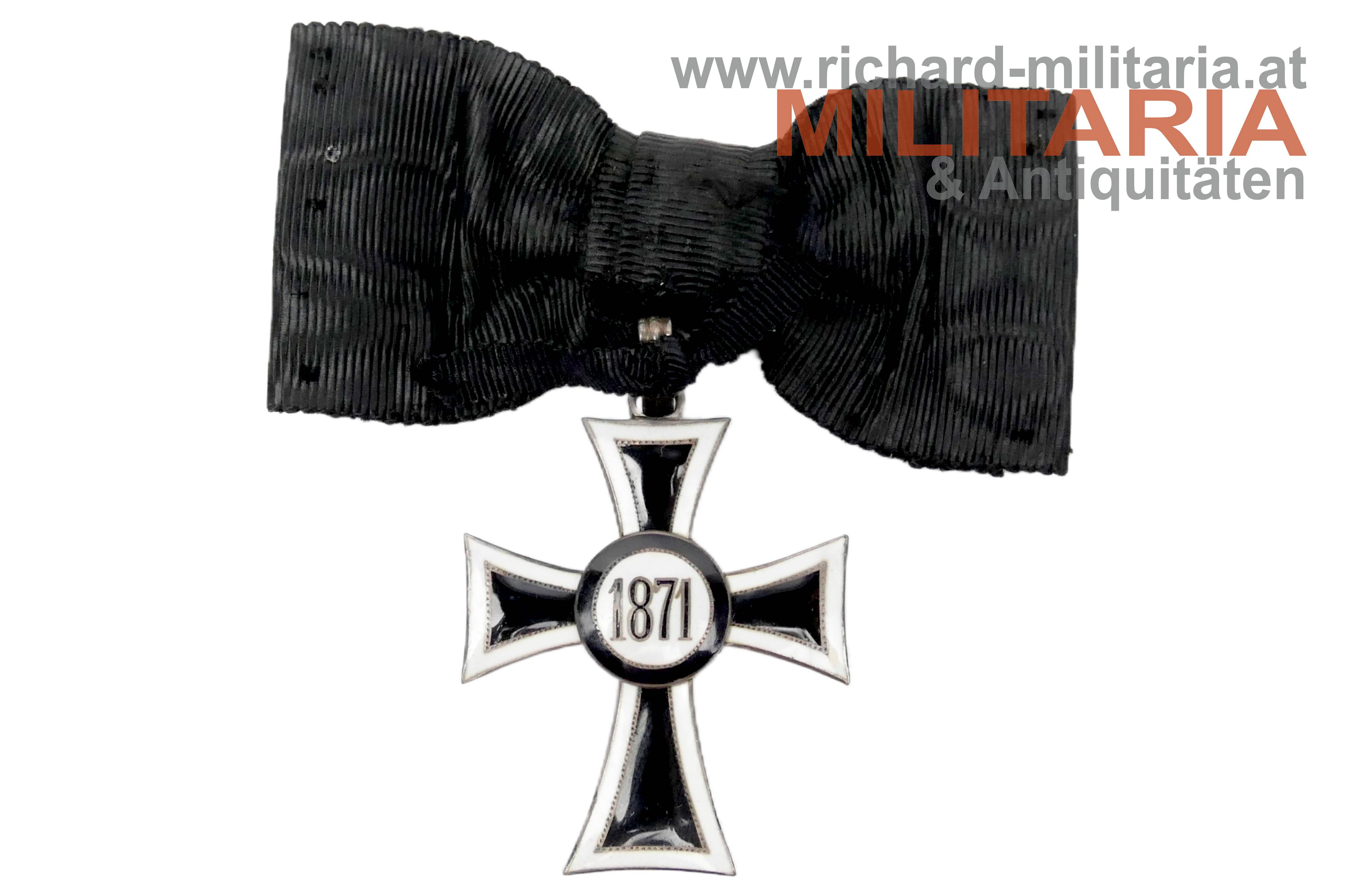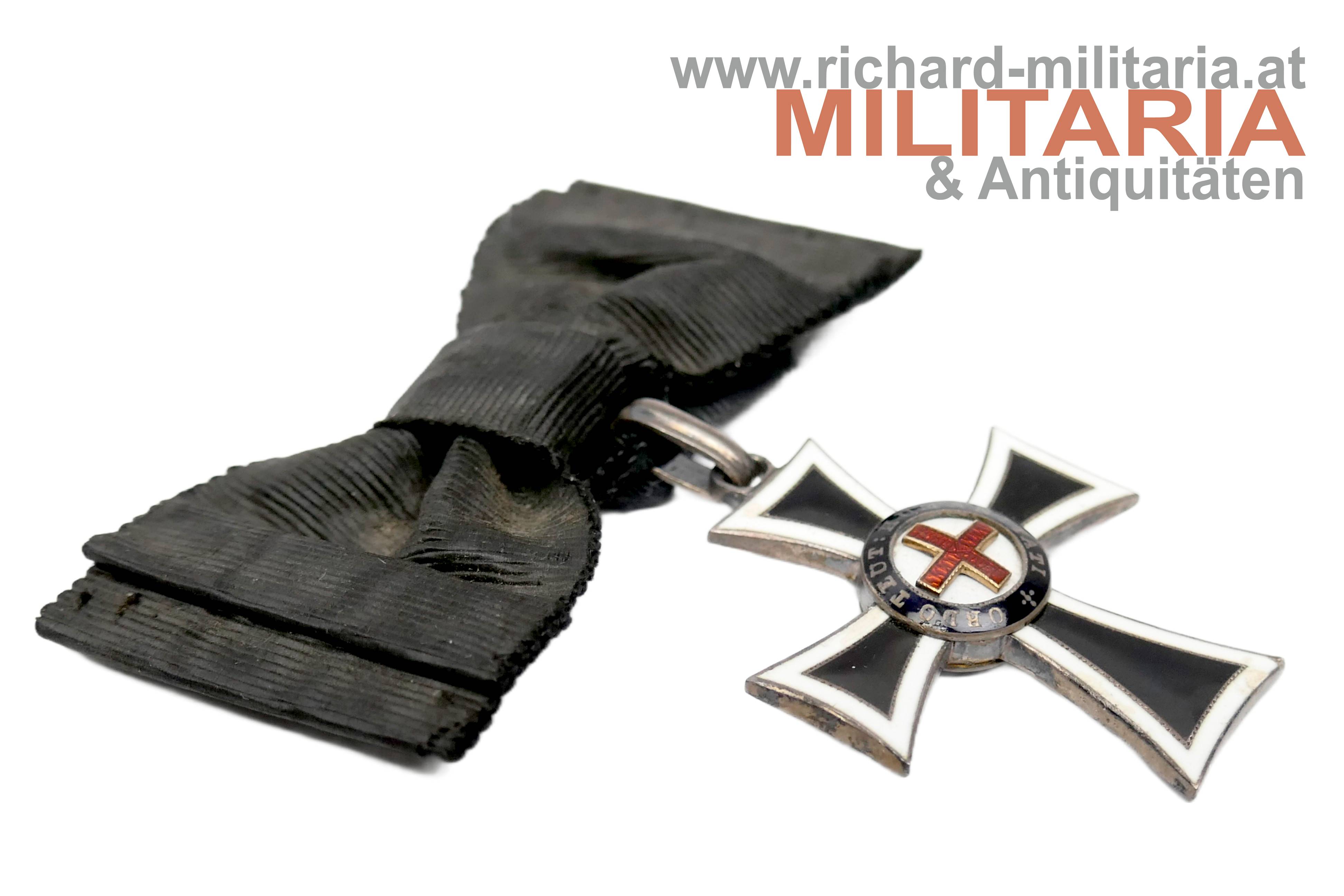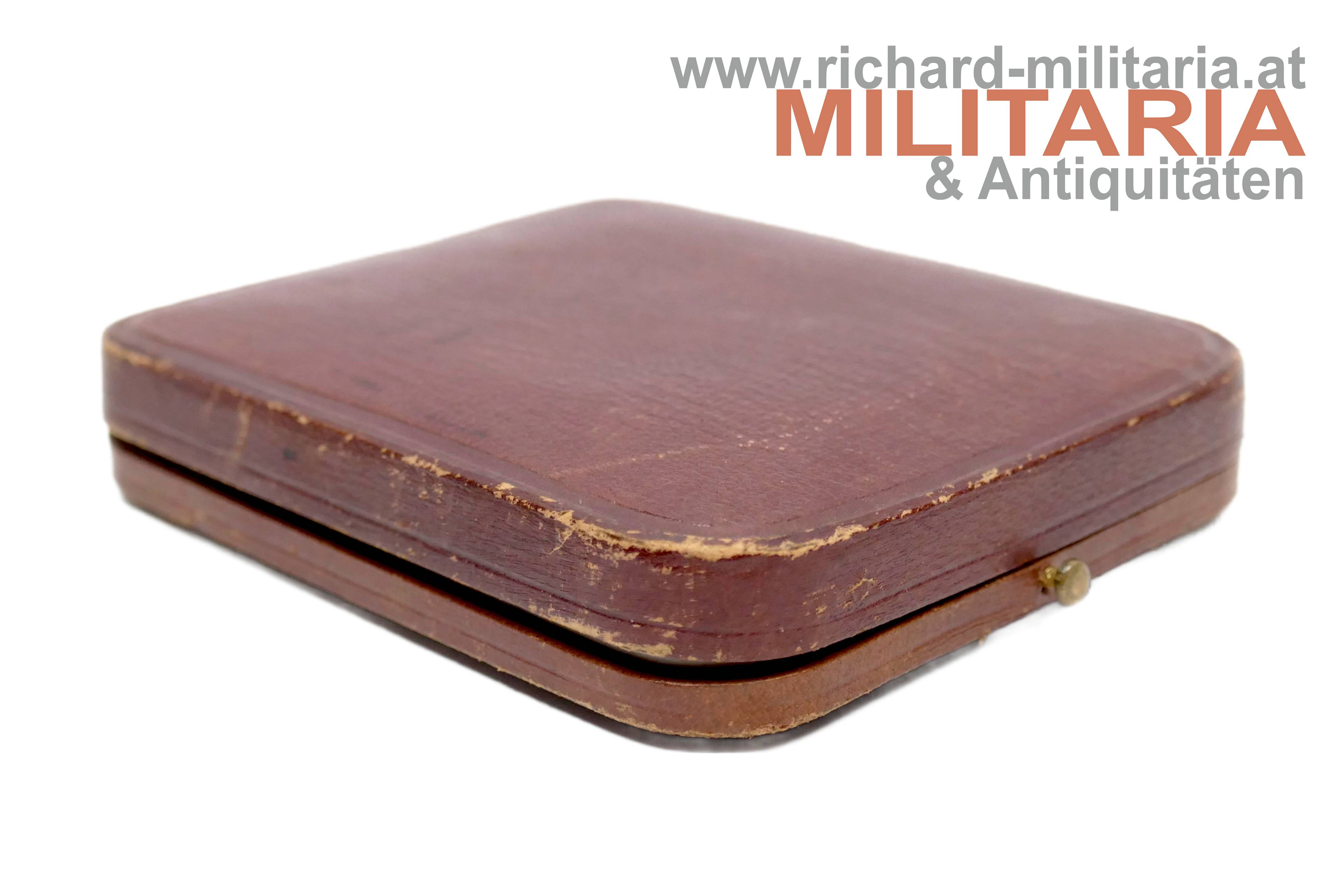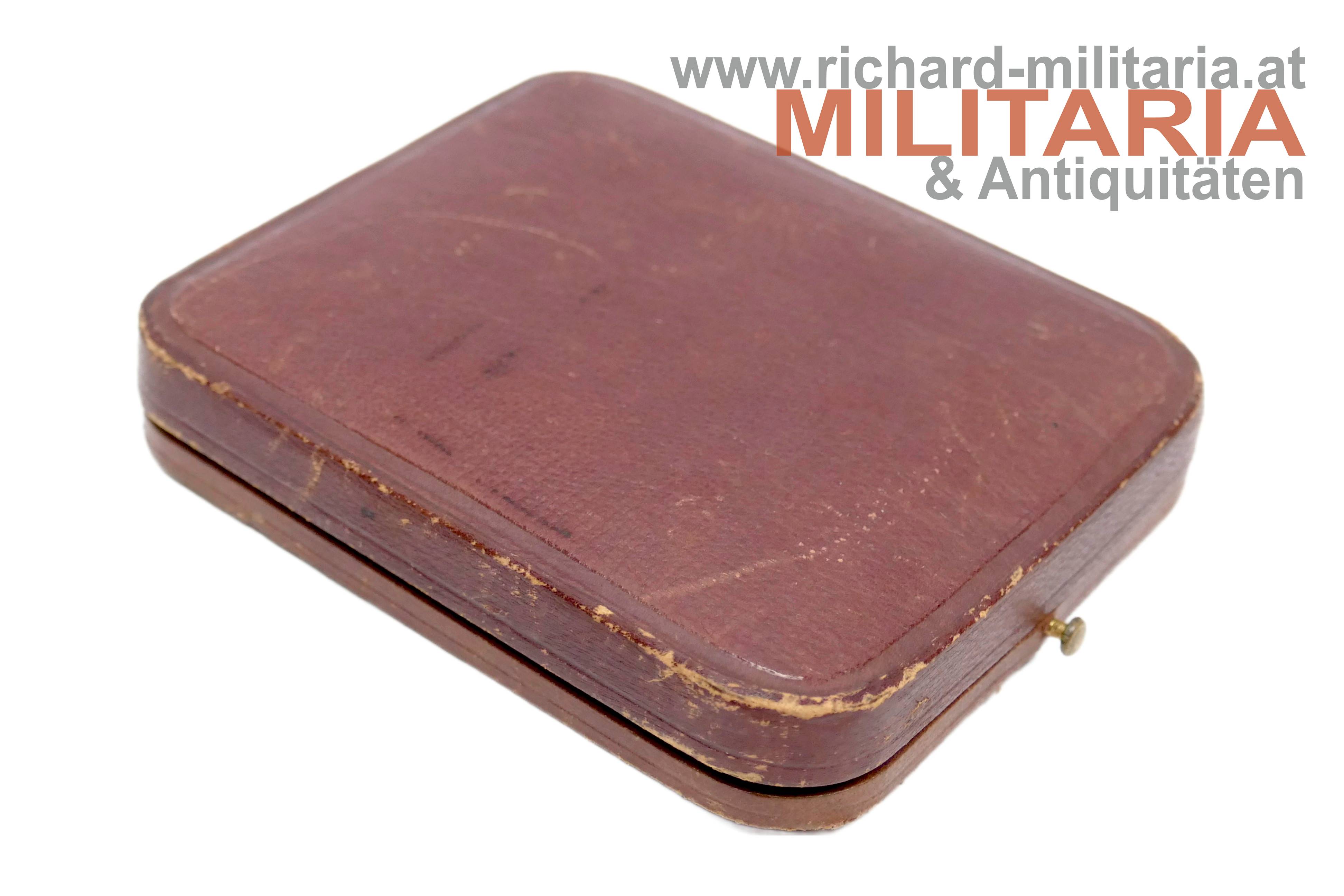 Marianerkreuz mit Damenmasche im Etui; 1. Typ (1871-1886) am schwarzen Damenband; Silber emailliert; Öse unpunziert; Bandring mit Kontrollamtspunze "A"; Emaillierung in guter Erhaltung; oberflächliche kleine Emailschäden; im originalen Etui passend für den 1. Typ mit Damenmasche; innen am Etuideckel in goldener Schrift der Hersteller Rothe aufgedruckt; Etui mit leichteren Abnutzungsspuren; schließt und öffnet einwandfrei;