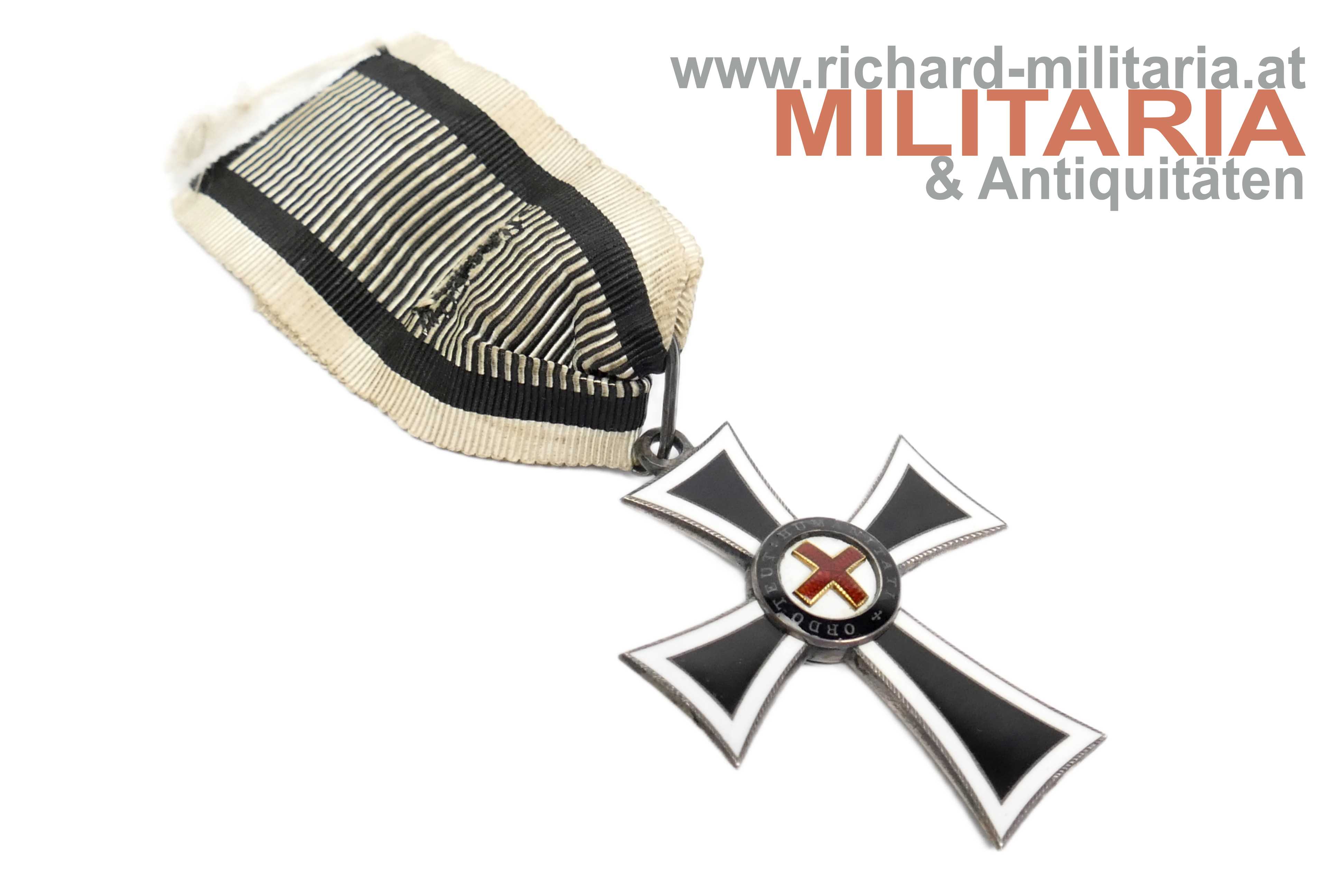 Marianerkreuz - Halskreuz; Silber mit Windhundpunzierung und Herstellerpunzierung "FR" (Rothe) auf der Öse; minimalste Emailbeschädigung auf der schwarzen Randeinfassung des Mittelmedaillons avers; kurzer Bandabschnitt mit fachmännisch gefertigtem Loch zum Einhängen auf einem Knopf der Uniform;