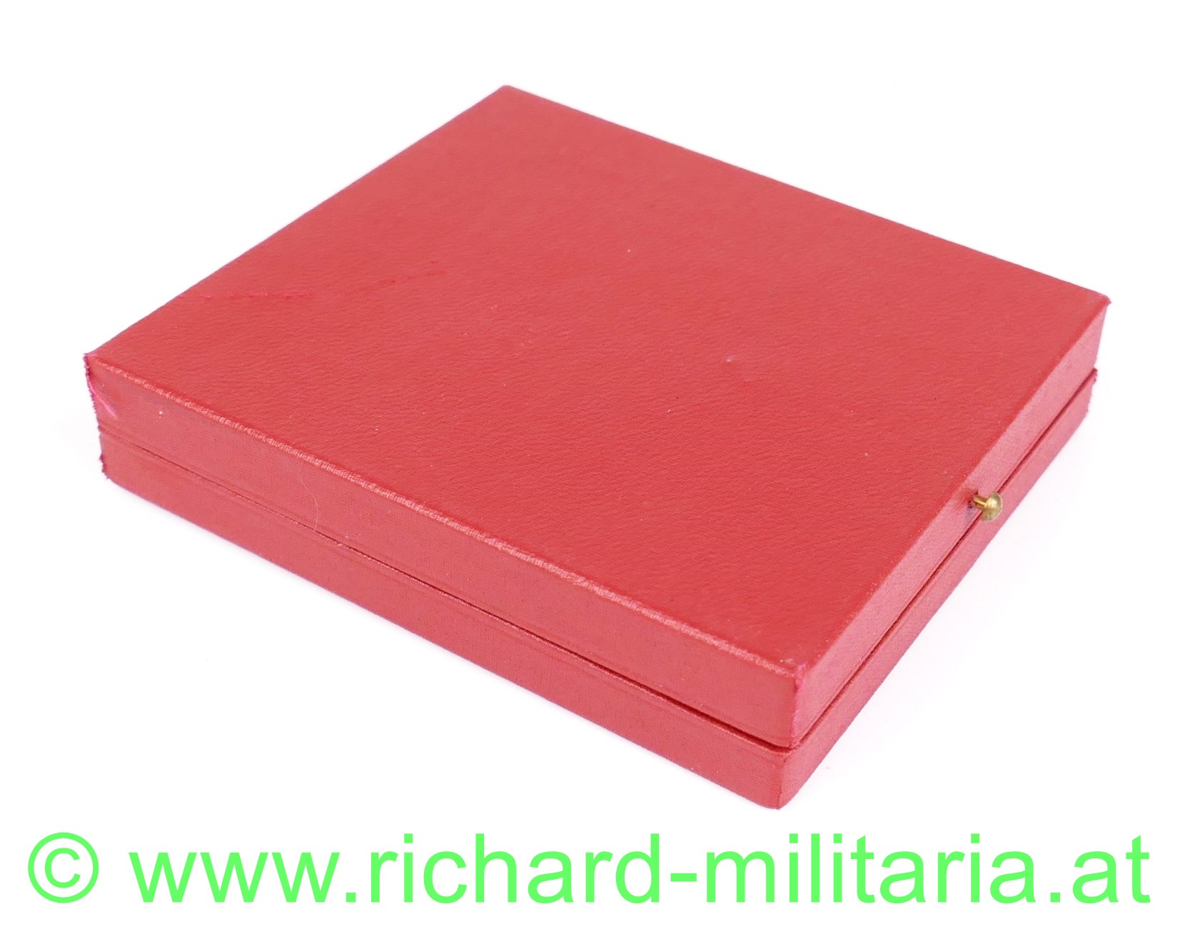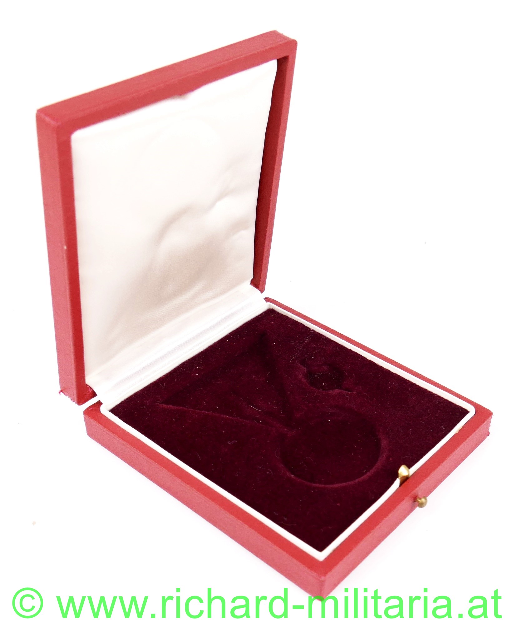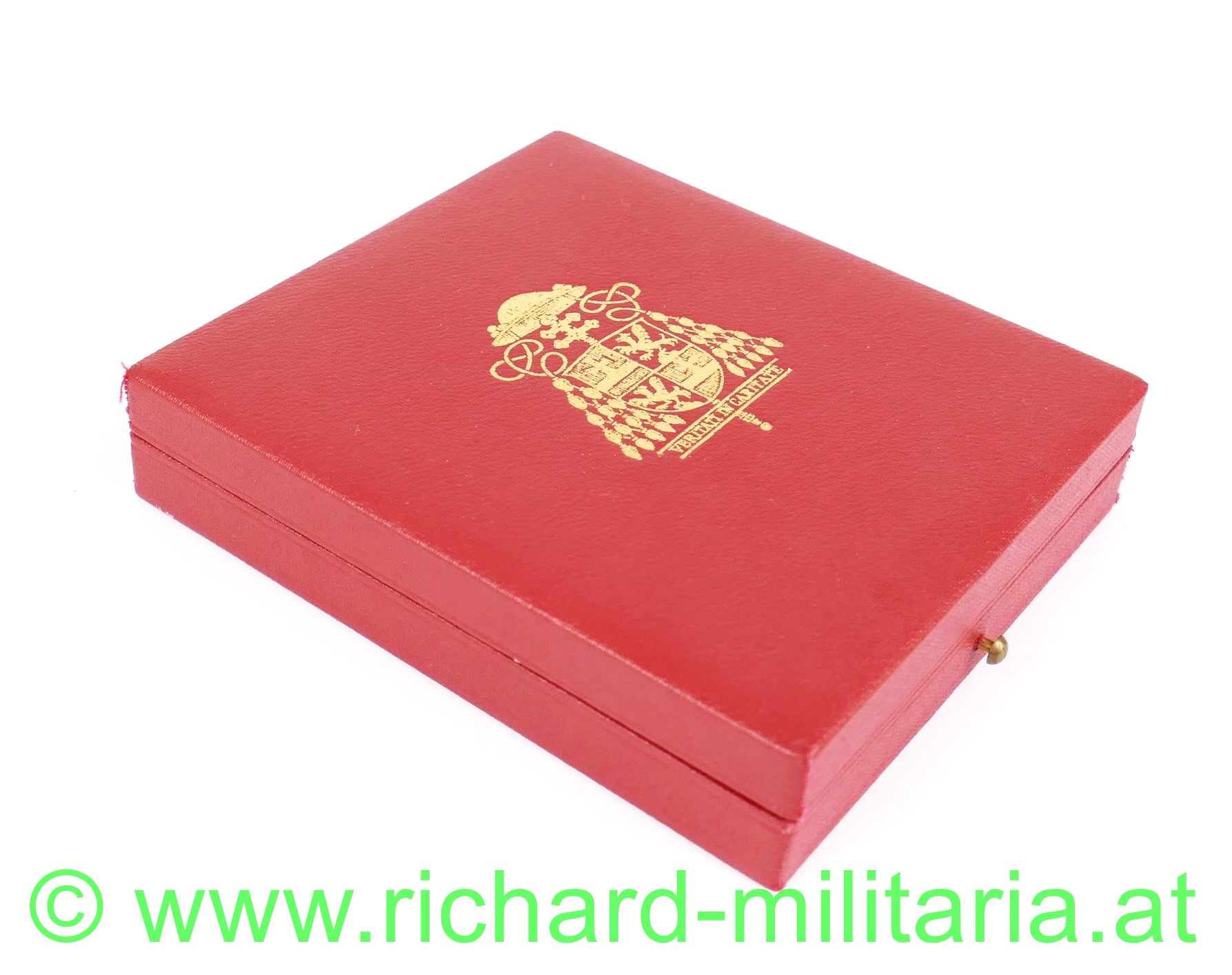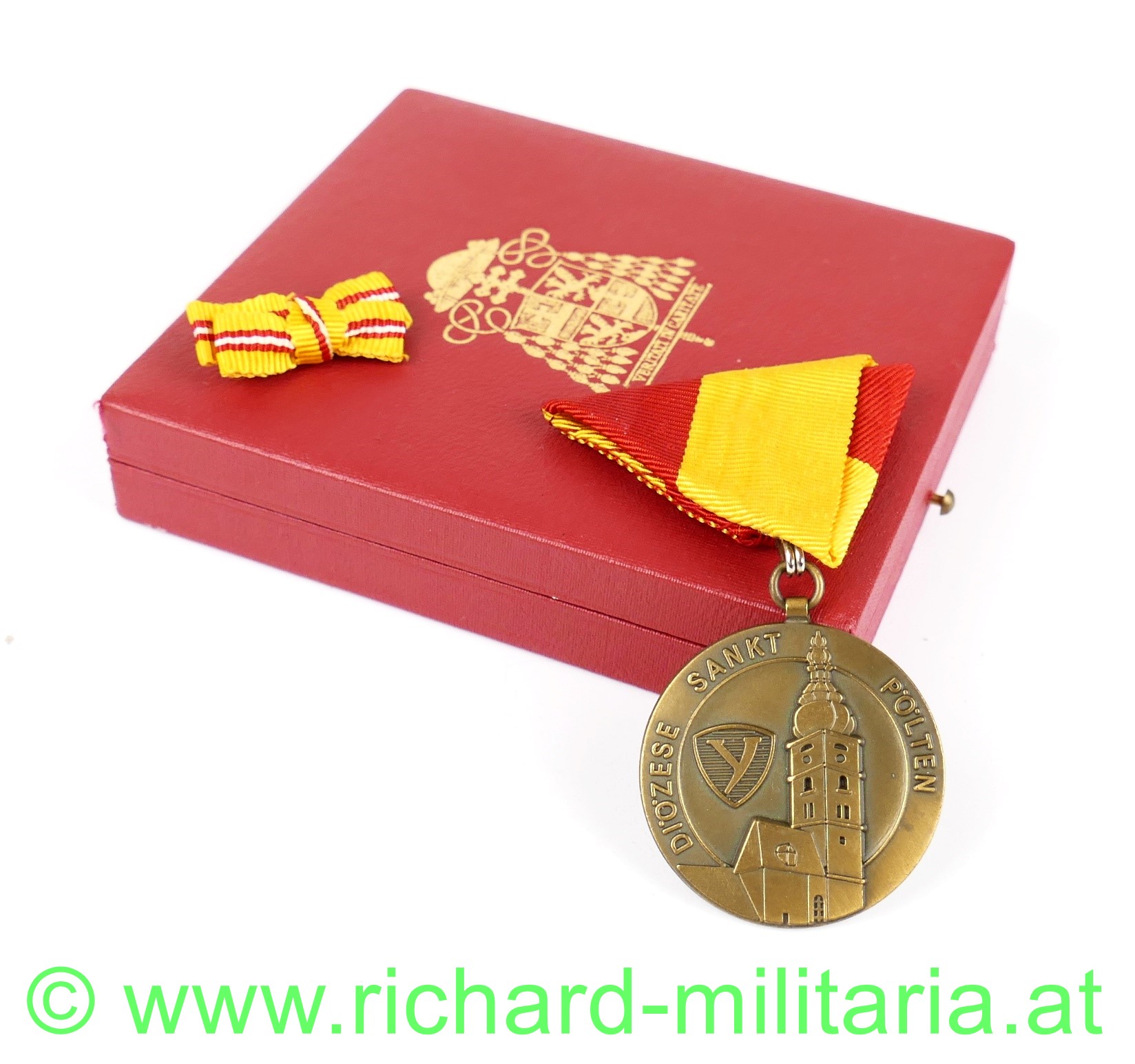 Medaille für besondere Verdienste um die Diözese St. Pölten im originalen Etui; Set mit Rosette, Medaille in Bronze am Dreiecksband; Samtstoffeinlage für Medaille und Rosette, Goldprägung im Deckel
