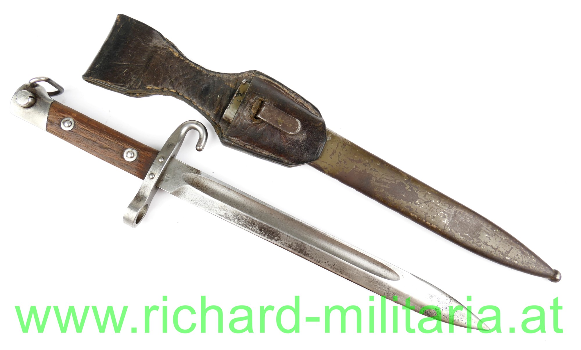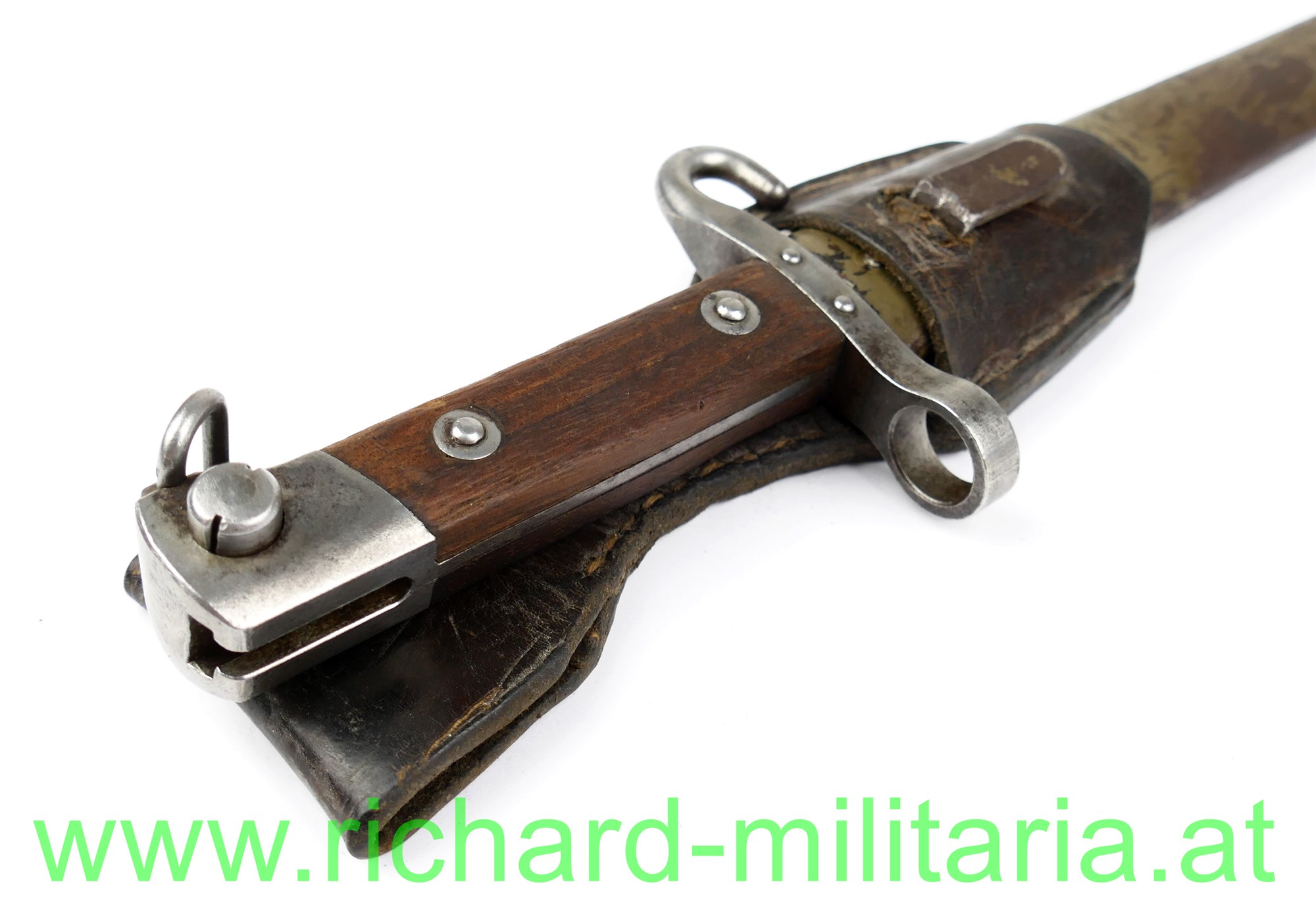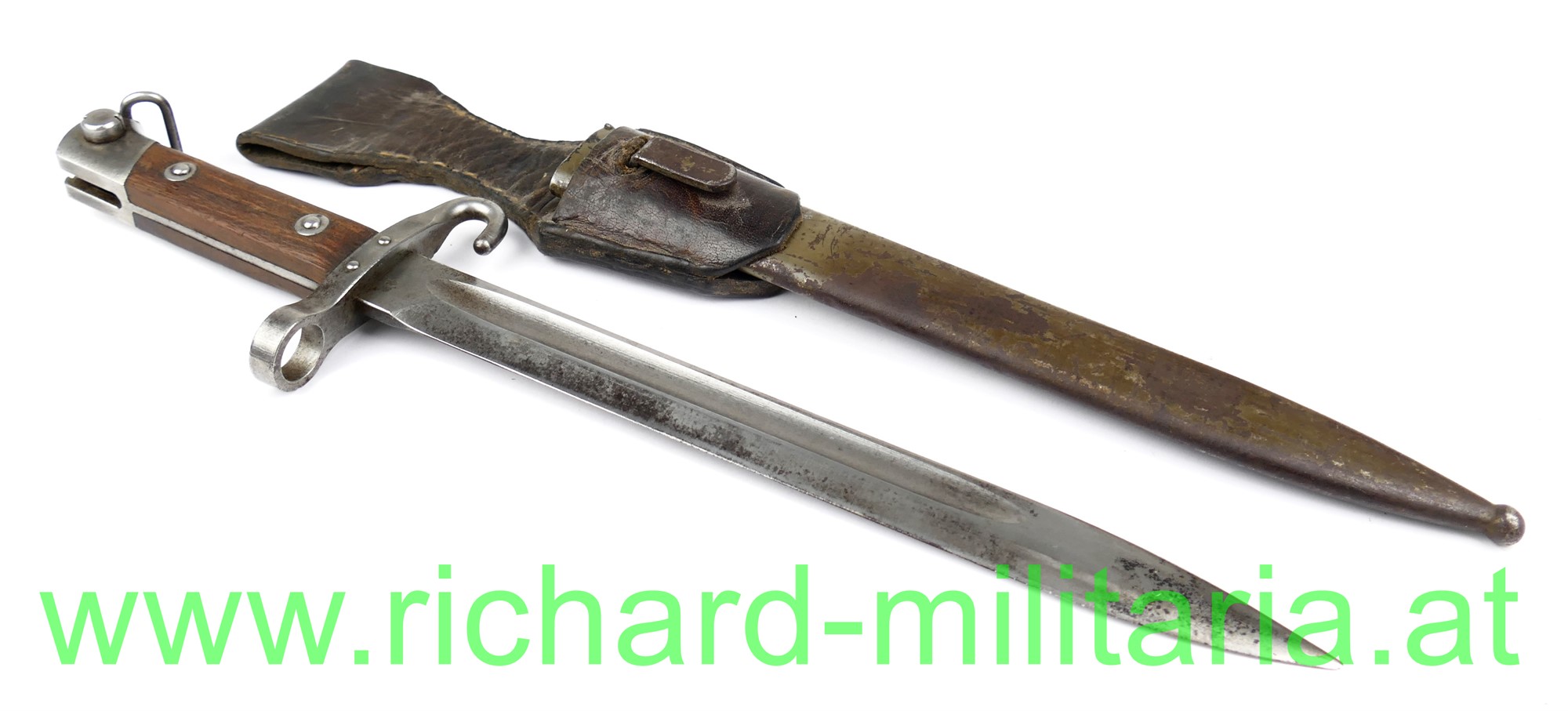 Messerbajonett M 1895 f. Unteroffiziere, mit Portepeebügel und -haken; Hersteller OeWG und k.u.k. Armeeabnahme auf der fleckigen Klinge, gereinigt - Gebrauchsspuren an der Spitze leicht beschliffen; original 2-fach vernietete Holzgriffschalen; massiver Portepeehaken; originale Scheide mit Hersteller OeWG und k.u.k. Armeeabnahme; Scheide grün lackiert - mit viel originaler Restfarbe - flugrostig, kleine nicht störende Delle; Lederkoppelschuh aus braunem Leder (tschechisch?);