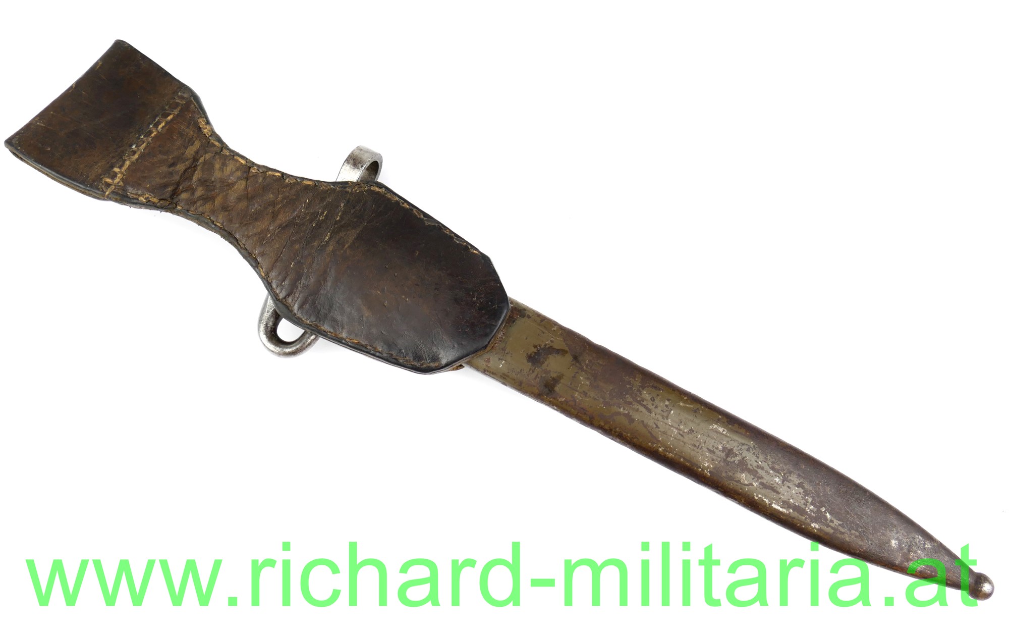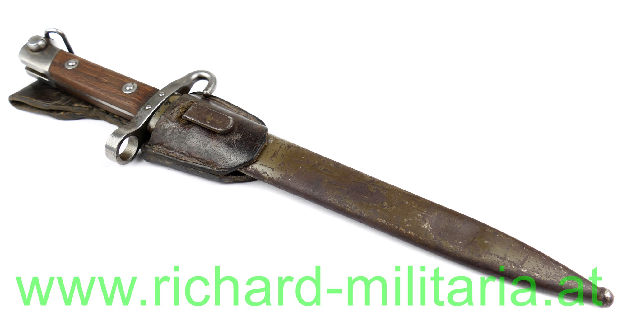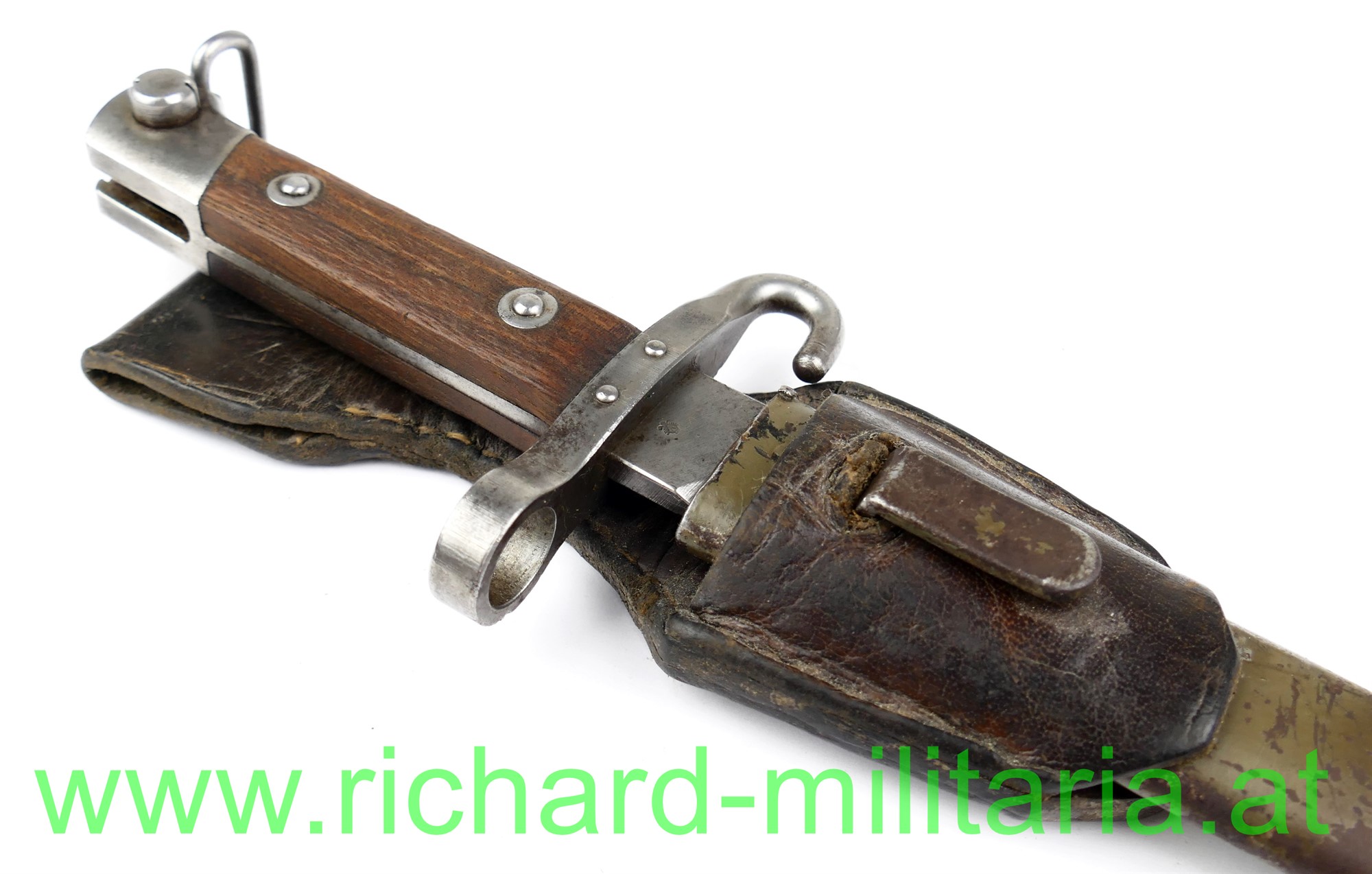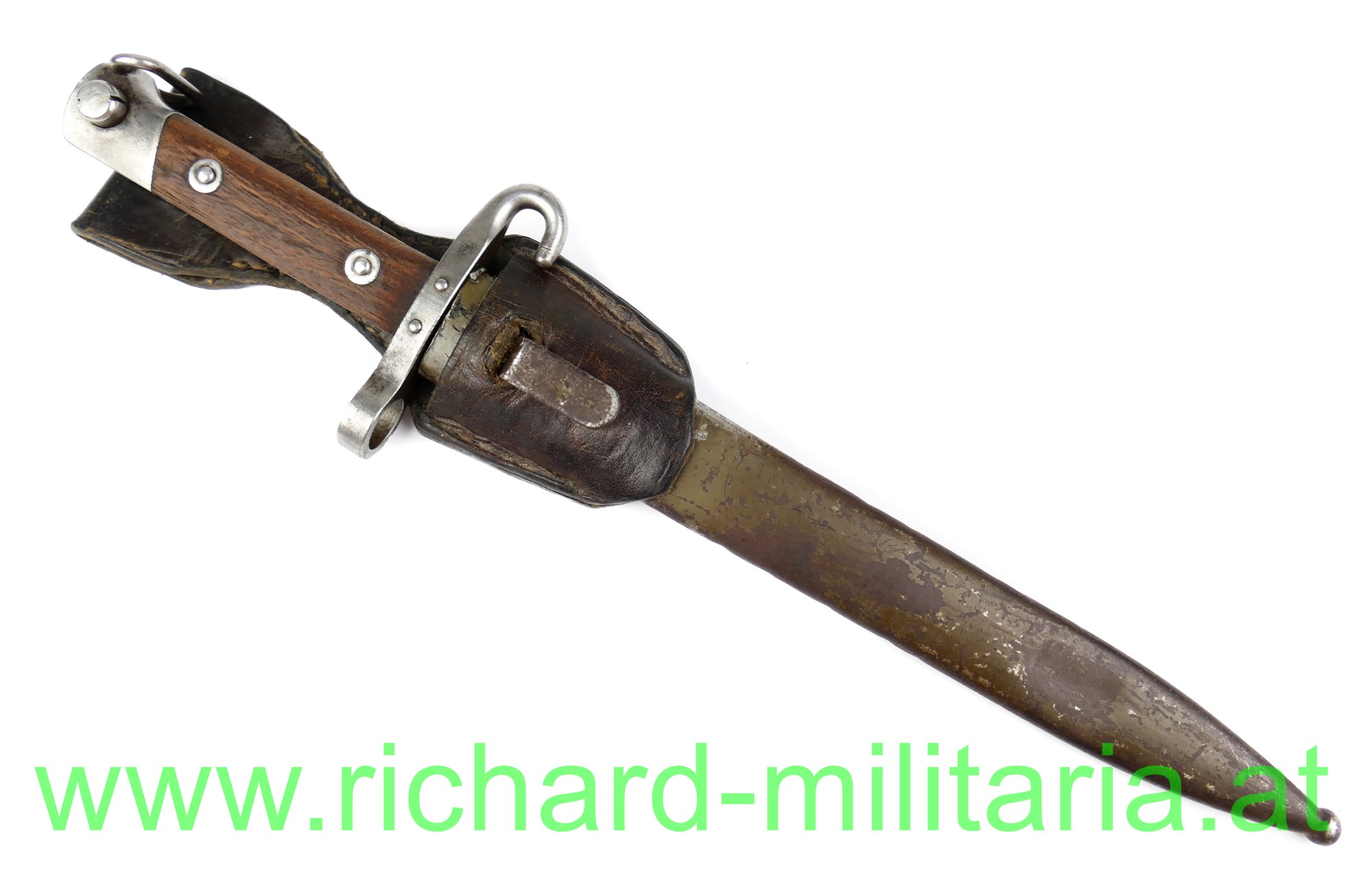 Messerbajonett M 1895 f. Unteroffiziere, mit Portepeebügel und -haken; Hersteller OeWG und k.u.k. Armeeabnahme auf der fleckigen Klinge, gereinigt - Gebrauchsspuren an der Spitze leicht beschliffen; original 2-fach vernietete Holzgriffschalen; massiver Portepeehaken; originale Scheide mit Hersteller OeWG und k.u.k. Armeeabnahme; Scheide grün lackiert - mit viel originaler Restfarbe - flugrostig, kleine nicht störende Delle; Lederkoppelschuh aus braunem Leder (tschechisch?);