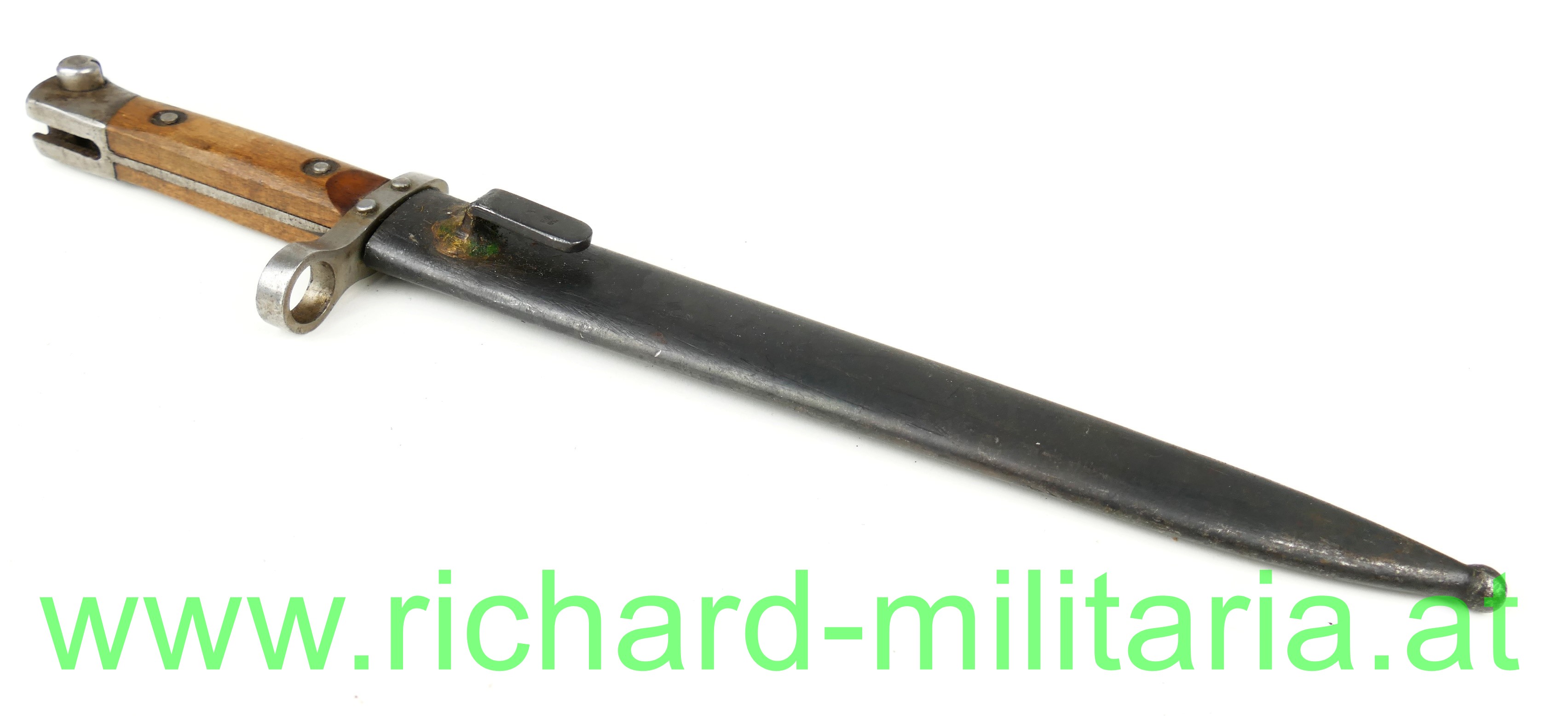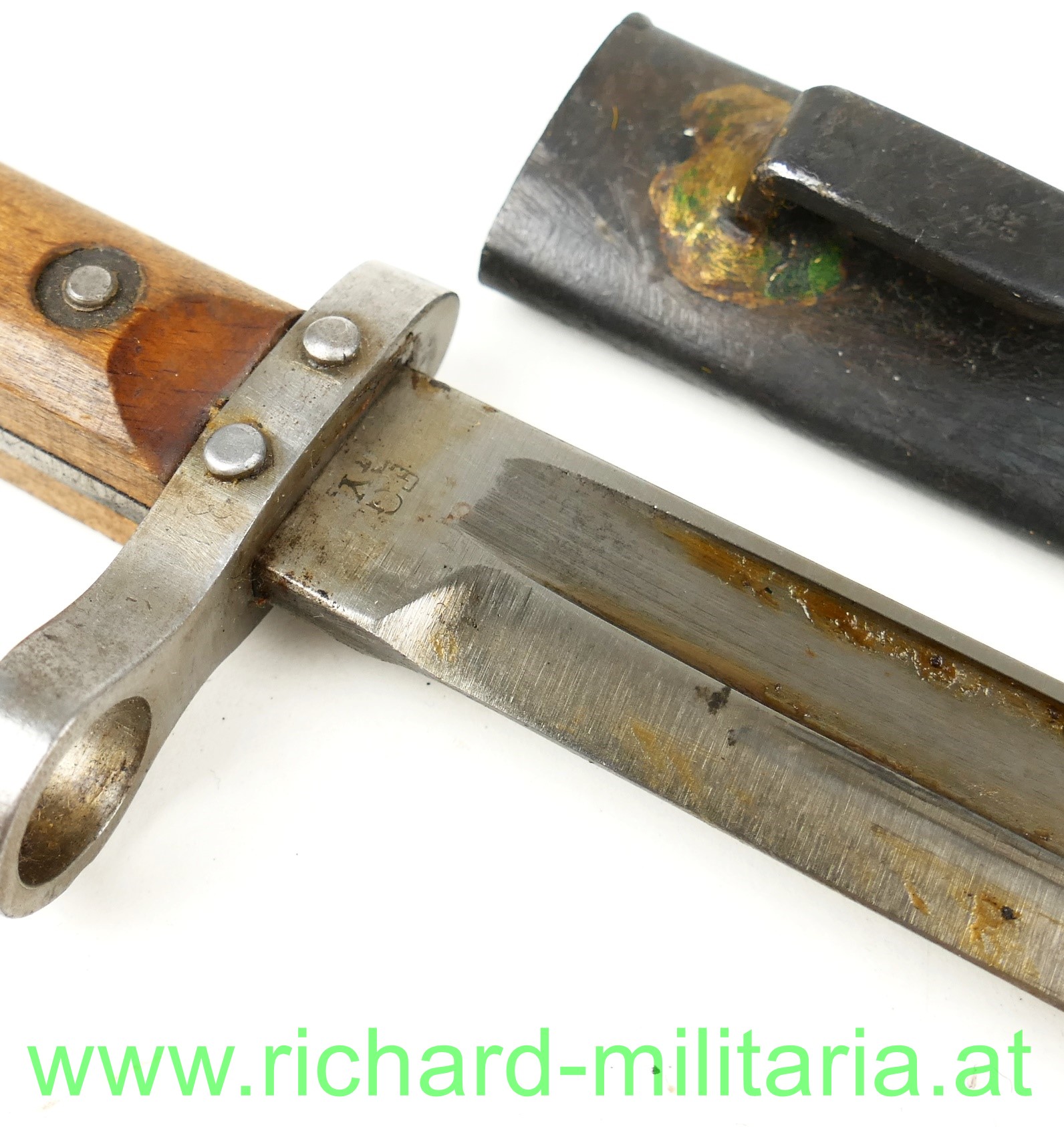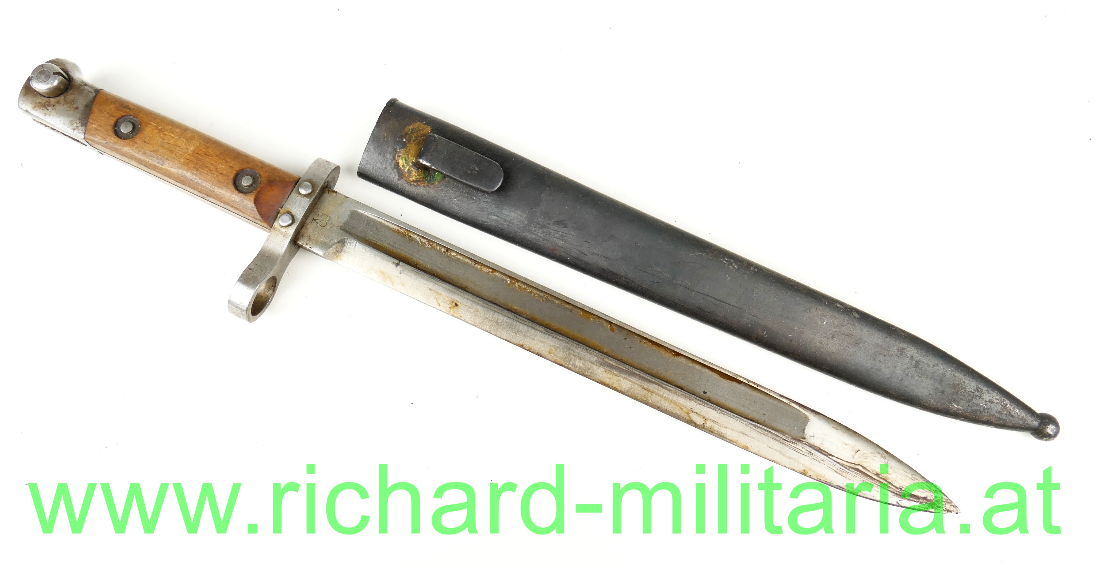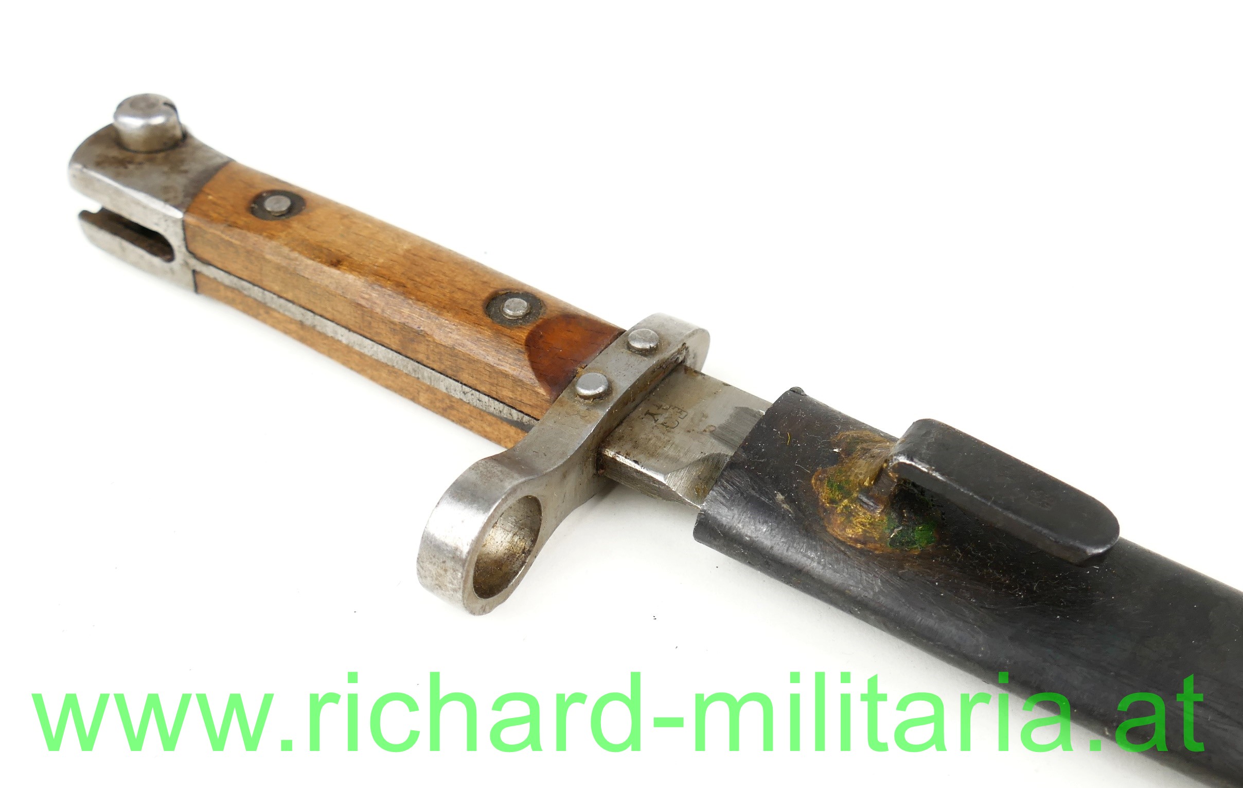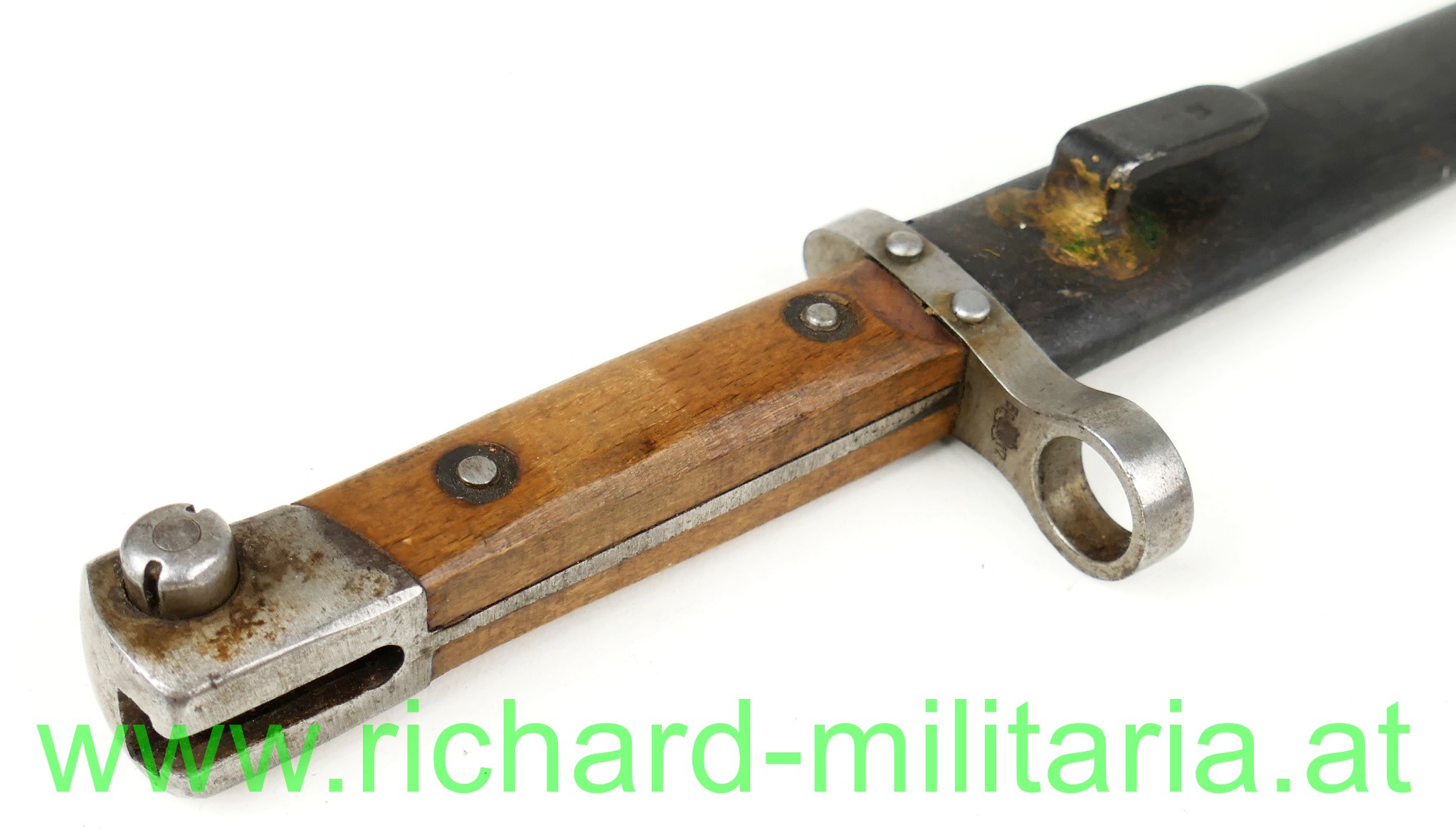 Österreich Messerbajonett M95; Mannschaftsausführung, zweifach vernietete Holzgriffschalen; blanke ungereinigte Klinge (altes Fett) mit Hersteller F.G.G.Y. und k.u.k. Armeeabnahme, unter dem Laufführungsring interessante Abnahme: "Doppelwappen Bp 17" (Budapester Waffenprobe-Amt), geschwärzte Stahlscheide ohne Dellen mit Hersteller: "F.G.G.Y. und unleserlichem Abnahmestempel - Tragehaken zeitgenössisch nachgelötet;