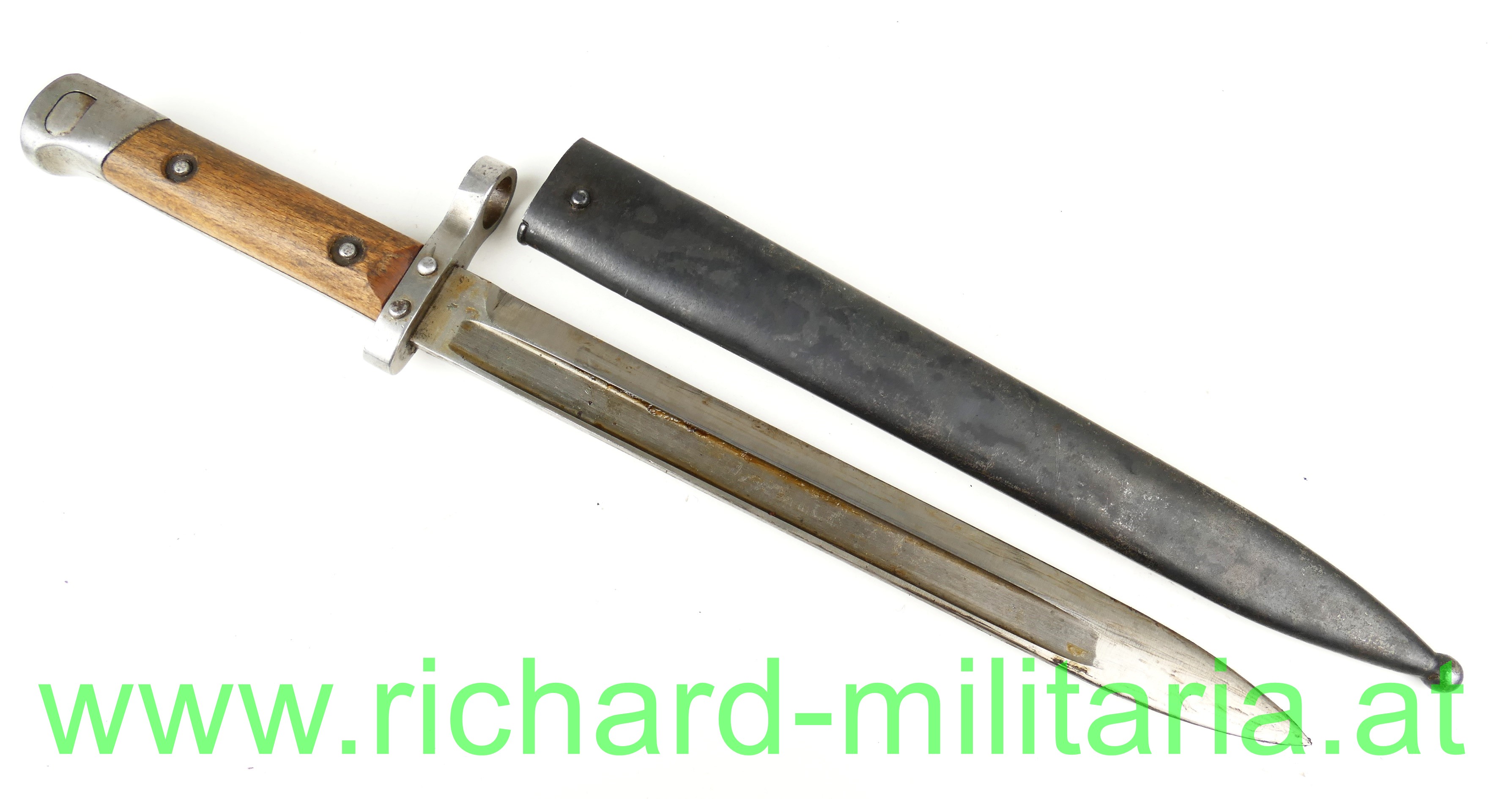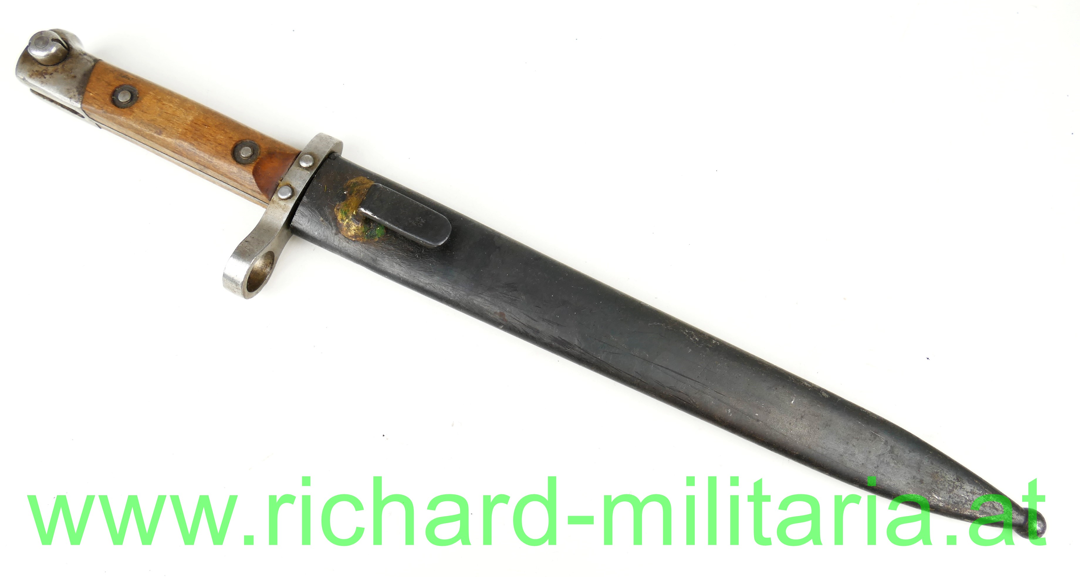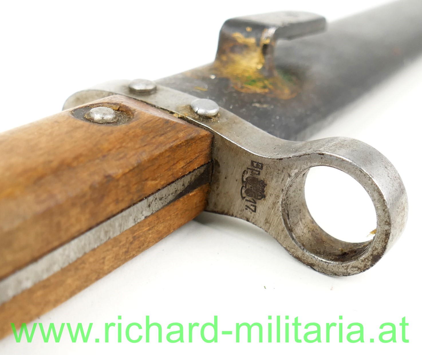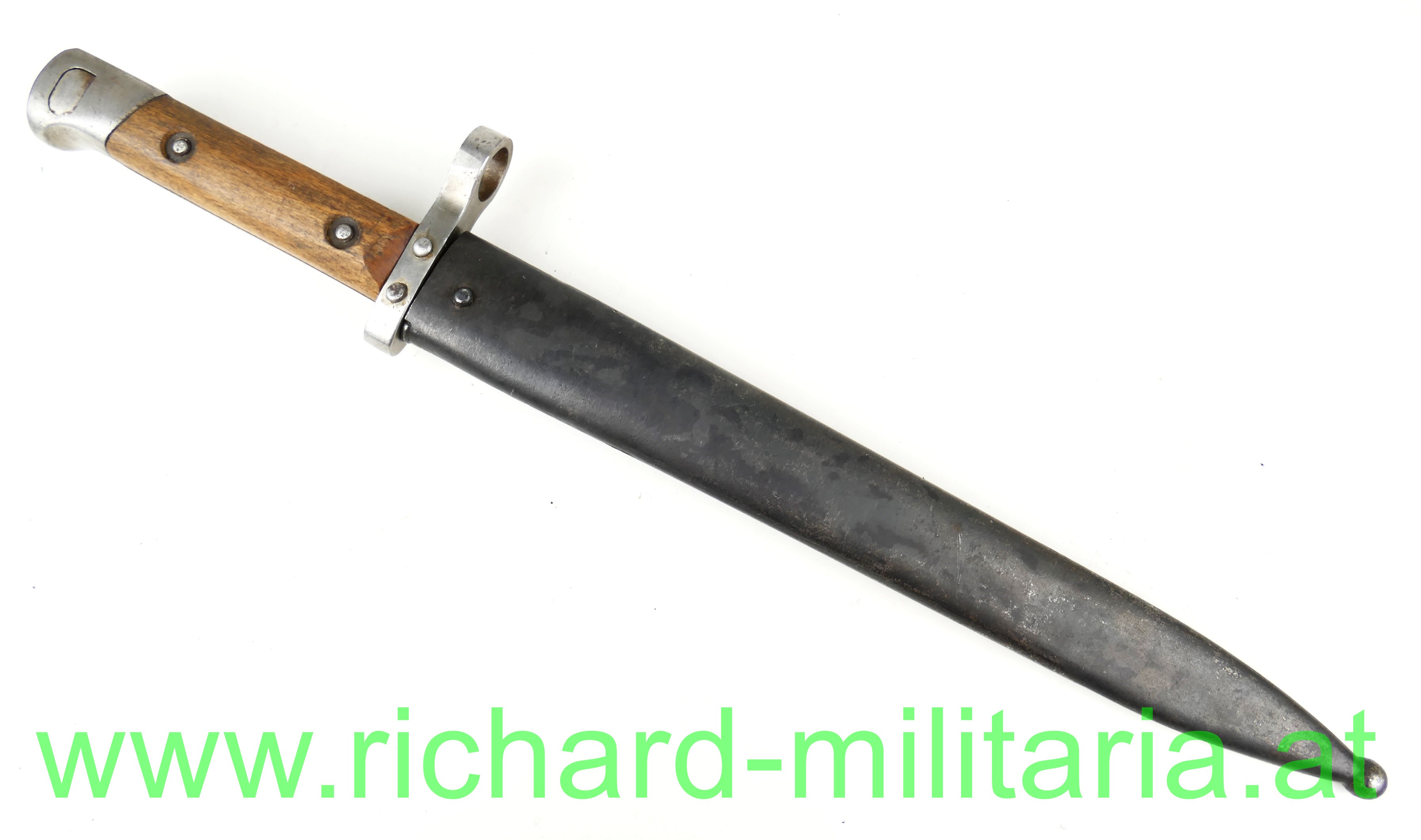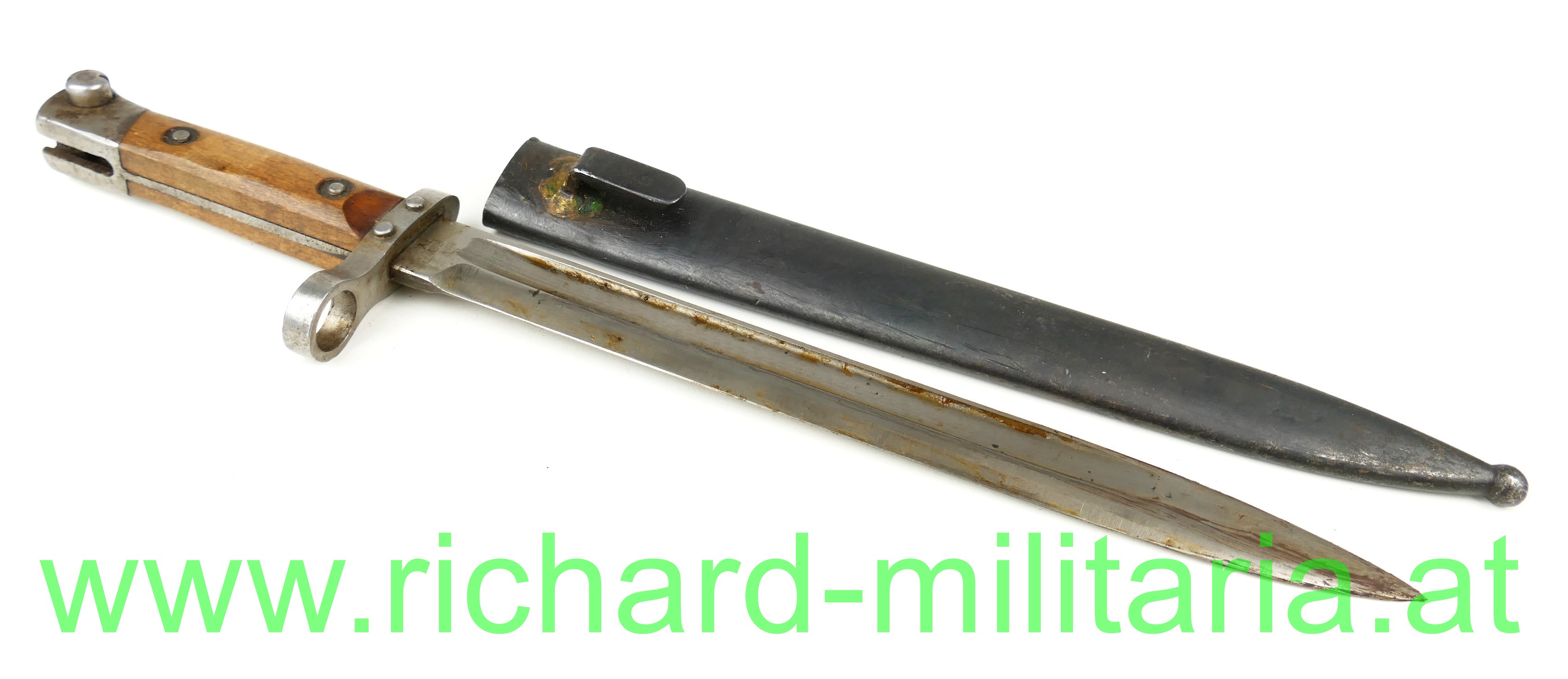 Österreich Messerbajonett M95; Mannschaftsausführung, zweifach vernietete Holzgriffschalen; blanke ungereinigte Klinge (altes Fett) mit Hersteller F.G.G.Y. und k.u.k. Armeeabnahme, unter dem Laufführungsring interessante Abnahme: "Doppelwappen Bp 17" (Budapester Waffenprobe-Amt), geschwärzte Stahlscheide ohne Dellen mit Hersteller: "F.G.G.Y. und unleserlichem Abnahmestempel - Tragehaken zeitgenössisch nachgelötet;
