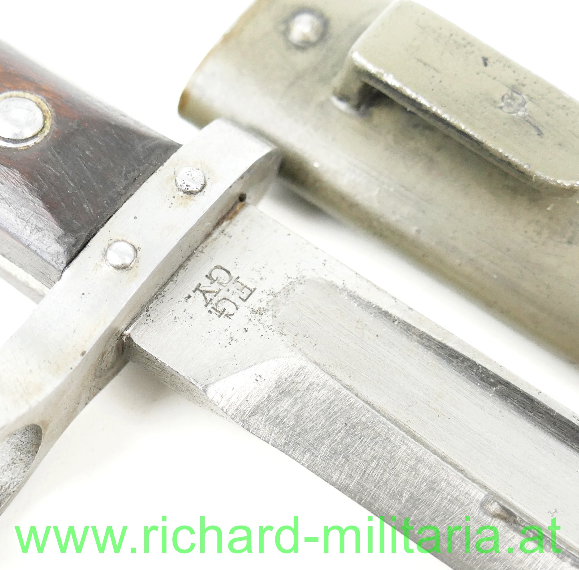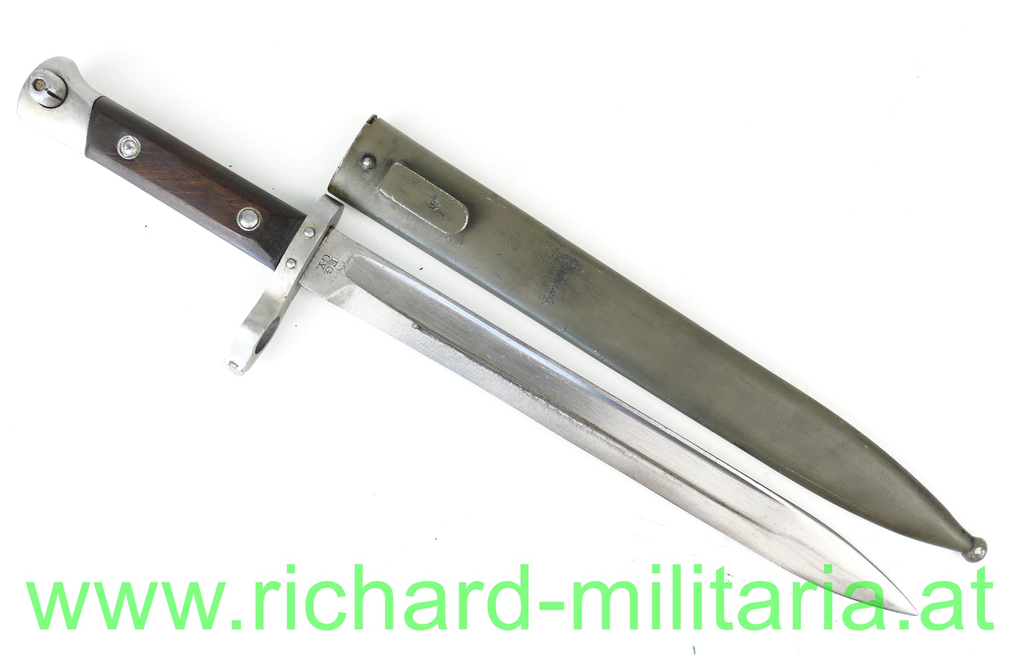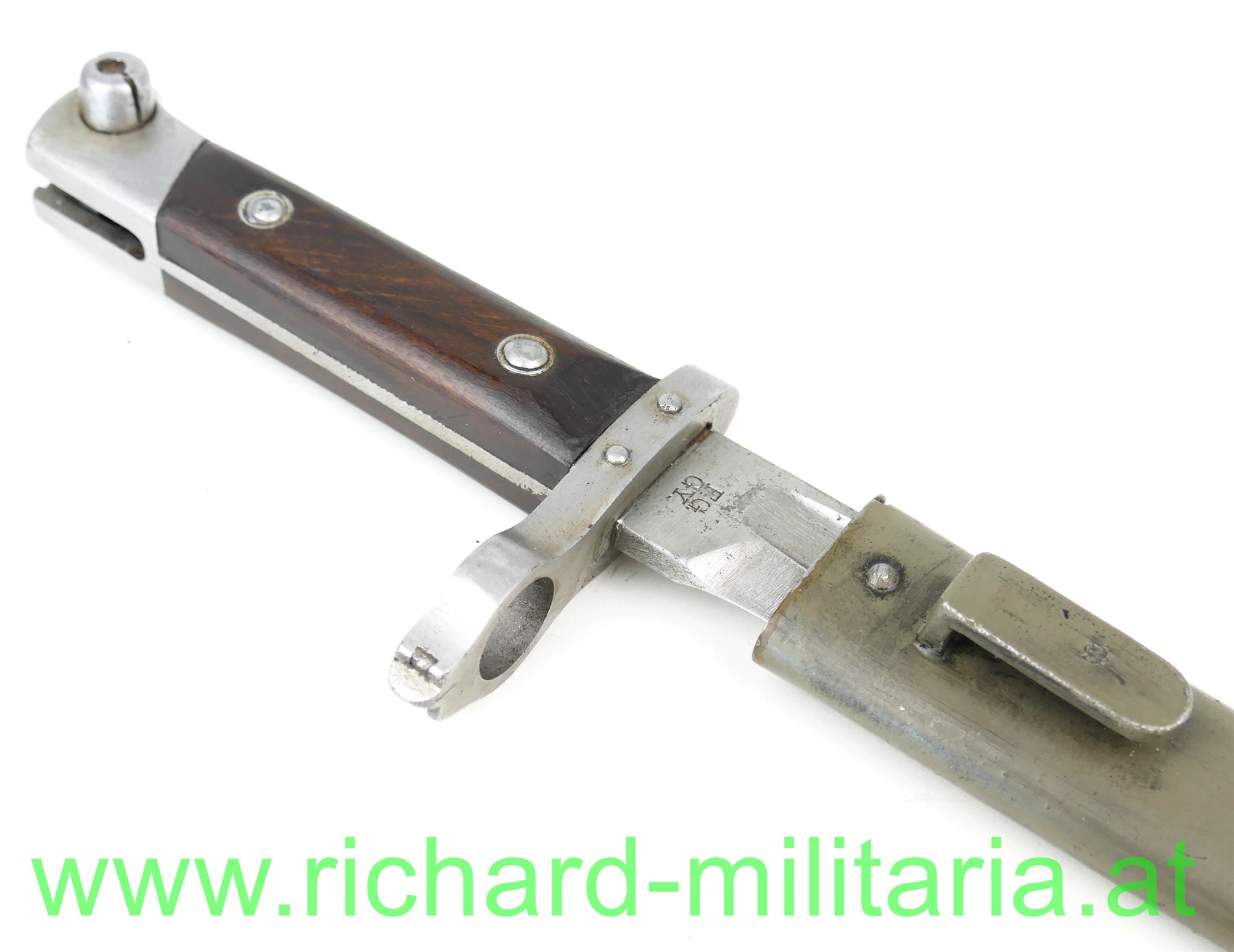 Messerbajonett M1895 für Mannschaften mit Visierkorn, Hersteller FGGY und Armeeabnahme auf der Klinge, grau/grün lackierte Scheide ohne Hersteller aber mit Armeeabnahme aus Österreich der 1. Republik; am Knauf mit Truppenstempel: "56.", Holzgriffschalen sitzen fest - Nieten etwas verschlagen;