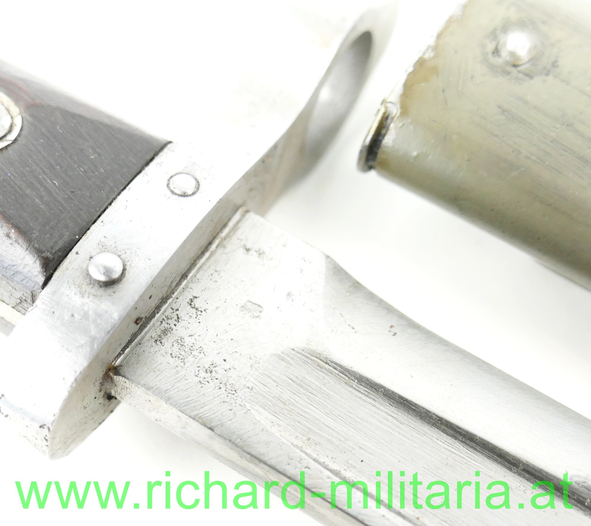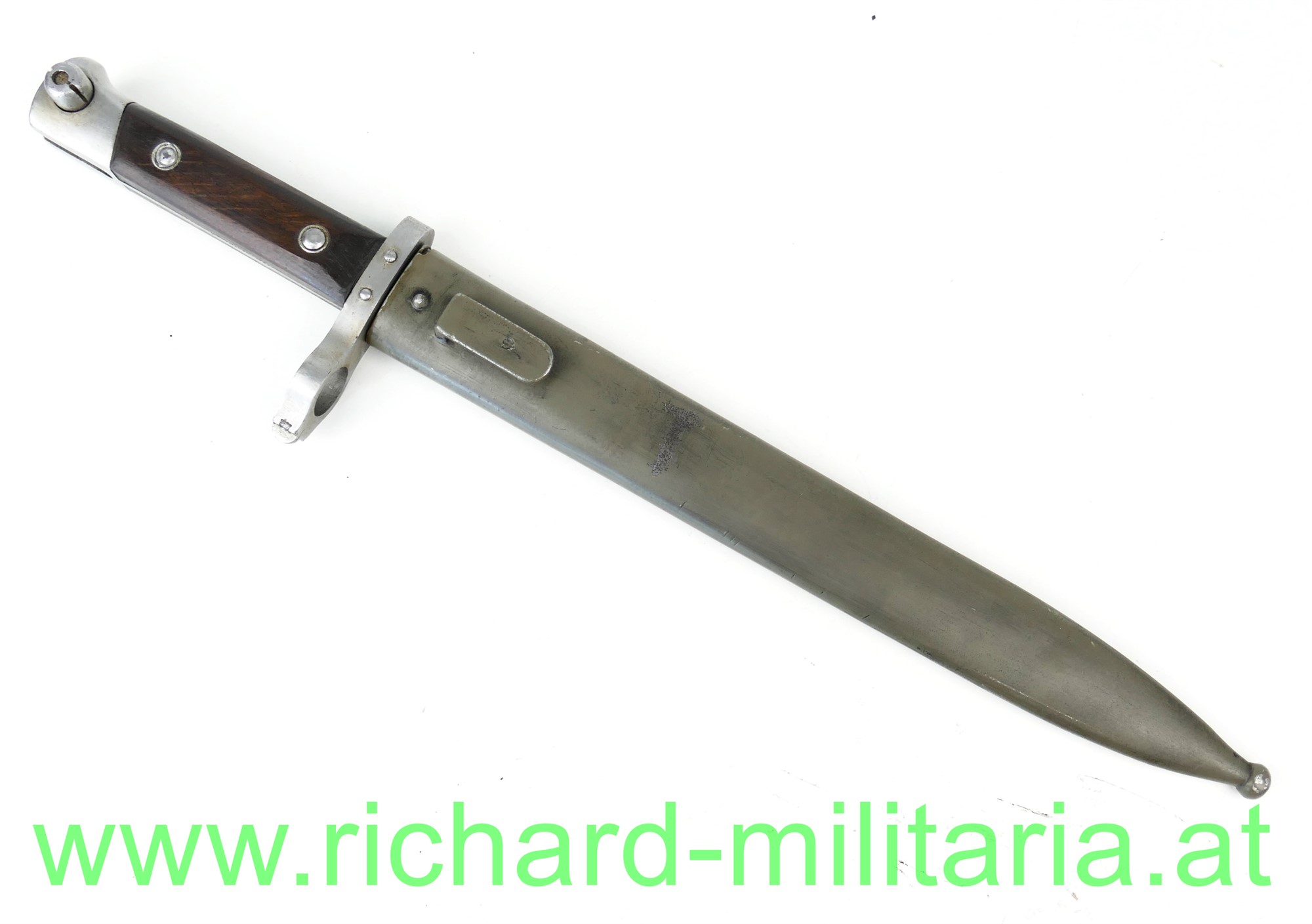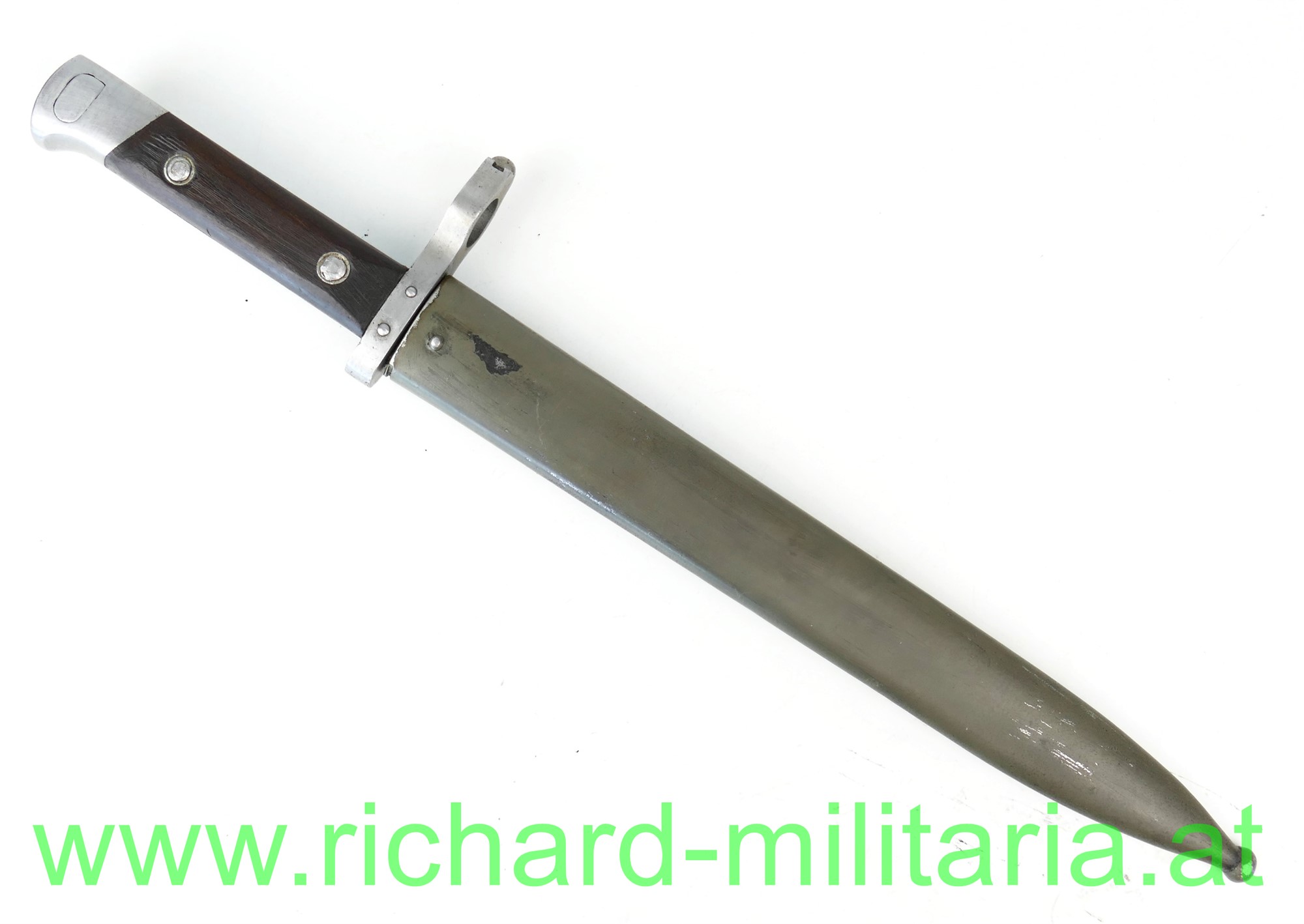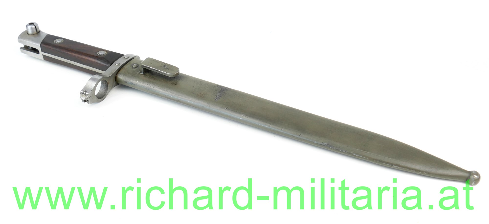 Messerbajonett M1895 für Mannschaften mit Visierkorn, Hersteller FGGY und Armeeabnahme auf der Klinge, grau/grün lackierte Scheide ohne Hersteller aber mit Armeeabnahme aus Österreich der 1. Republik; am Knauf mit Truppenstempel: "56.", Holzgriffschalen sitzen fest - Nieten etwas verschlagen;