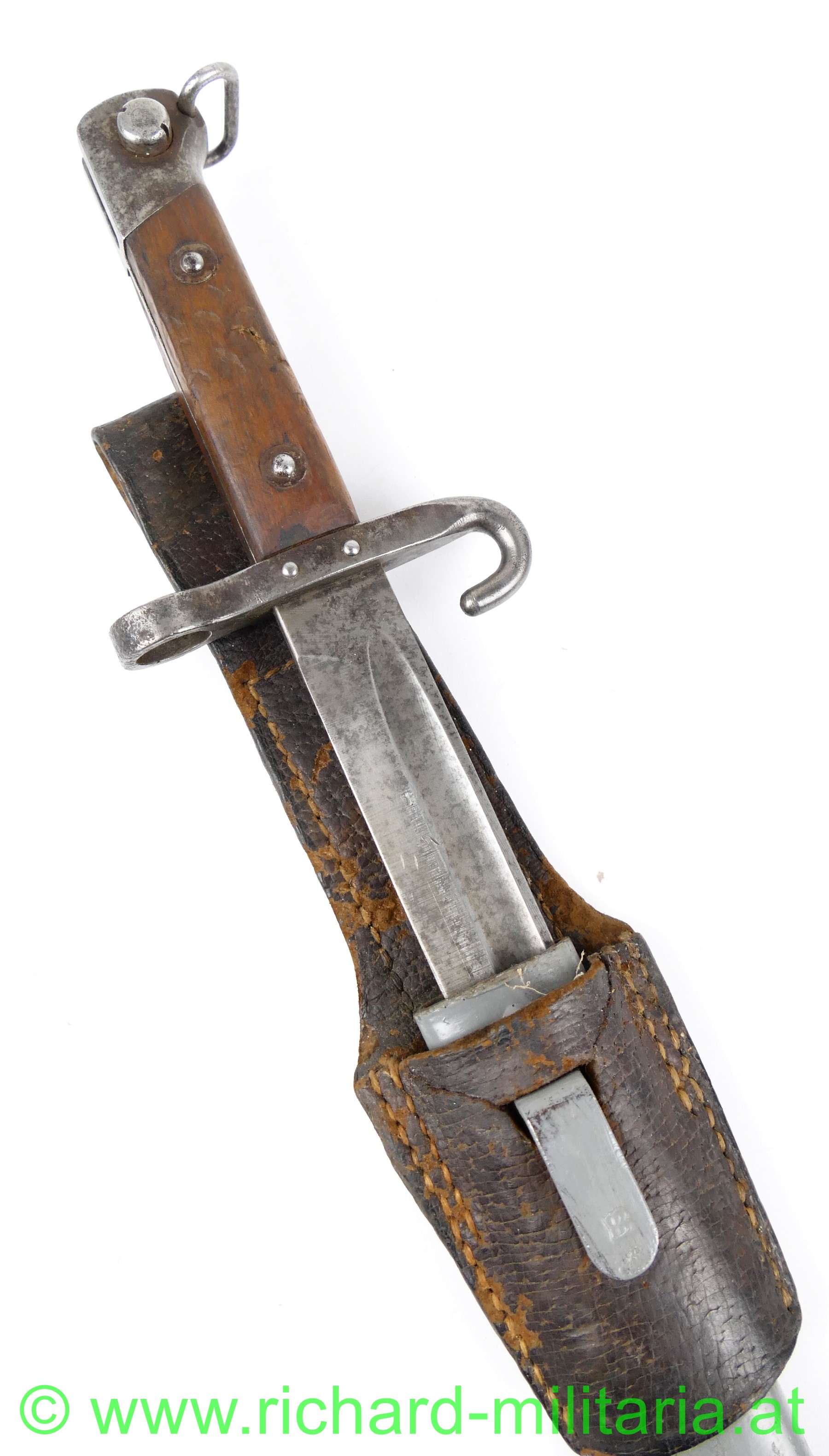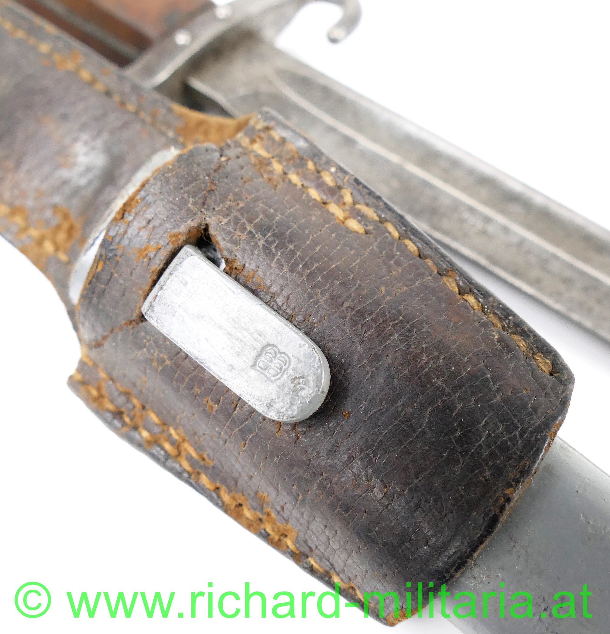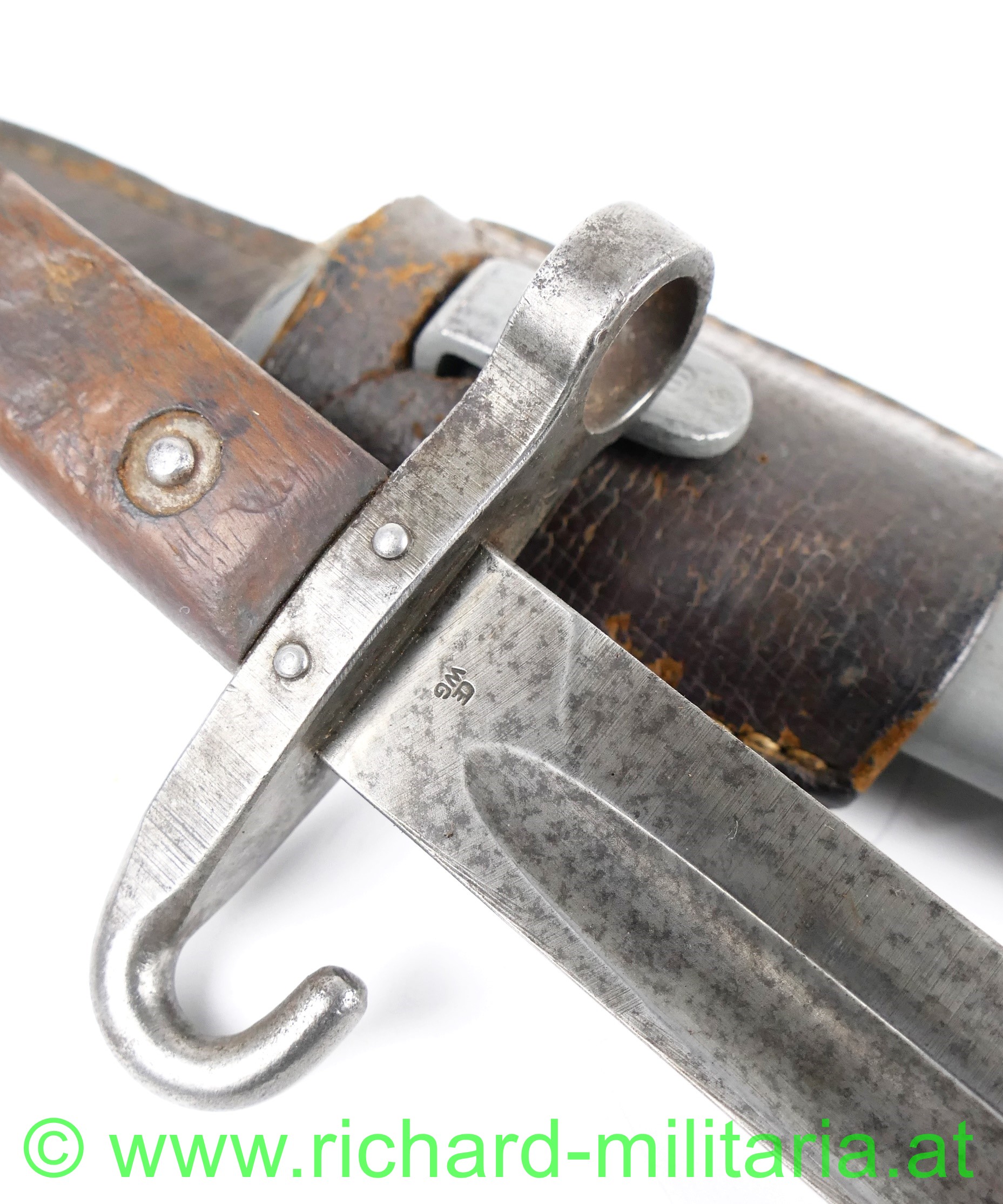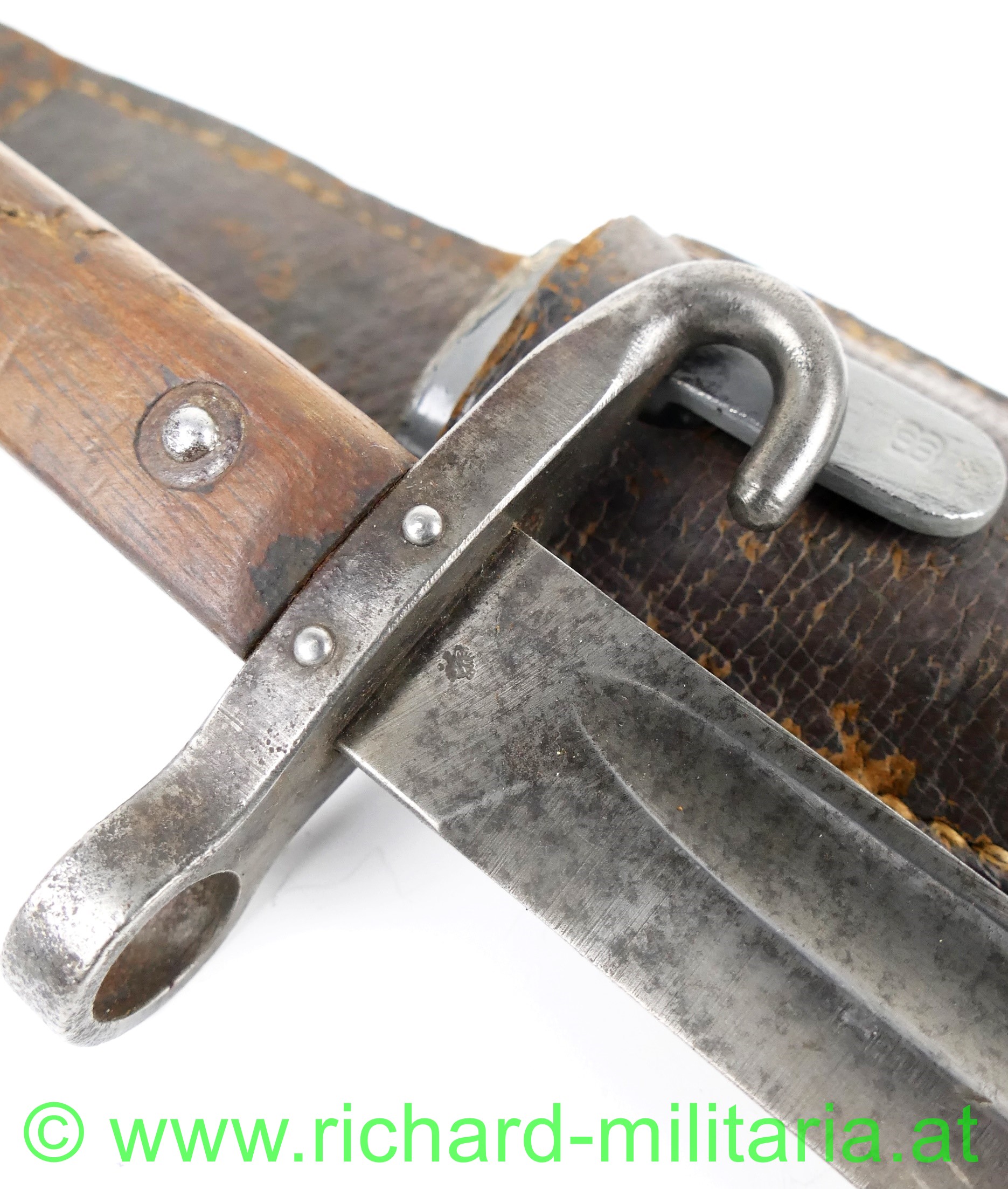 Messerbajonett M1895 für Unteroffiziere; mit Portepeebügel und -haken; Hersteller OeWG und k.u.k. Armeeabnahme auf der fleckigen Klinge - nicht beschliffen; original vernietete Holzgriffschalen - beide Griffschalen mit Schlagspuren; keine Truppen- oder Waffennummerstempelung; massiver dicker Portepeehaken; originale Scheide mit Hersteller BB (wahrscheinlich Brüder Bartlová); Scheide grau überlackiert; originaler Lederkoppelschuh aus grobem Schweineleder; getragener Zustand