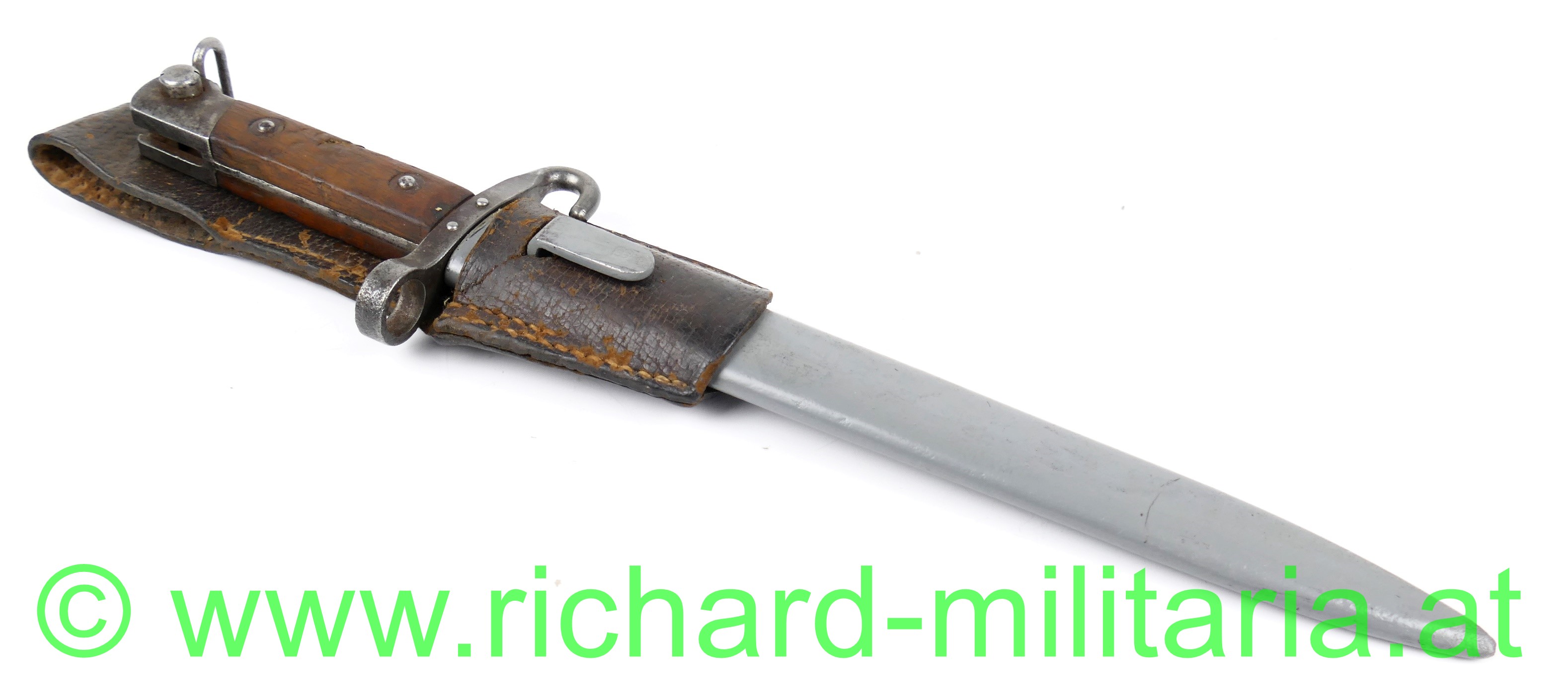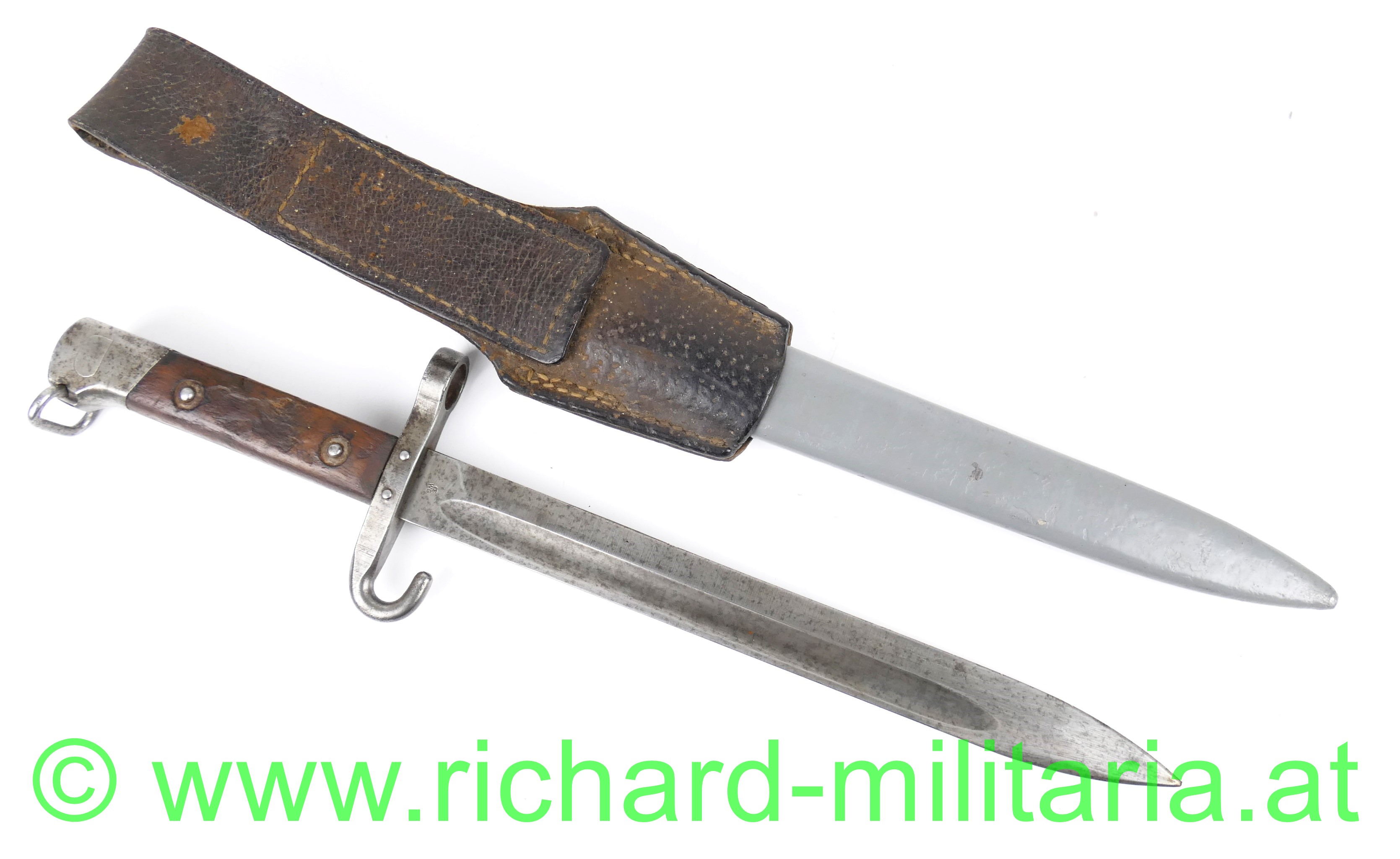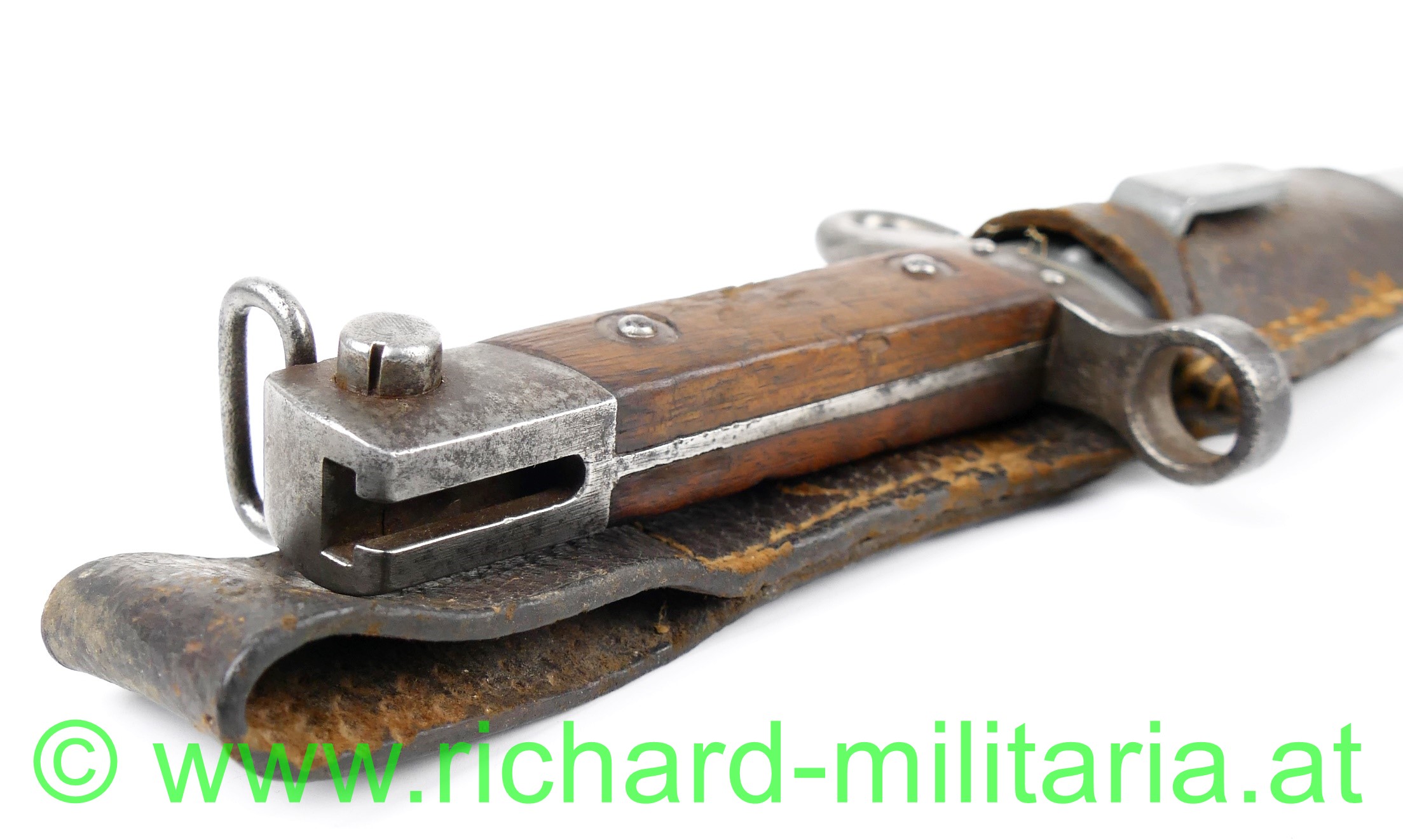 Messerbajonett M1895 für Unteroffiziere; mit Portepeebügel und -haken; Hersteller OeWG und k.u.k. Armeeabnahme auf der fleckigen Klinge - nicht beschliffen; original vernietete Holzgriffschalen - beide Griffschalen mit Schlagspuren; keine Truppen- oder Waffennummerstempelung; massiver dicker Portepeehaken; originale Scheide mit Hersteller BB (wahrscheinlich Brüder Bartlová); Scheide grau überlackiert; originaler Lederkoppelschuh aus grobem Schweineleder; getragener Zustand