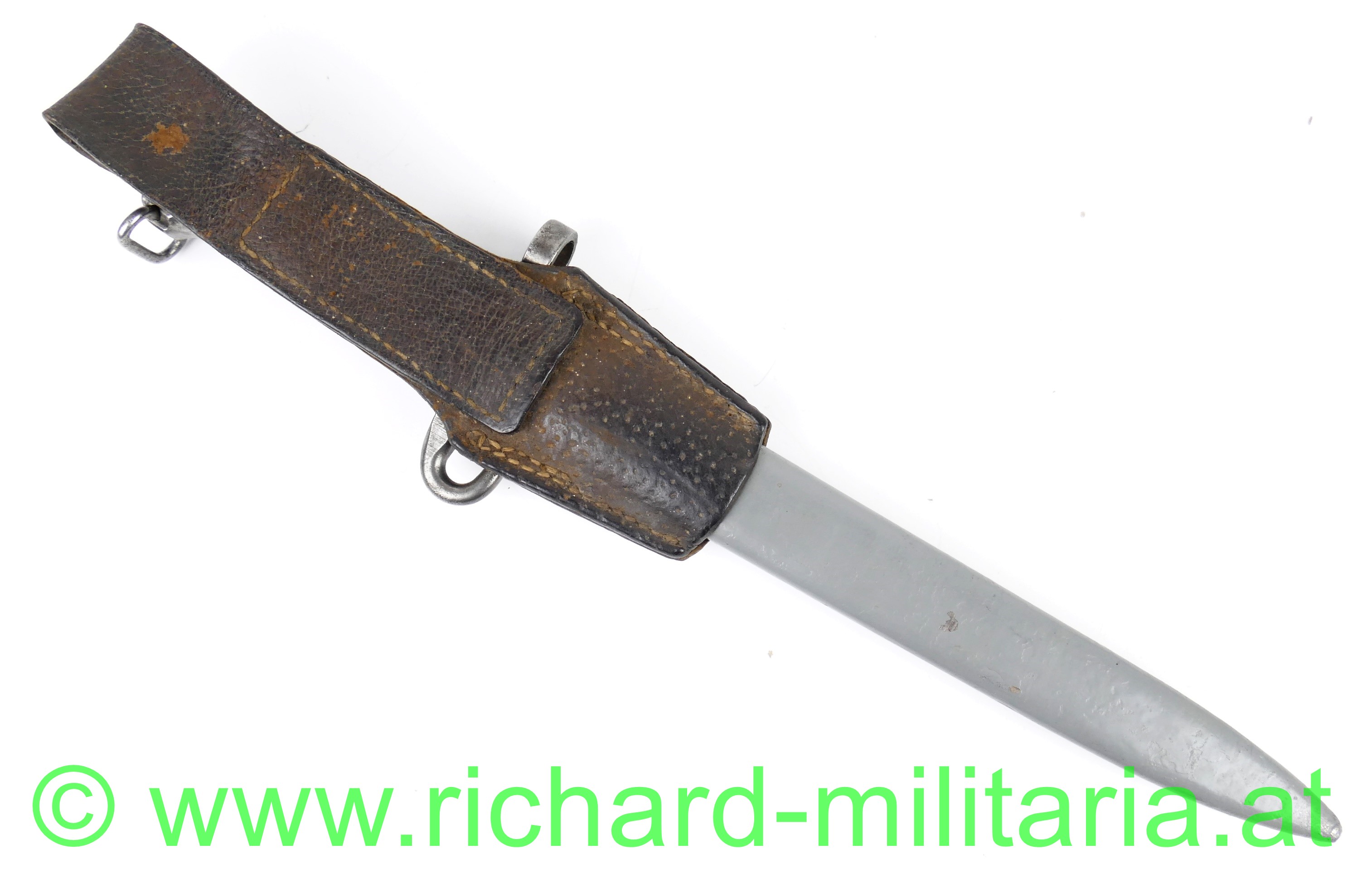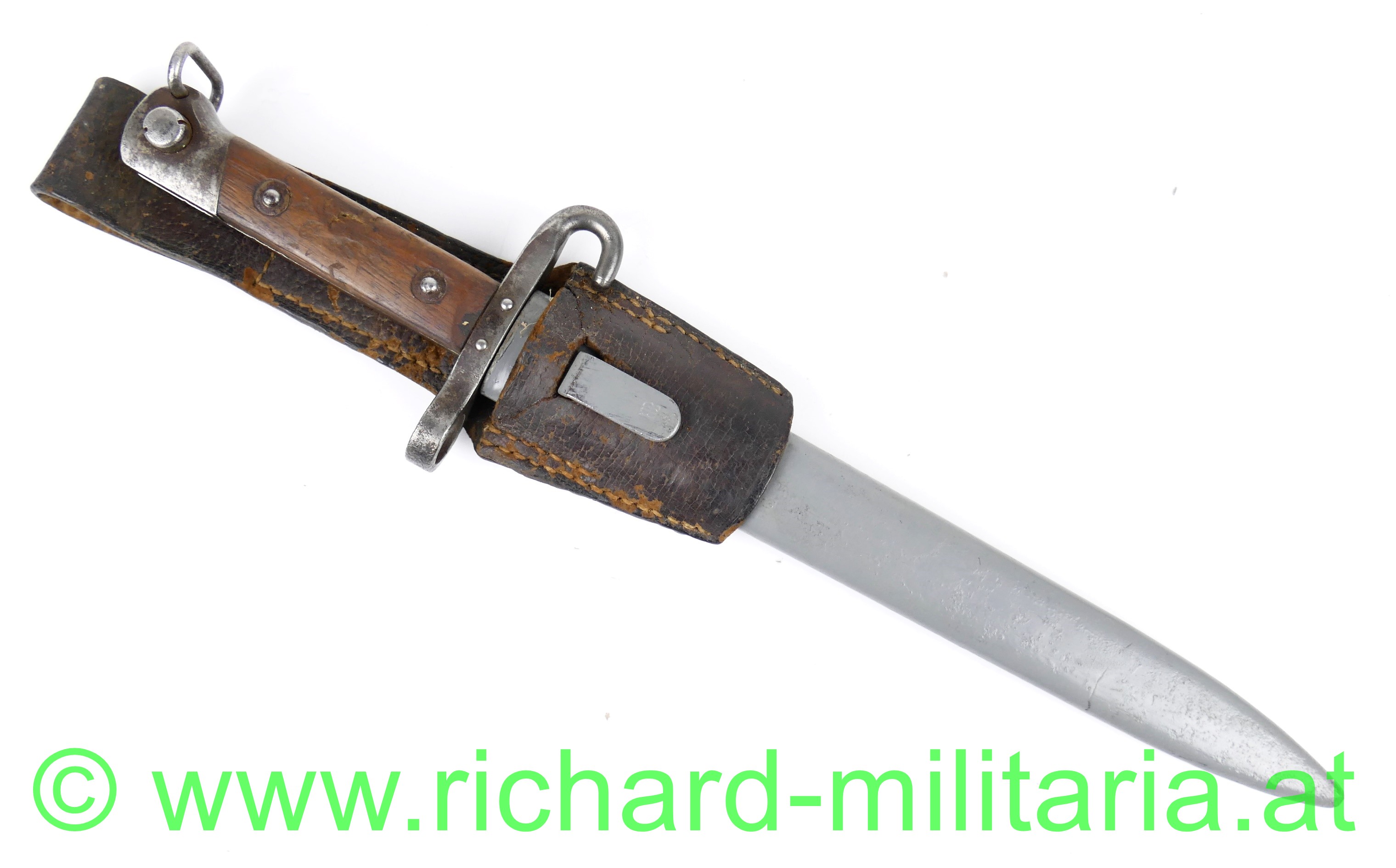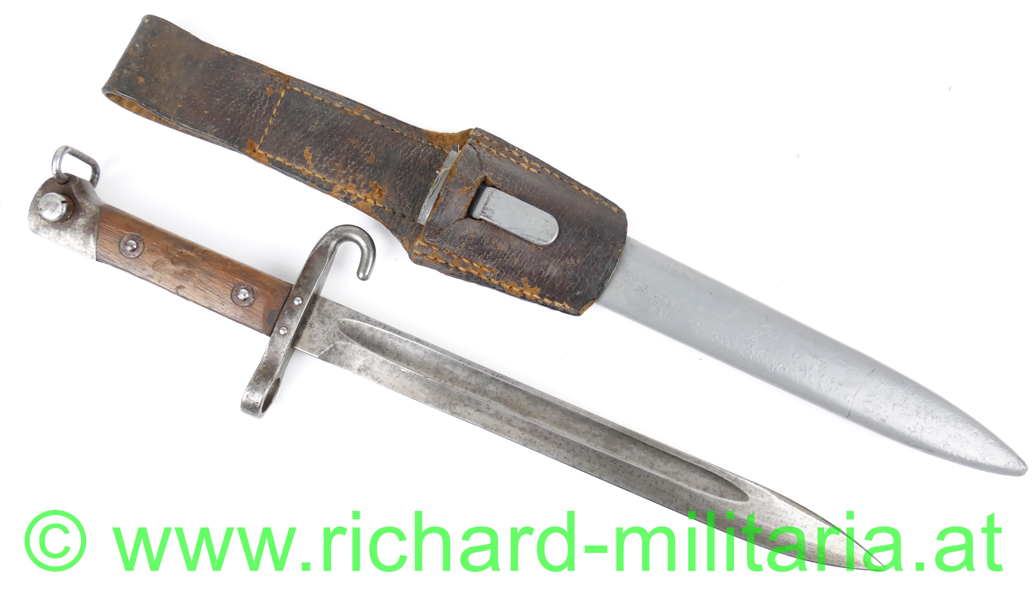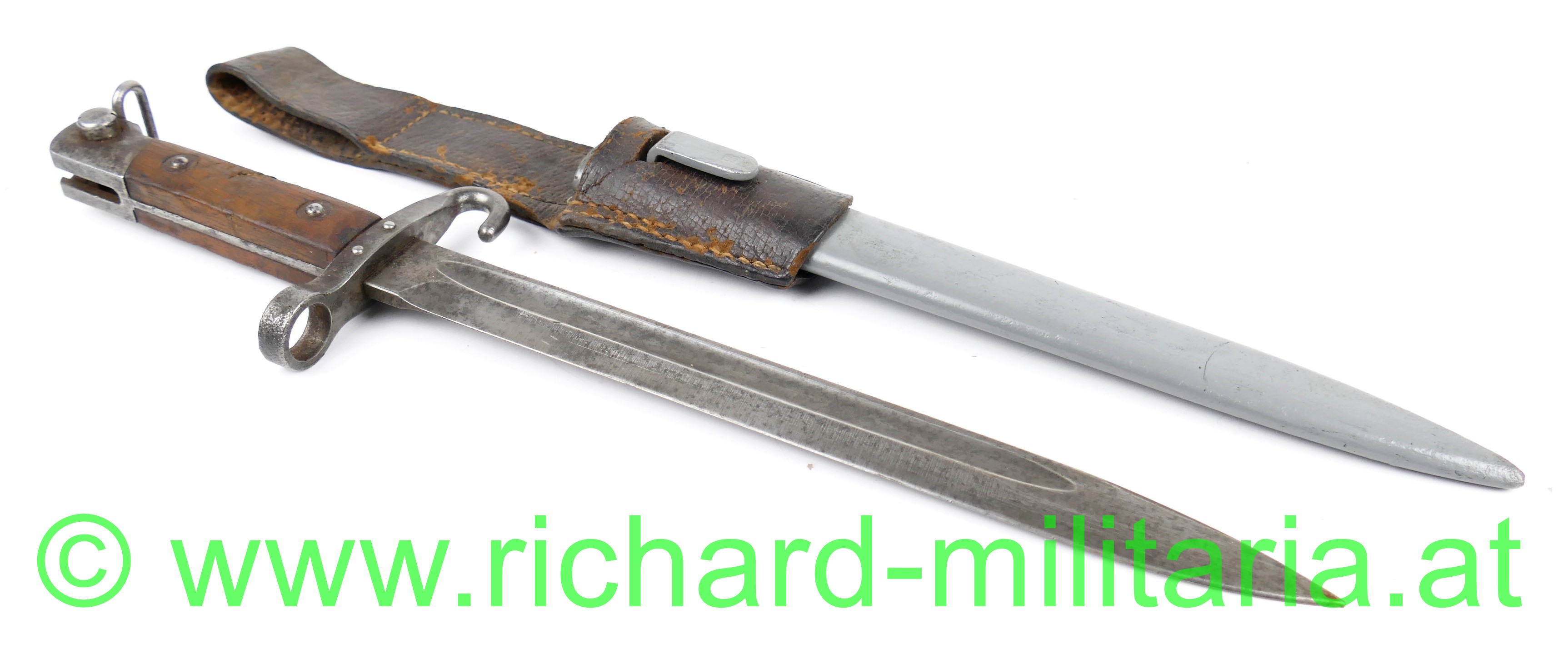 Messerbajonett M1895 für Unteroffiziere; mit Portepeebügel und -haken; Hersteller OeWG und k.u.k. Armeeabnahme auf der fleckigen Klinge - nicht beschliffen; original vernietete Holzgriffschalen - beide Griffschalen mit Schlagspuren; keine Truppen- oder Waffennummerstempelung; massiver dicker Portepeehaken; originale Scheide mit Hersteller BB (wahrscheinlich Brüder Bartlová); Scheide grau überlackiert; originaler Lederkoppelschuh aus grobem Schweineleder; getragener Zustand