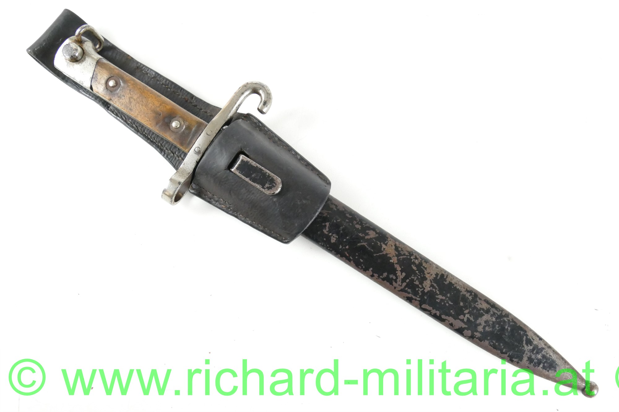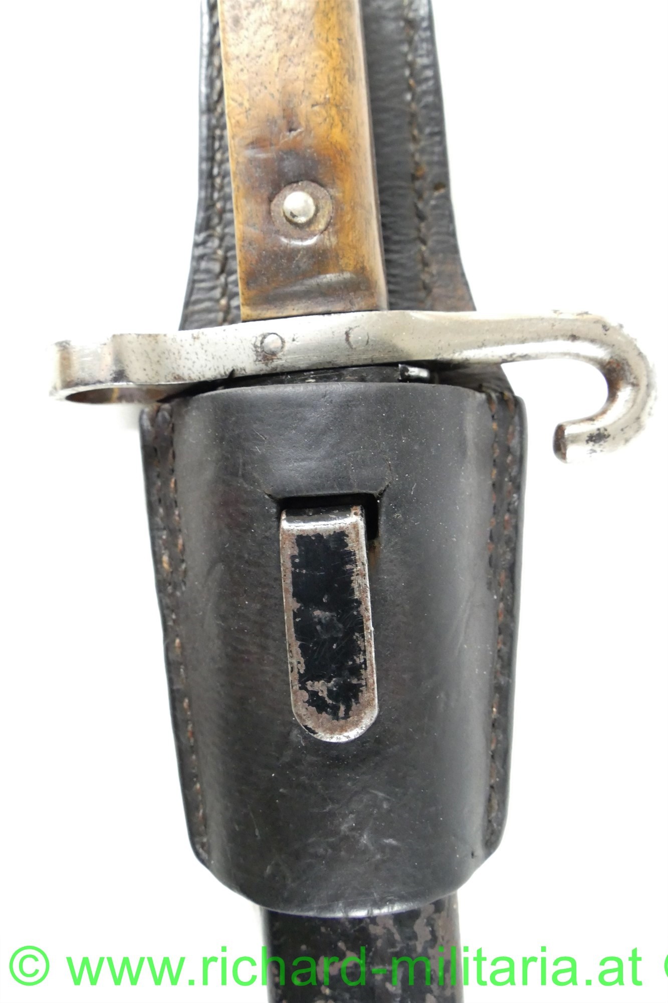 Messerbajonett M1895 für Offiziere oder Unteroffiziere mit Portepeebügel und -haken; Bajonett ohne Hersteller und Abnahme in vernickelter Ausführung; vor der Vernickelung glattgeschliffene Nieten für die Parierstange; schöne blanke Klinge; original schwarz lackierte Scheide mit k.u.k. Armeeabnahme und Hersteller OeWG; dunkelbrauner fast schwarzer Lederkoppelschuh