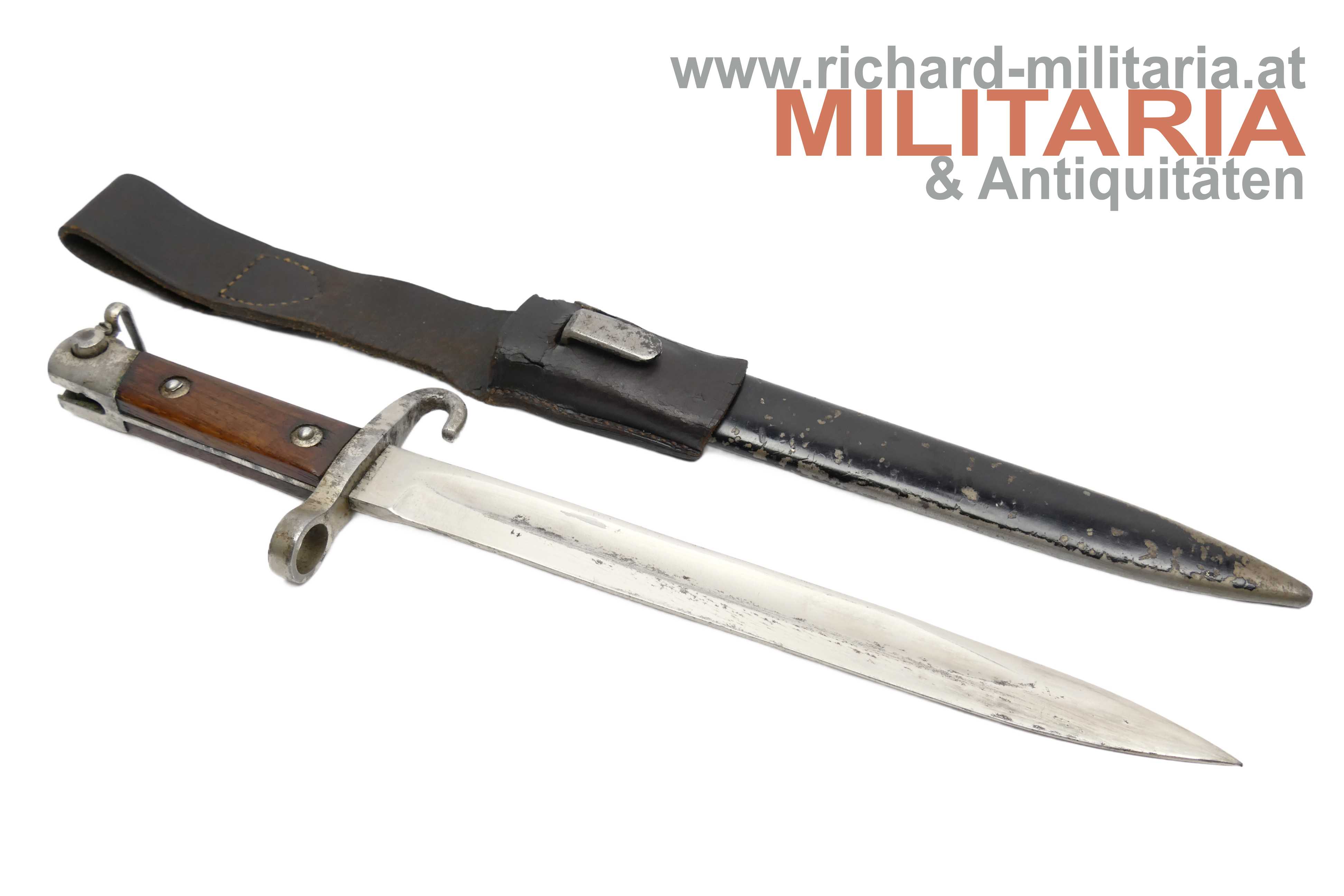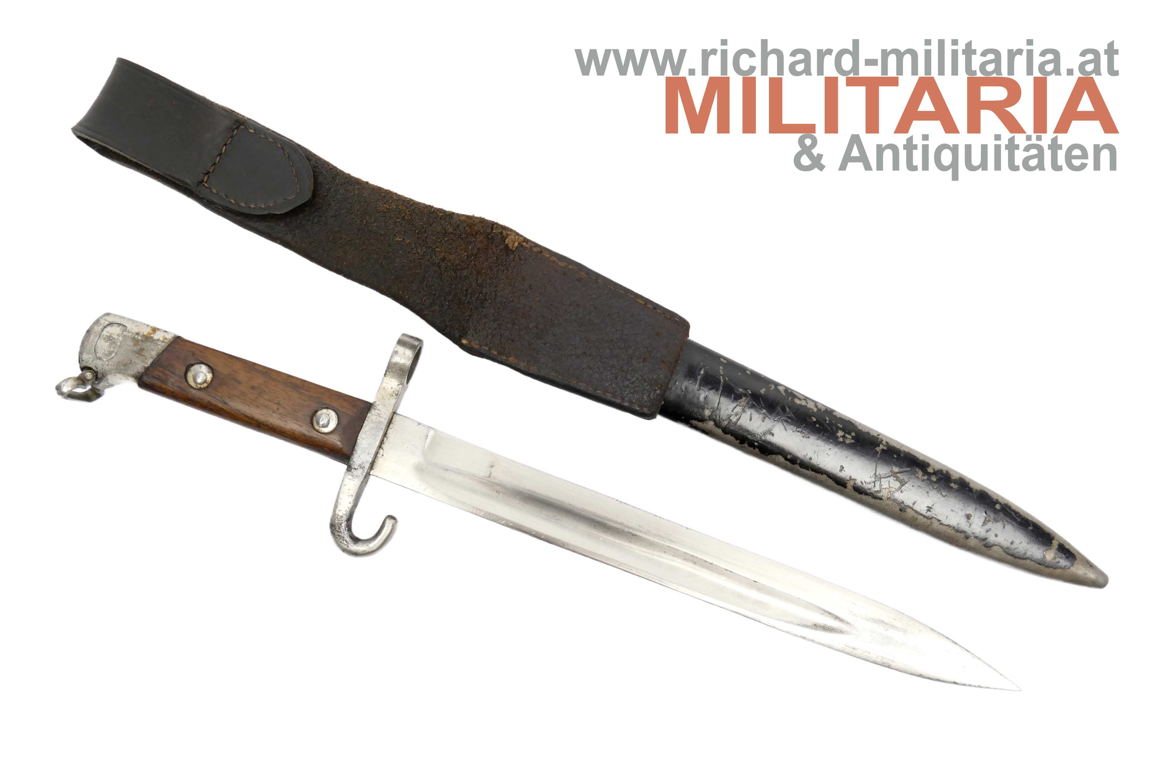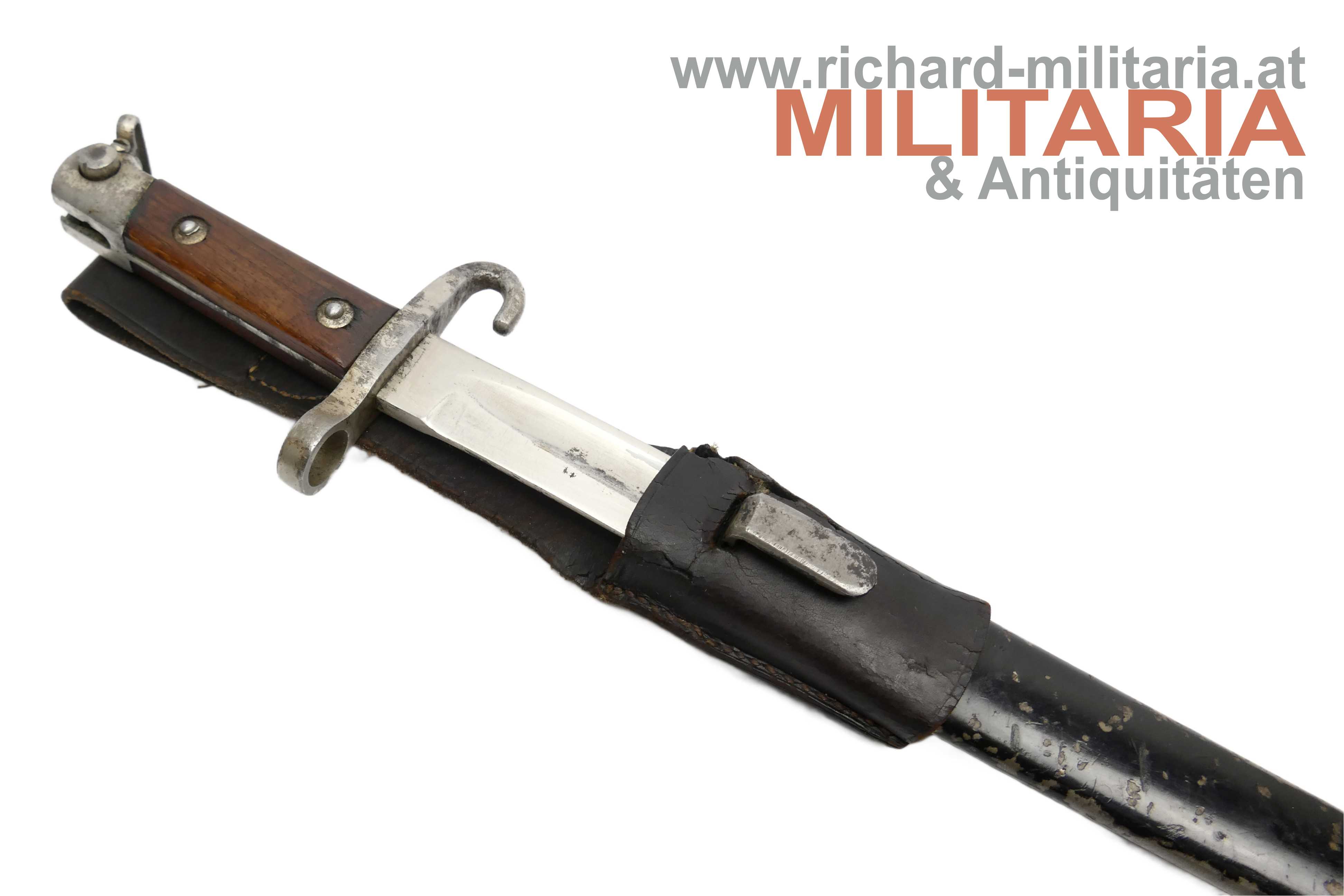 Messerbajonett M1895; Bajonett in vernickelter Ausführung für Unteroffiziere oder Offiziere; Eigentumstück; aufpflanzbar und mit Portepeebügel und -haken; ohne Hersteller und ohne Abnahme; schwarz lackierte Scheide - diese ebenfalls ohne Hersteller; mit dunkelbraunem Lederkoppelschuh - dieser frontseitig beschädigt; Vernickelung teilweise vergangen bzw. gereinigt;