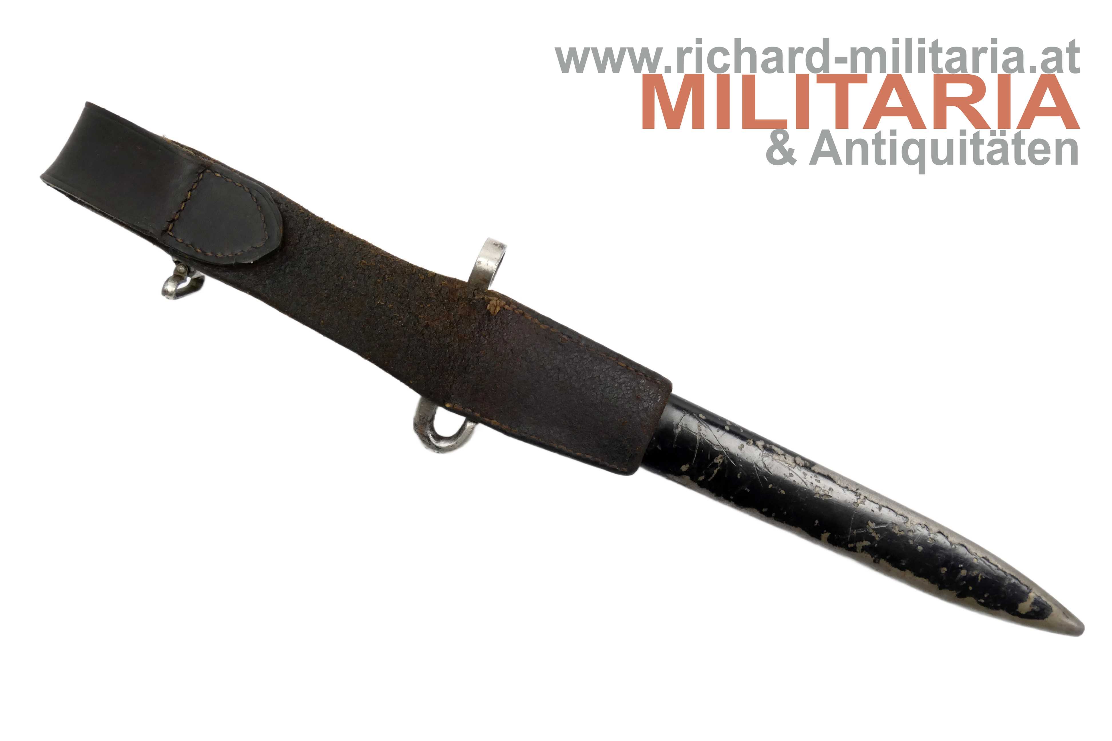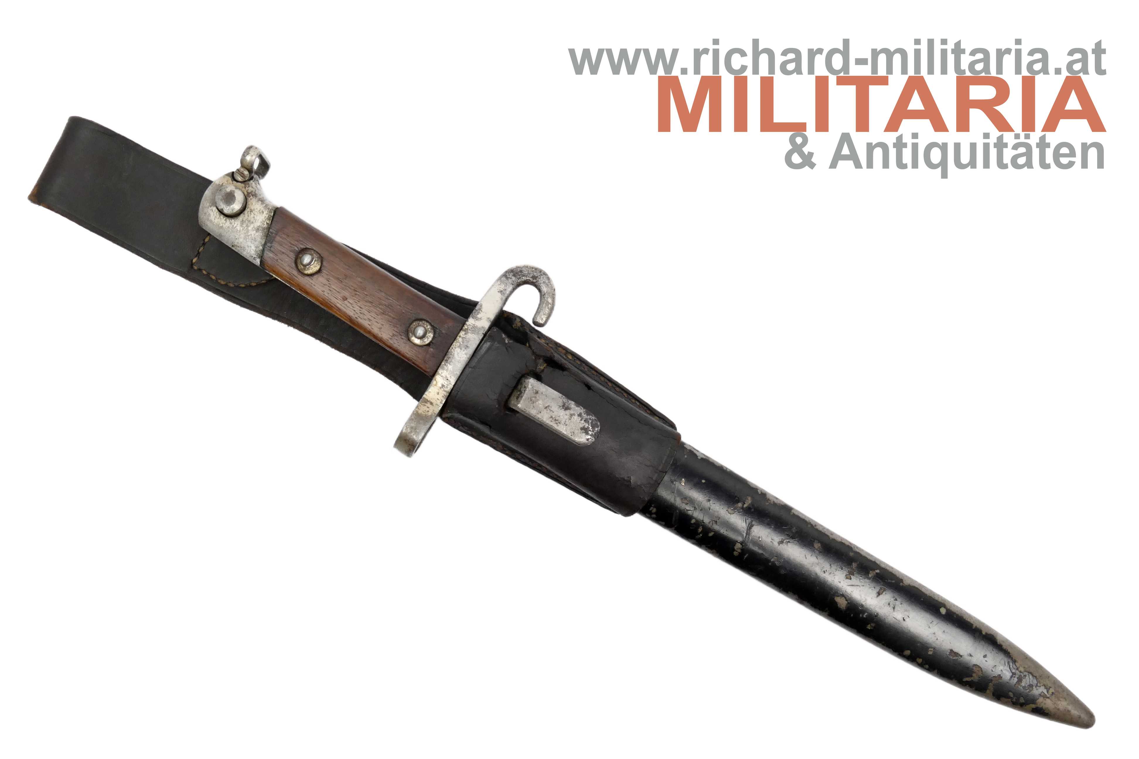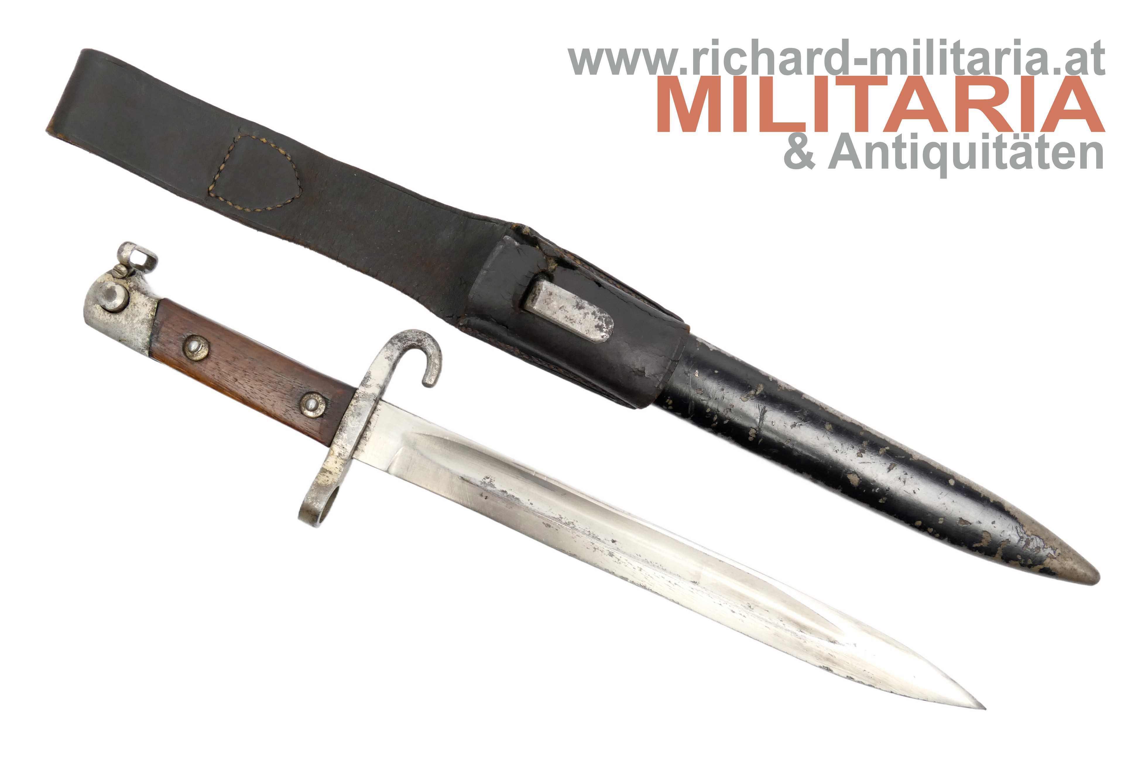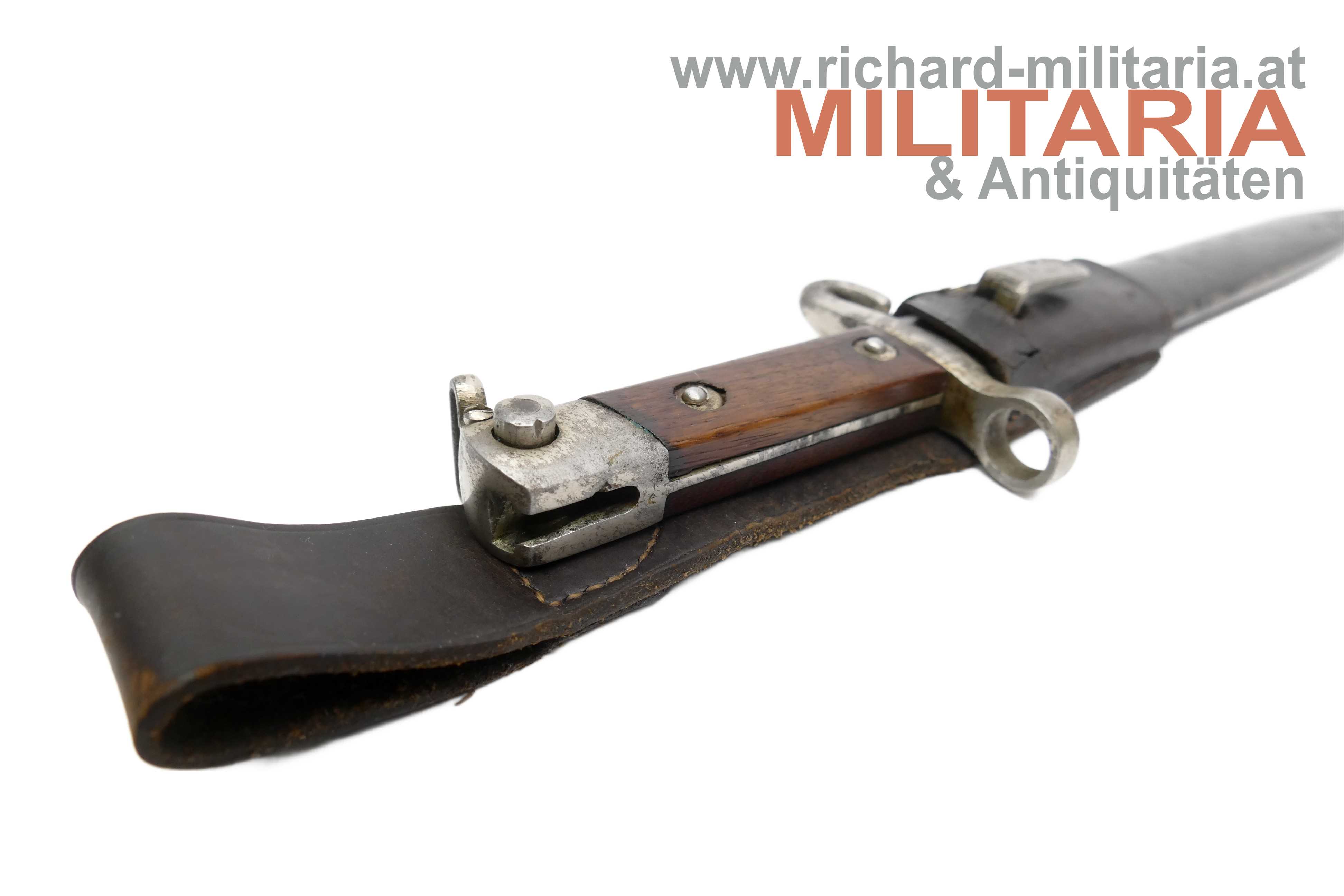 Messerbajonett M1895; Bajonett in vernickelter Ausführung für Unteroffiziere oder Offiziere; Eigentumstück; aufpflanzbar und mit Portepeebügel und -haken; ohne Hersteller und ohne Abnahme; schwarz lackierte Scheide - diese ebenfalls ohne Hersteller; mit dunkelbraunem Lederkoppelschuh - dieser frontseitig beschädigt; Vernickelung teilweise vergangen bzw. gereinigt;