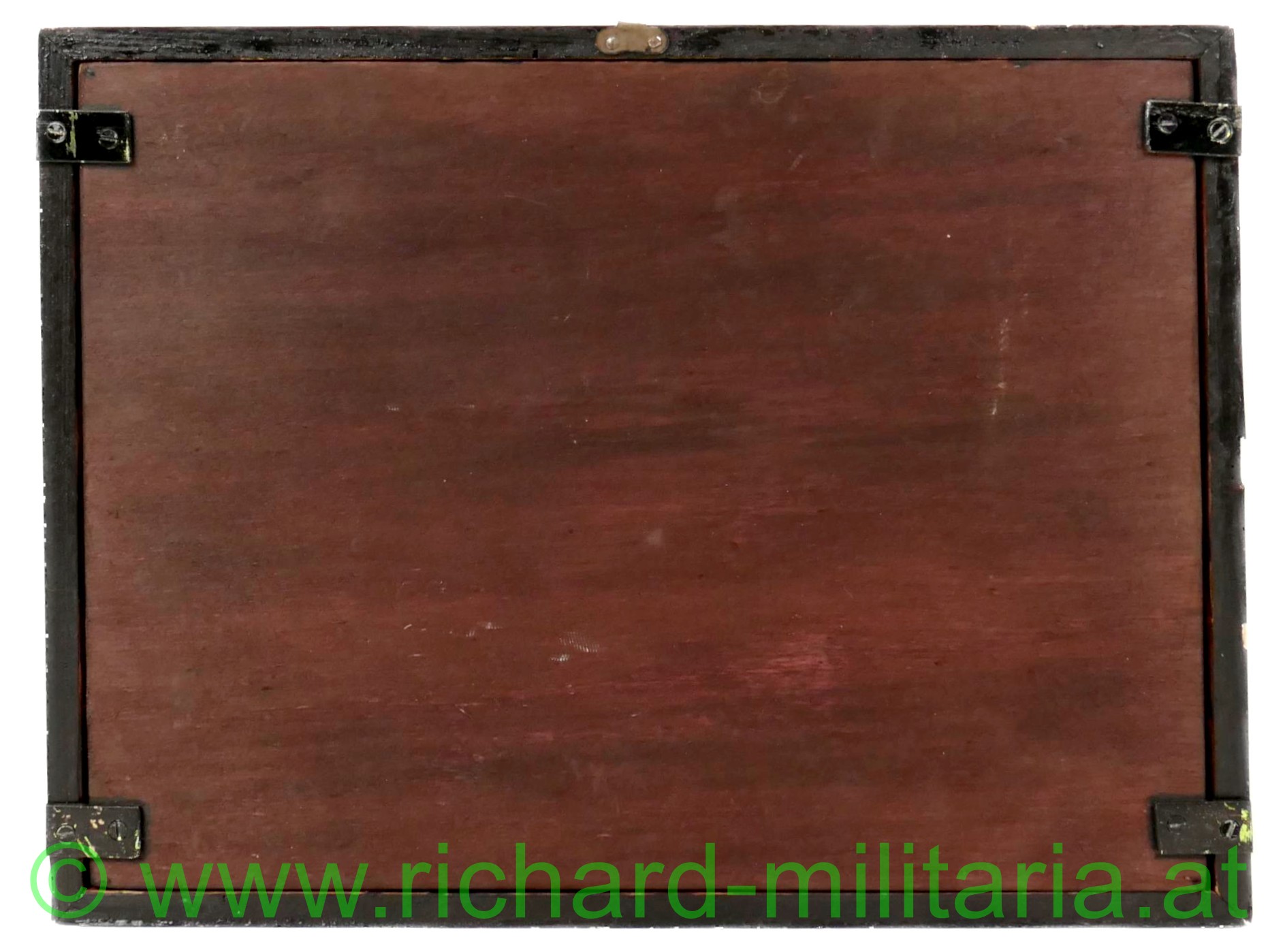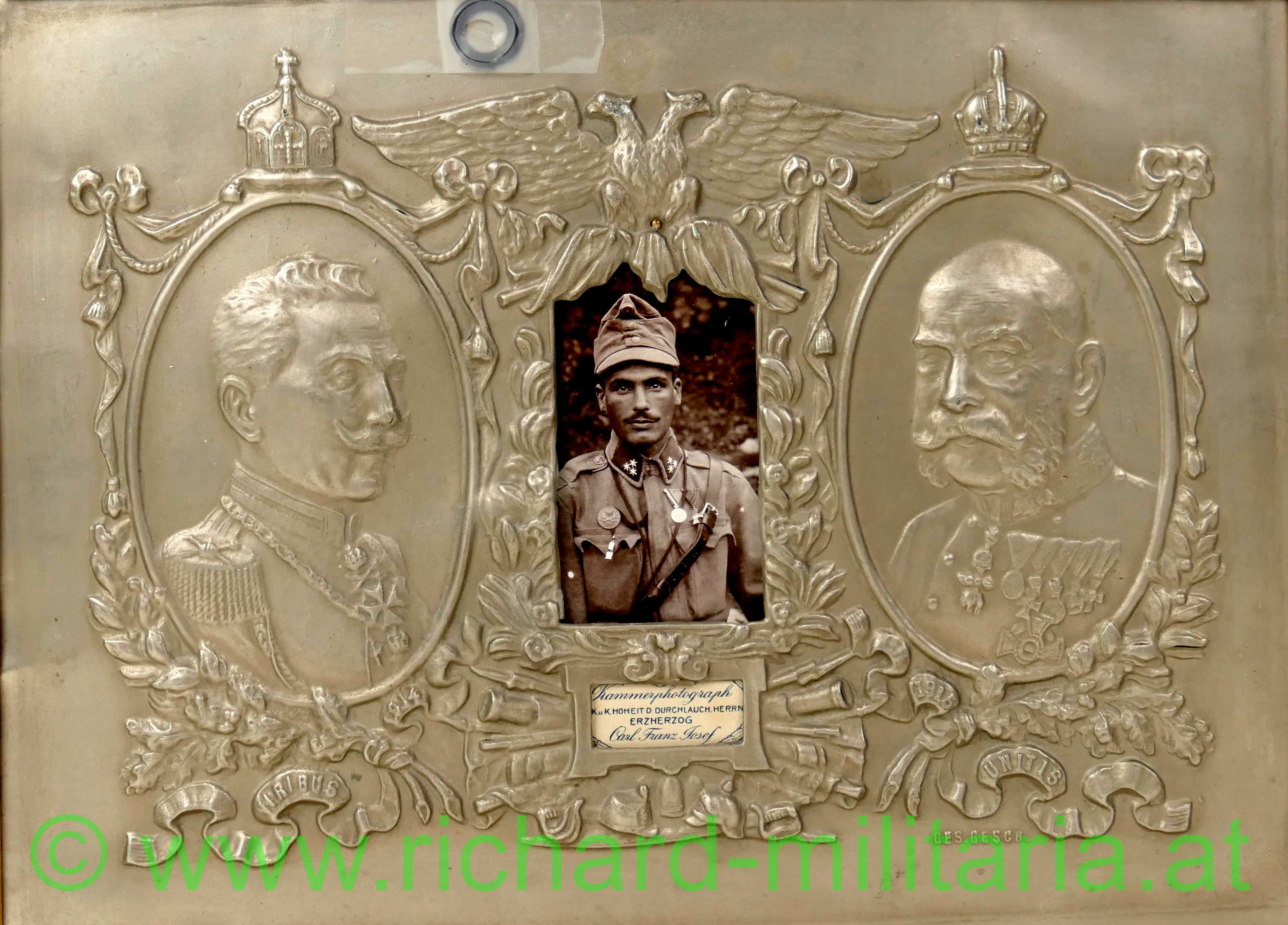 Metallschmuckbild mit eingesetztem Foto von einem Zugsführer der k.u.k. Artillerie; der Artillerist trägt eine silberne Tapferkeitsmedaille 1. Klasse sowie ein Militärdienstzeichen für Mannschaften (Dienstjahre nicht erkennbar), sowie eine Richtauszeichnung für Artilleristen auf der rechten Brust (!); Schützenauszeichnung mit Pfeife gut zu erkennen; Foto umrandet von einem versilberten Blechguss mit Abbildungen des deutschen und österreichischen Kaisers; Gold und schwarz gefärbter Holzrahmen; Halterungsöse abgebrochen und beiliegend