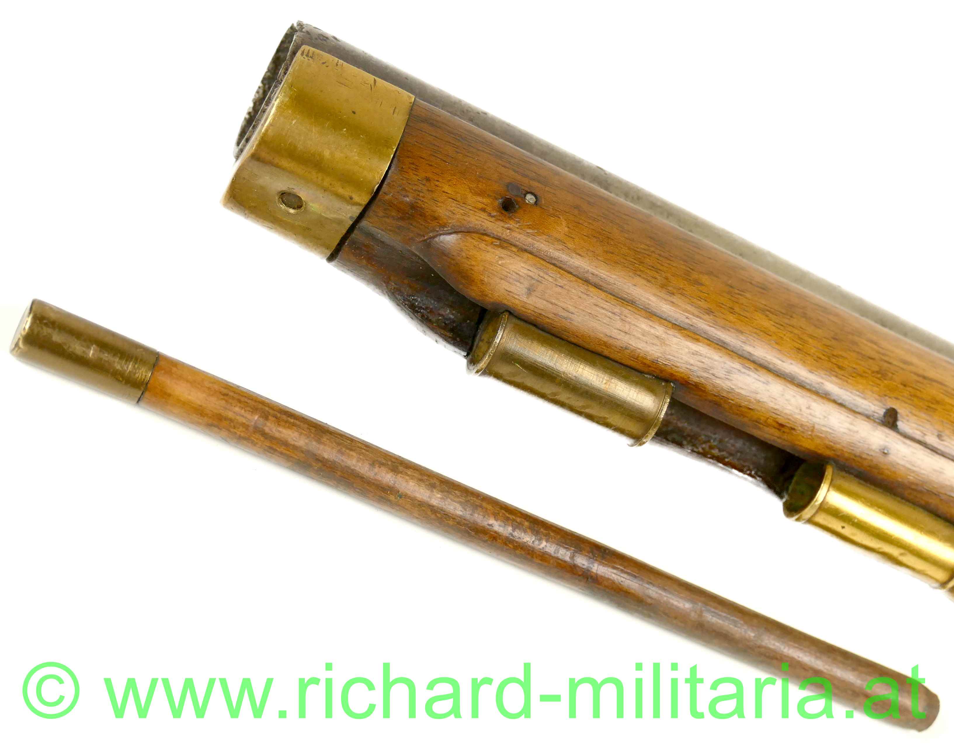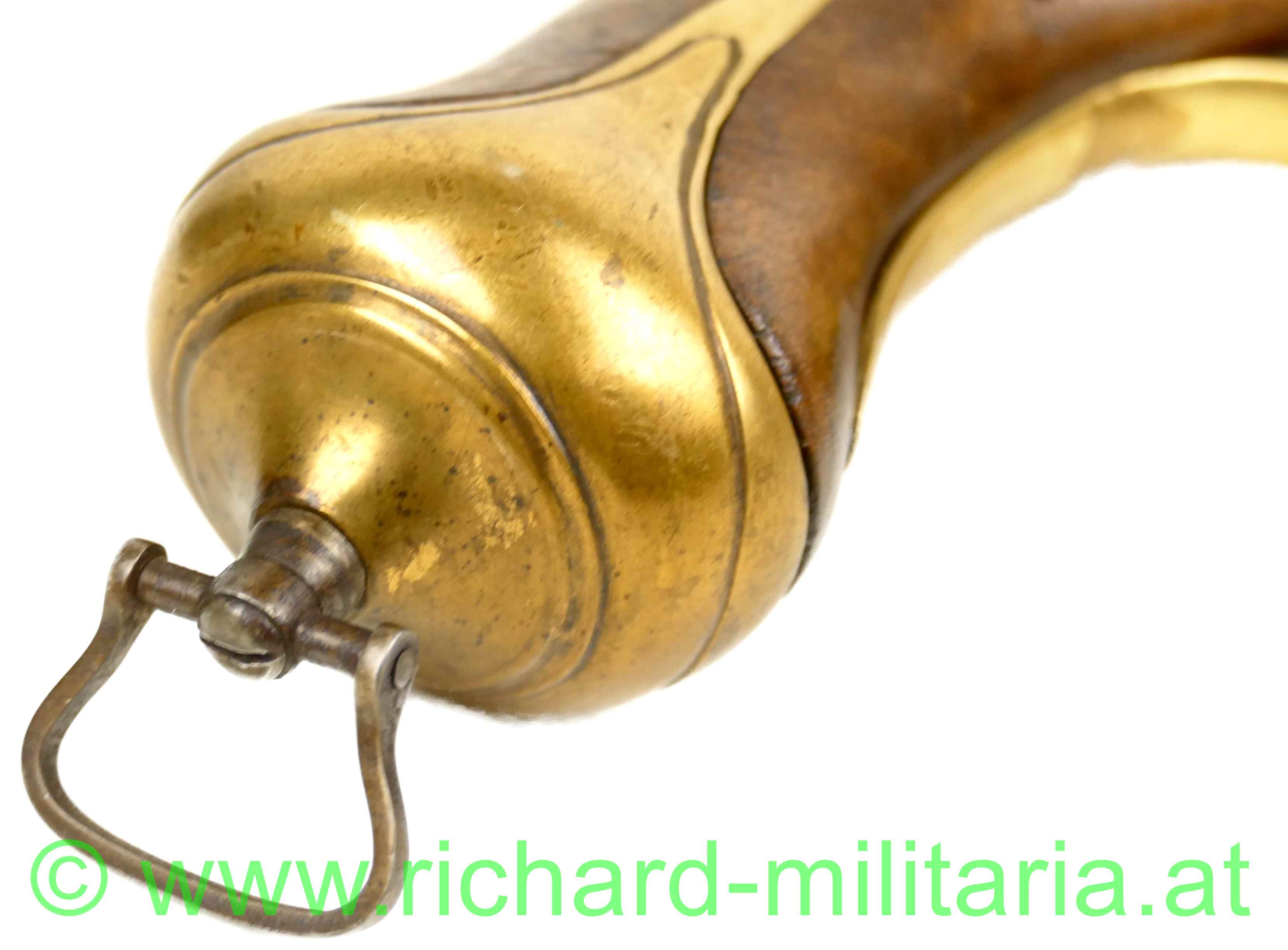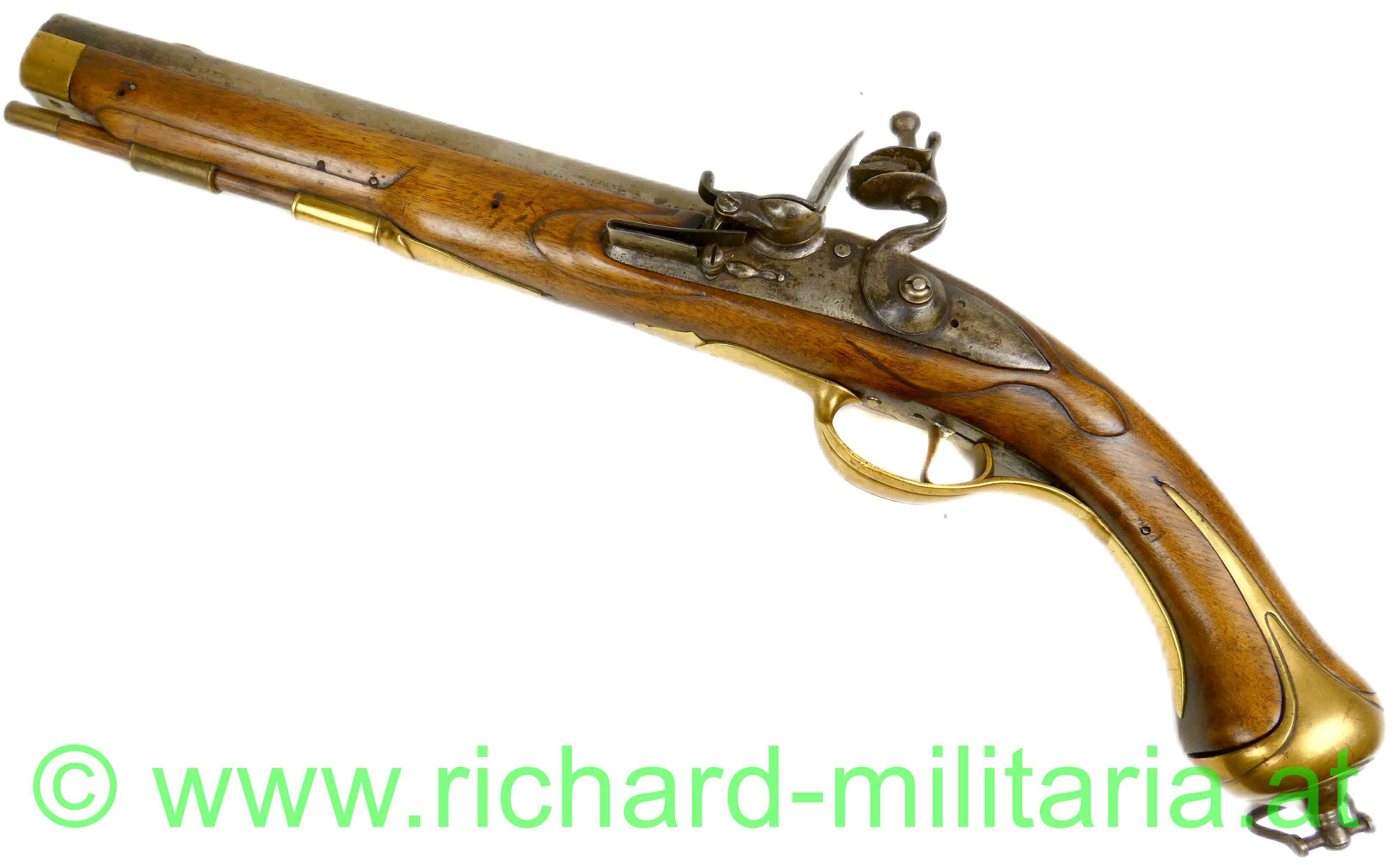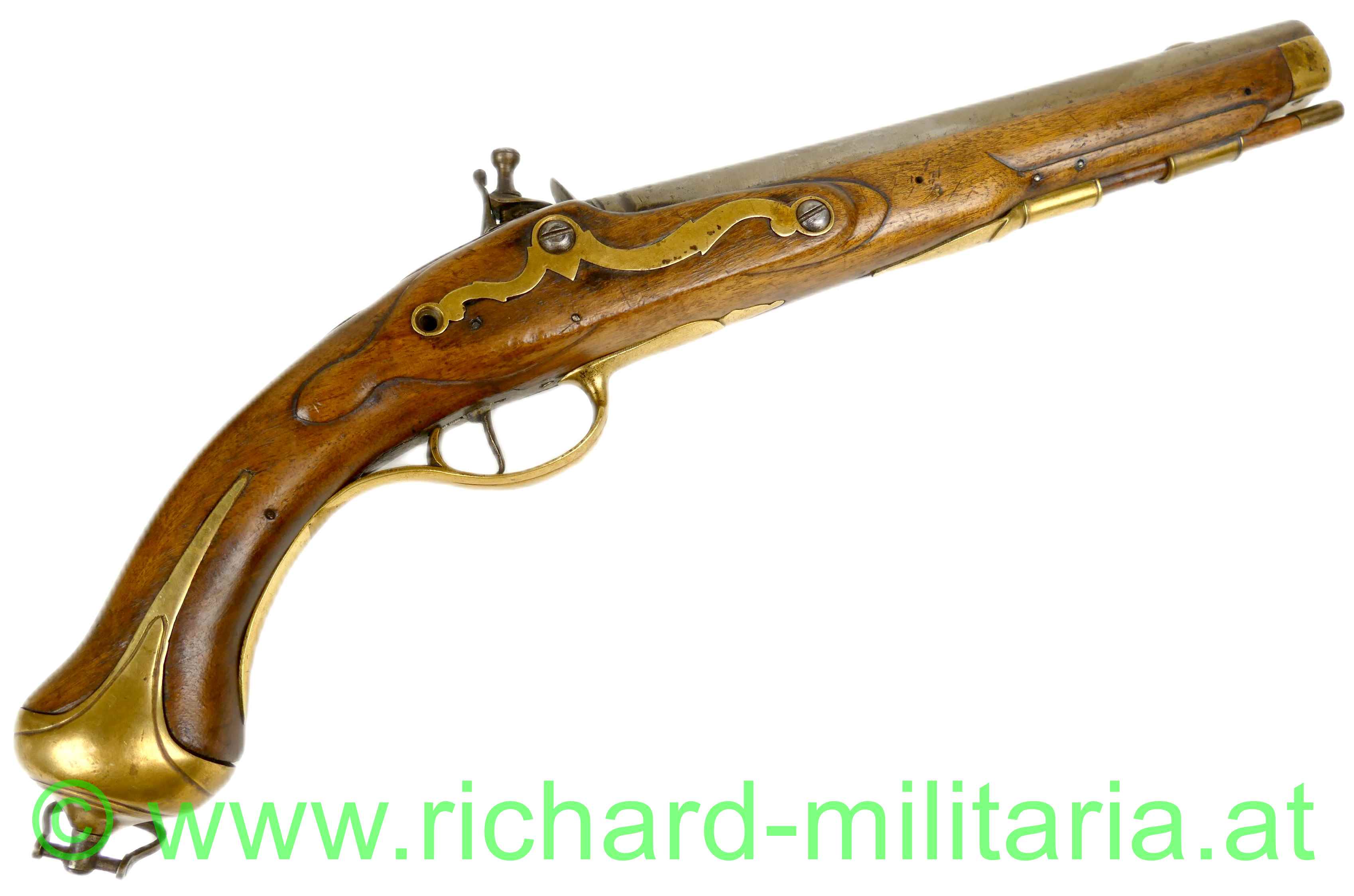 militärische Steinschloßpistole - 2. Hälfte 18. Jhdt. - Schloß links, Kaliber 19 mm; Holzschaft mit geschnitzter Verzierung; Messingknauf mit beweglicher Einhängeöse, Platte und Lauf aus Eisen ohne erkennbare Punzierungen od. Verzierungen; Laufabschluss ebenfalls aus Messing; Putz-/Ladestock vorhanden; funktionierende Spannfeder, mit altem Feuerstein; eine Schraube fehlt;