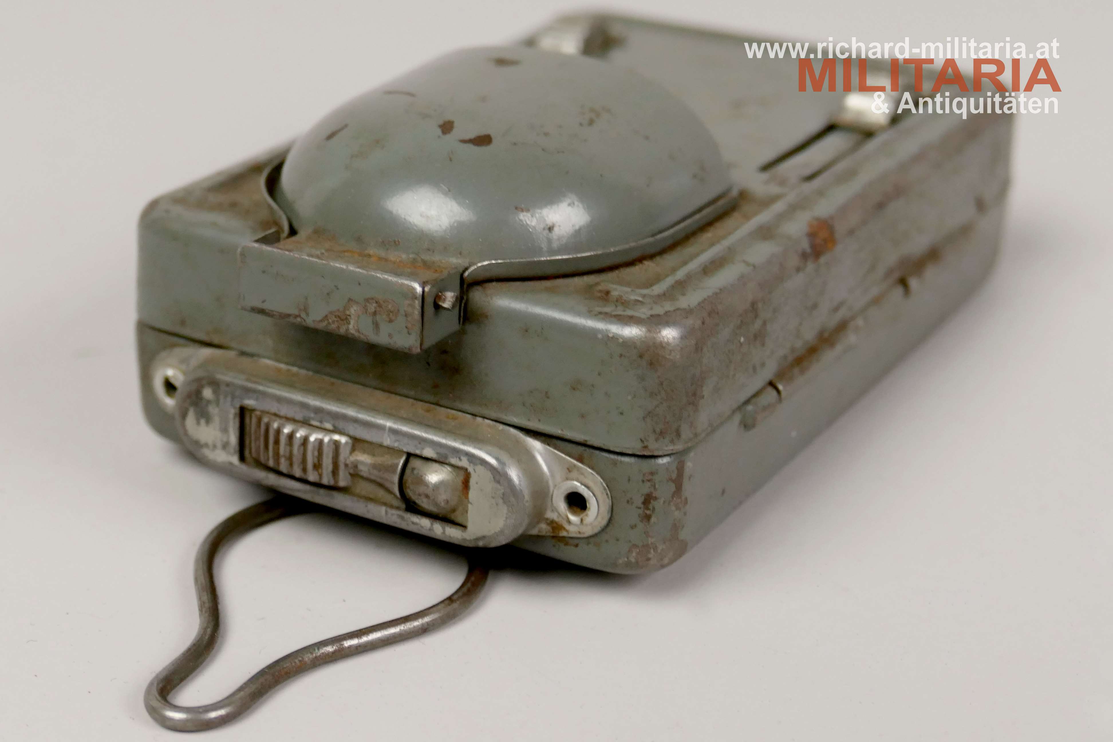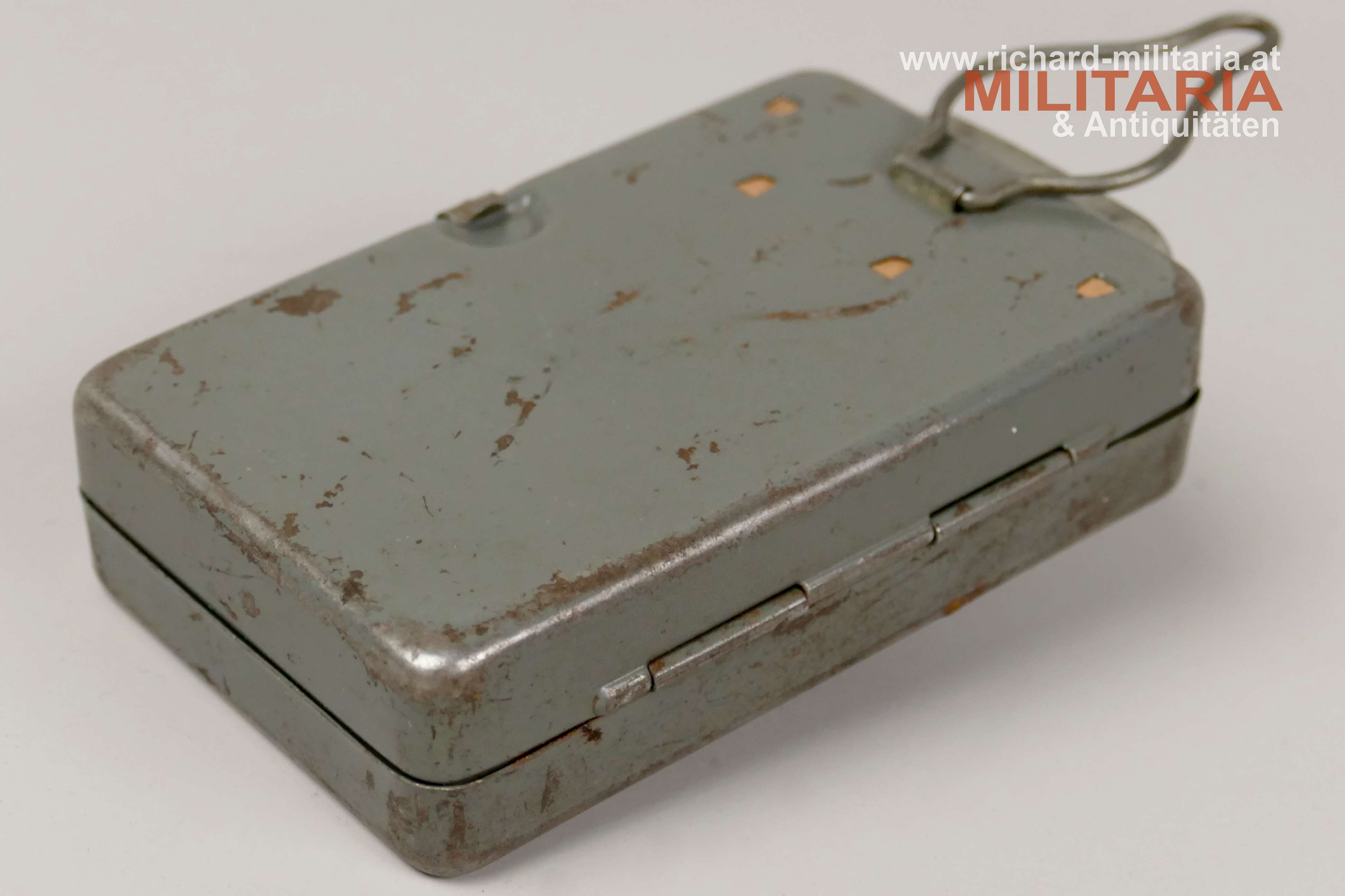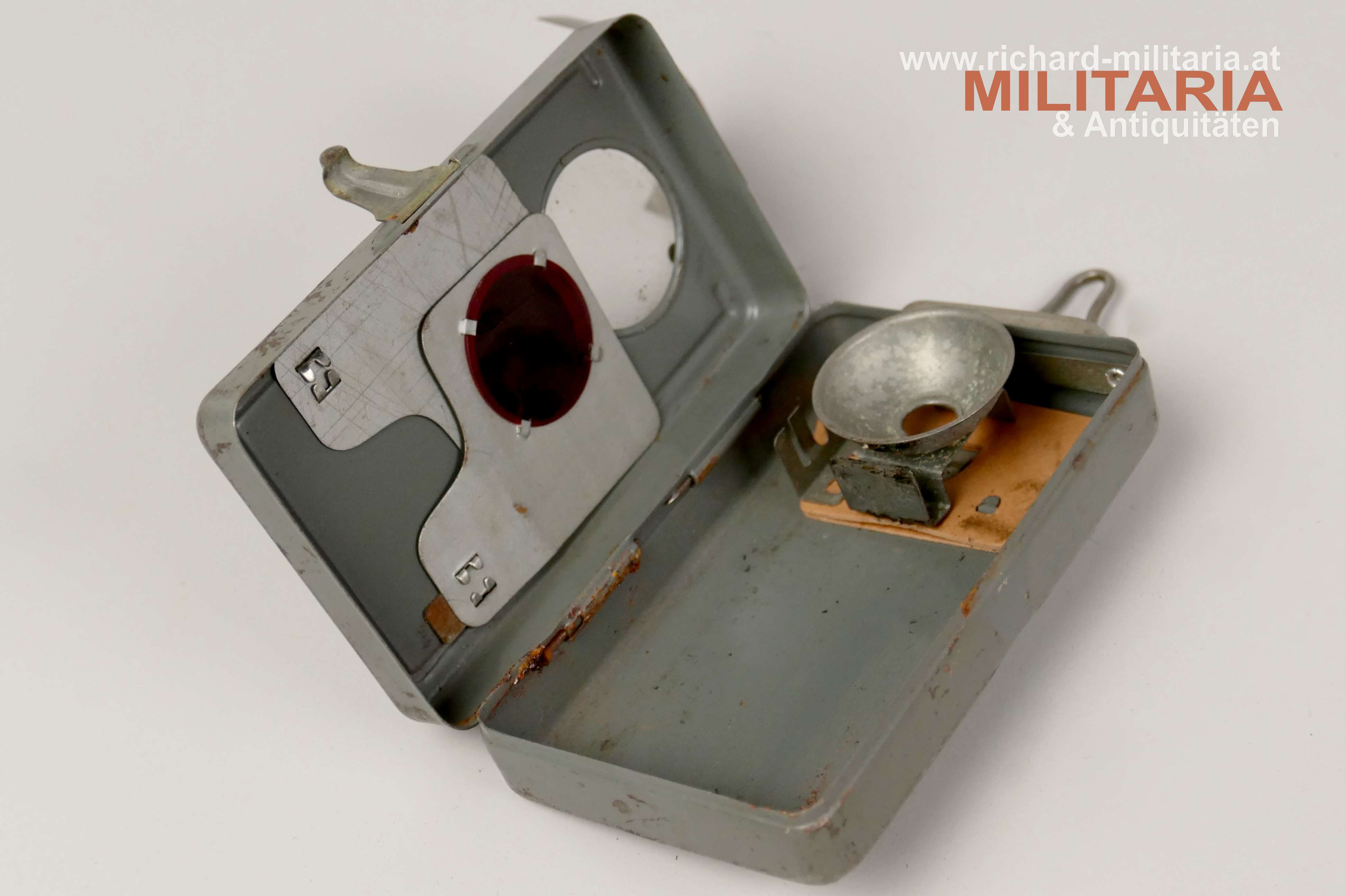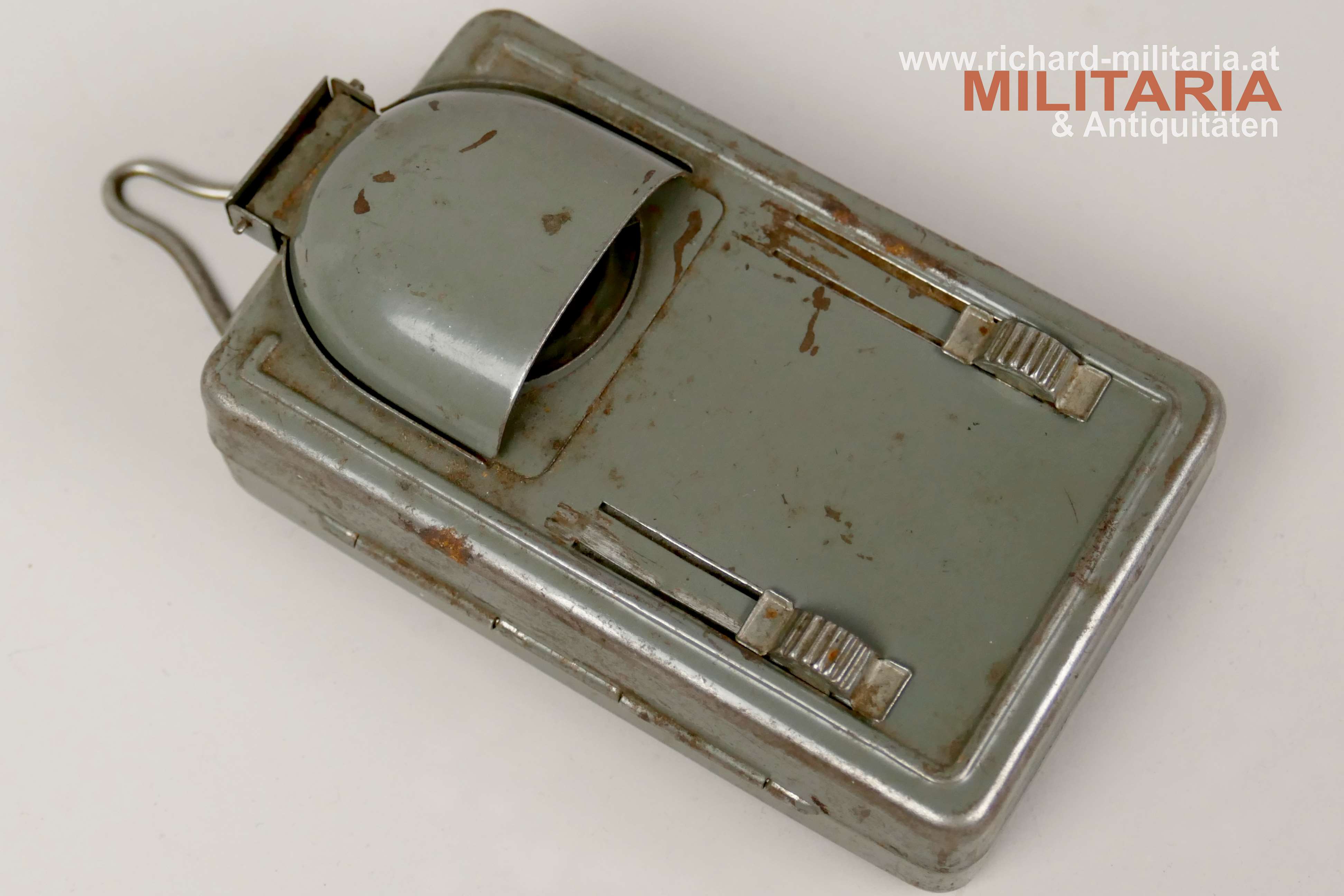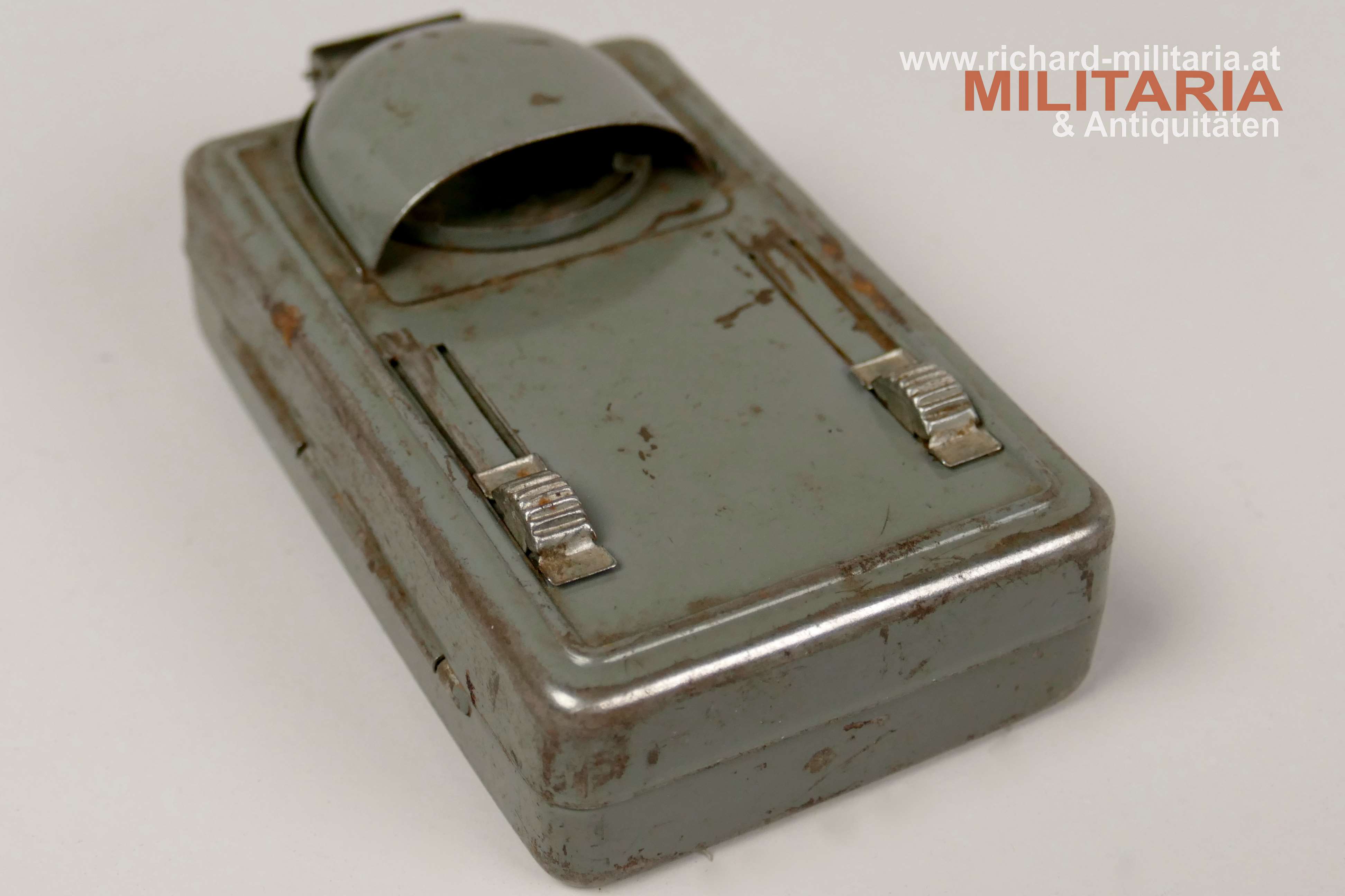 militärische Taschenlampe; Eisenblech grau lackiert, vorne 2 Schieber für rotes bzw. blaues Licht; Abblendkappe; ohne Batterie und Glühbirne; Tragebügel; Format 10,5 x 6,5 x 2,8 cm; kein Hersteller oder sonstige Markierung