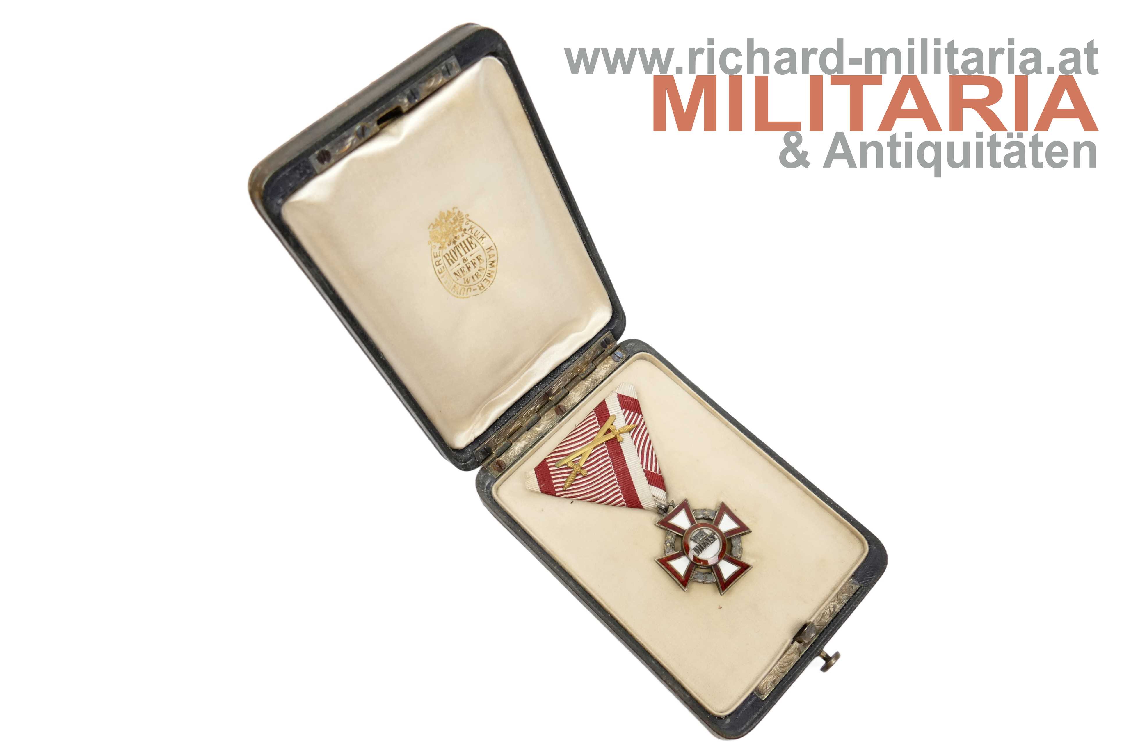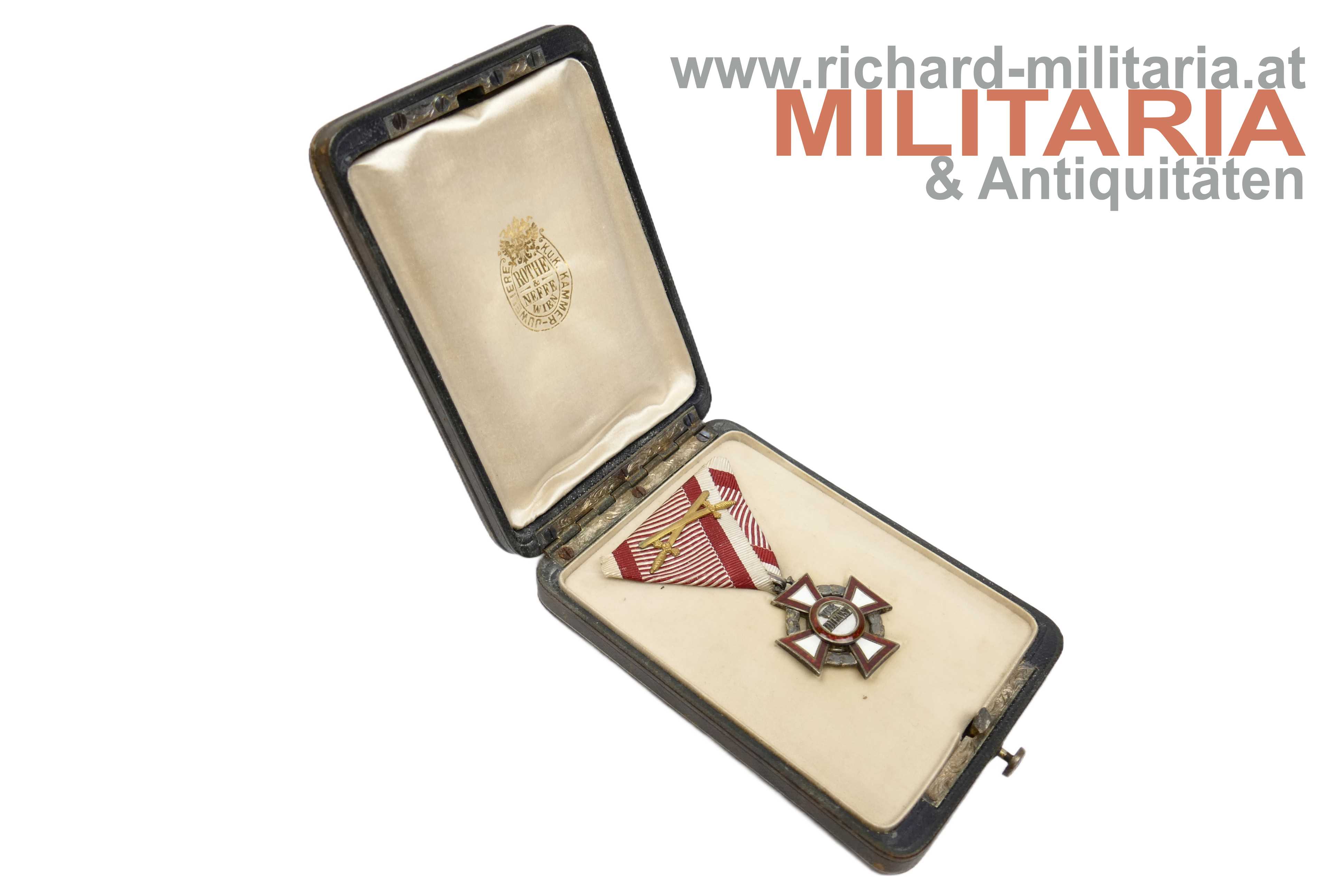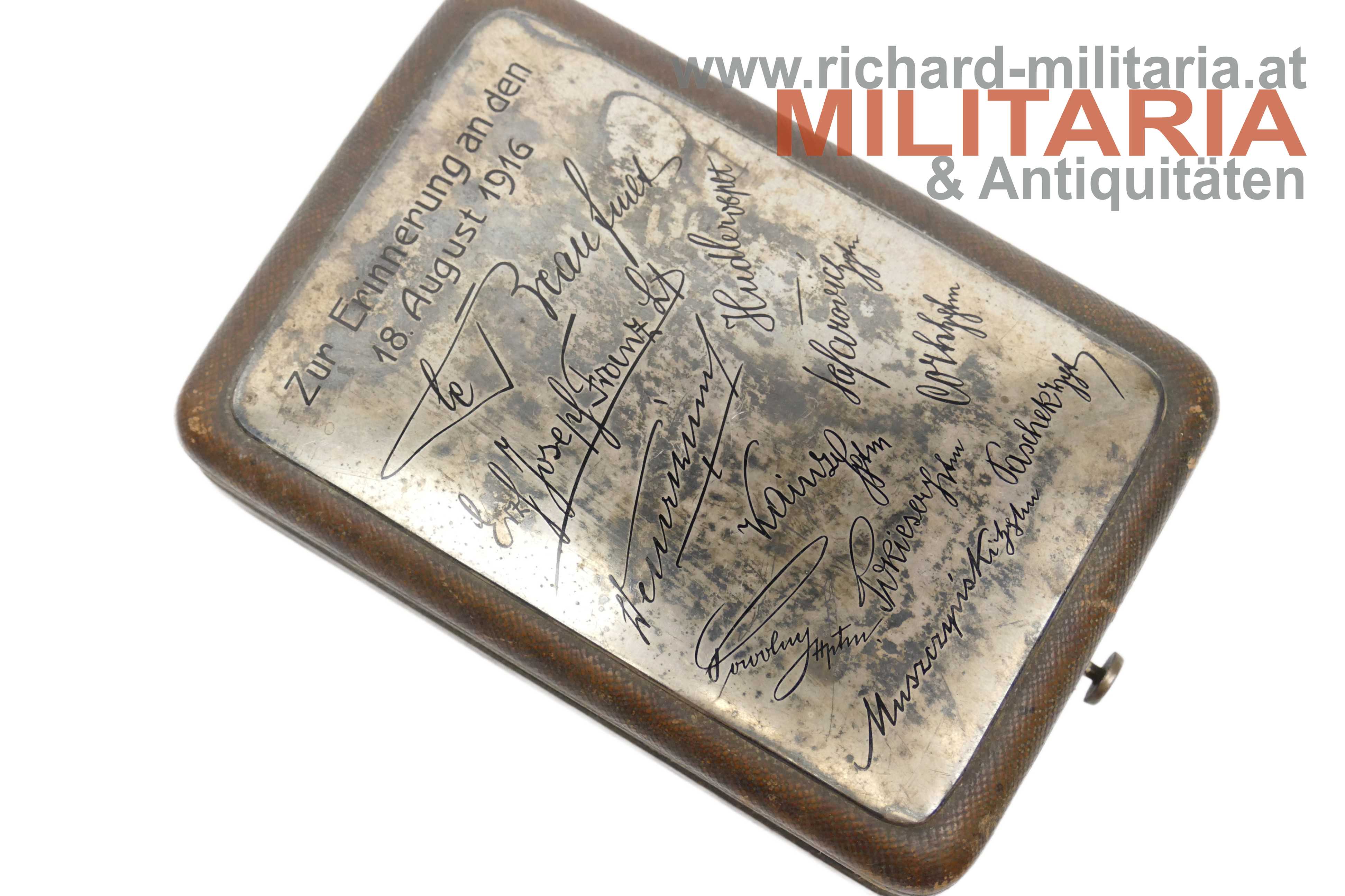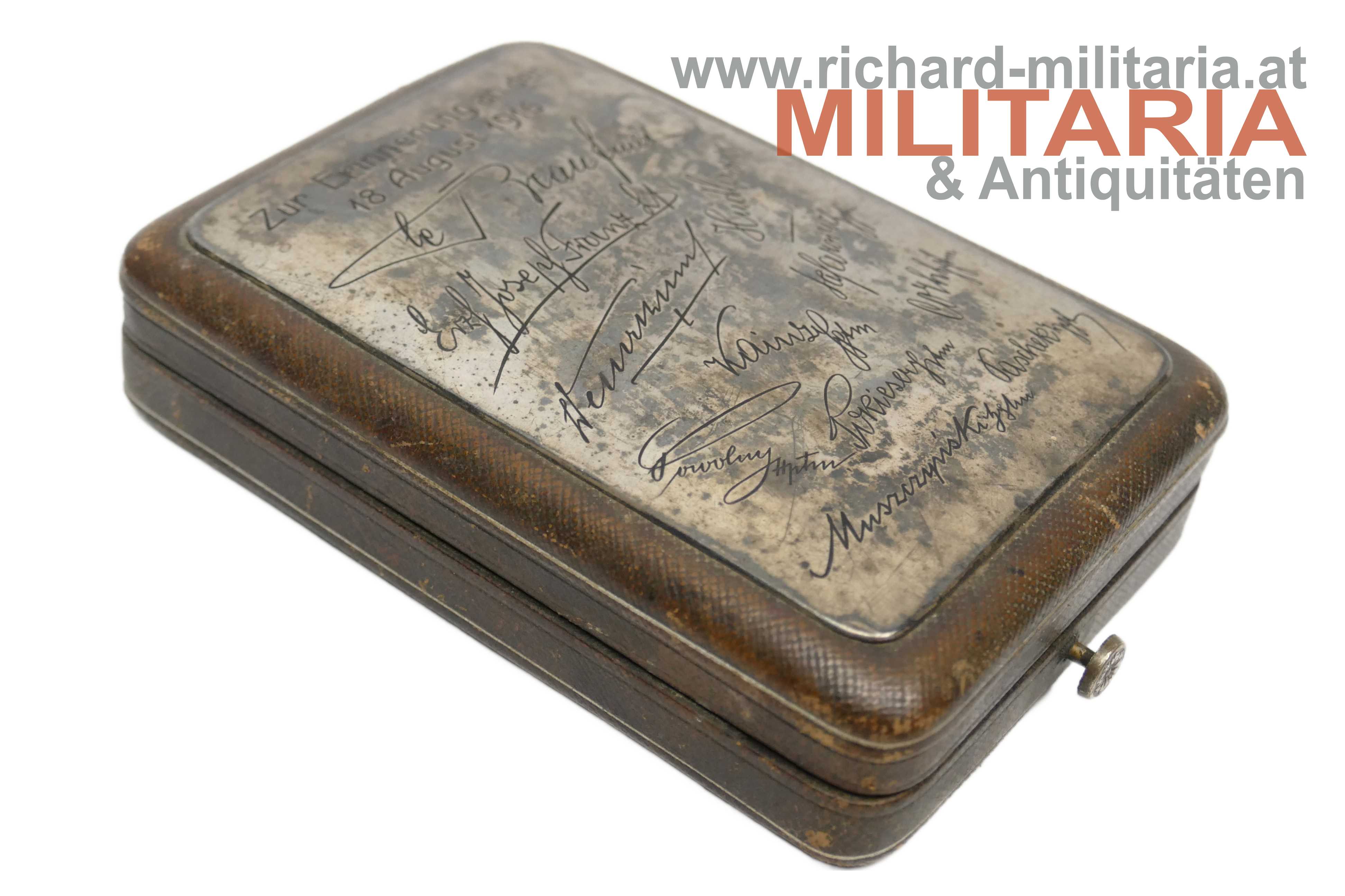 k.u.k. Militärverdienstkreuz III. Klasse mit KD und Schwertern im braunen Leder-Luxusetui mit eingearbeiteter, gravierter SILBER-Platte mit Widmung "Zur Erinnerung an den 18. August 1916"; Widmungsunterschriften u.a. von ERZHERZOG Joseph Franz als Leutnant (!); die Widmungsgravur schwarz emailliert; MVK aus Silber punziert; ungetragen in perfekter Erhaltung; im Deckel des Etuis Goldprägung von Rothe; Etui mit leichten kleinen Abschabungen; schöne dunkle Patina der Silberplatte;