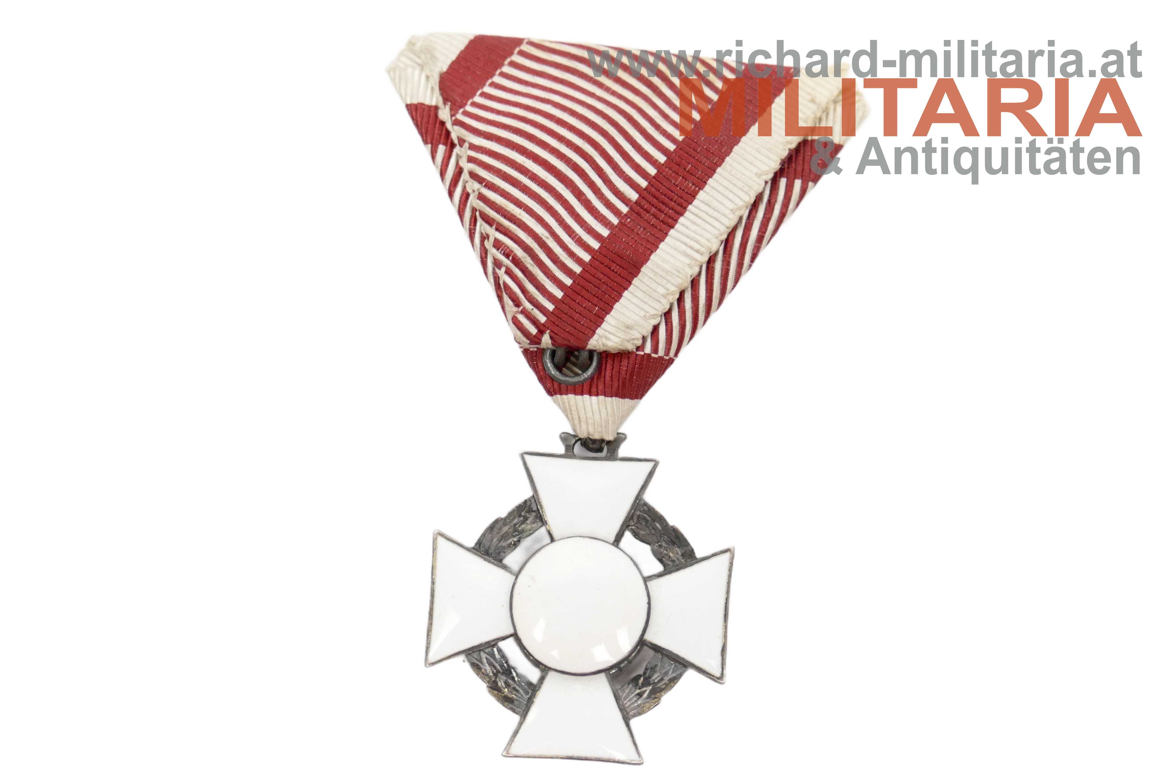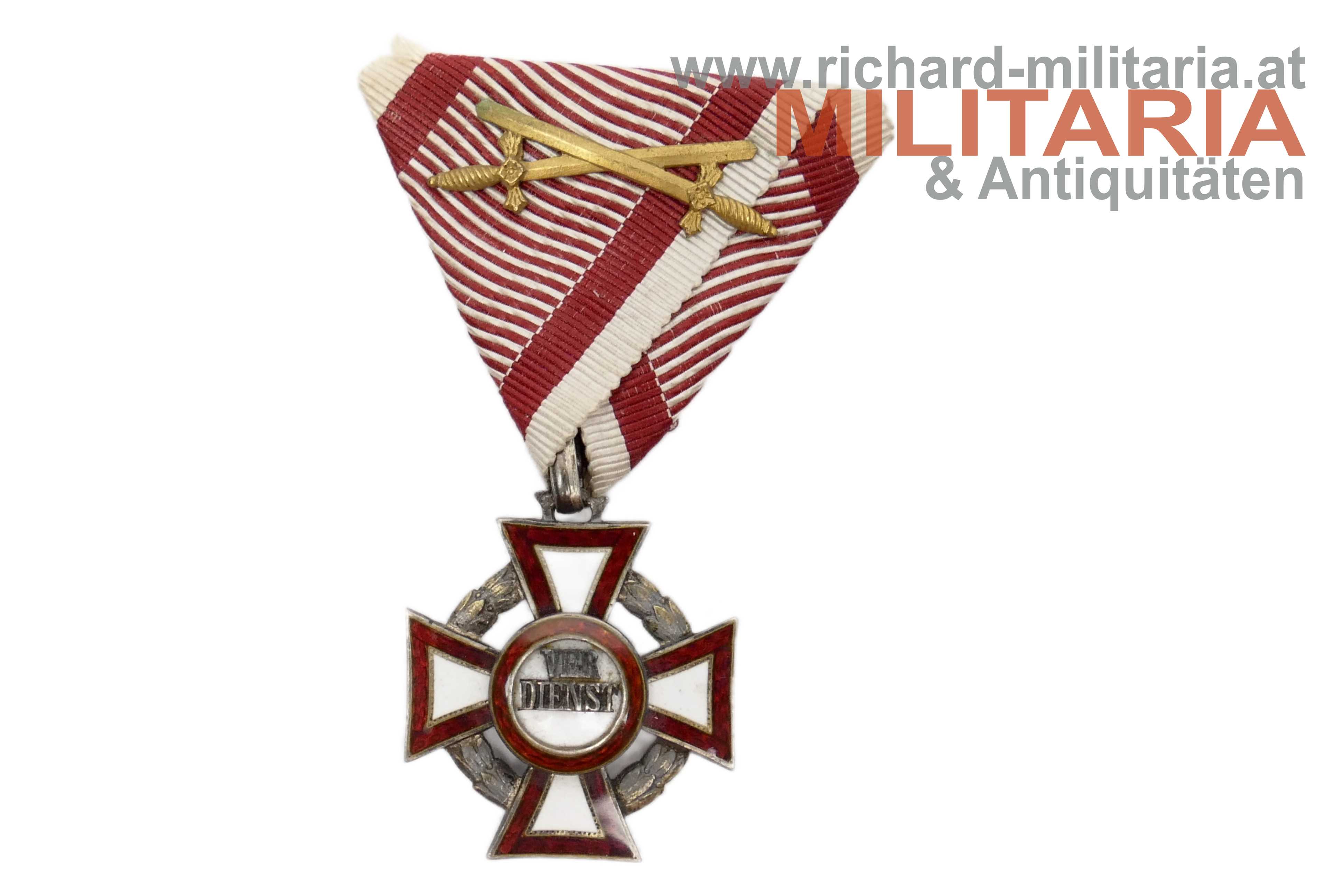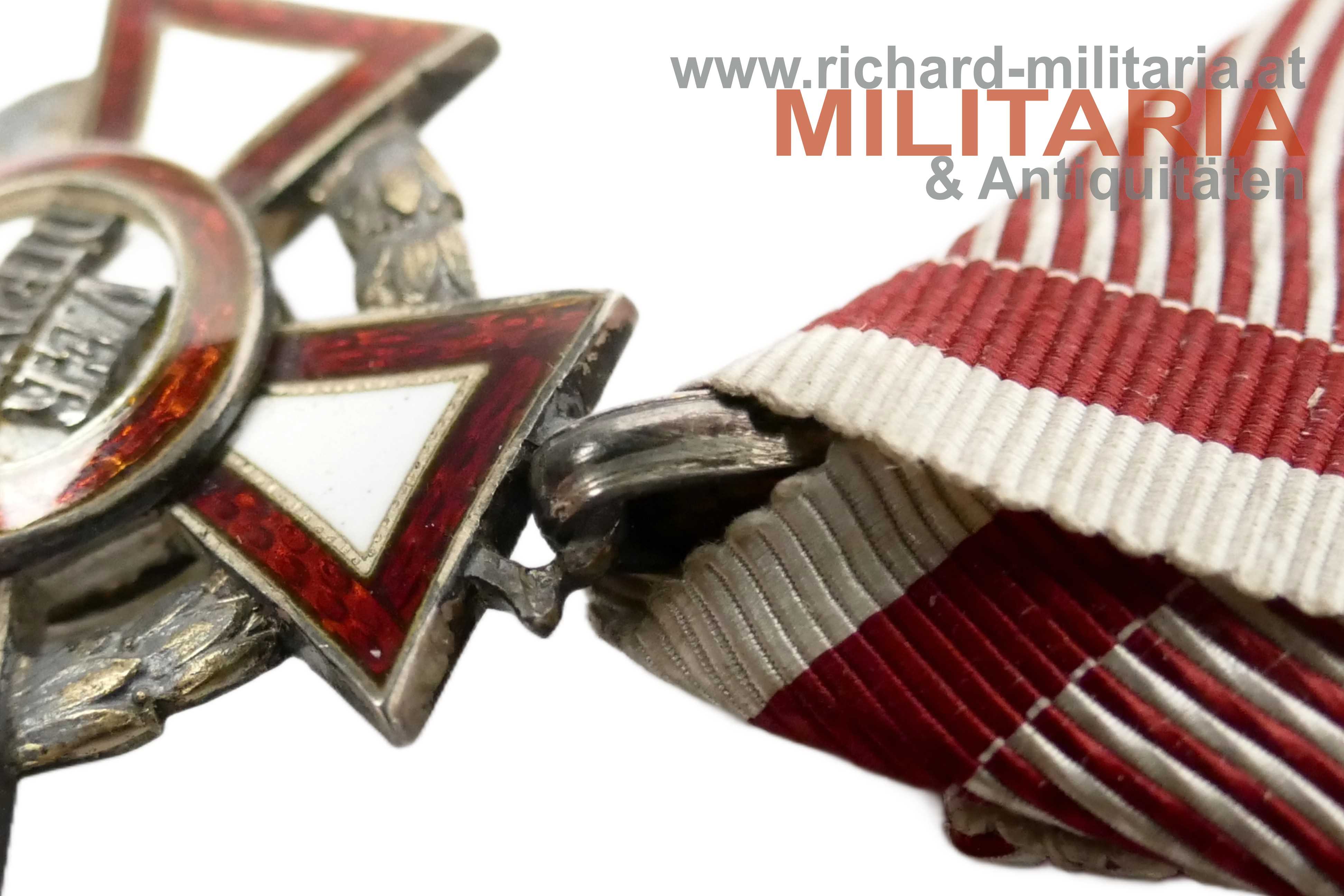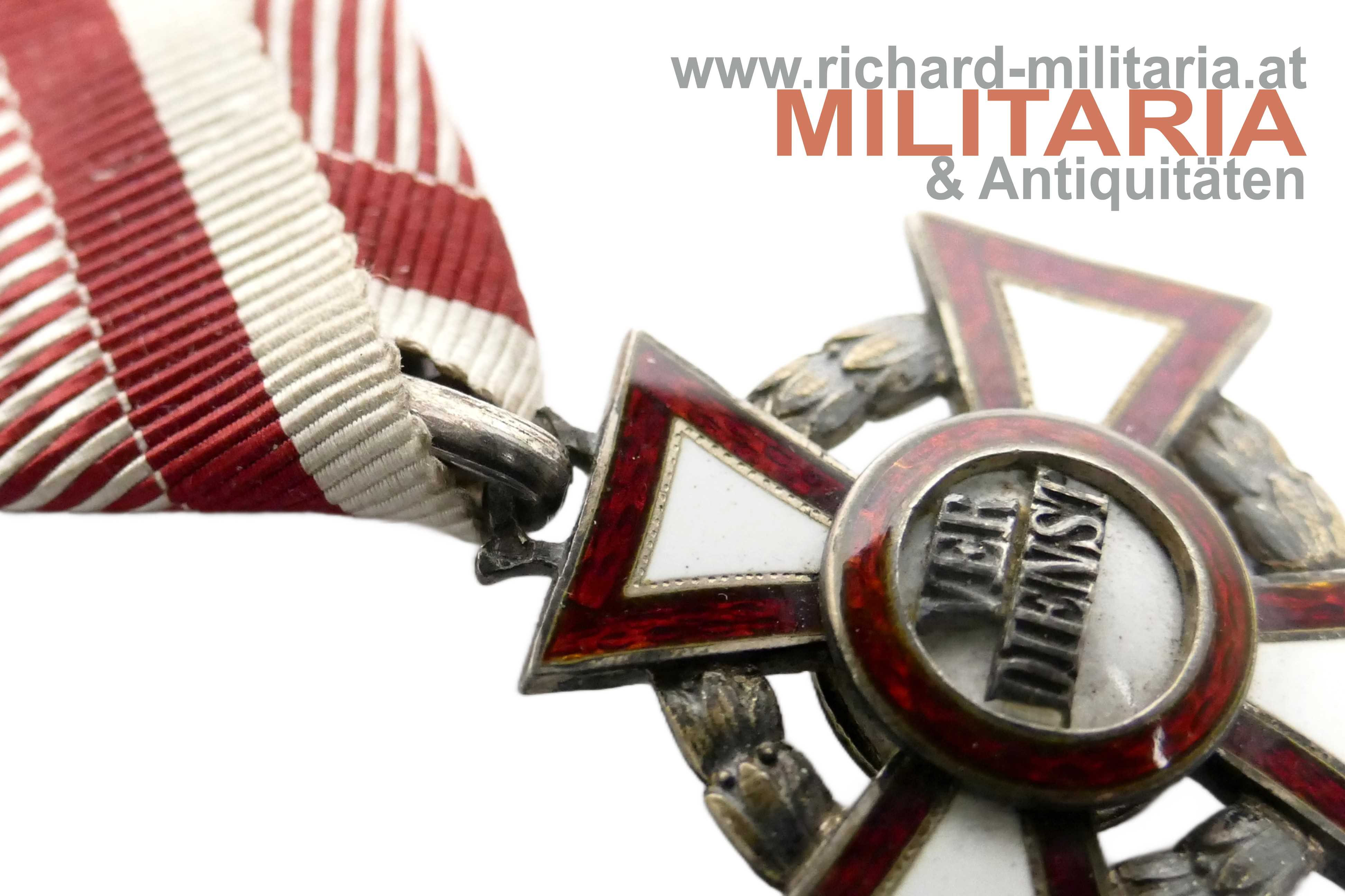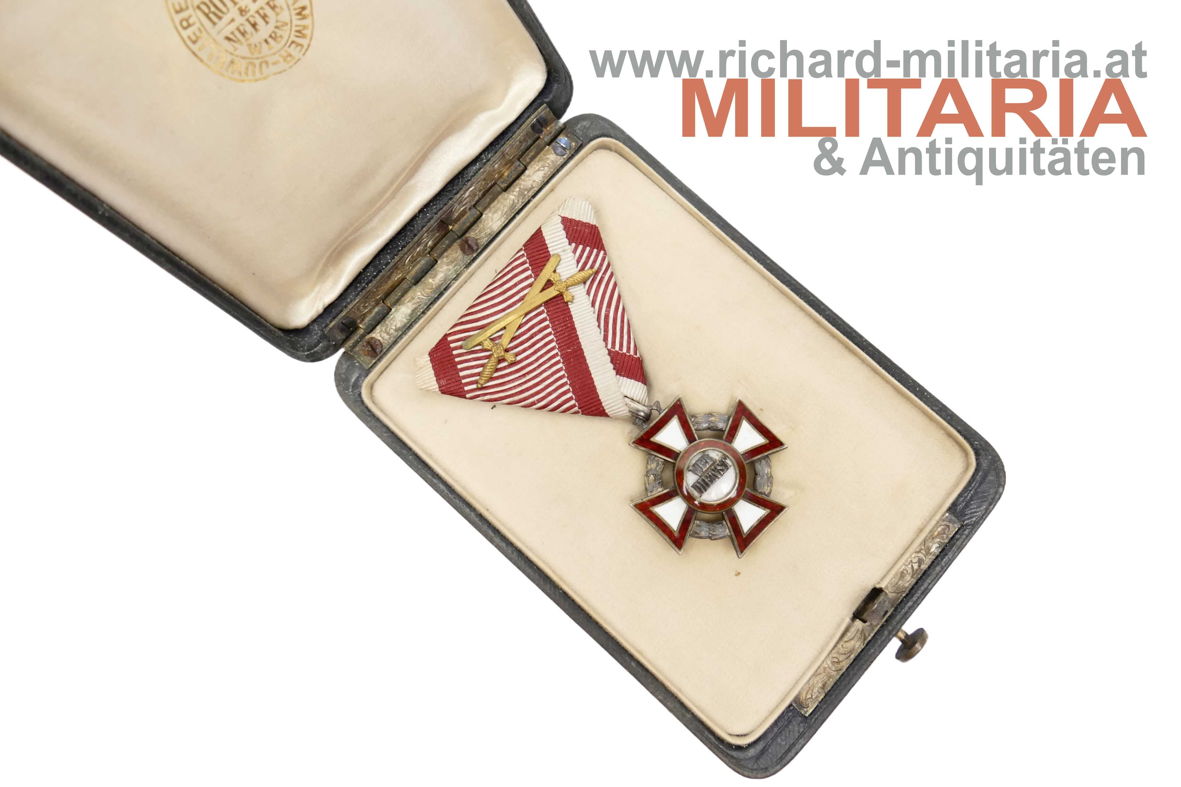 k.u.k. Militärverdienstkreuz III. Klasse mit KD und Schwertern im braunen Leder-Luxusetui mit eingearbeiteter, gravierter SILBER-Platte mit Widmung "Zur Erinnerung an den 18. August 1916"; Widmungsunterschriften u.a. von ERZHERZOG Joseph Franz als Leutnant (!); die Widmungsgravur schwarz emailliert; MVK aus Silber punziert; ungetragen in perfekter Erhaltung; im Deckel des Etuis Goldprägung von Rothe; Etui mit leichten kleinen Abschabungen; schöne dunkle Patina der Silberplatte;